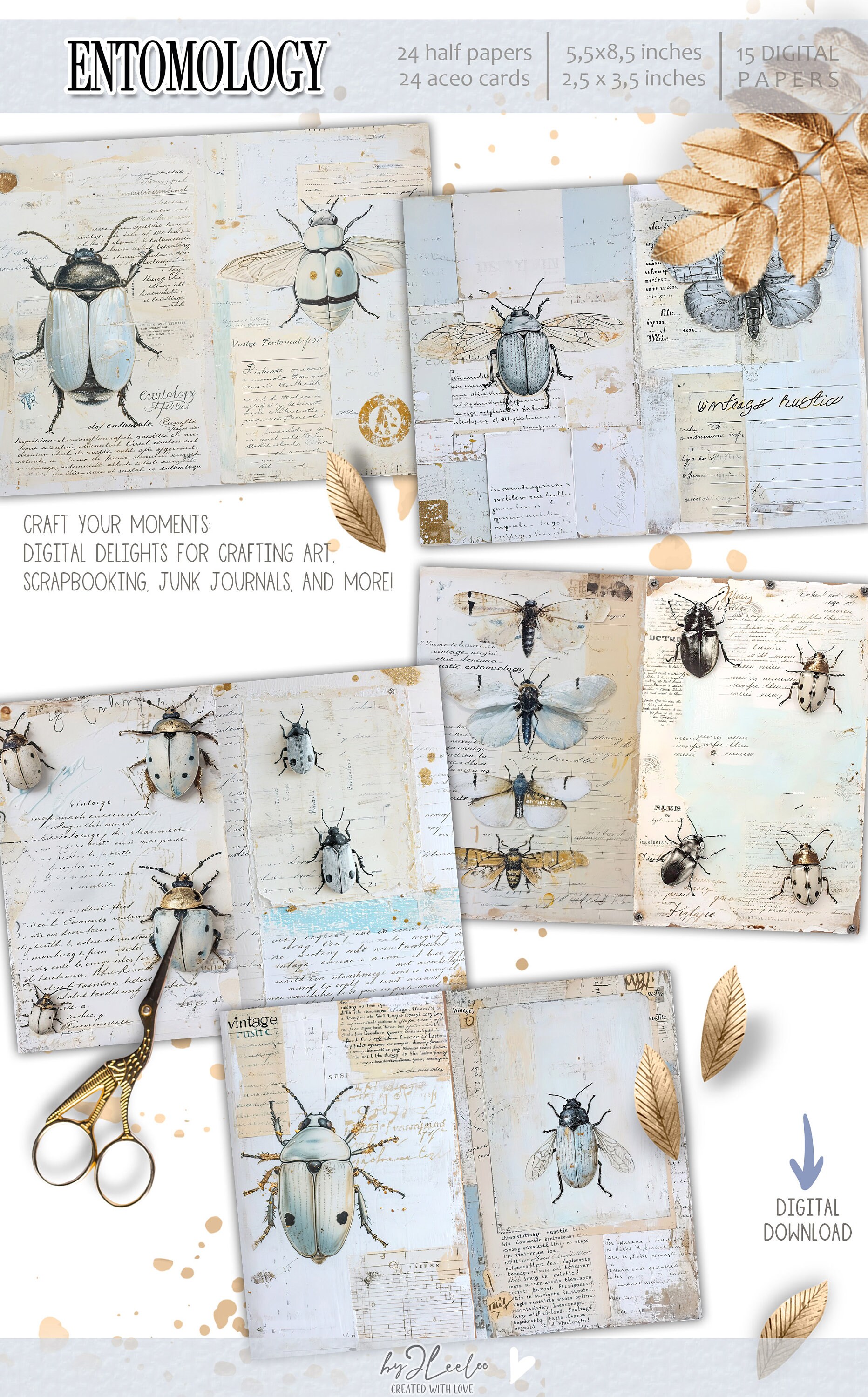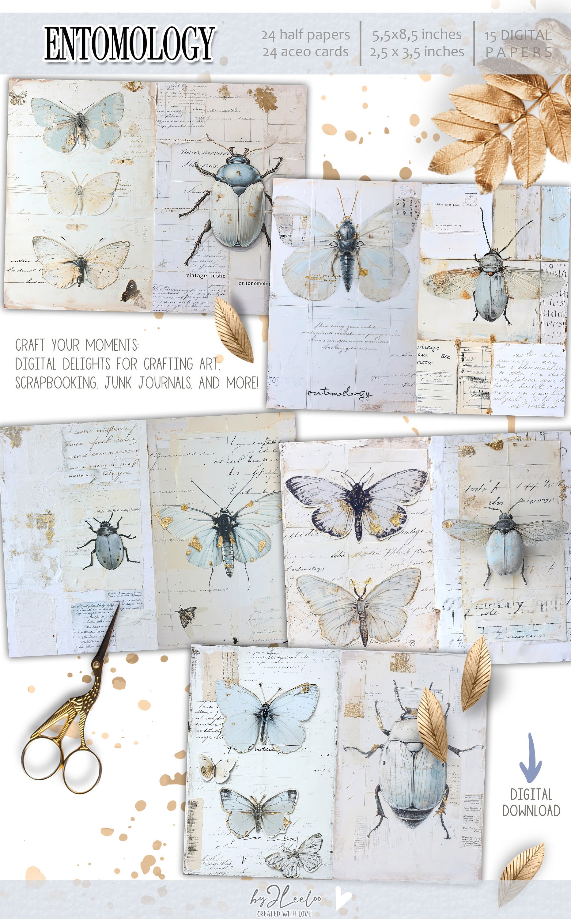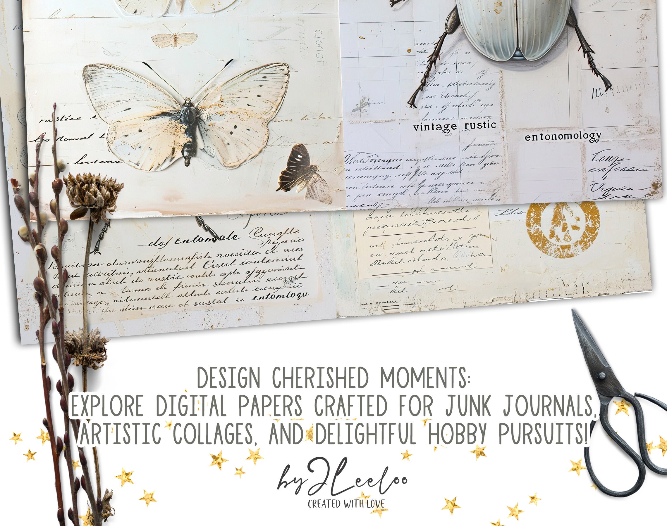 ๐ฆโจ Explore the timeless charm of 'Entomology' with these uniquely crafted minimalist collages. Immerse yourself in the delicate world of beetles, dragonflies, and more, captured on aged papers adorned with subtle hues of white, ivory, dusty light blue, and hints of gold. Each piece is a harmonious blend of script fragments and old letters. Perfect for digital art, junk journaling, scrapbooking, cards, and beyondโthese evocative images invite you to infuse your creations with a touch of rustic elegance. Transform your projects with the allure of nature's small wonders.