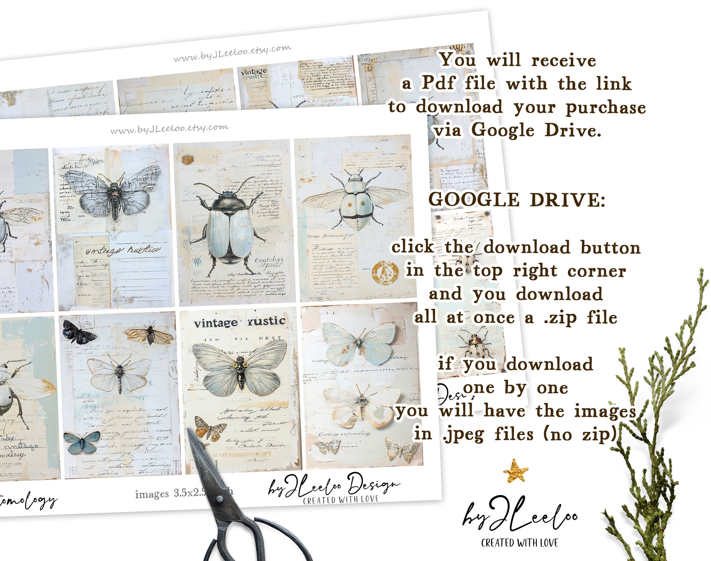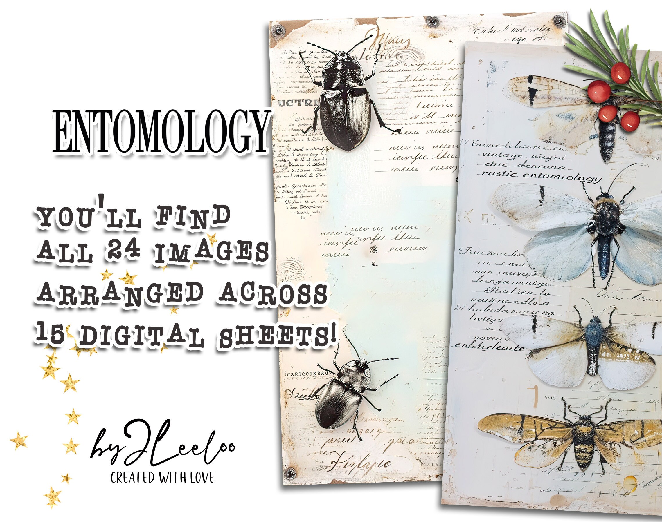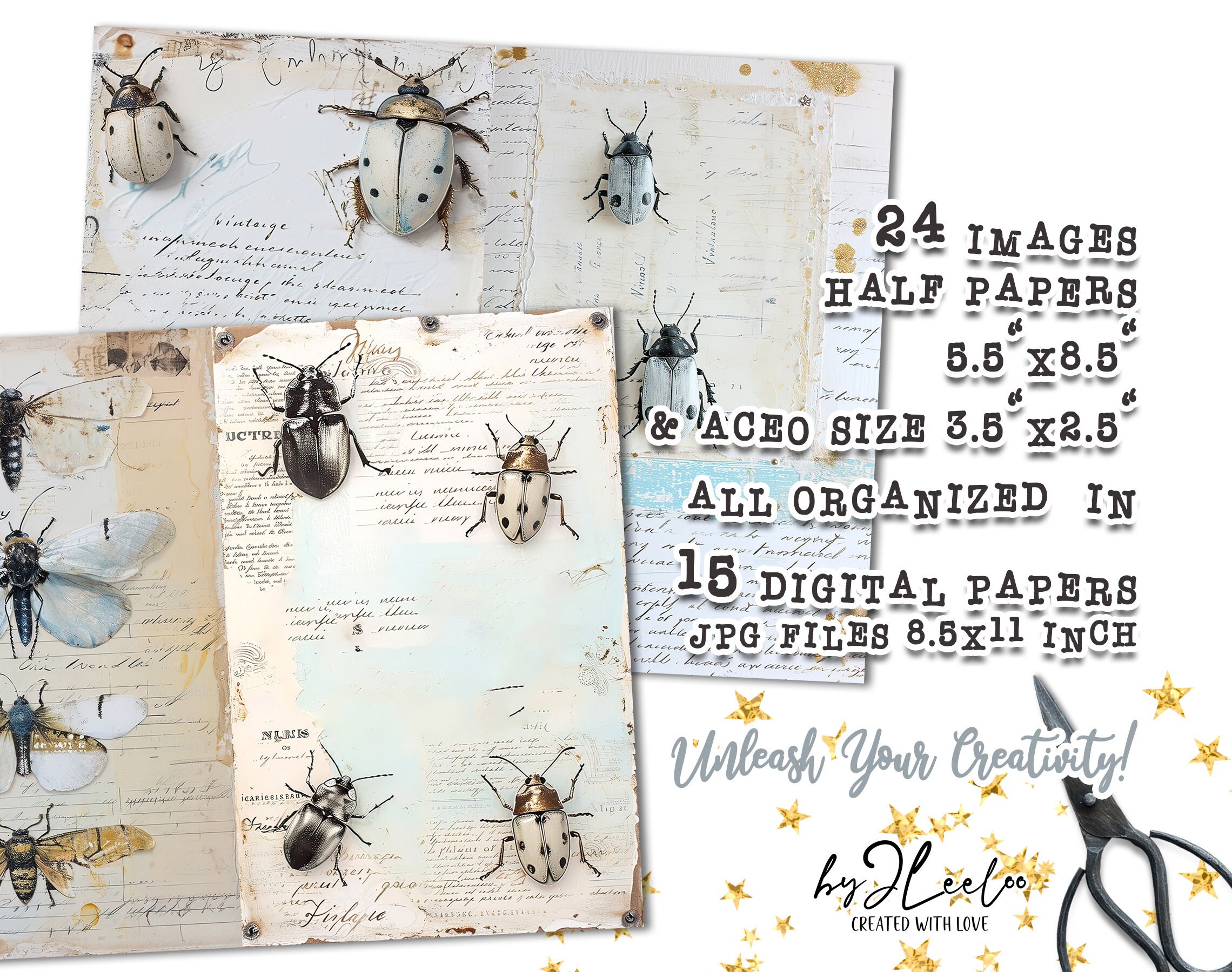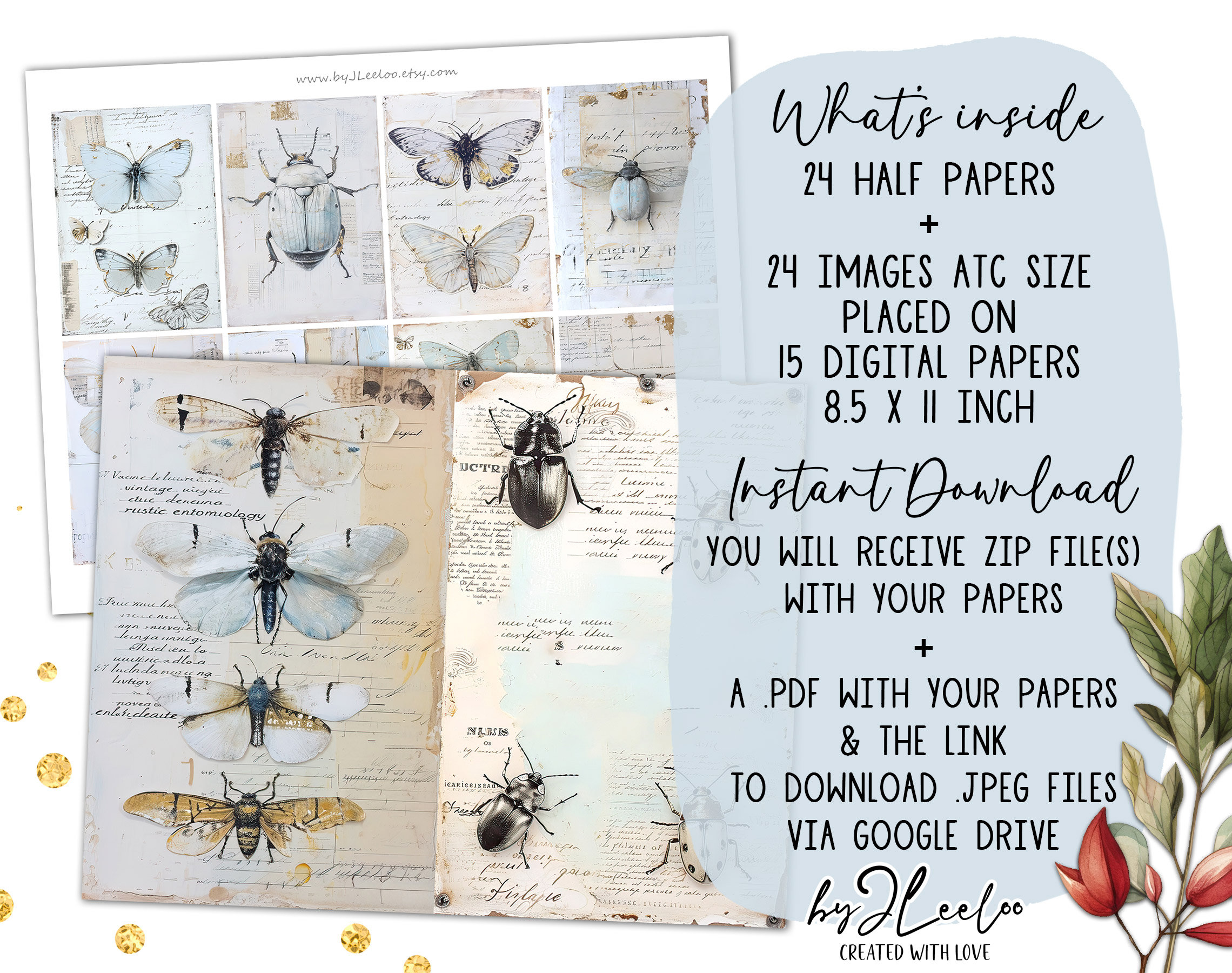 ๐ฆโจ Explore the timeless charm of 'Entomology' with these uniquely crafted minimalist collages. Immerse yourself in the delicate world of beetles, dragonflies, and more, captured on aged papers adorned with subtle hues of white, ivory, dusty light blue, and hints of gold. Each piece is a harmonious blend of script fragments and old letters. Perfect for digital art, junk journaling, scrapbooking, cards, and beyondโthese evocative images invite you to infuse your creations with a touch of rustic elegance. Transform your projects with the allure of nature's small wonders.