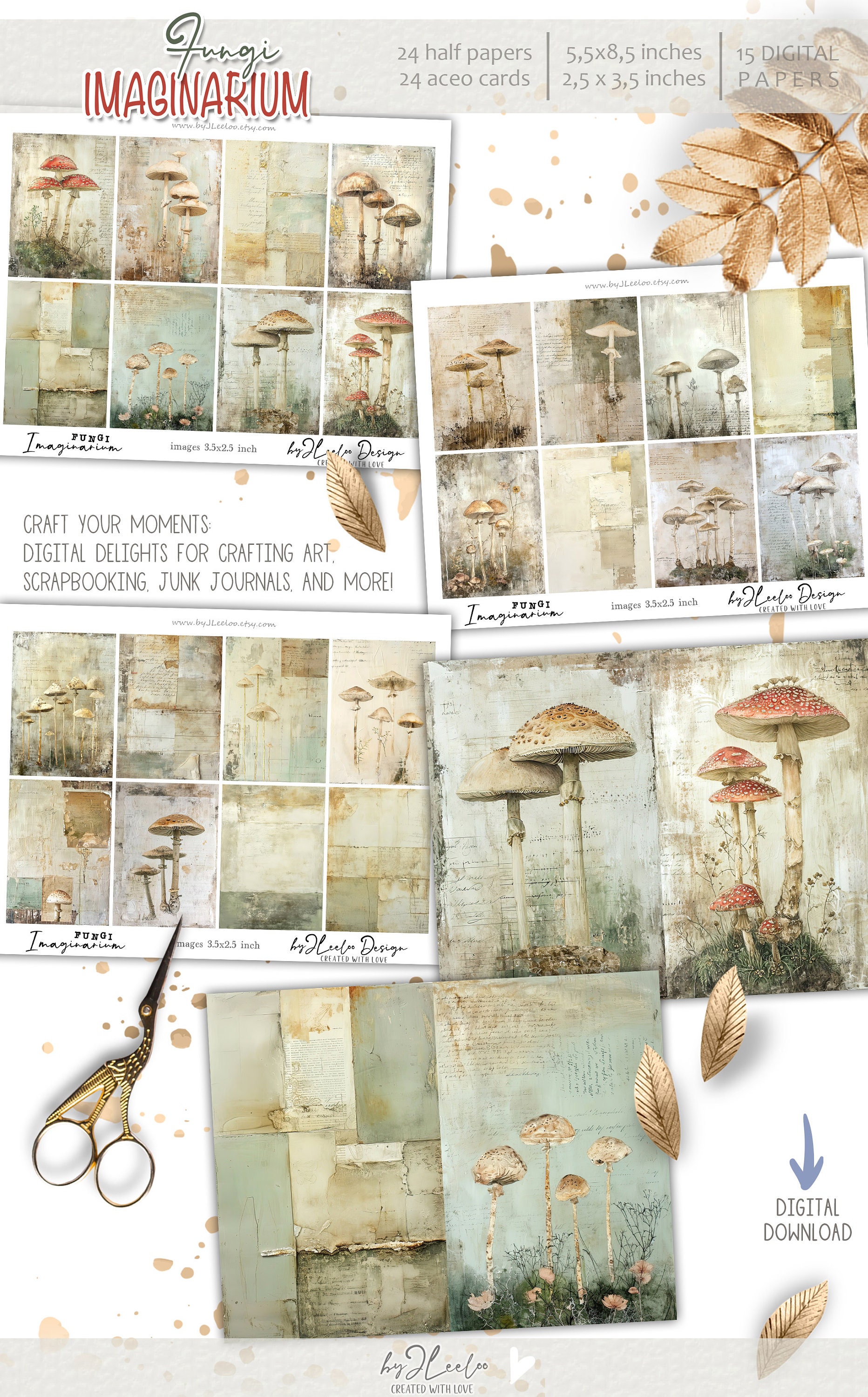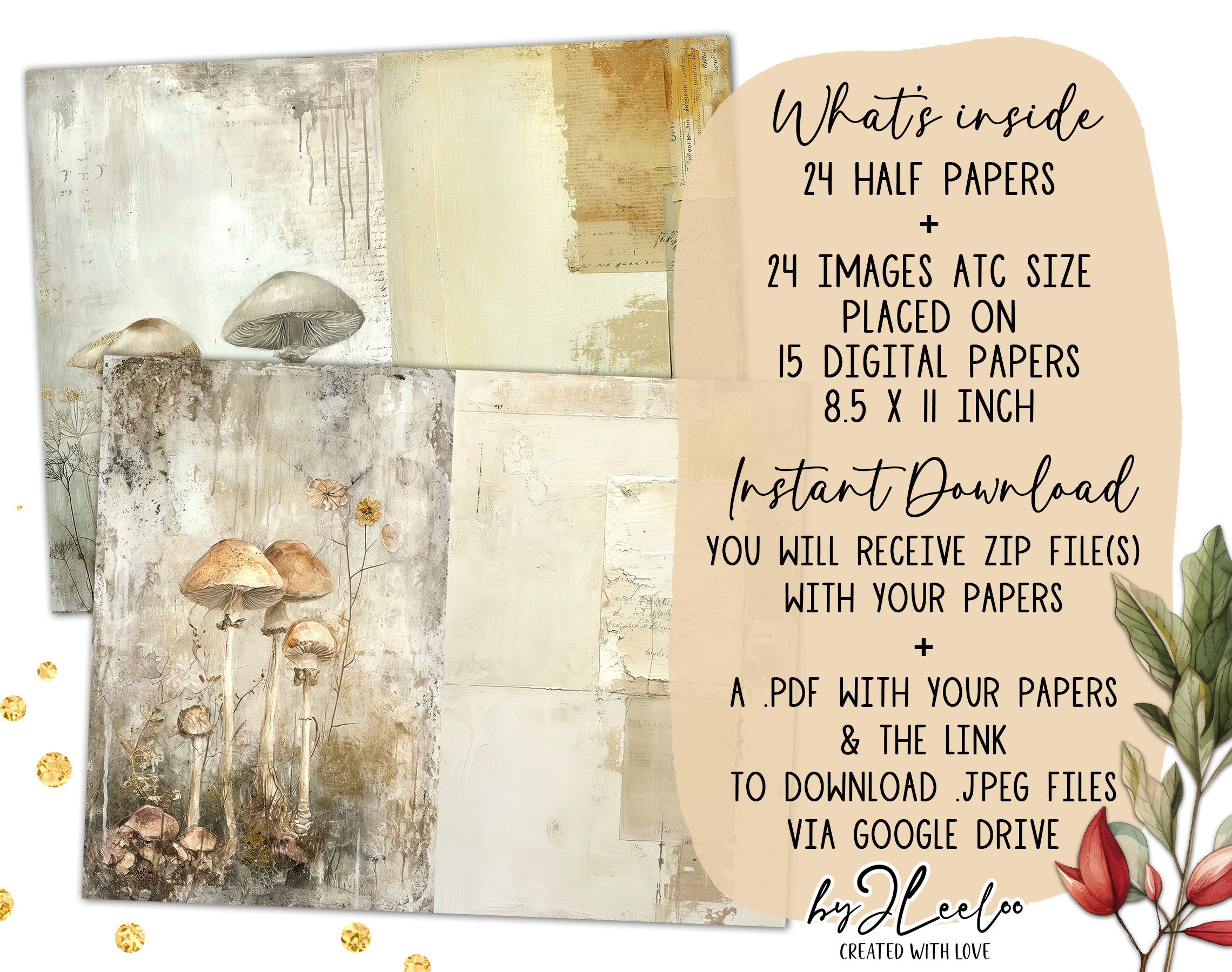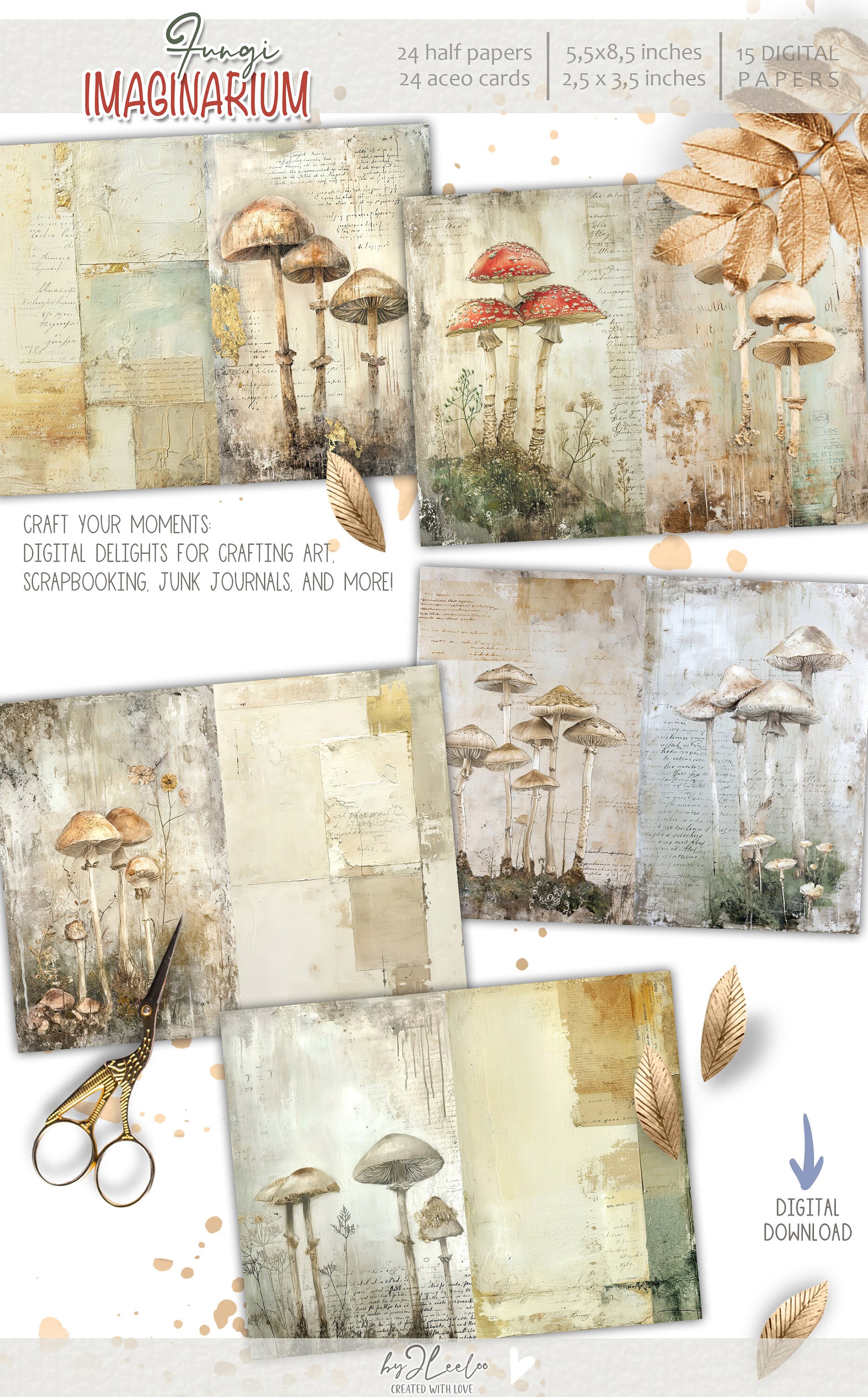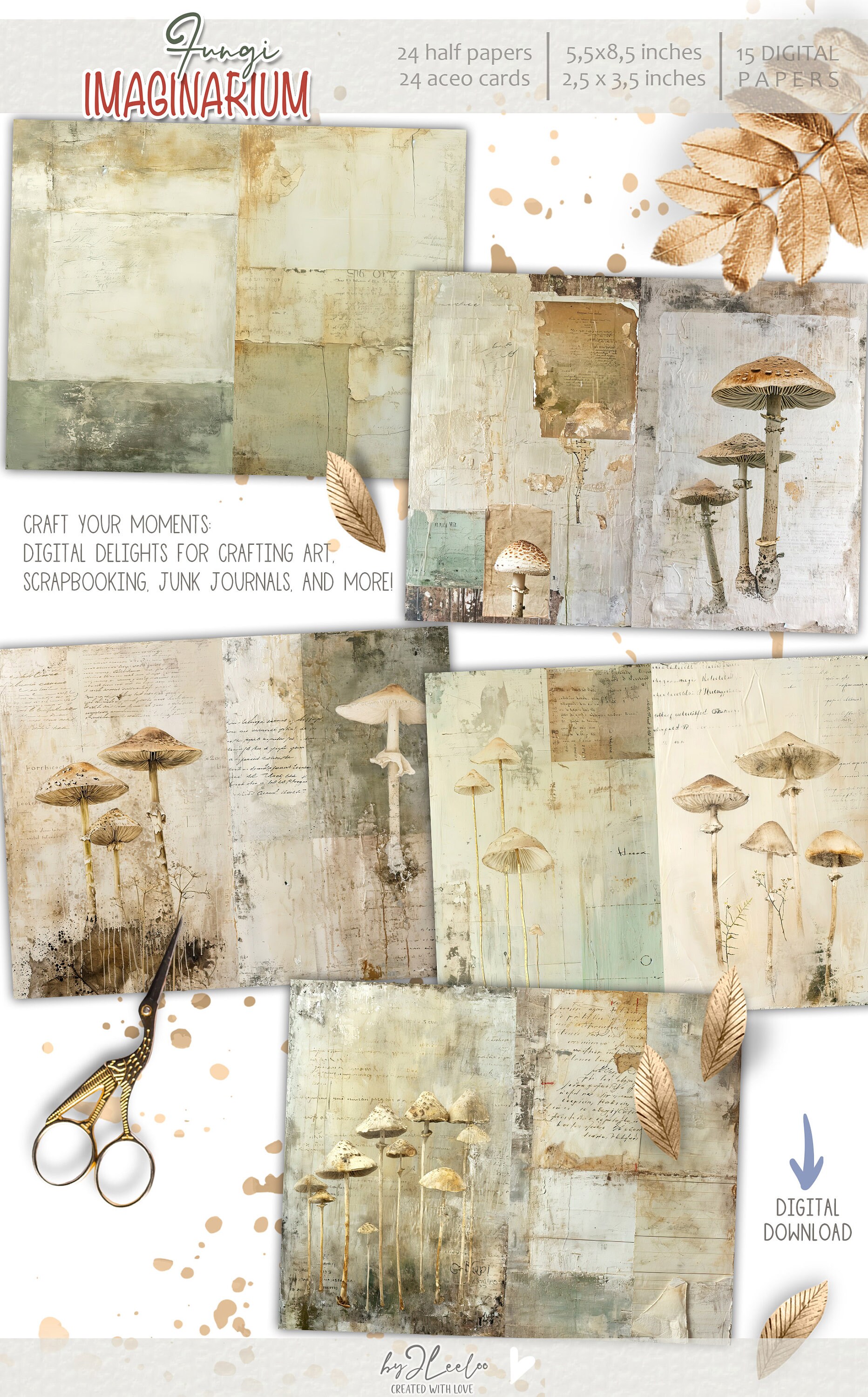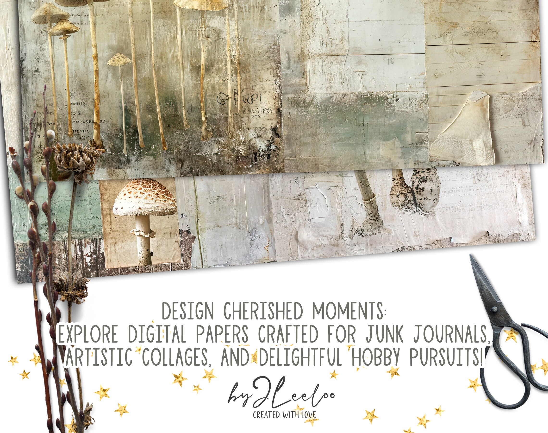 ๐ Step into the whimsical world of our romantic mushroom-themed collage backgrounds! Infused with magic, our paper is adorned with script fragments, aged papers in warm beige, ivory, and dusty green tones, kissed by gold. Add a touch of enchantment to your digital projects, junk journal, scrapbooking, and cards with these delightful and romantic mushroom-centric collages!