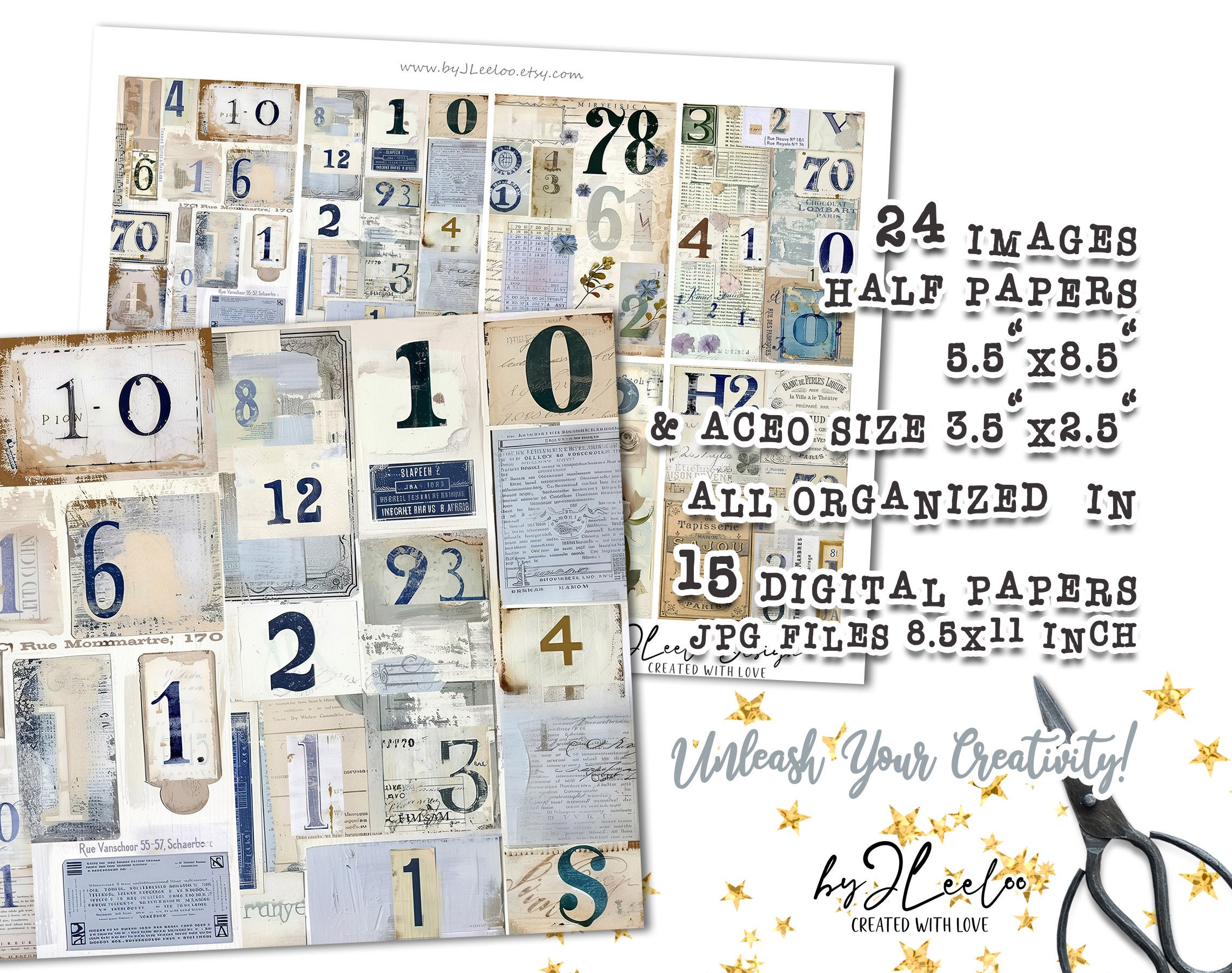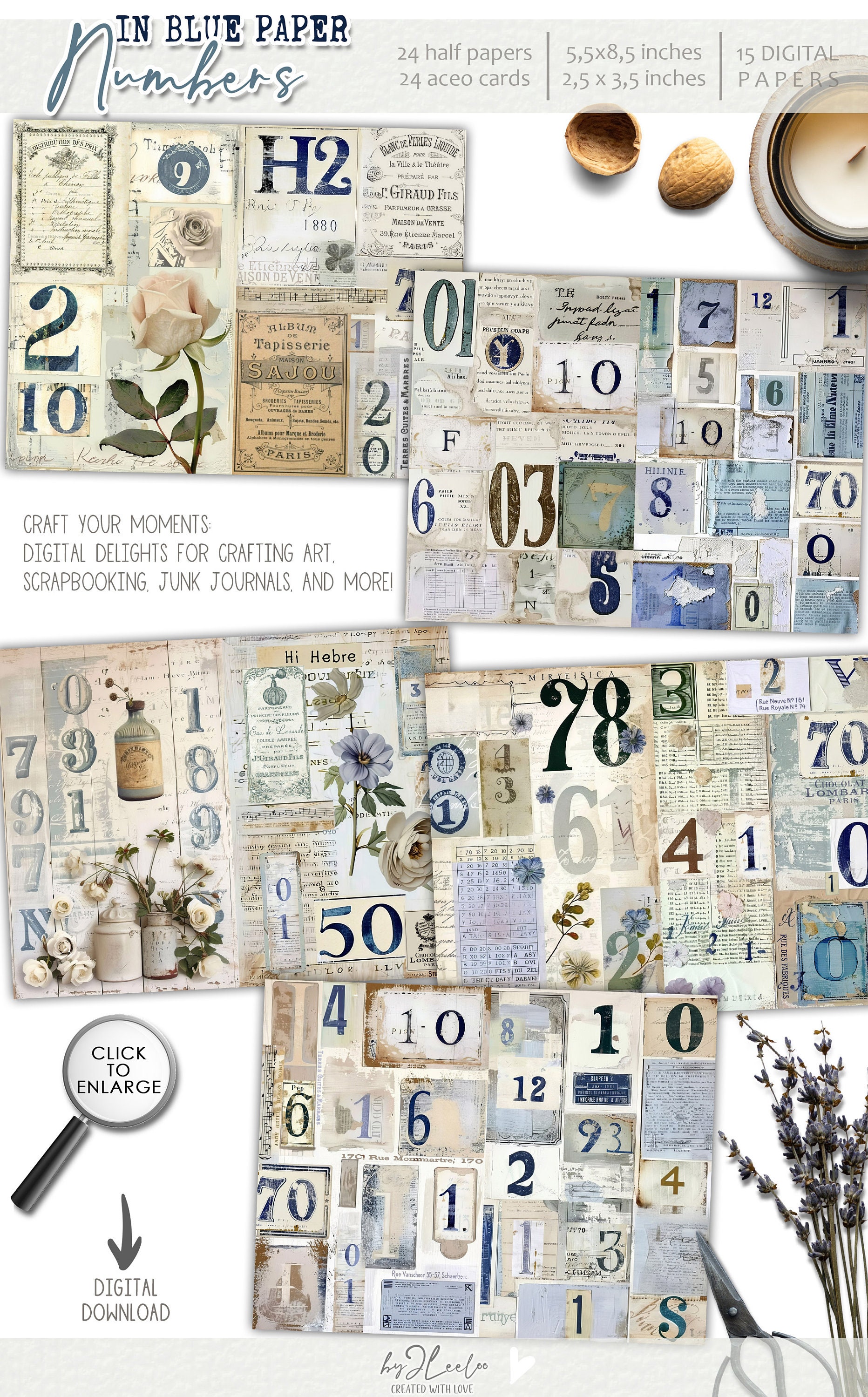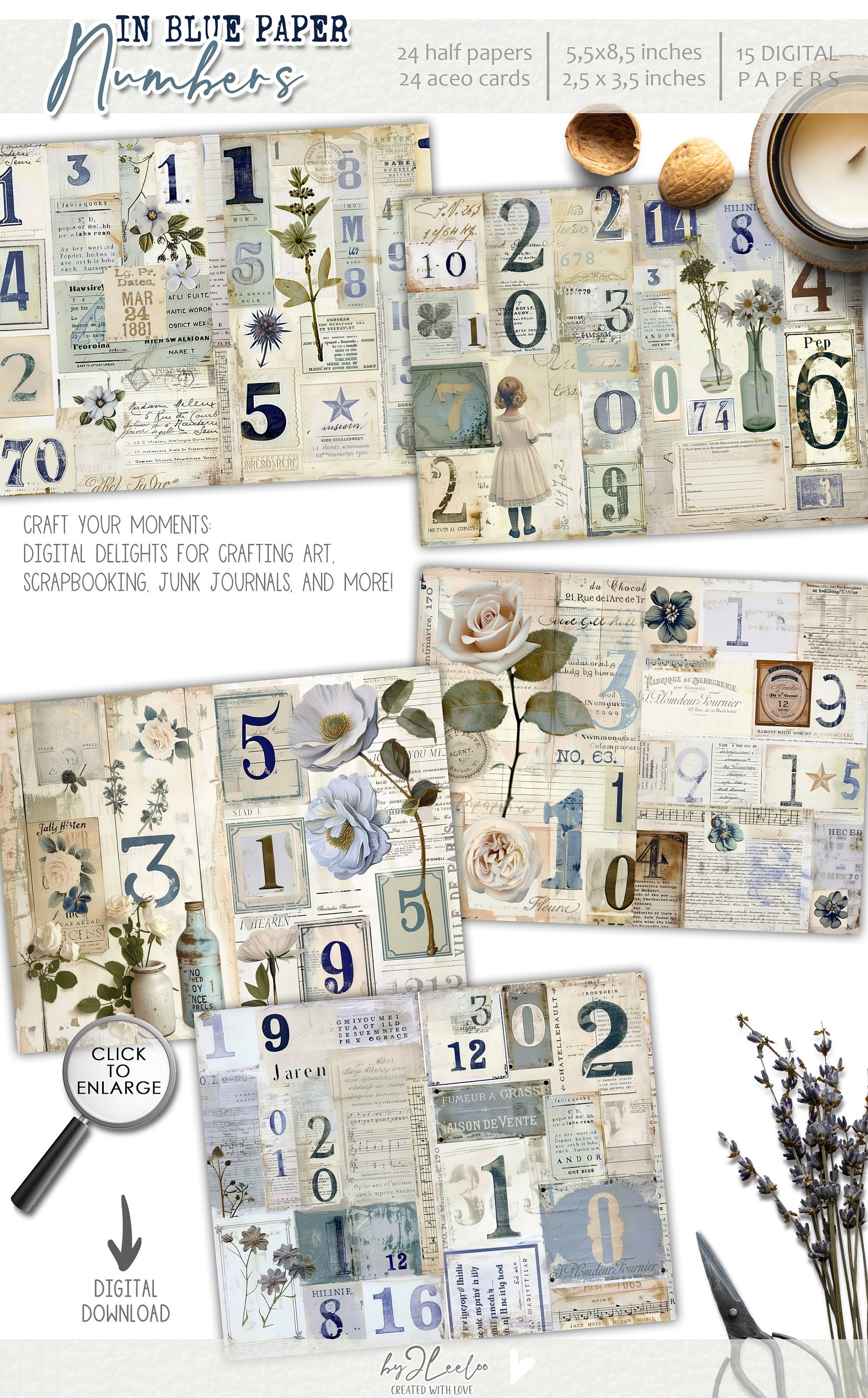 NUMBERS IN BLUE Paper half pages collage | Aceo junk journal Mixed Media supplies printable | Distressed whimsical Digital papers | pp736