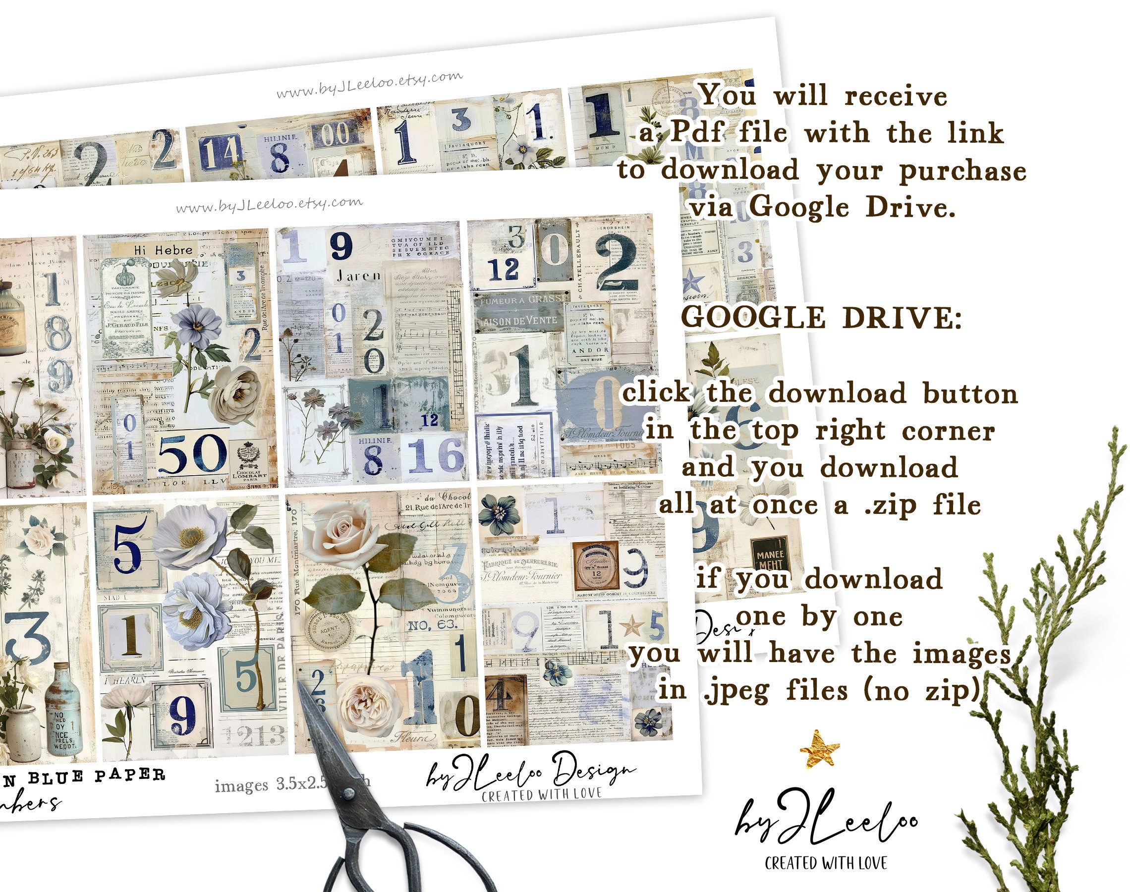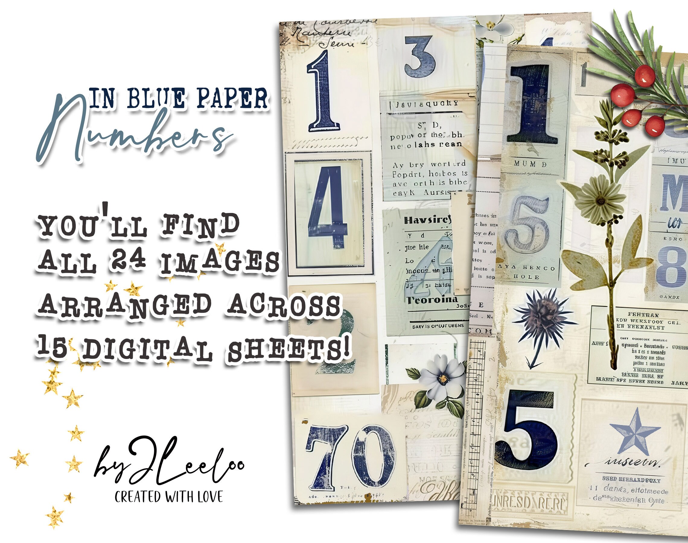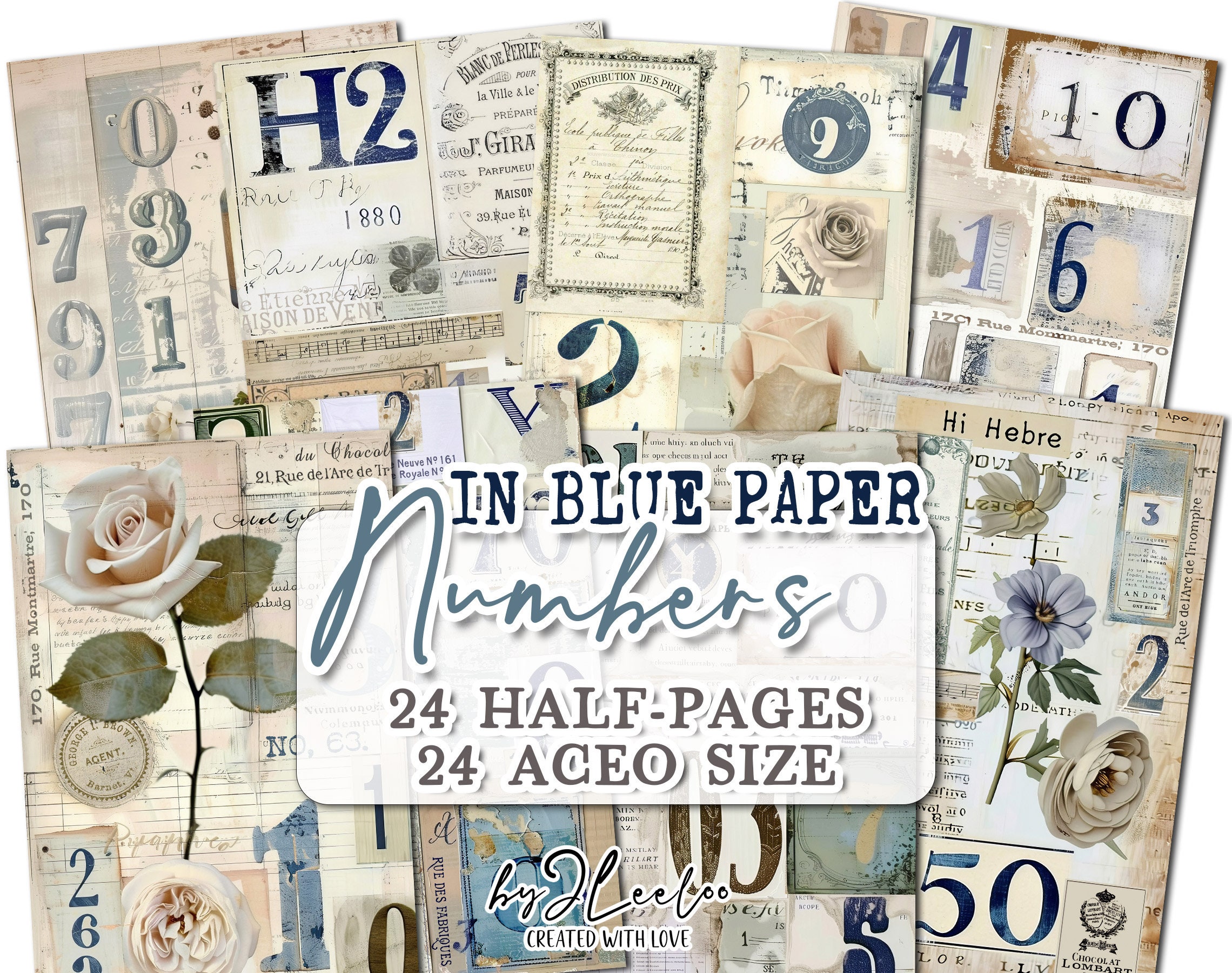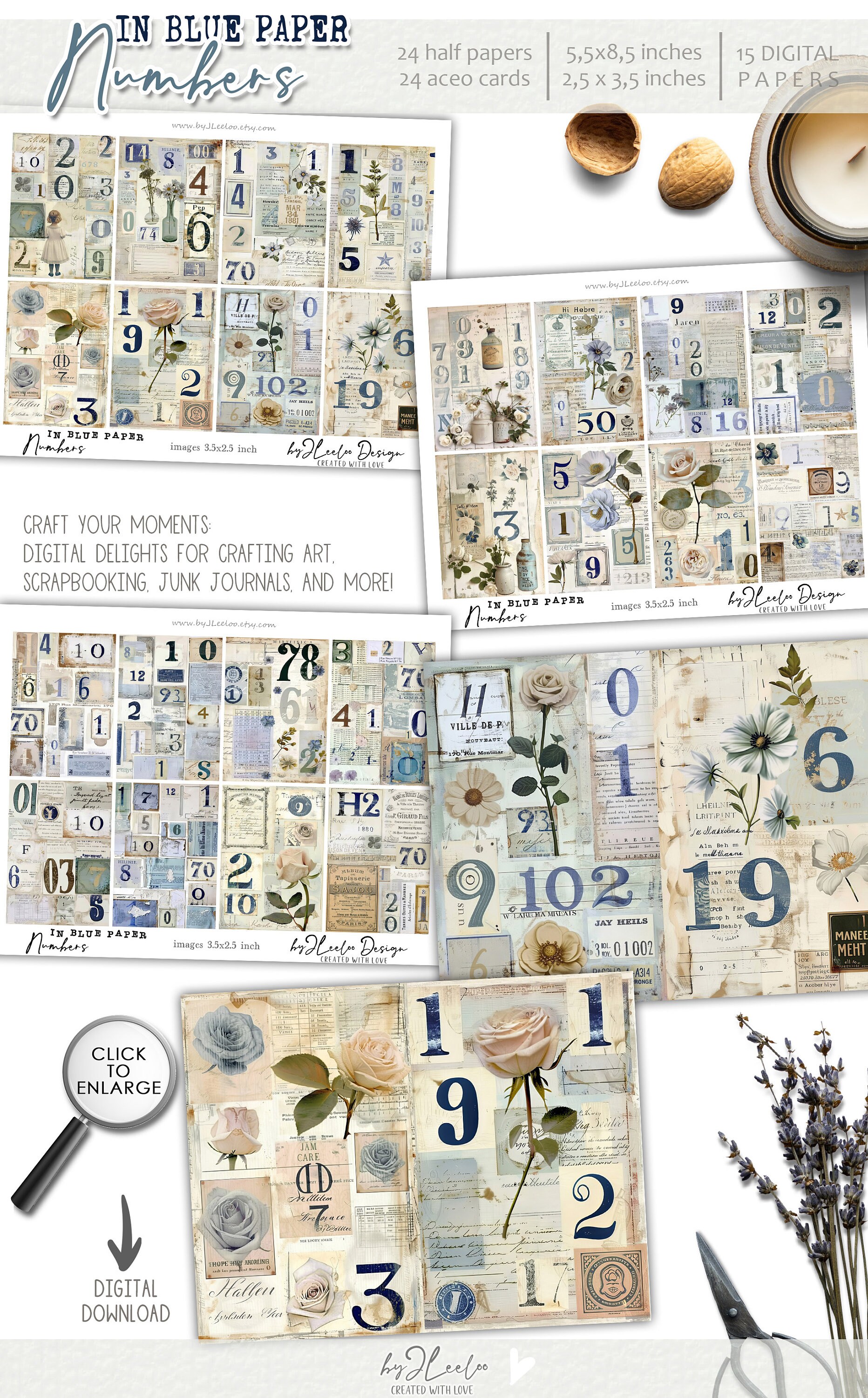NUMBERS IN BLUE Paper half pages collage | Aceo junk journal Mixed Media supplies printable | Distressed whimsical Digital papers | pp736