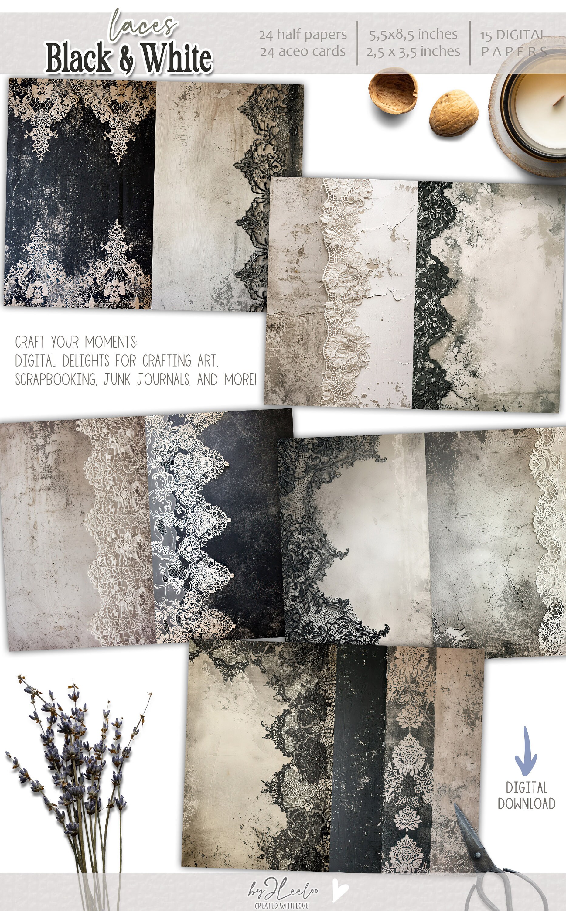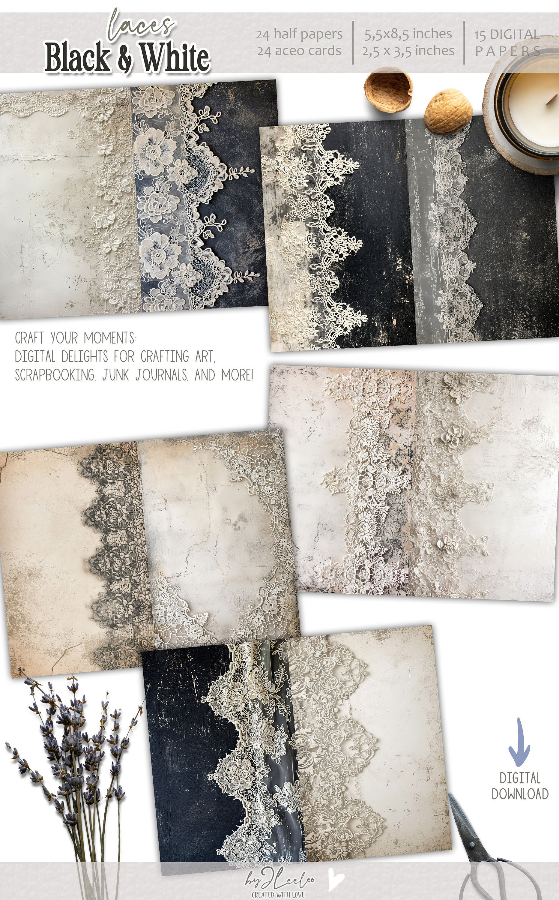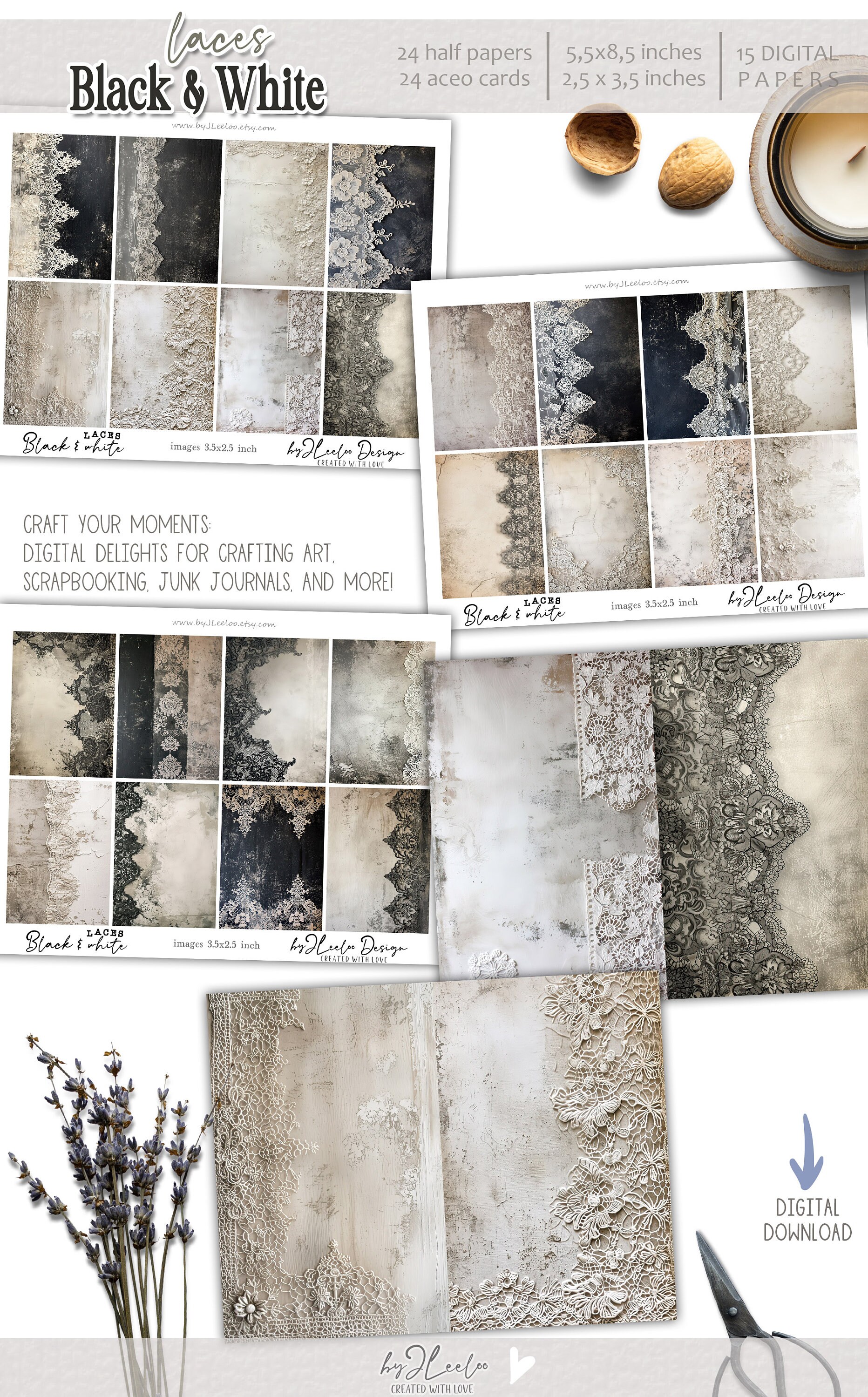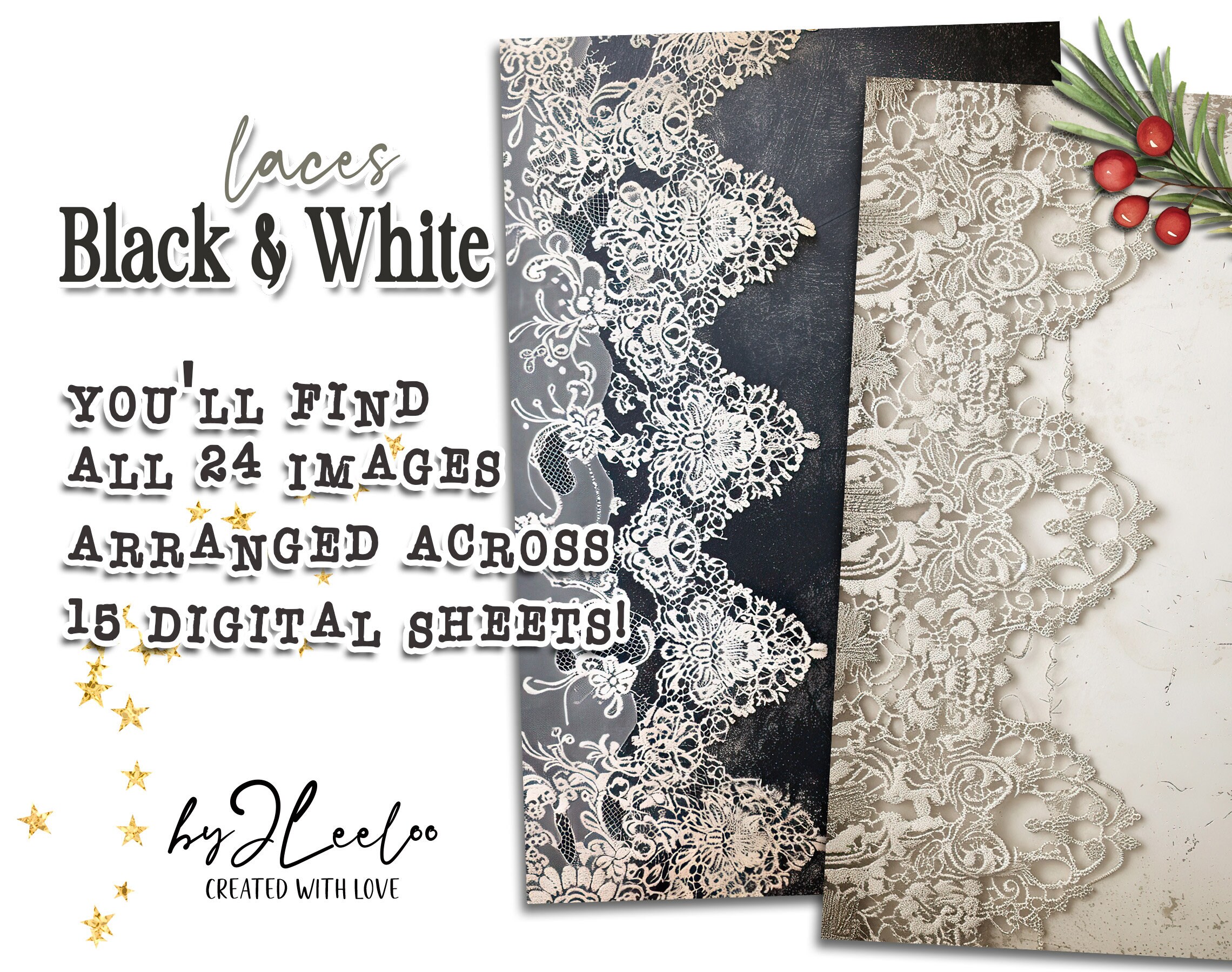 BLACK & WHITE LACES half pages printable | French Collage junk journal Mixed Media supplies | Shabby chic papers card making diary | pp721