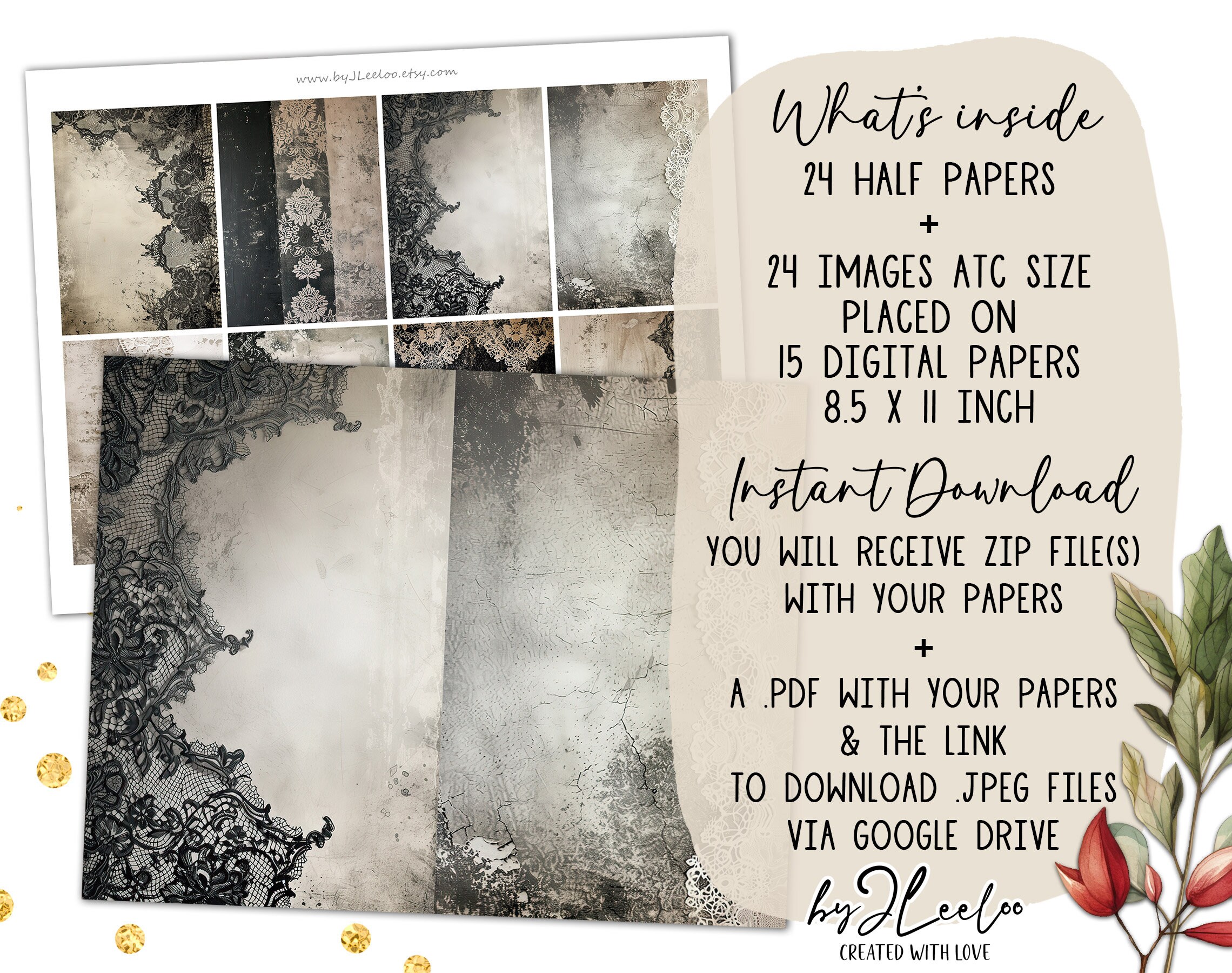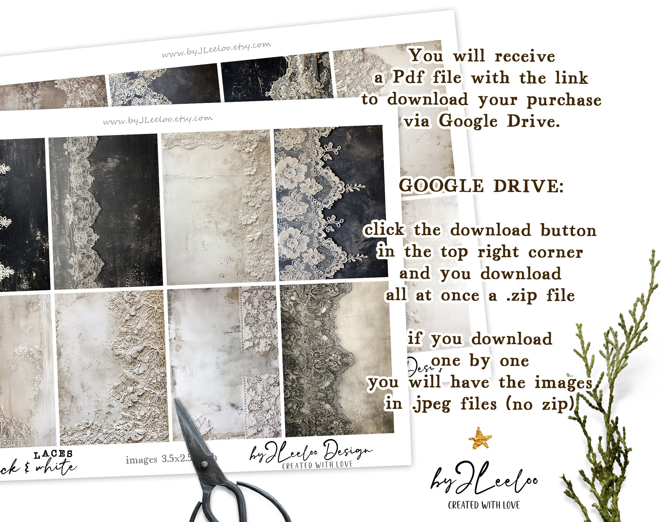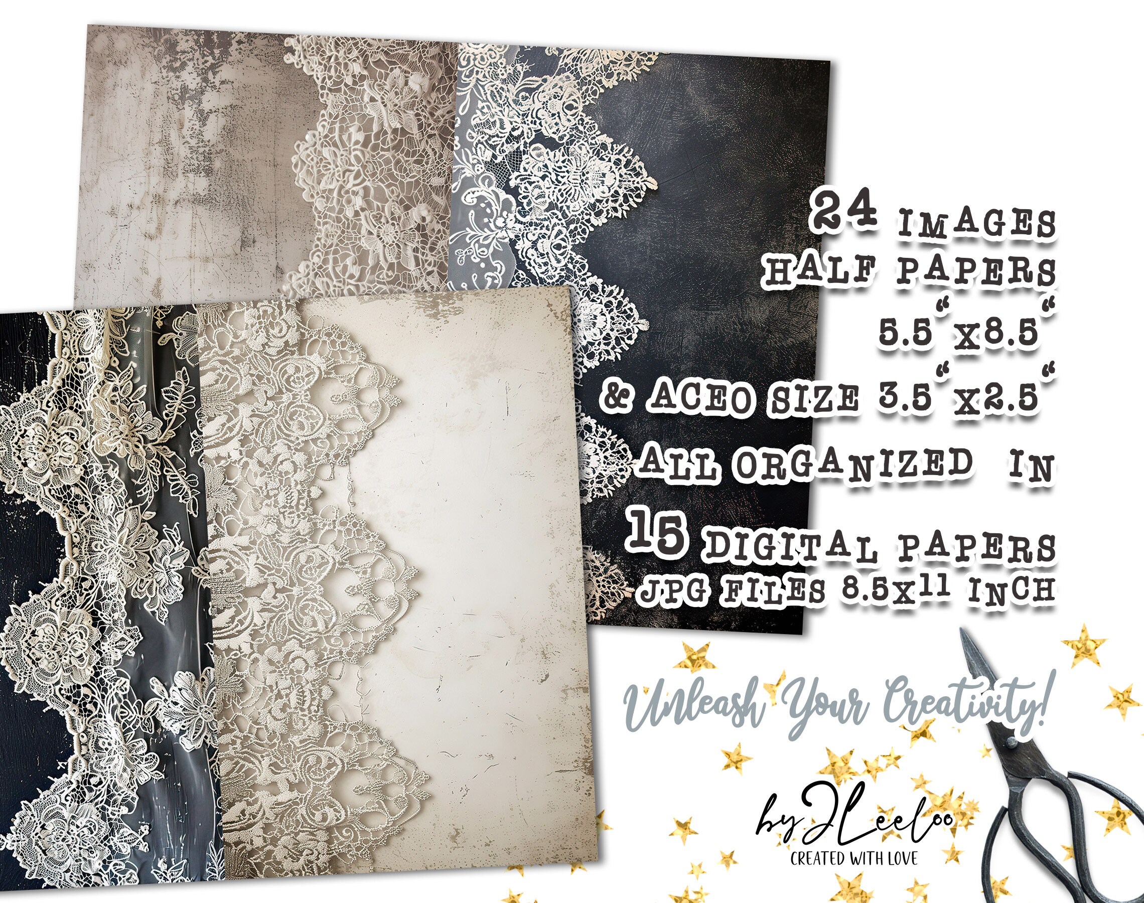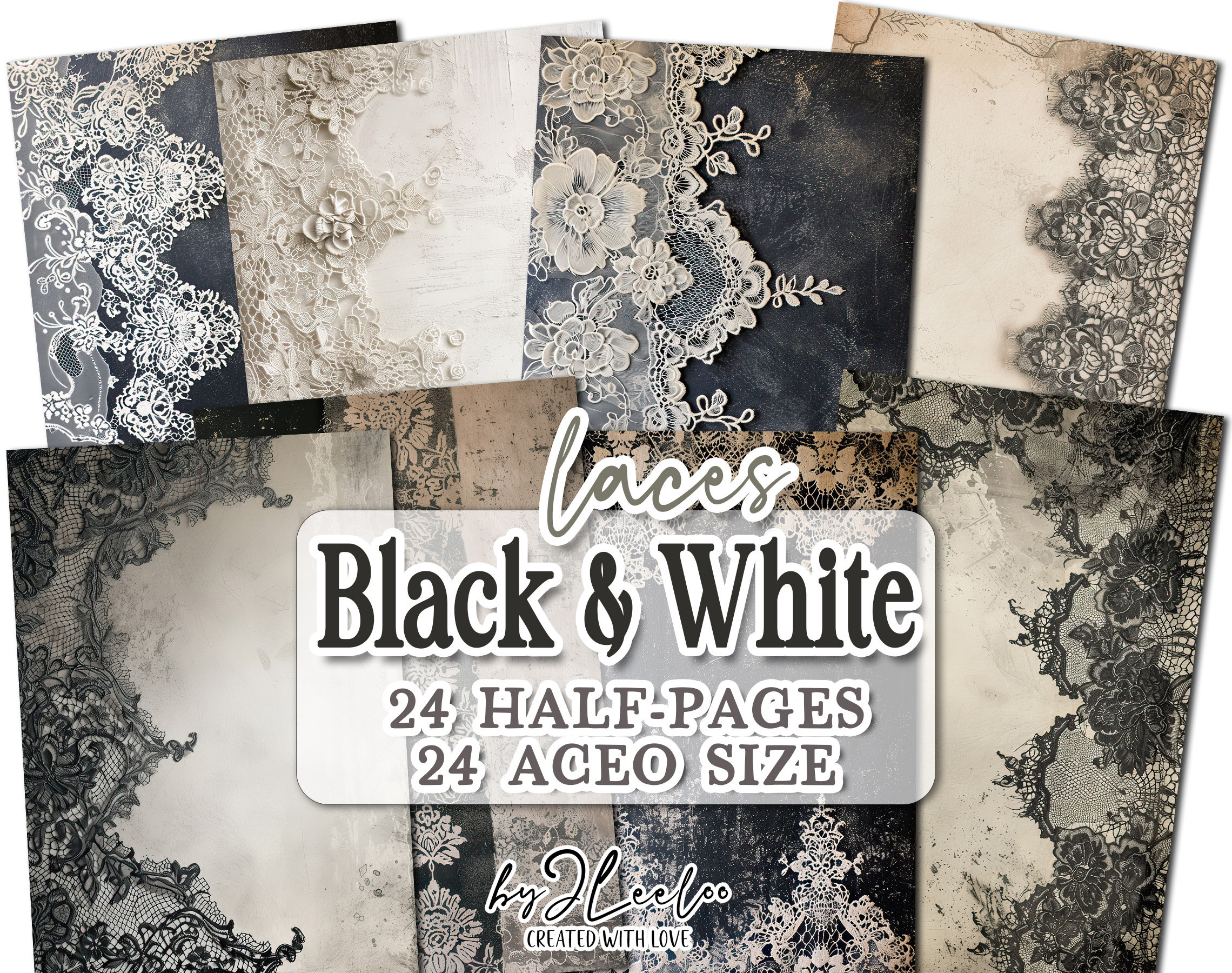 BLACK & WHITE LACES half pages printable | French Collage junk journal Mixed Media supplies | Shabby chic papers card making diary | pp721