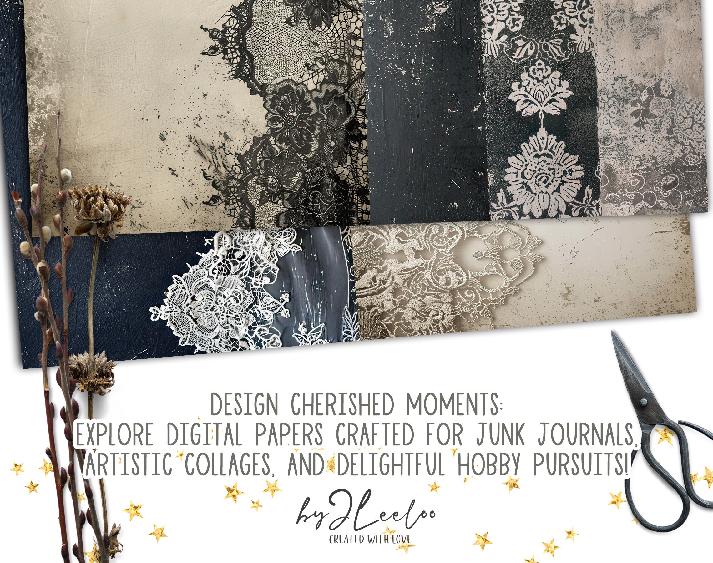 In the enchanting world of digital imagery, explore the timeless allure of aged lace in hues of both black and white. These vintage lace designs, worn and weathered, exude a rustic charm as they delicately rest upon aged paper. A symphony of faded elegance, these images serve as a perfect companion for hobbyists immersed in the art of paper crafts, journaling, scrapbooking, and the creation of mini books. Here, the boundaries are merely the constraints of imagination, allowing your creativity to soar boundlessly.