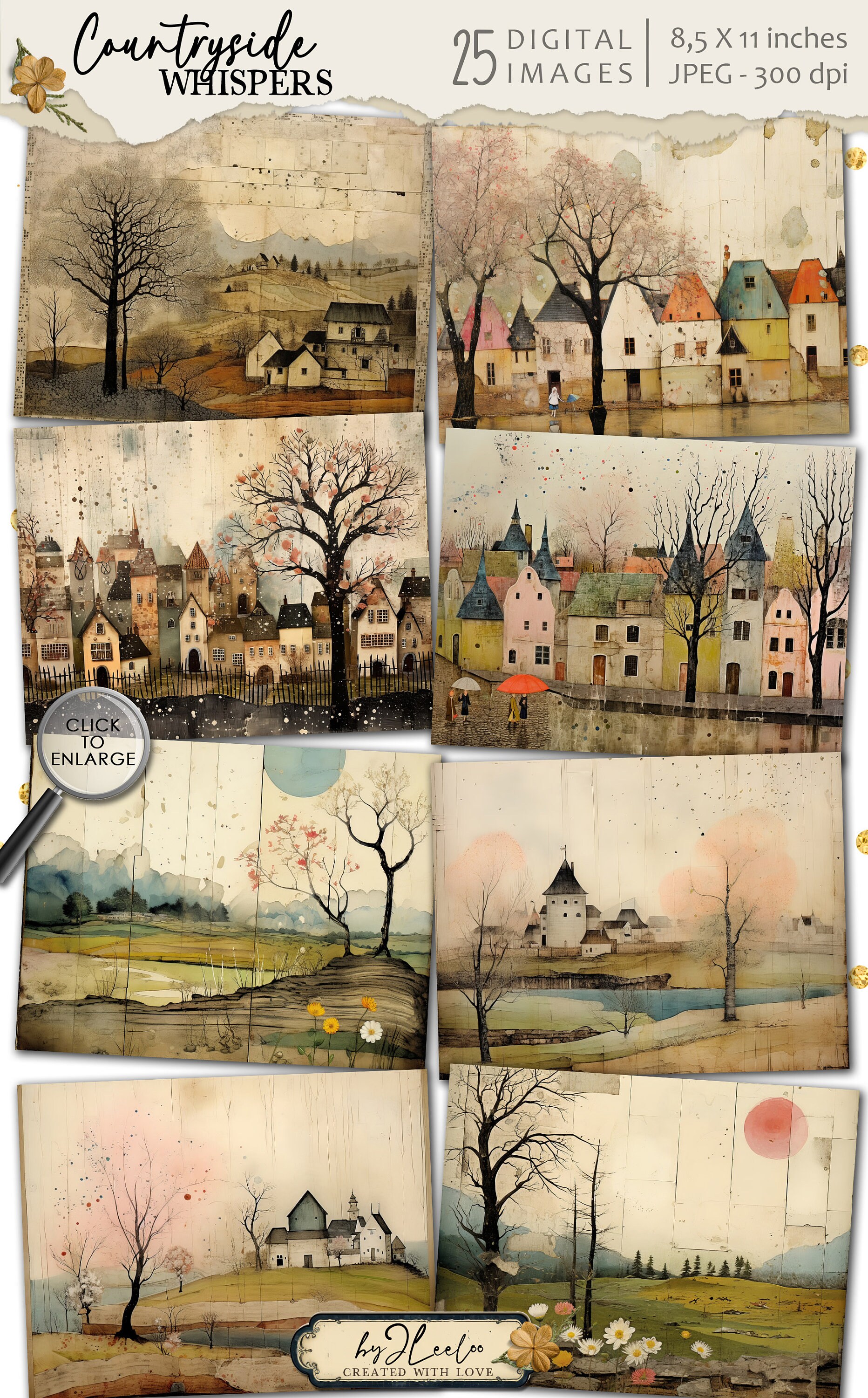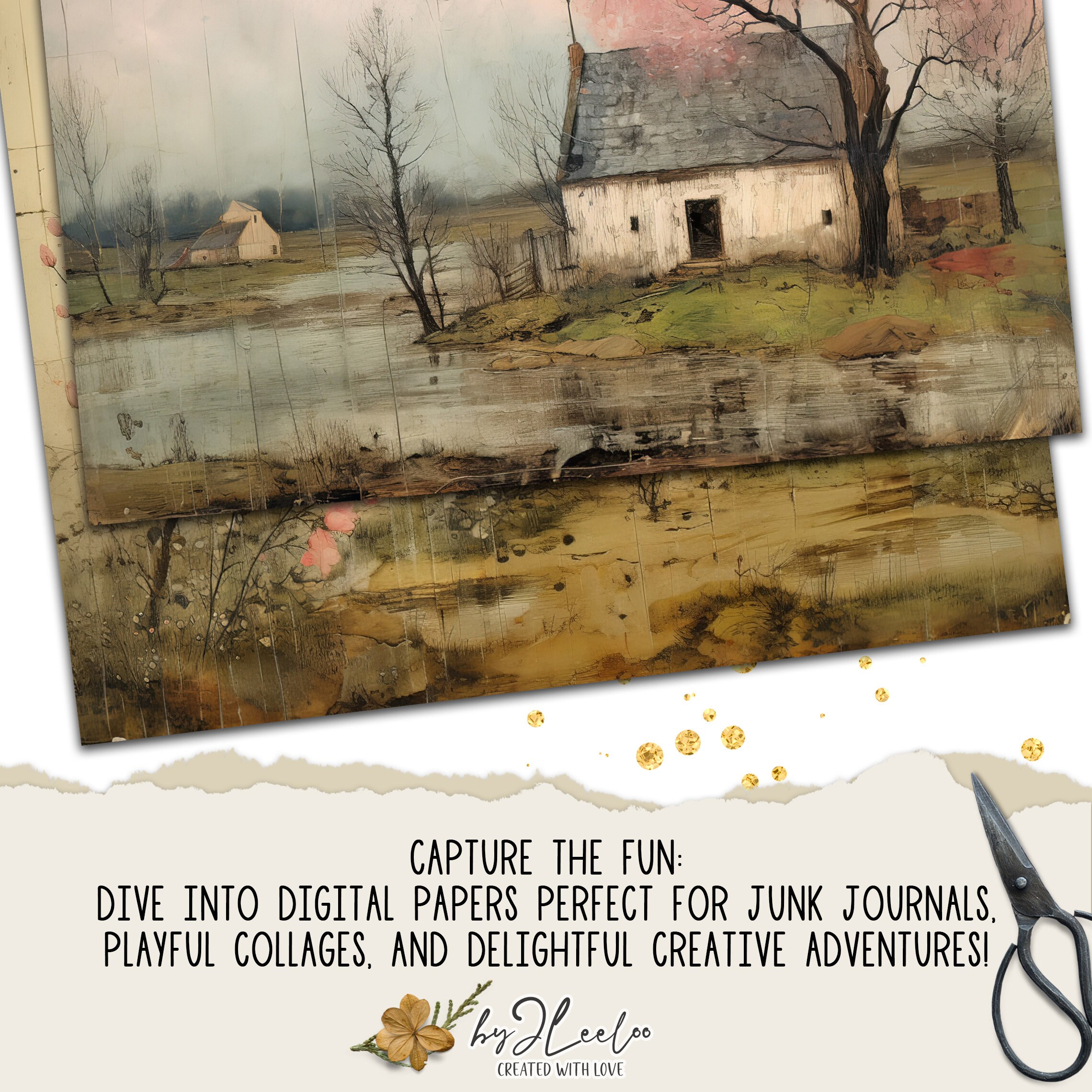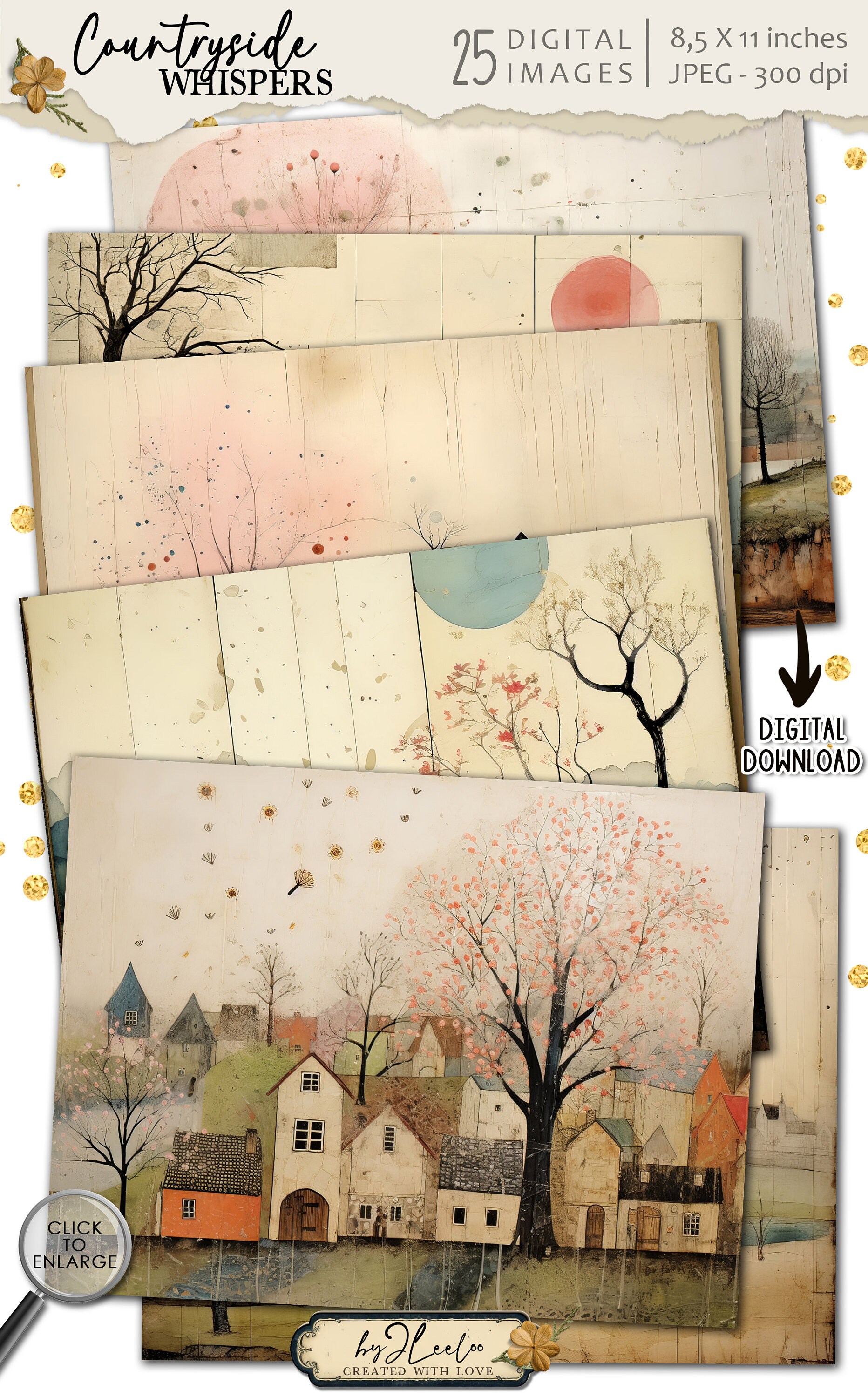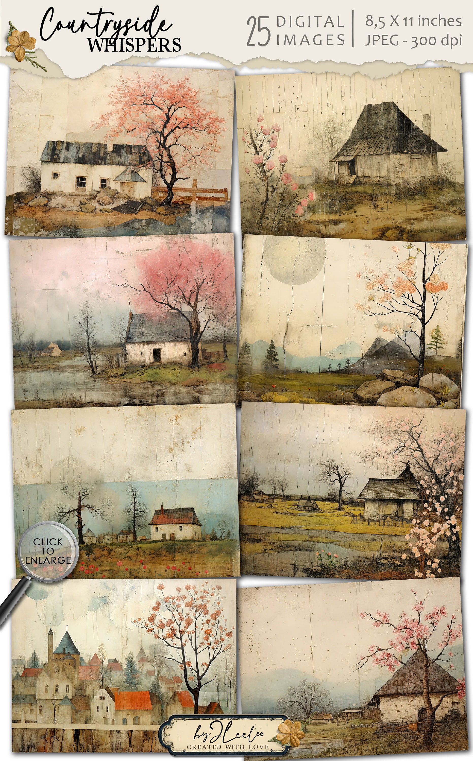COUNTRYSIDE WHISPERS landscape vintage papers | large Junk Journal pages background digital collage | village cottage spring poster | pp745