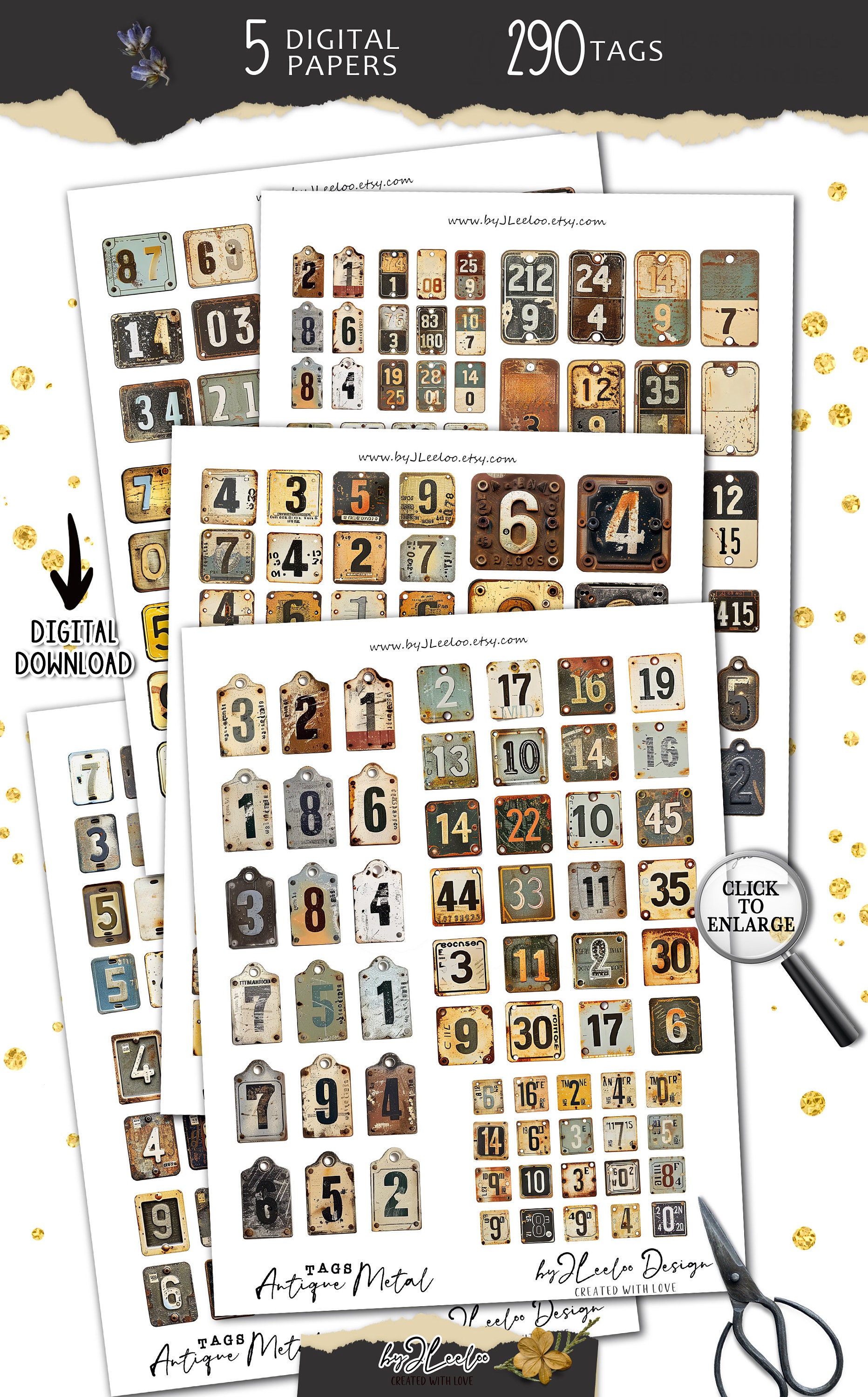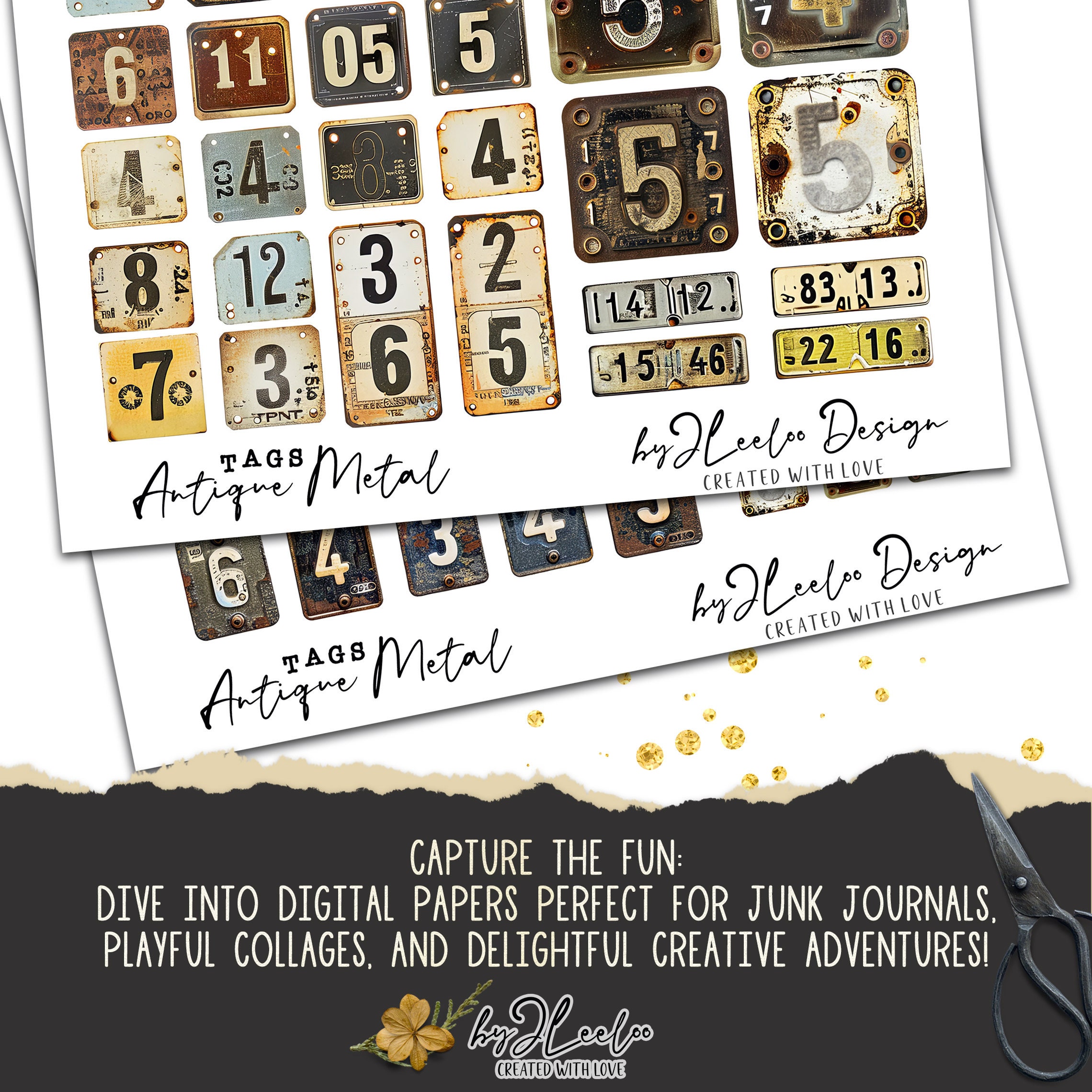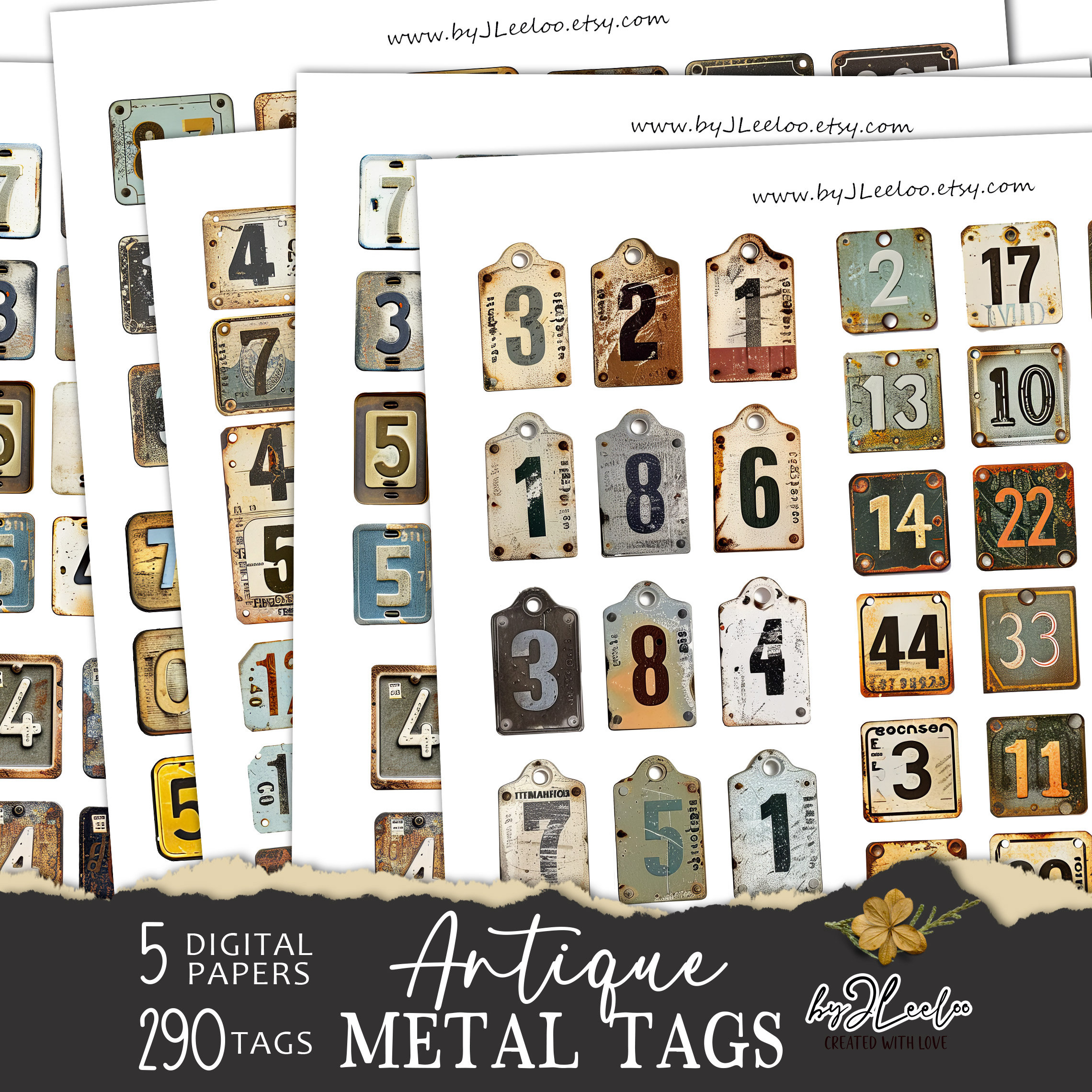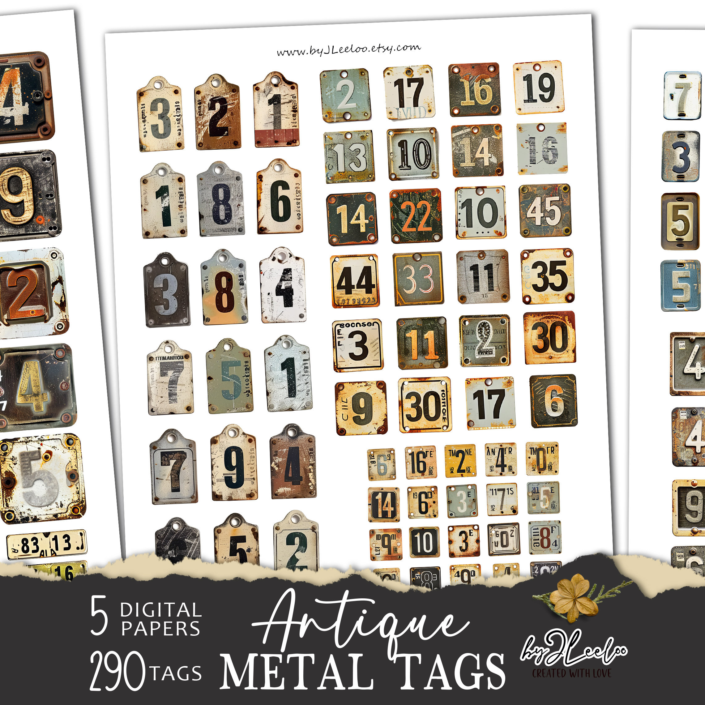 ANTIQUE METAL TAGS numbers labels printable steampunk supplies | Industrial vintage ephemera junk journal | images digital collage | tl278