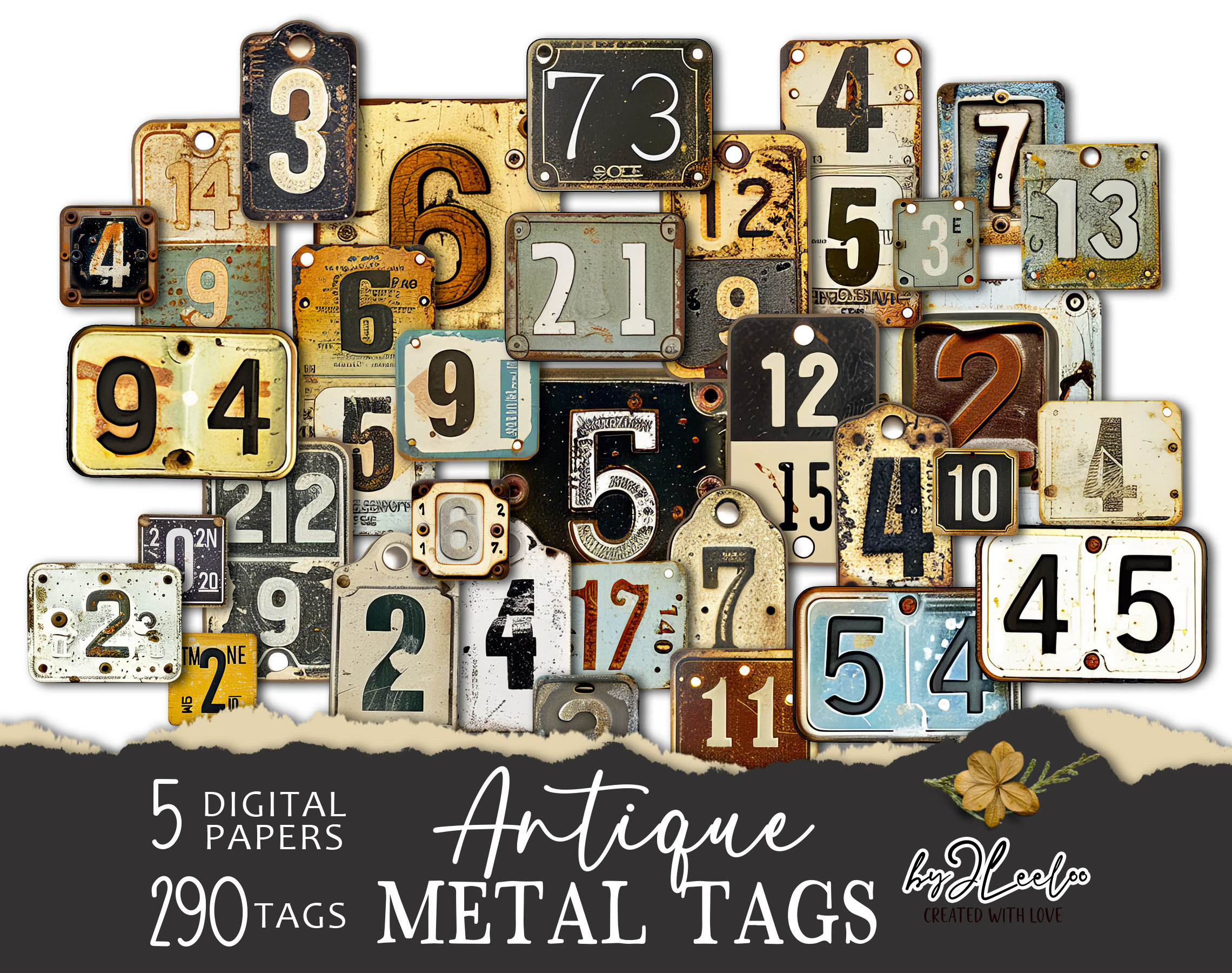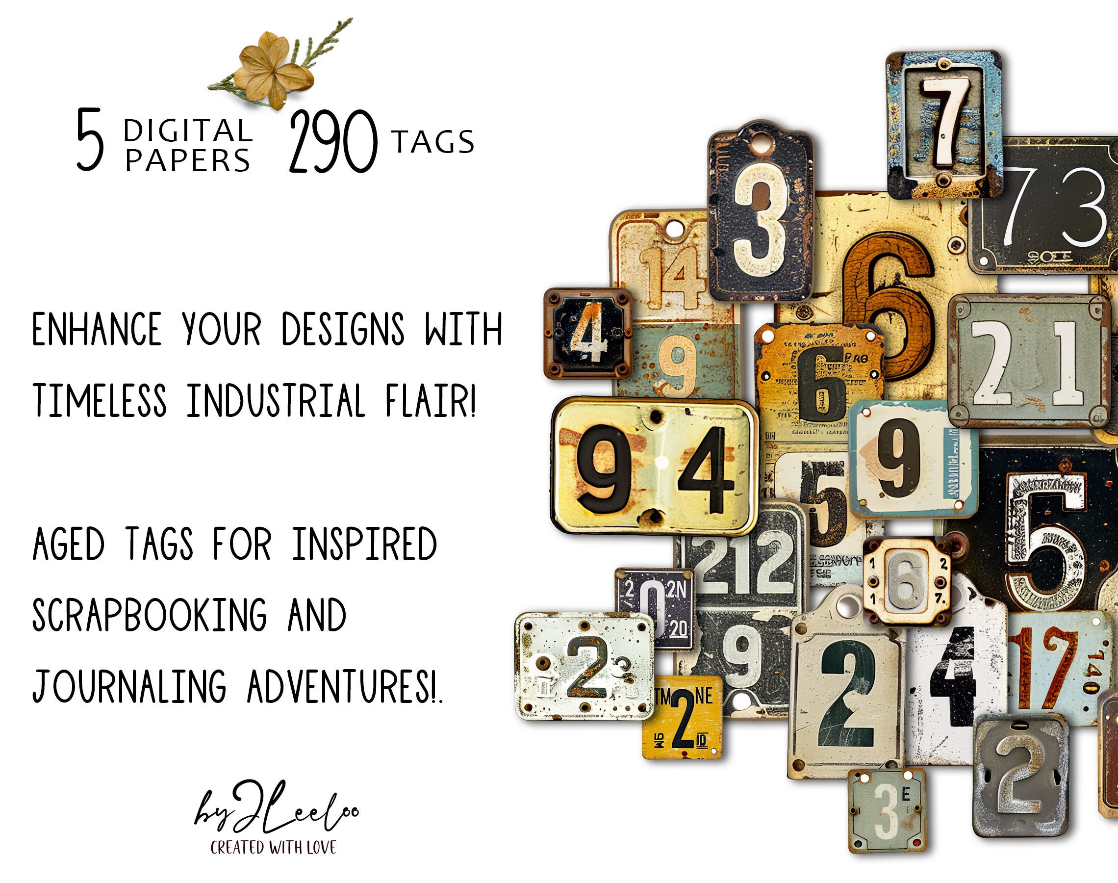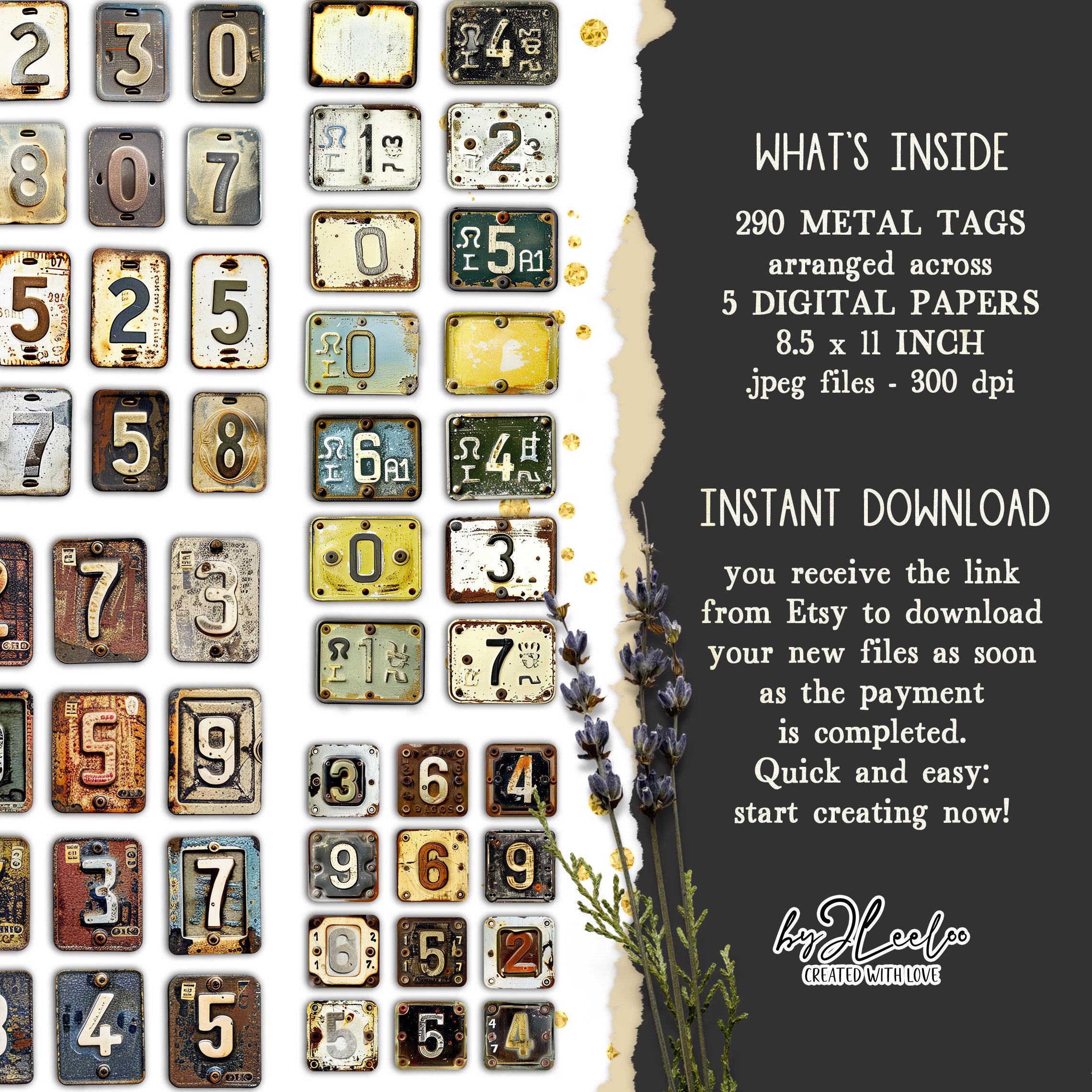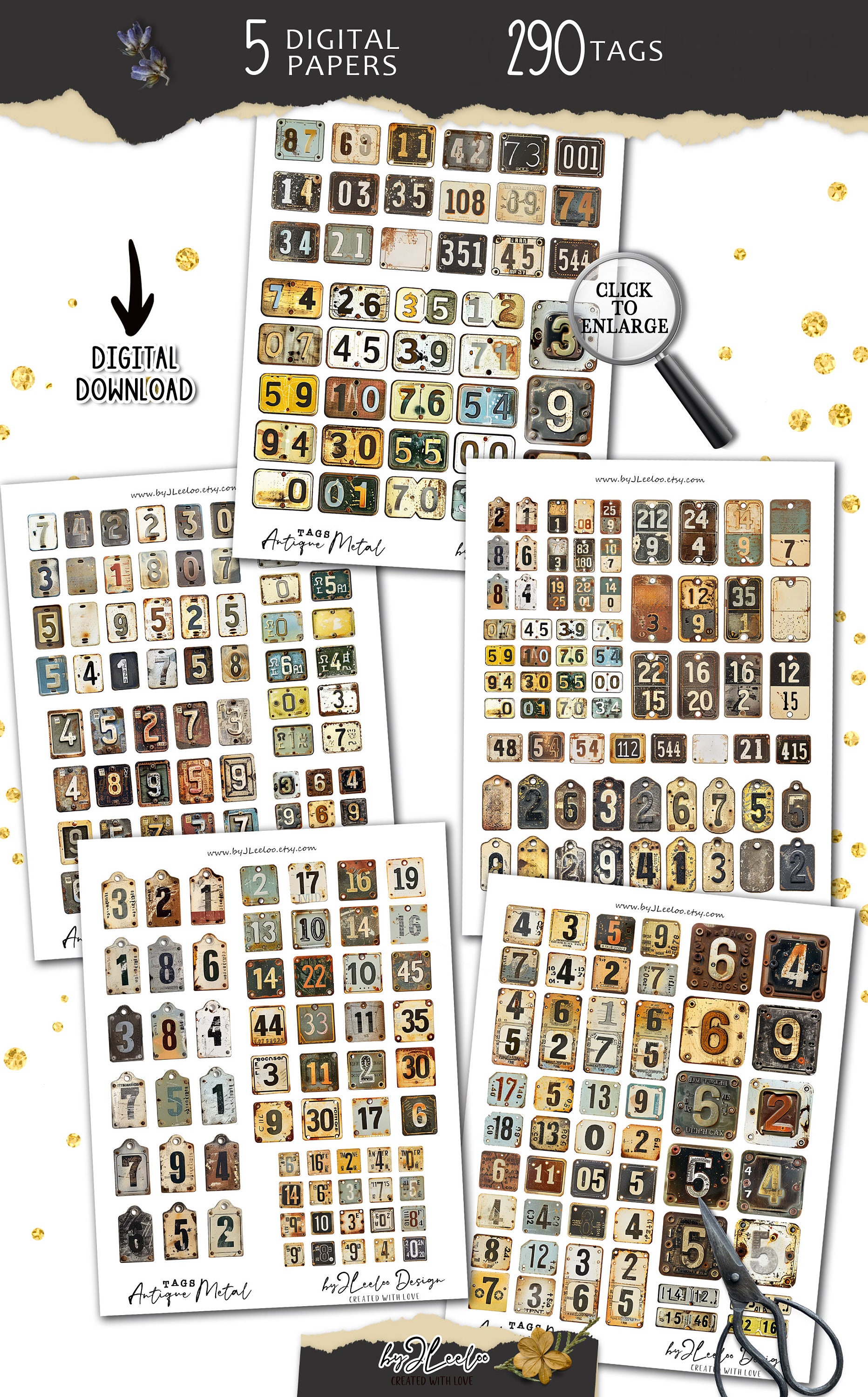 ANTIQUE METAL TAGS numbers labels printable steampunk supplies | Industrial vintage ephemera junk journal | images digital collage | tl278