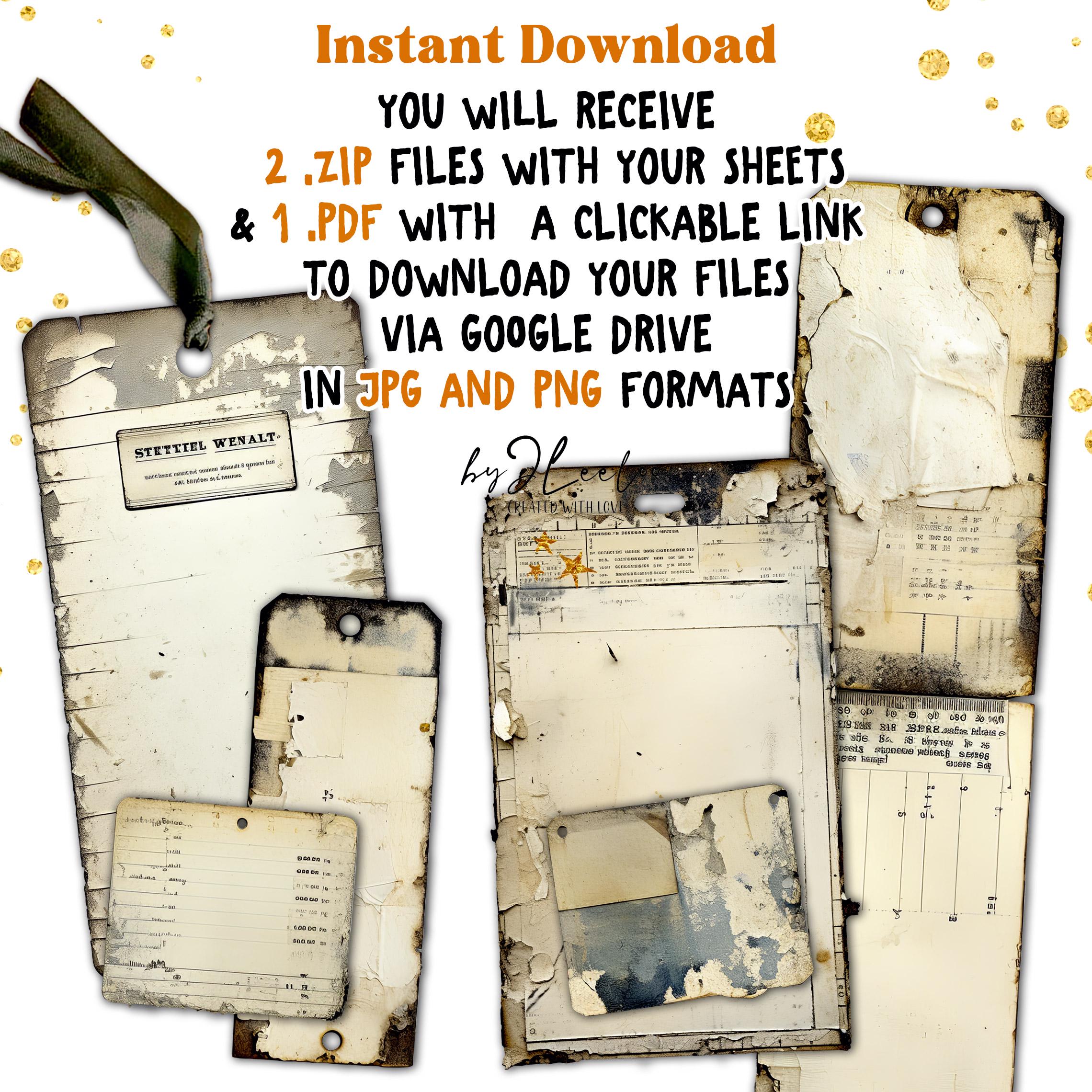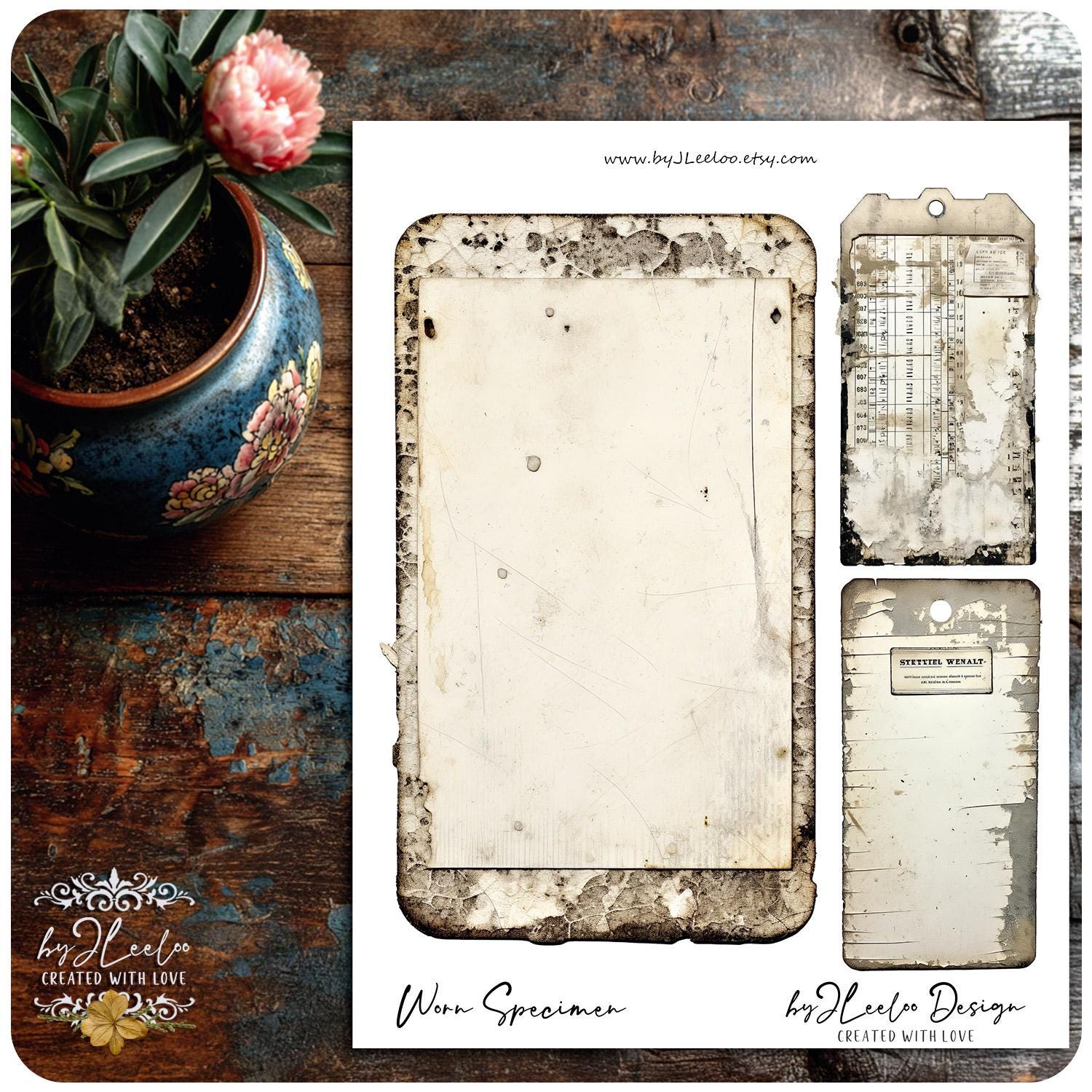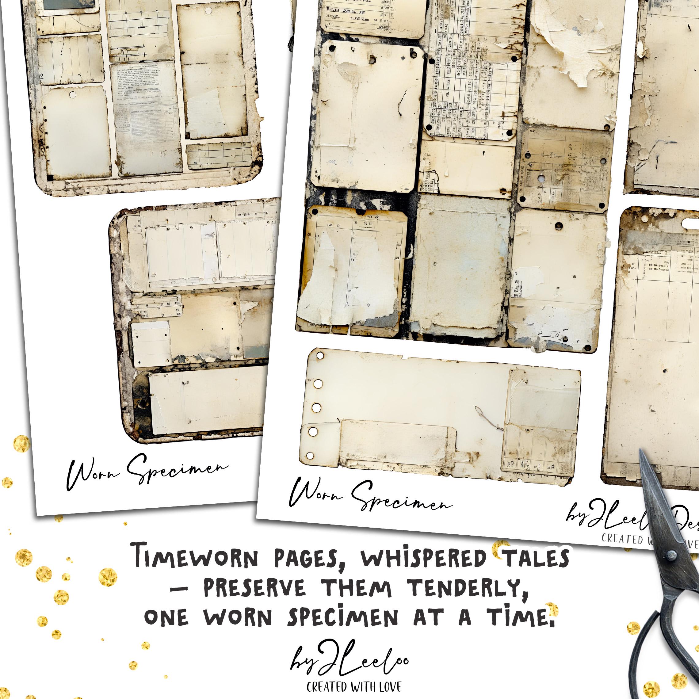 Inside you’ll find vintage-style specimen labels and tags in various sizes, each grungy and distressed, perfect for adding an authentic aged touch to your junk journals, scrapbooks, steampunk projects, or masculine-themed creations.