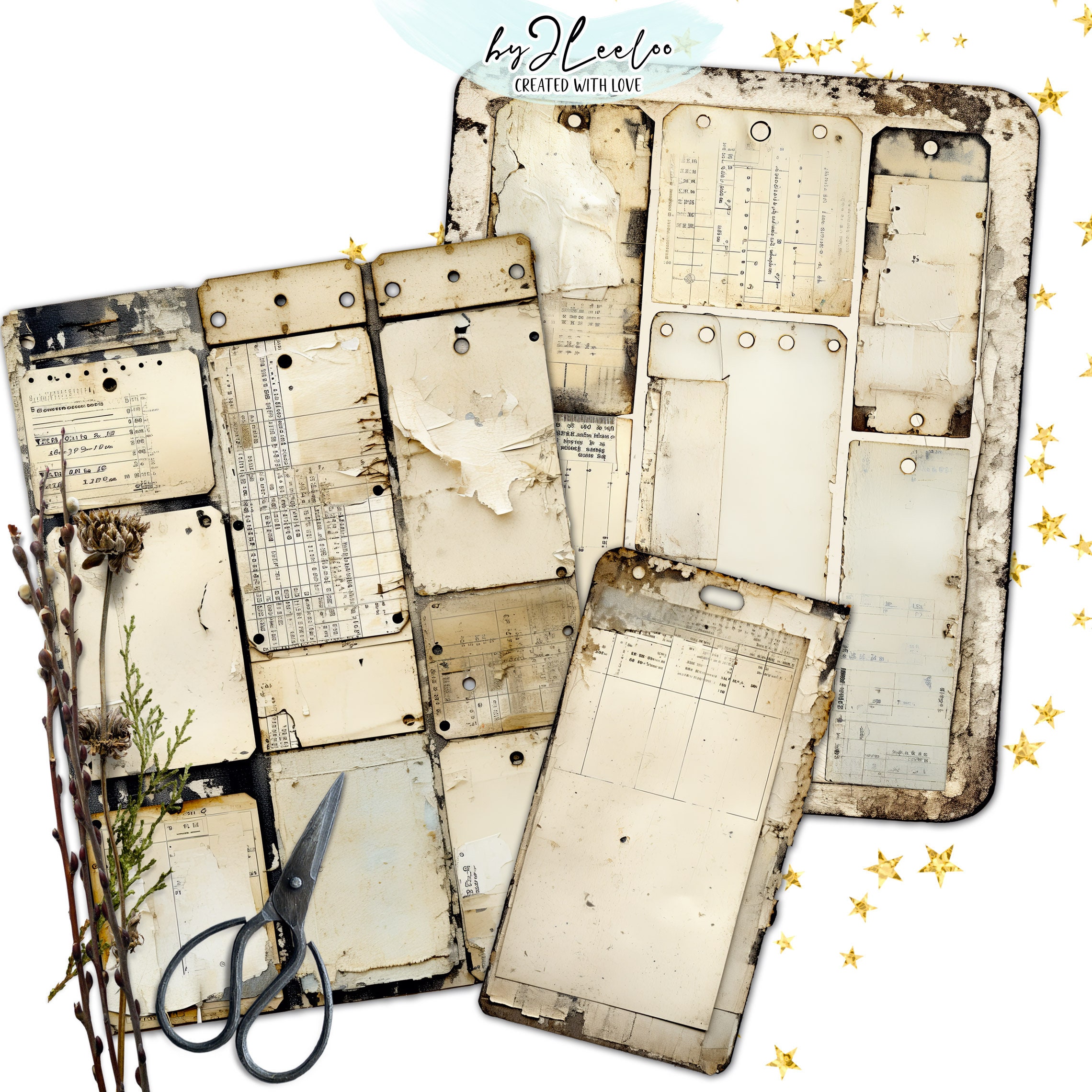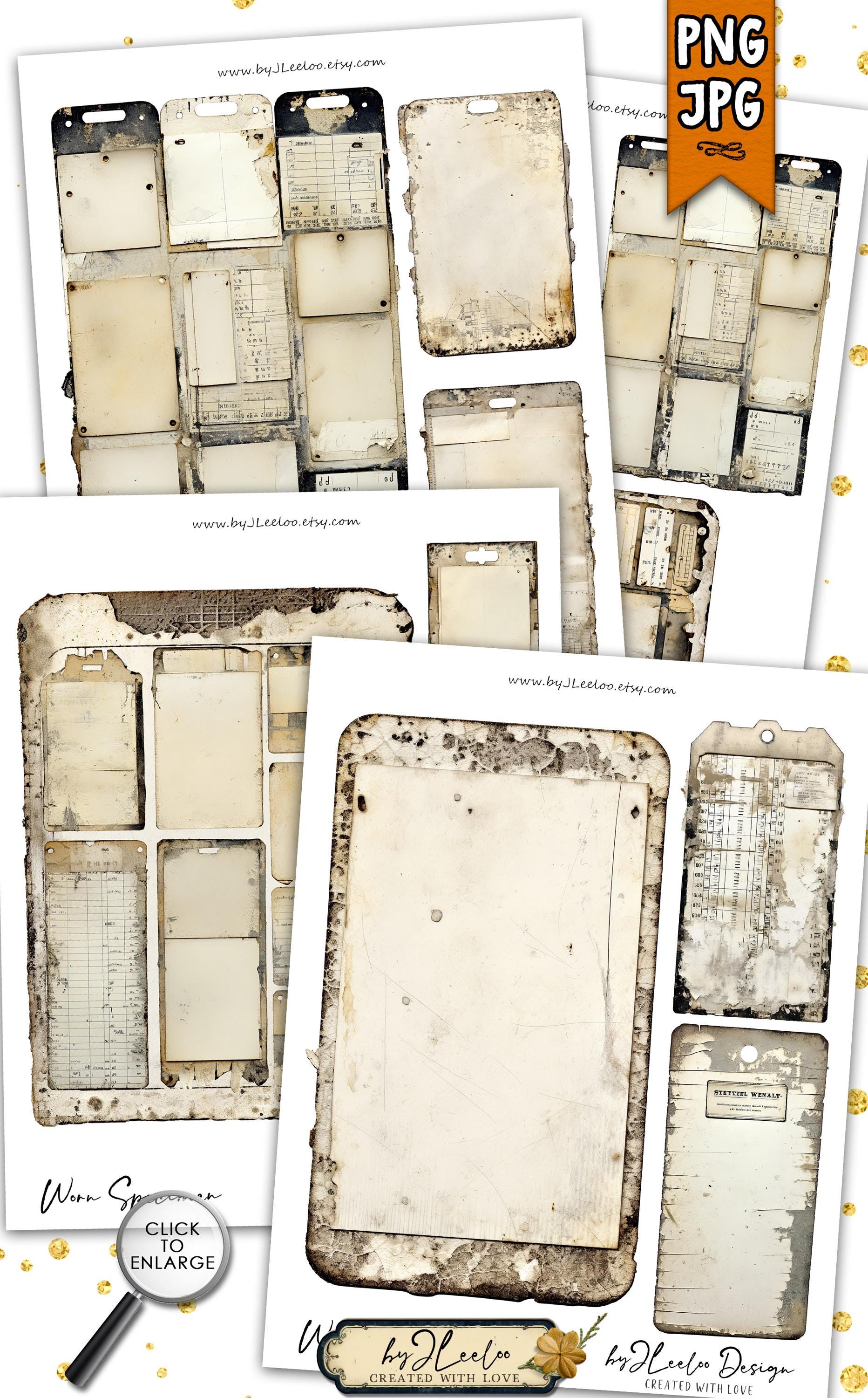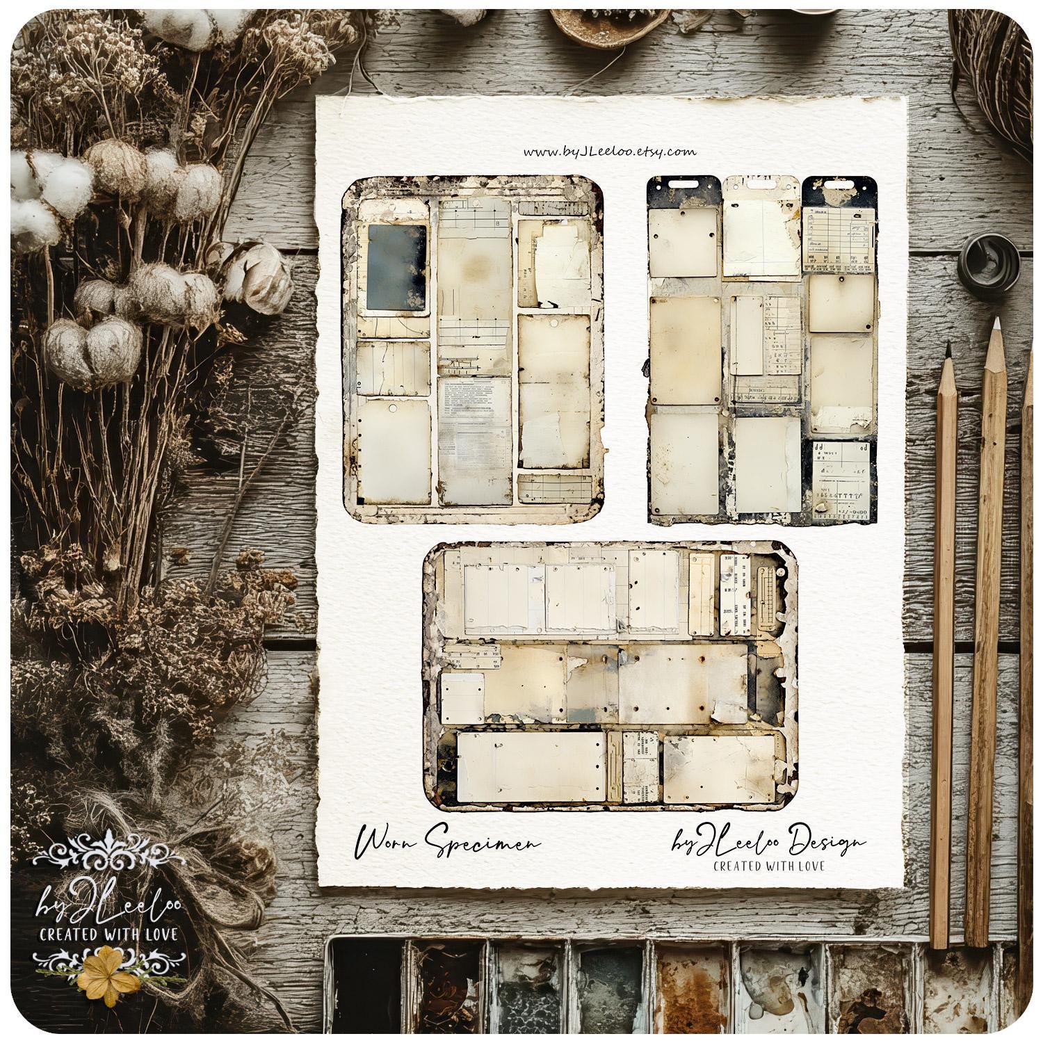 Inside you’ll find vintage-style specimen labels and tags in various sizes, each grungy and distressed, perfect for adding an authentic aged touch to your junk journals, scrapbooks, steampunk projects, or masculine-themed creations.