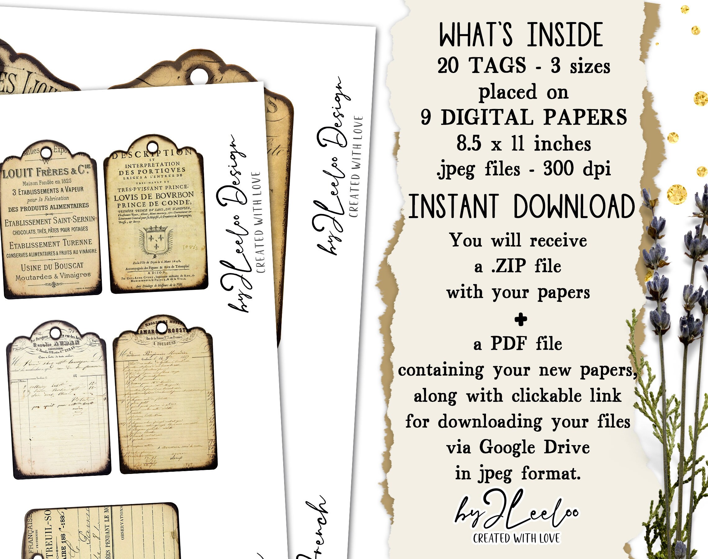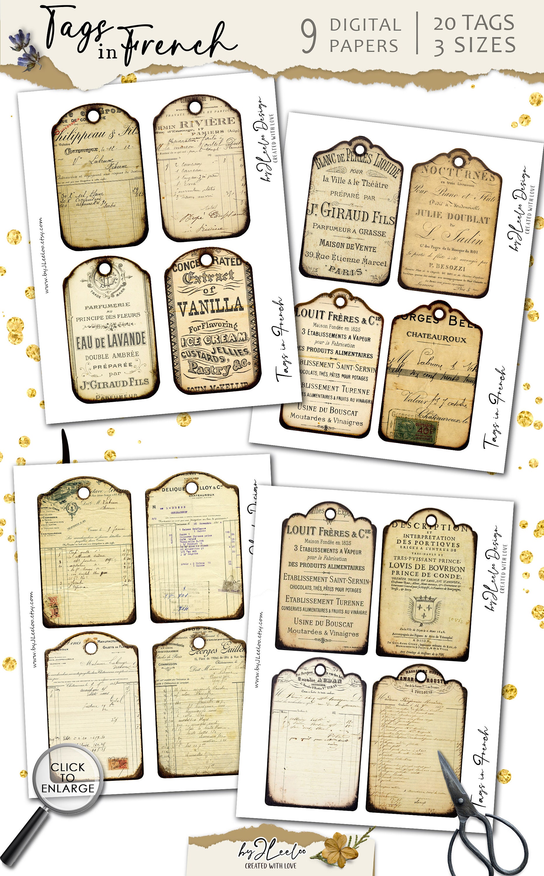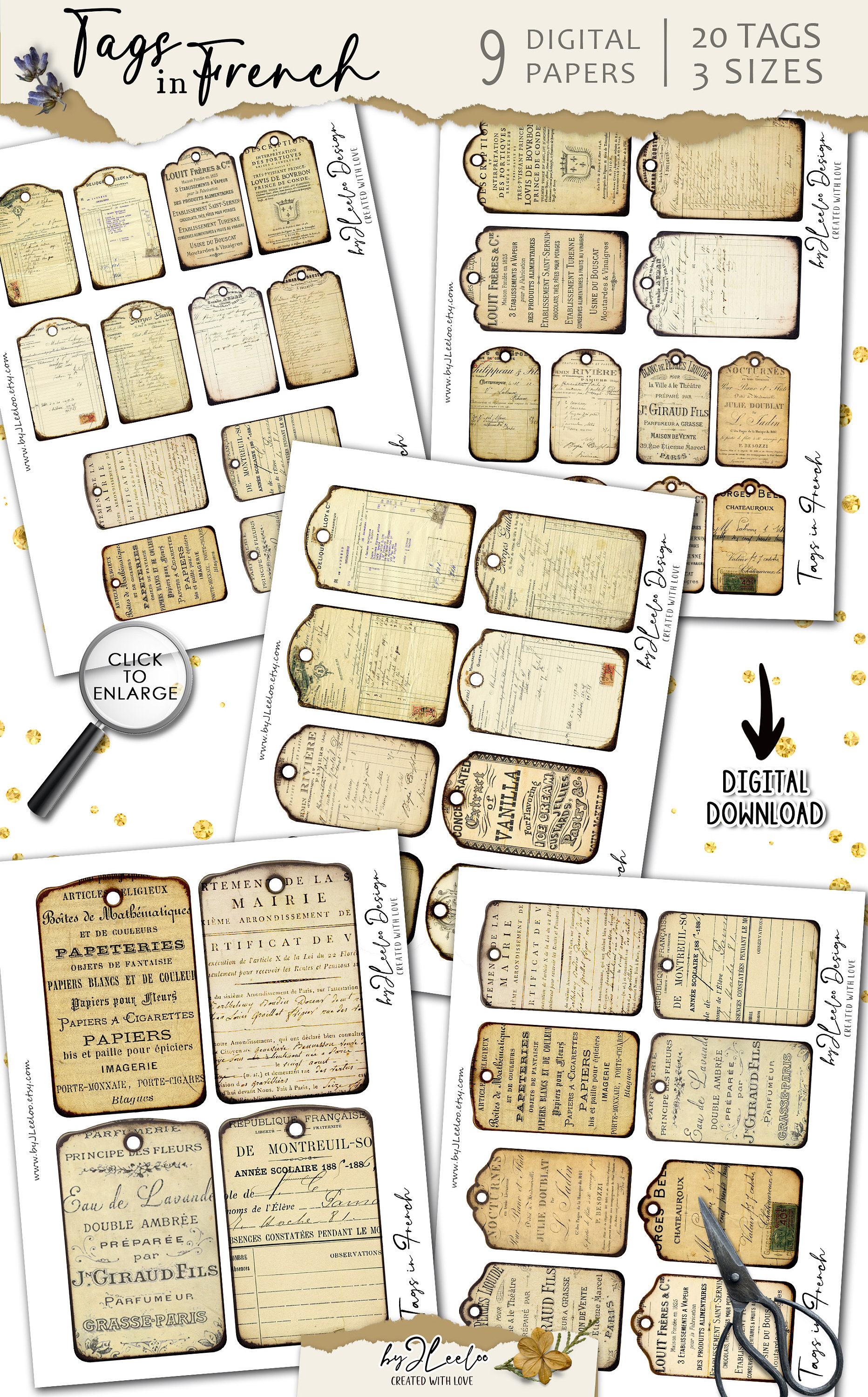 TAGS IN FRENCH vintage romantic supplies | Ephemera old tag junk journal | Parisienne documents images collage | Digital download | tl274