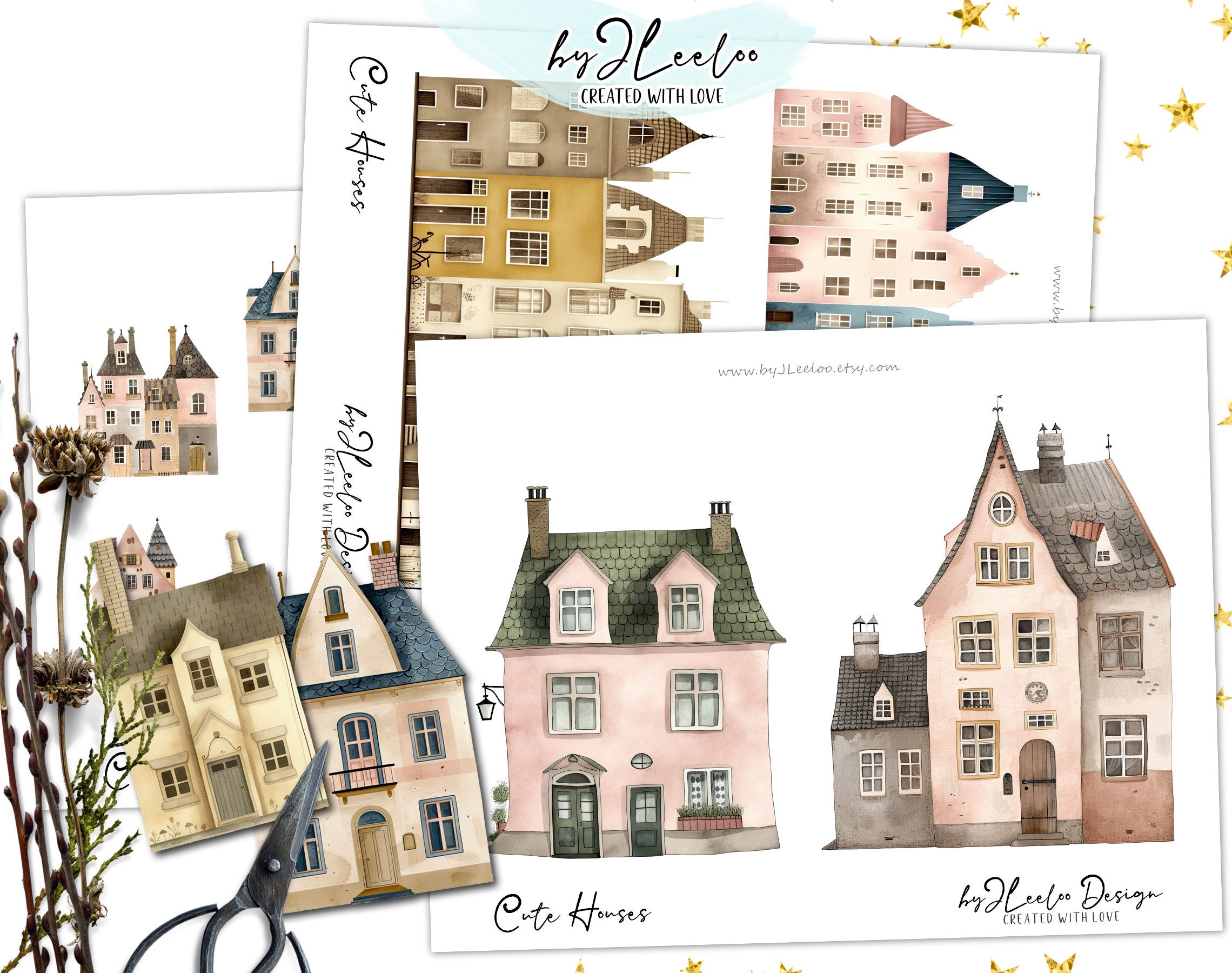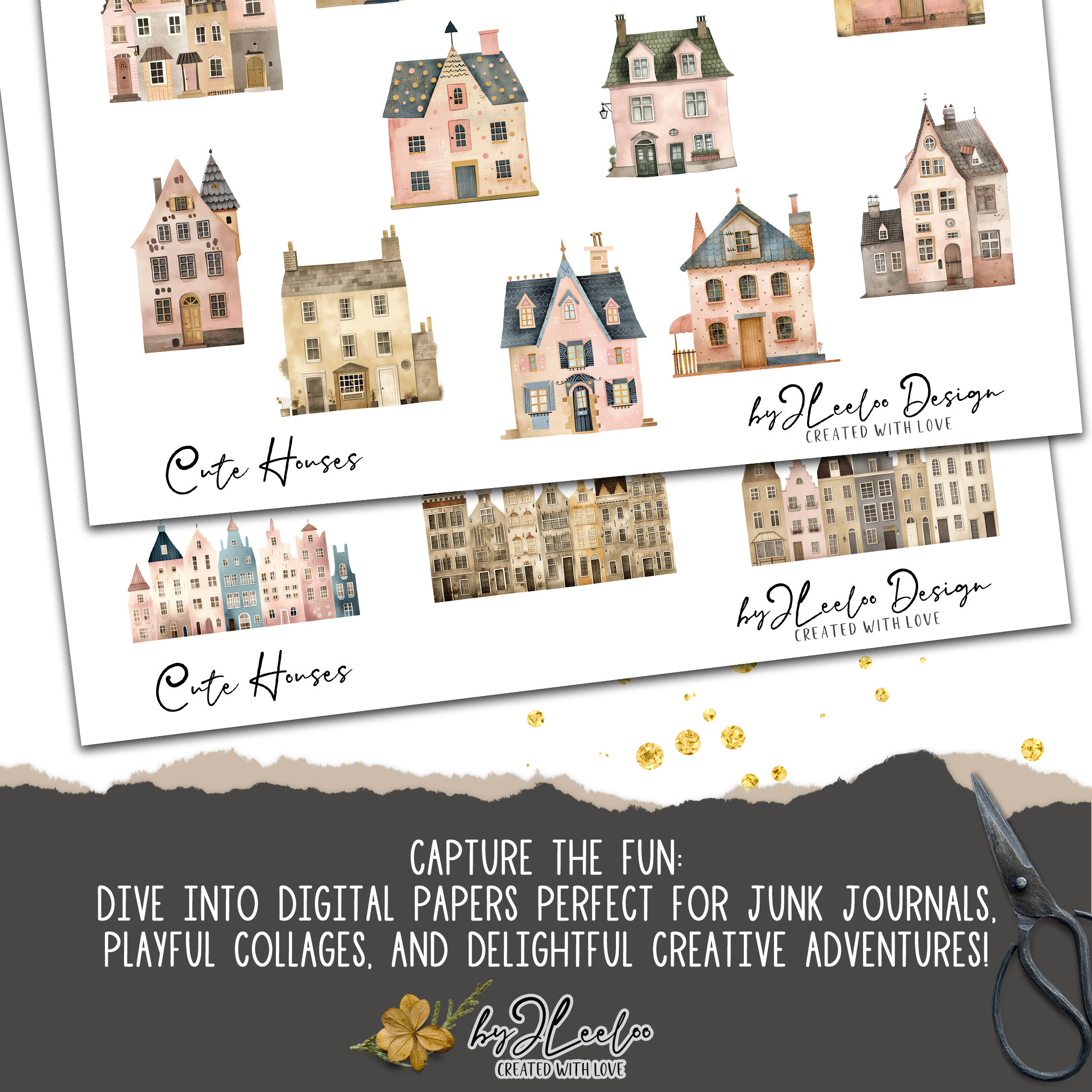 CUTE HOUSES PNG Clipart paper craft supplies | digital junk journal elements vintage | quirky mixed media printable | commercial use | cl168