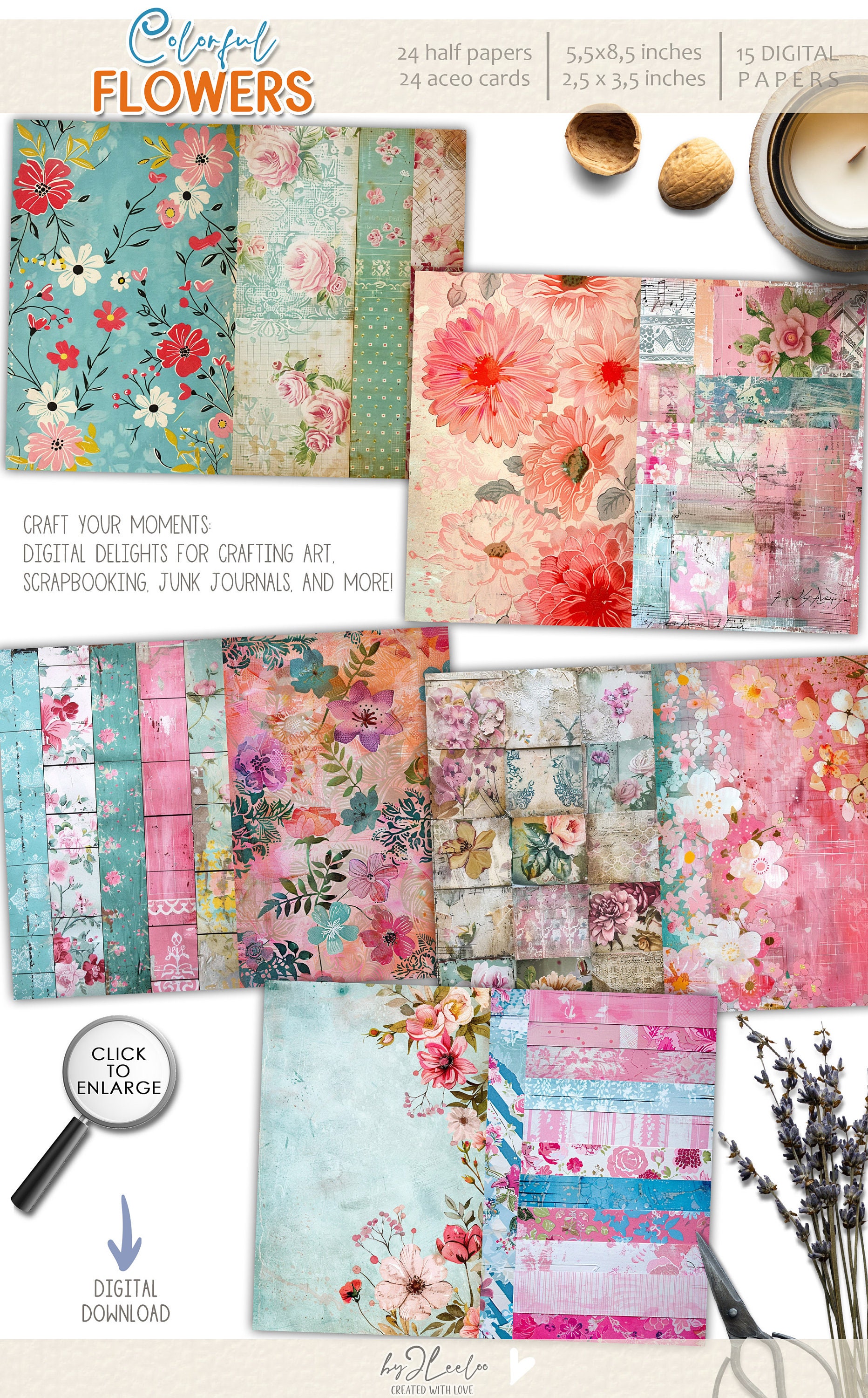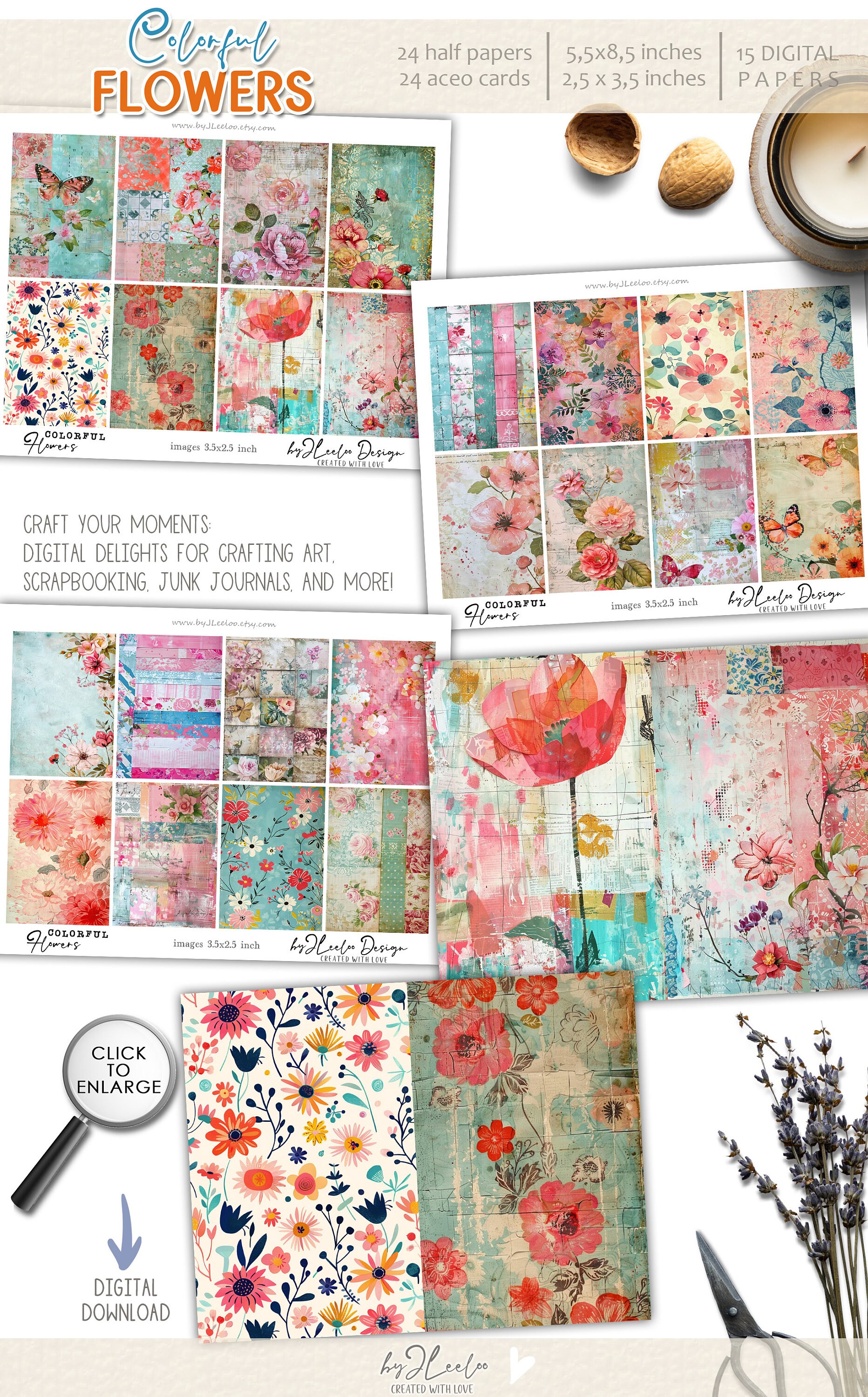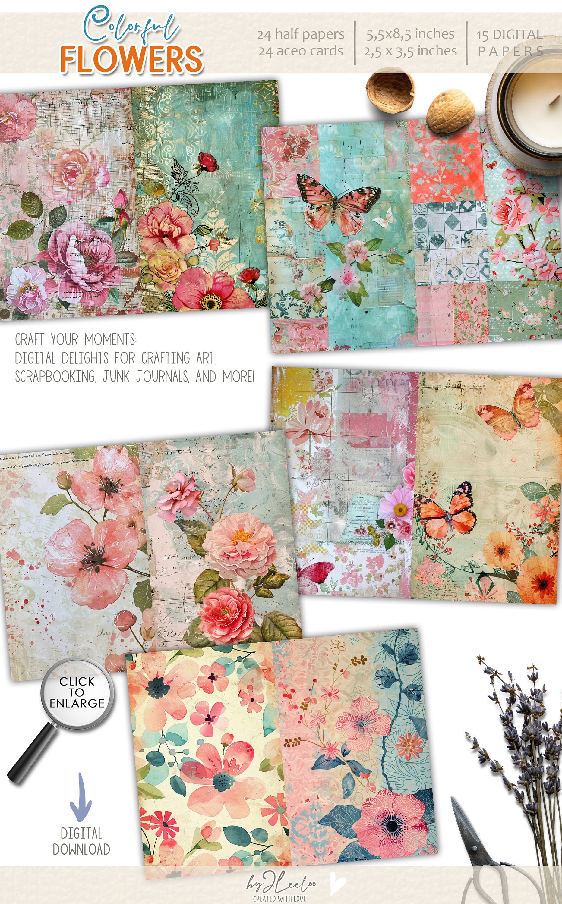 ๐Immerse yourself in a kaleidoscope of hues, from lush blossoms to whimsical patterns, perfect for creating captivating layouts, collages, and keepsakes. Each piece is a window to a world where colors dance and memories intertwine. Whether it's for your scrapbook or crafting project, let these enchanting visuals ignite your imagination and evoke joyful nostalgia.