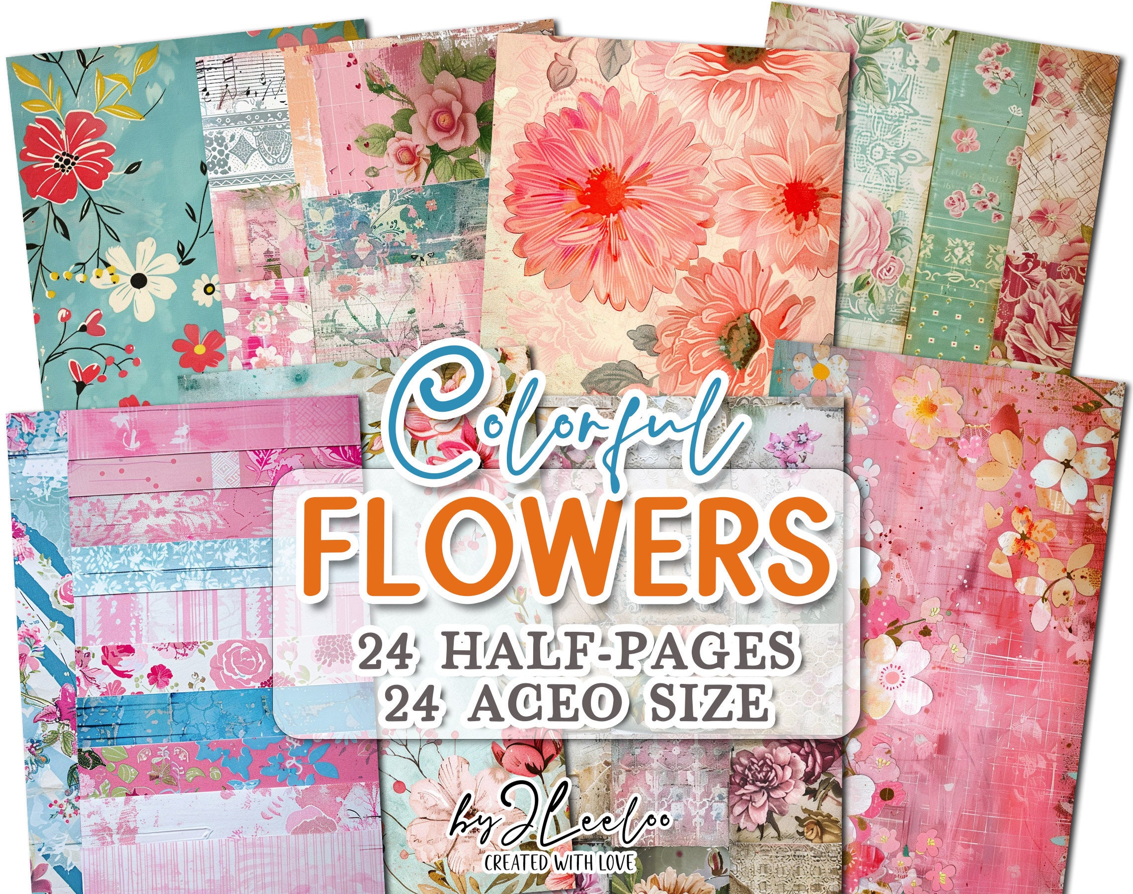 COLORFUL FLOWERS half pages printable | Botanical junk journal Mixed Media supplies | ACEO romantic vintage paper card collage DiY | pp737