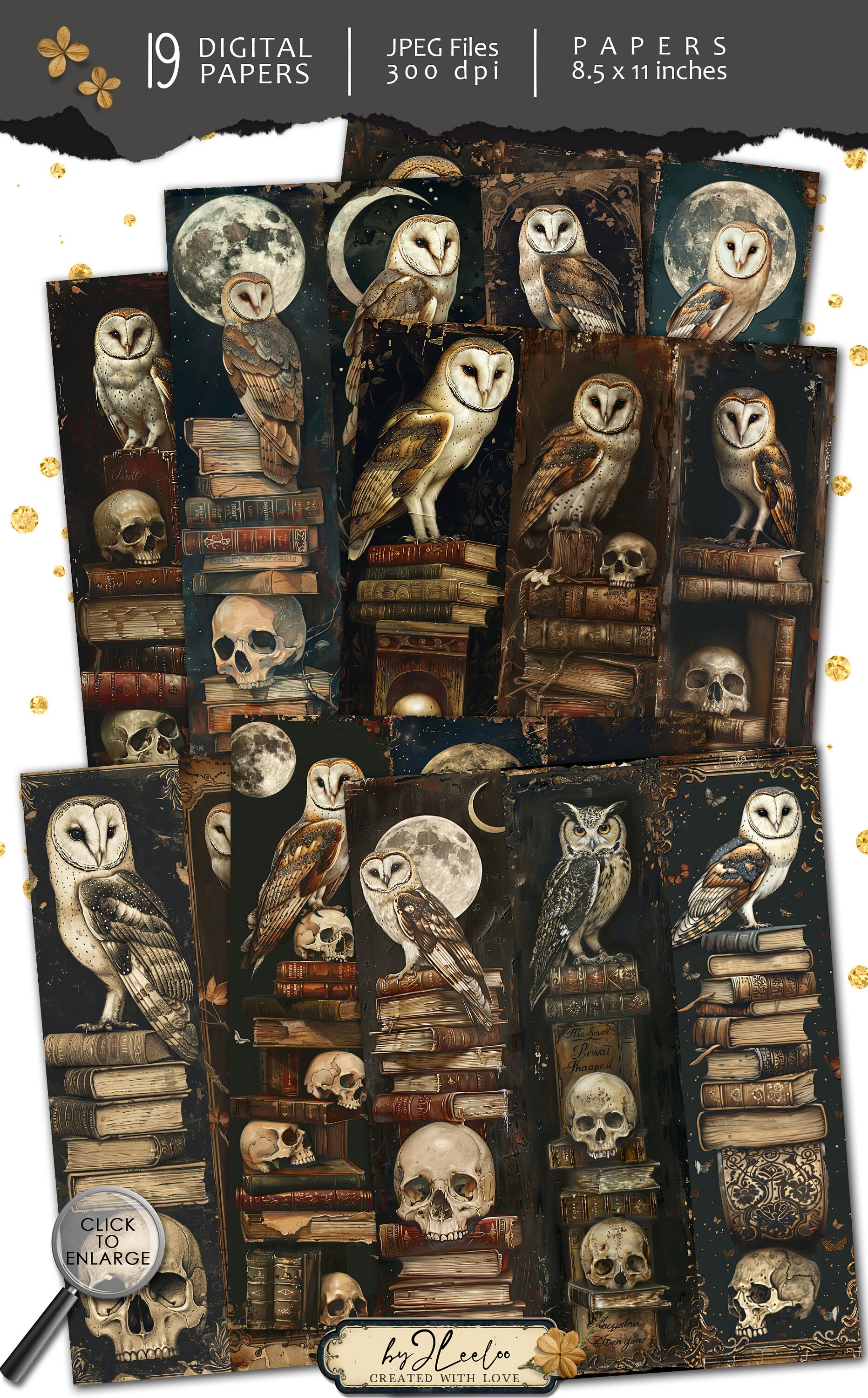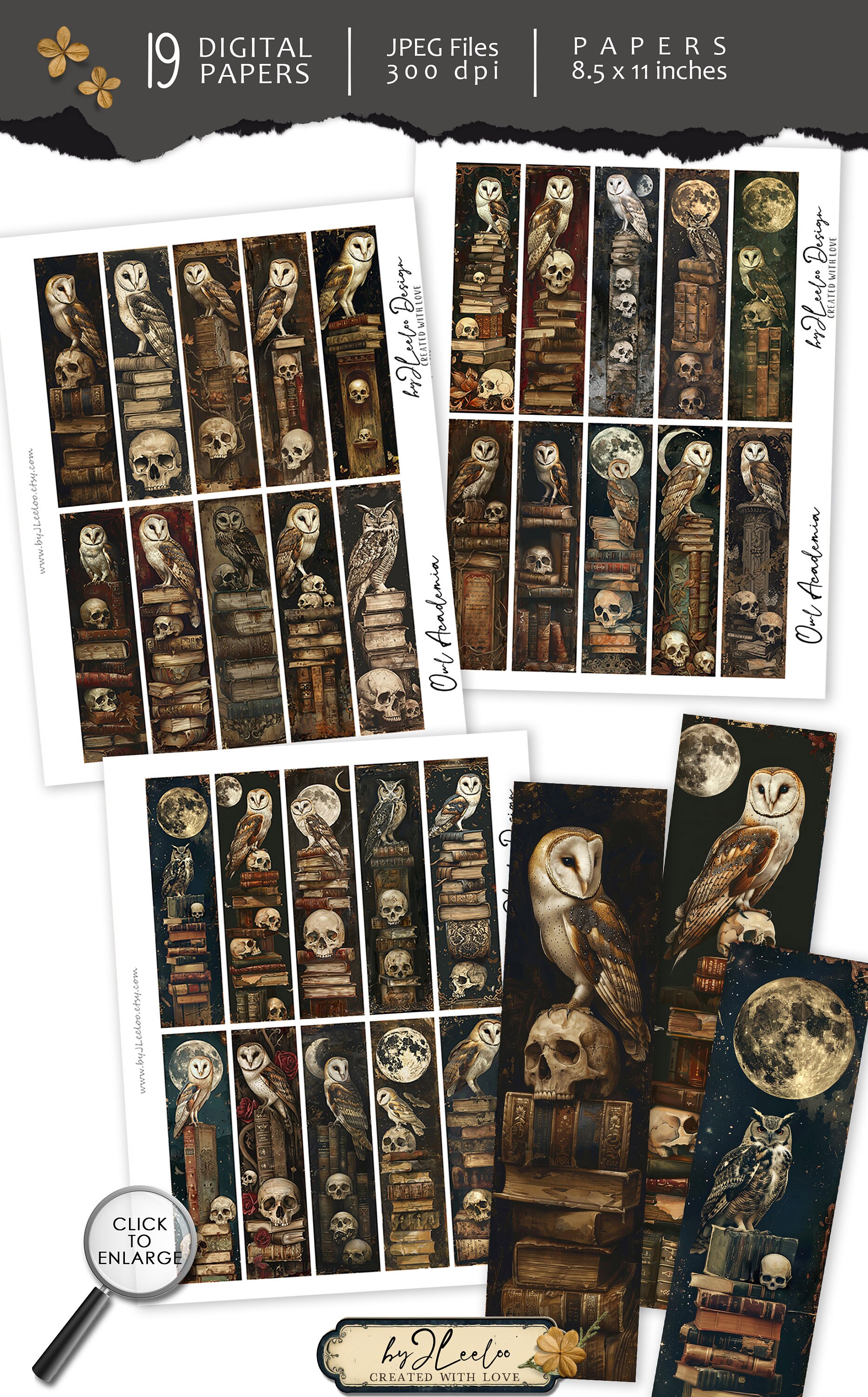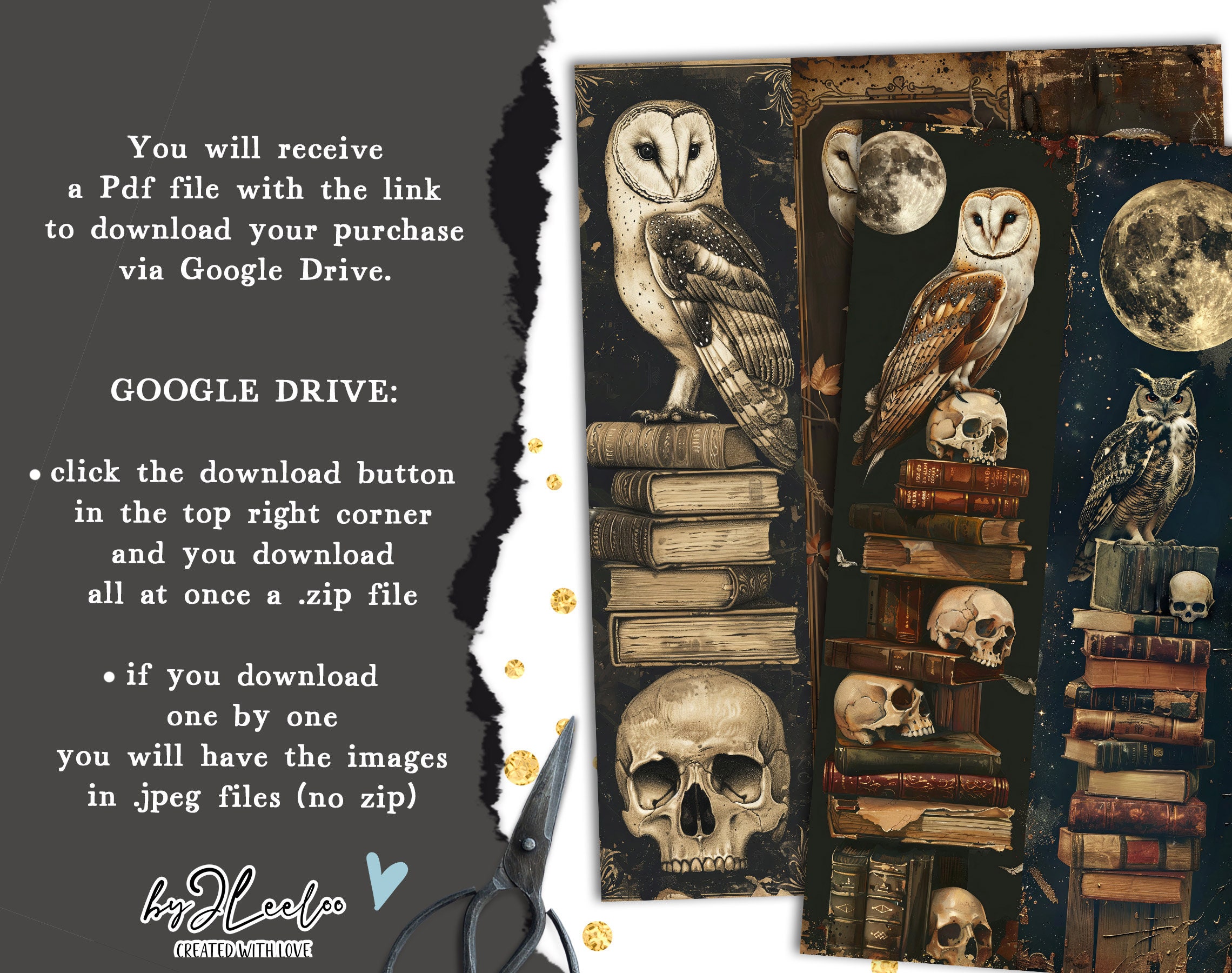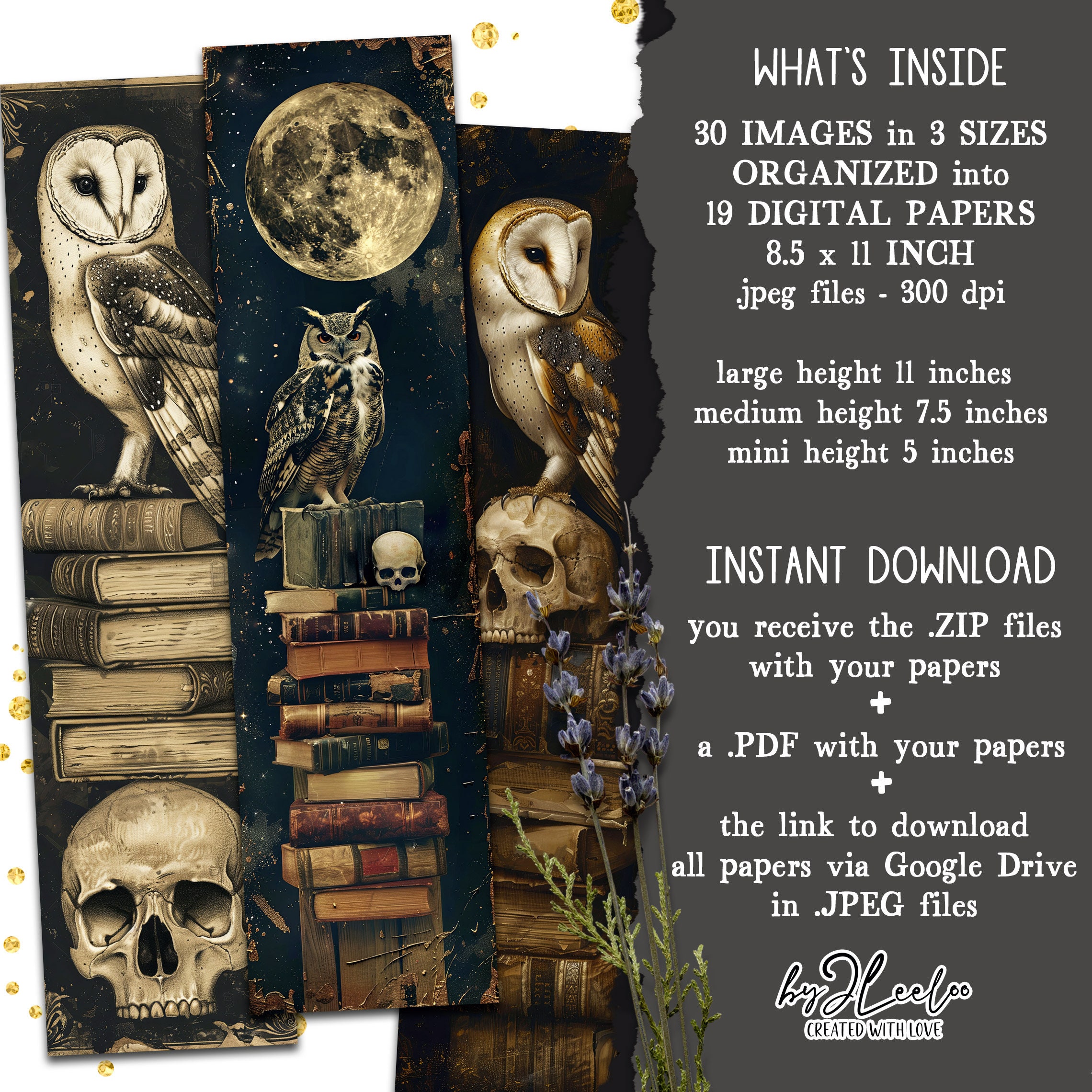 OWL ACADEMIA dark gothic bookmarks supplies | Antique Stack of books and skulls paper craft tag ephemera junk journal | digital collage | pp762