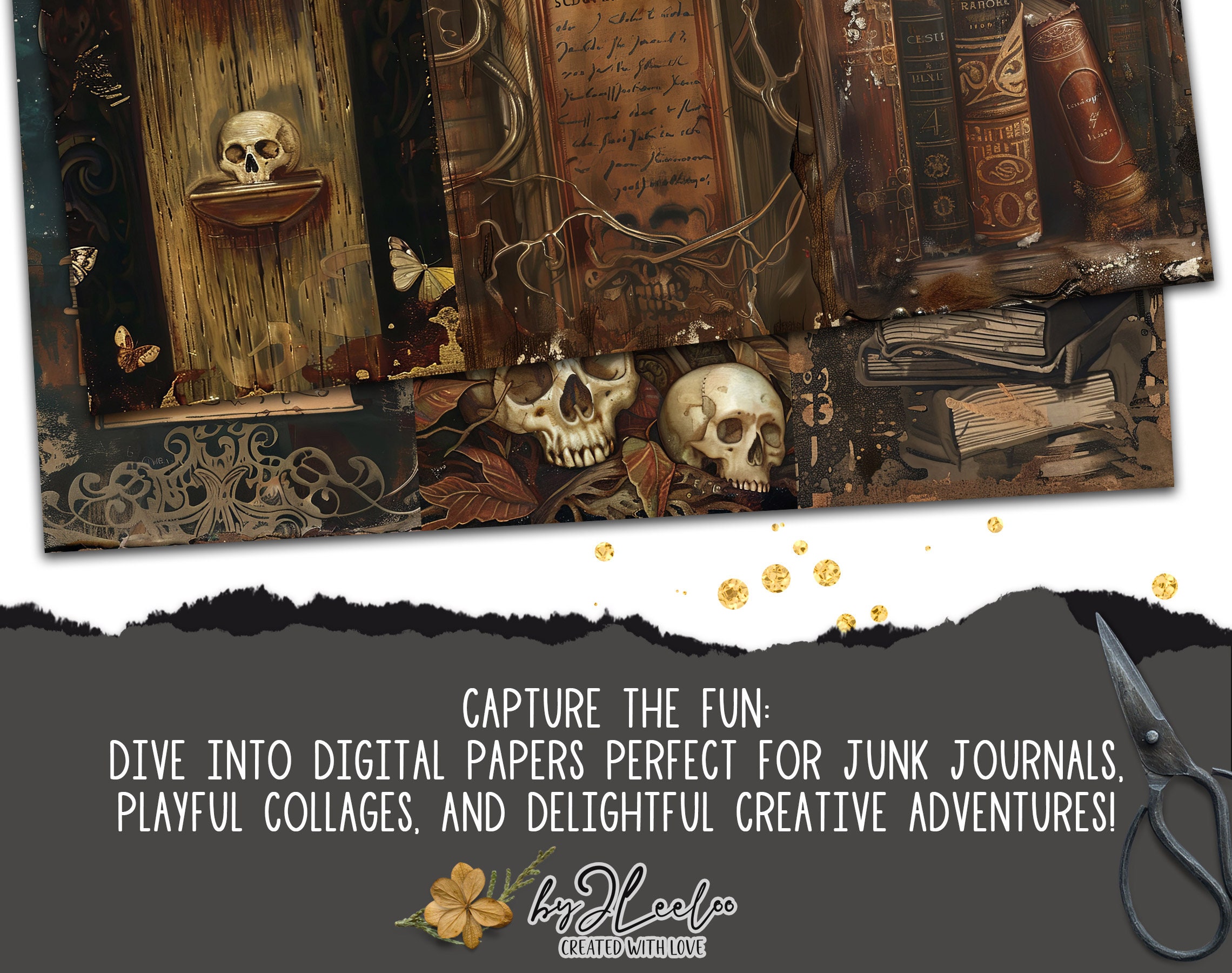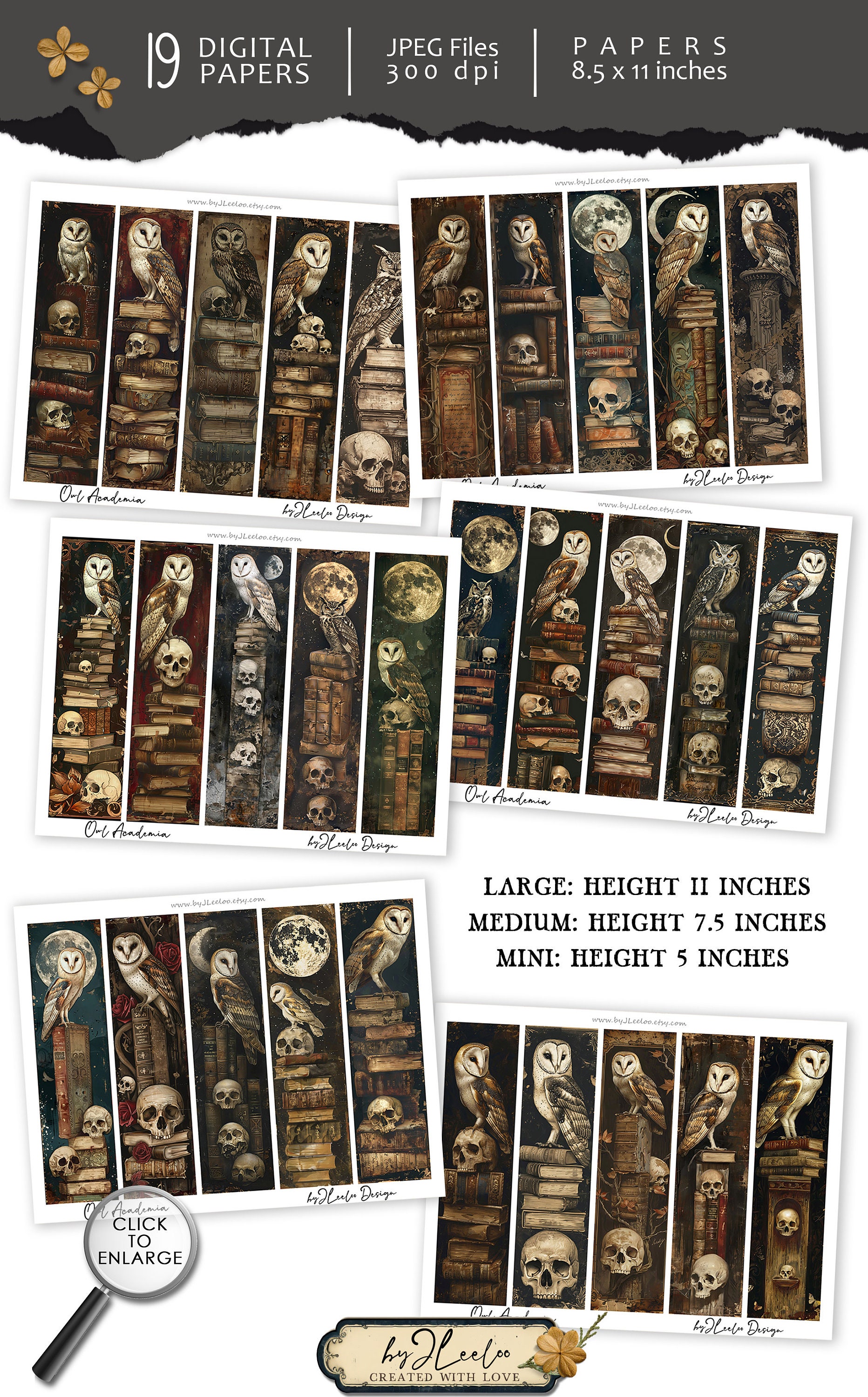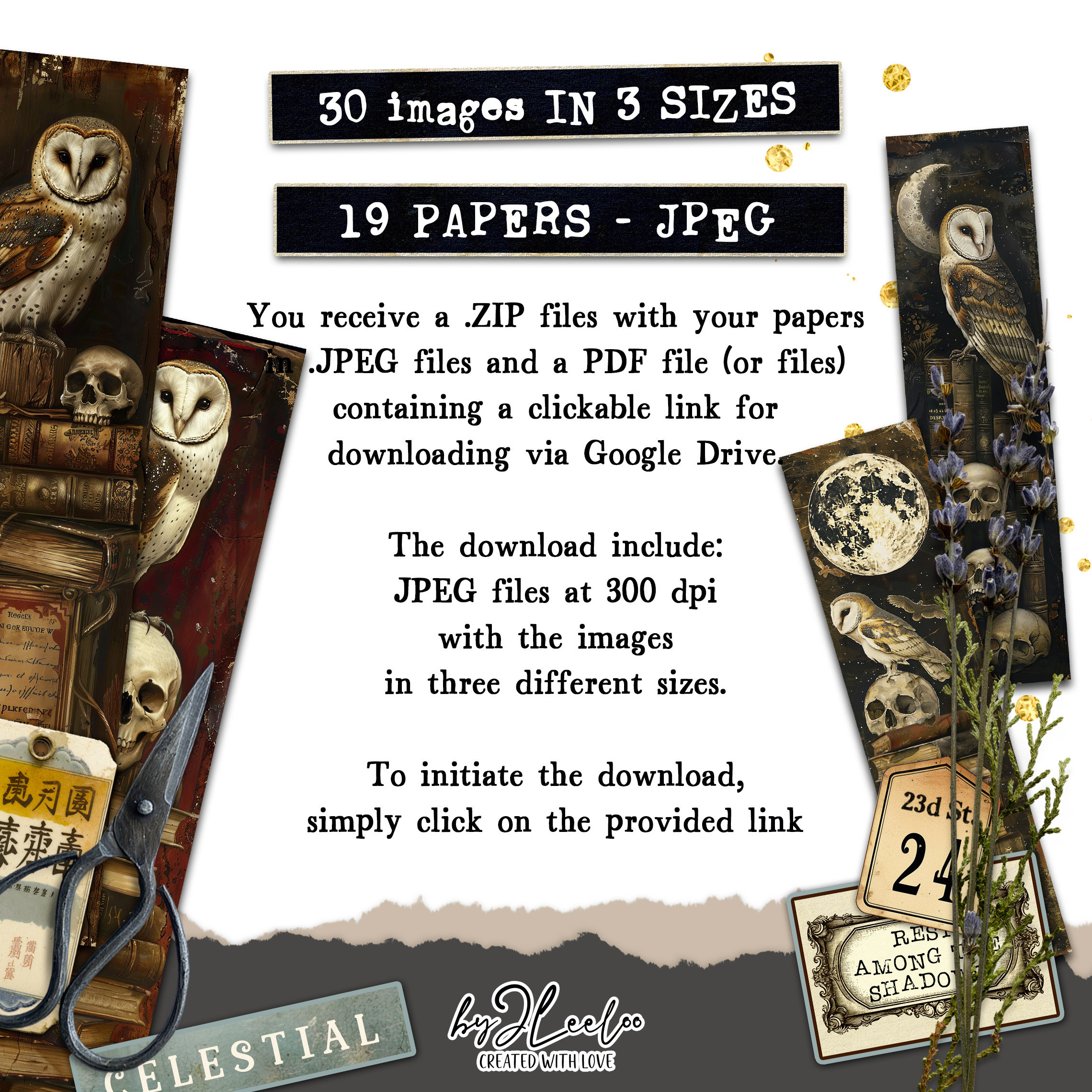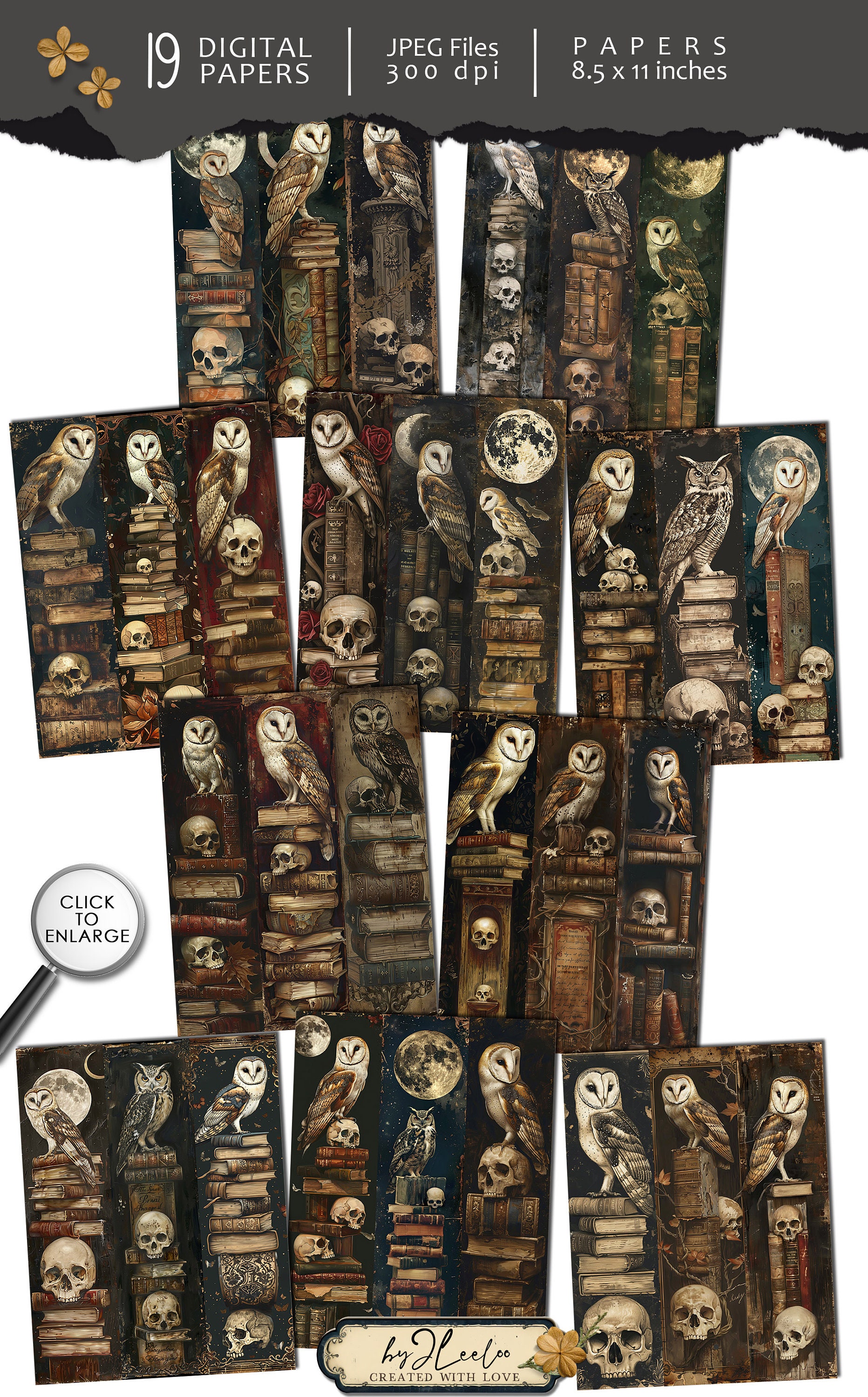 OWL ACADEMIA dark gothic bookmarks supplies | Antique Stack of books and skulls paper craft tag ephemera junk journal | digital collage | pp762