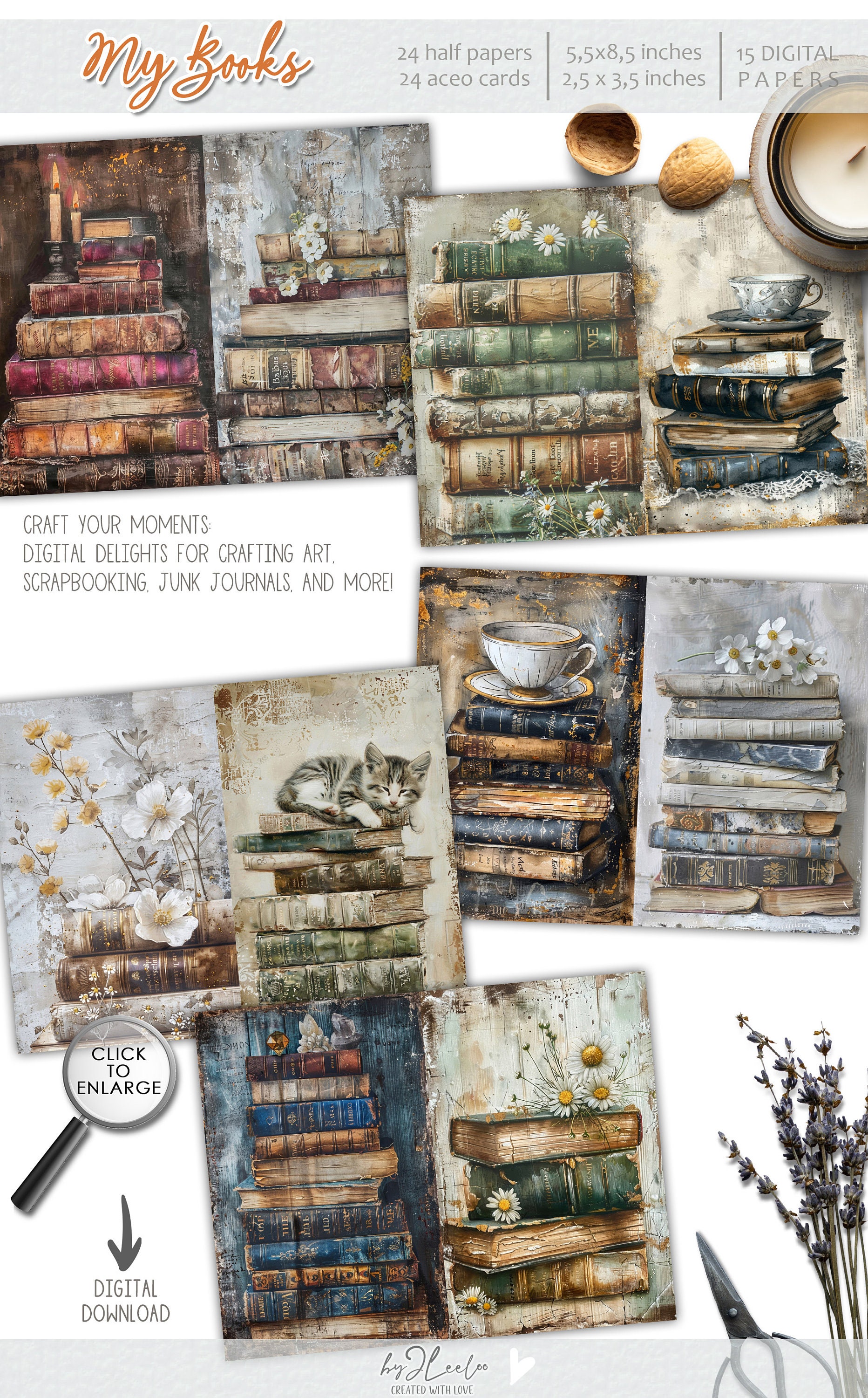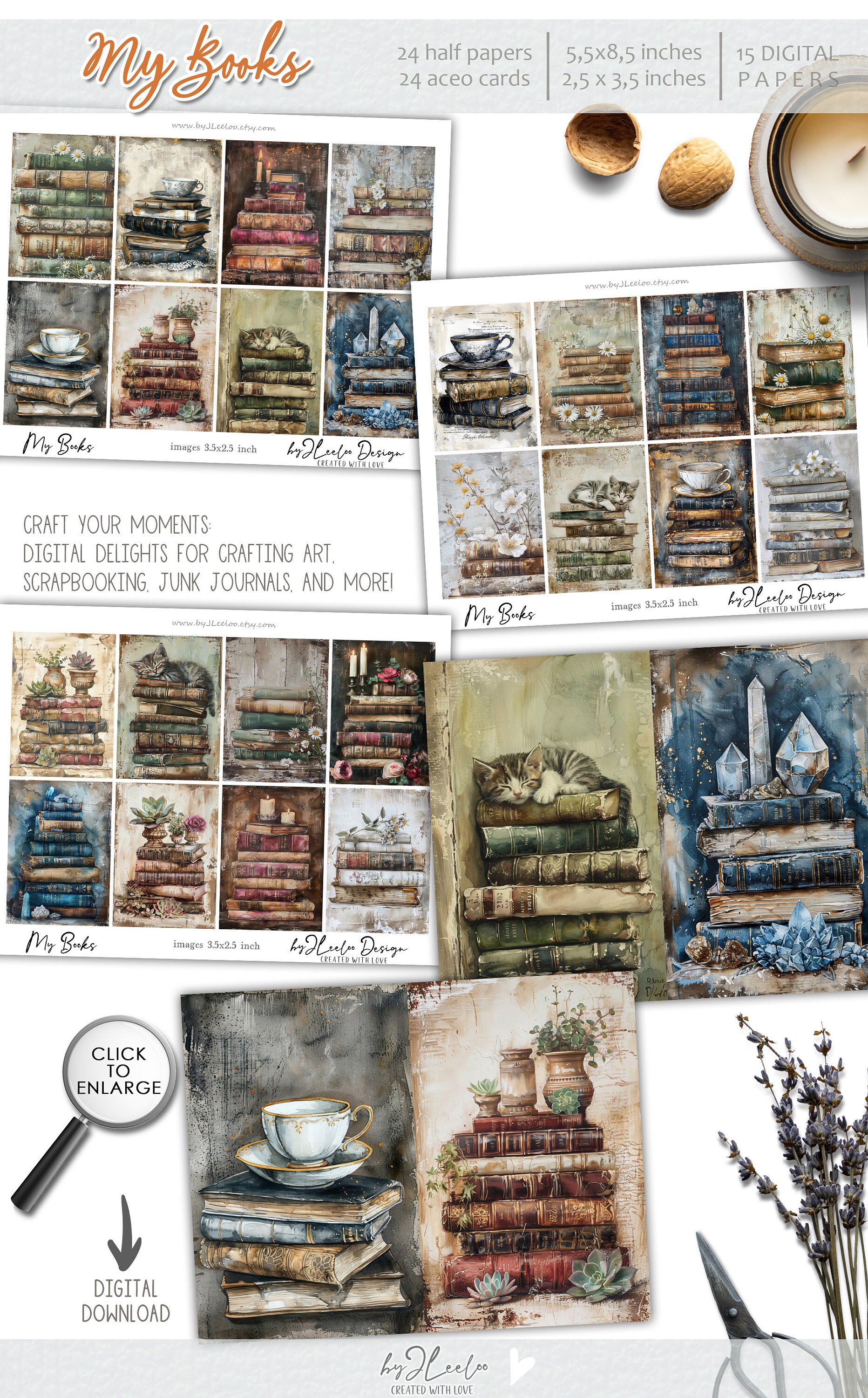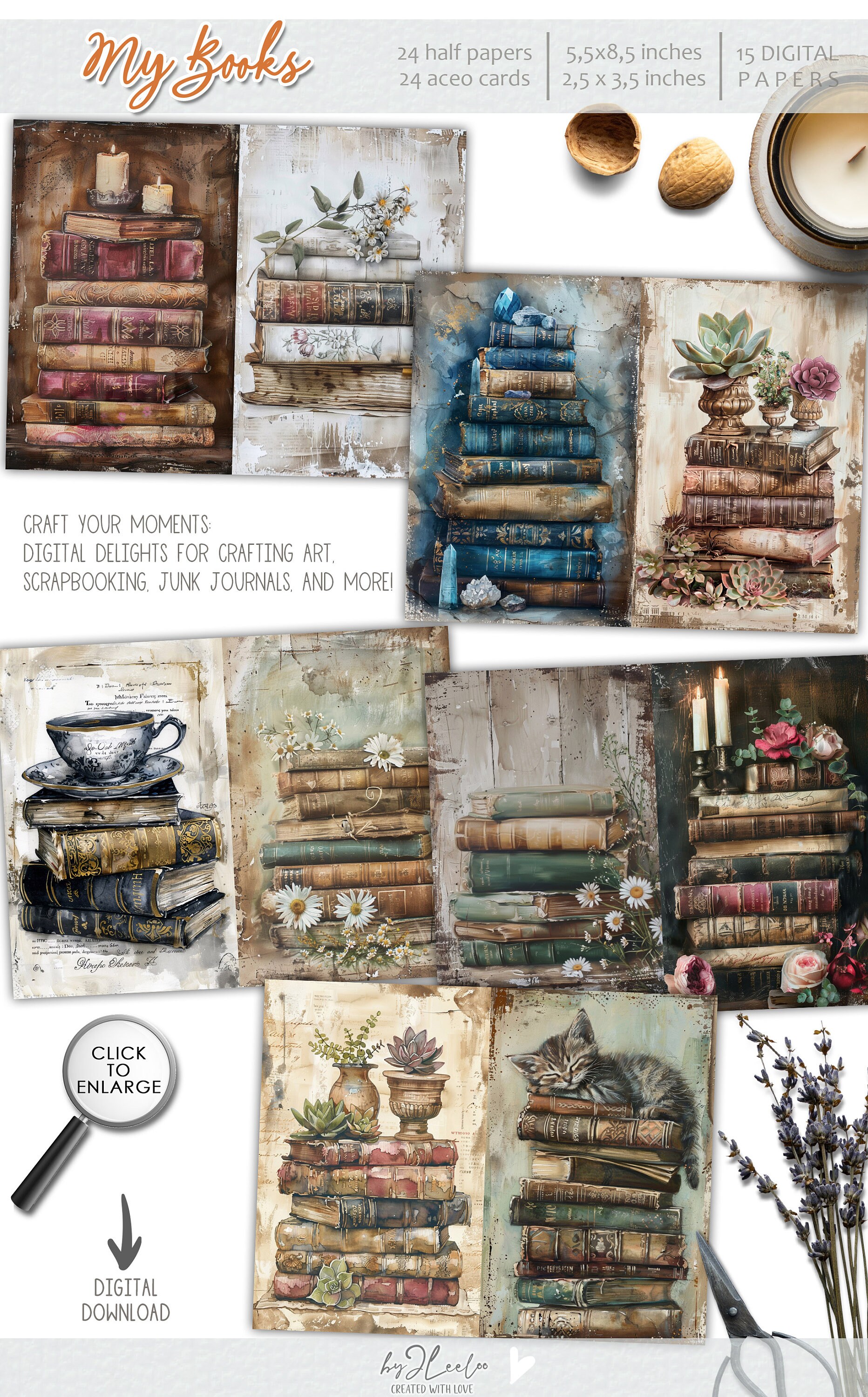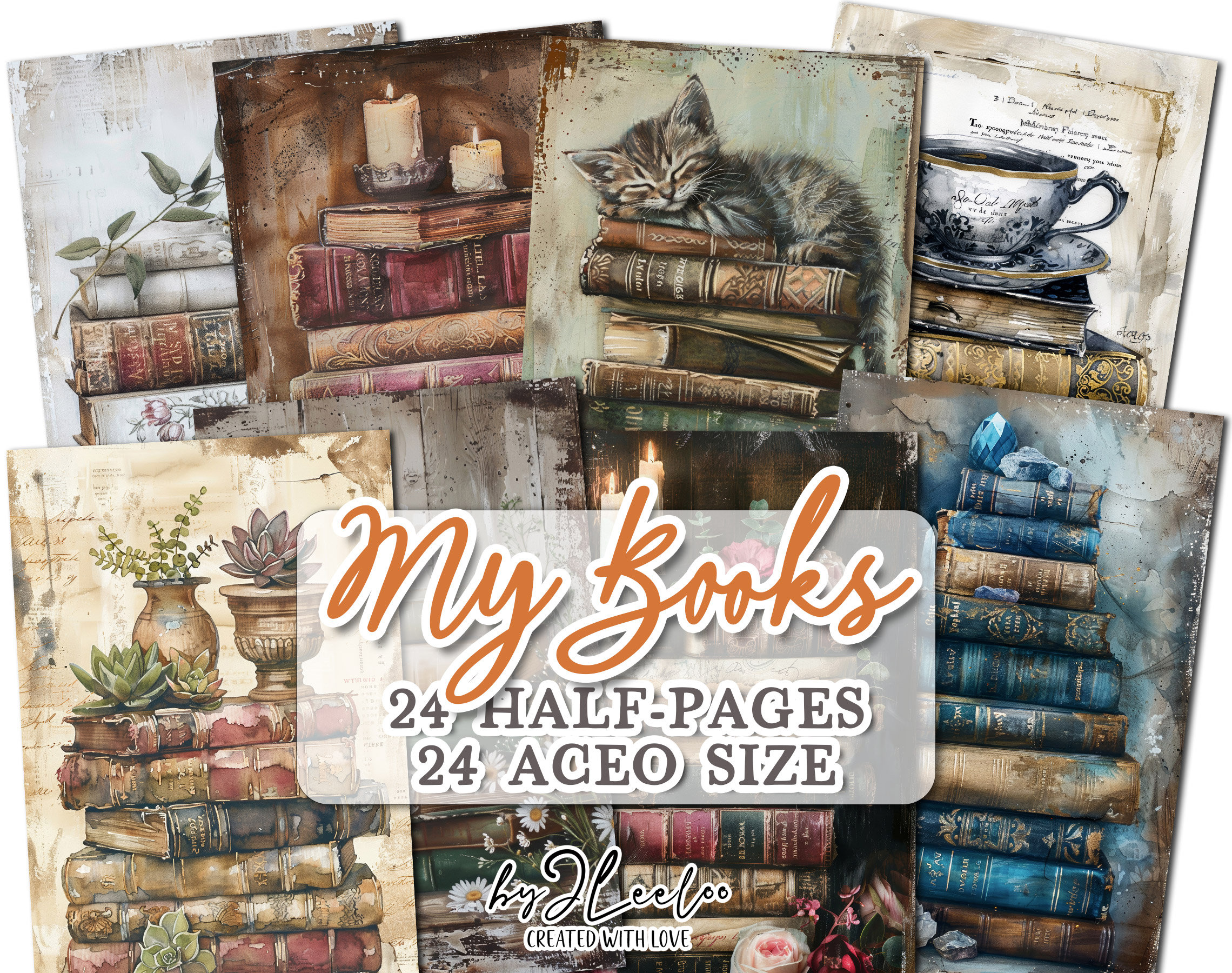 MY BOOKS half pages printable | Vintage junk journal Mixed Media supplies | Scrapbooking Aceo paper card making collage diary CU | pp769