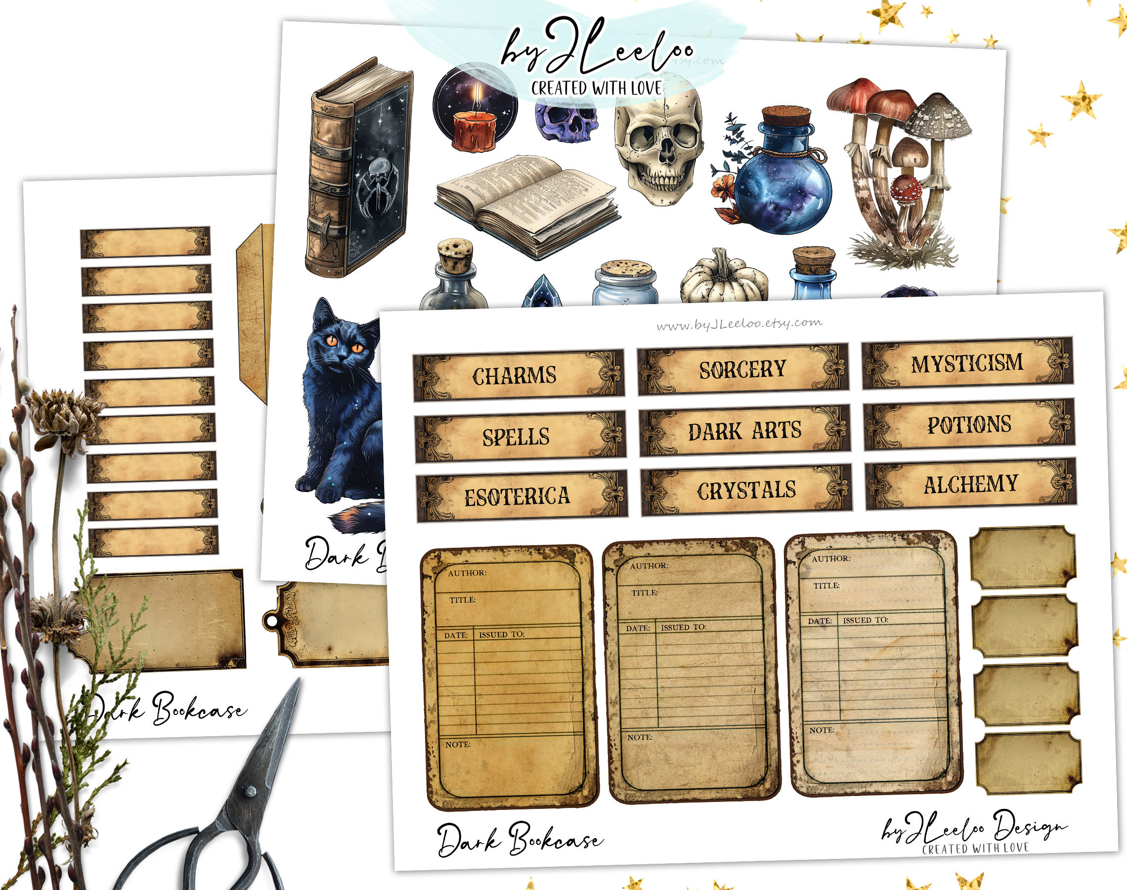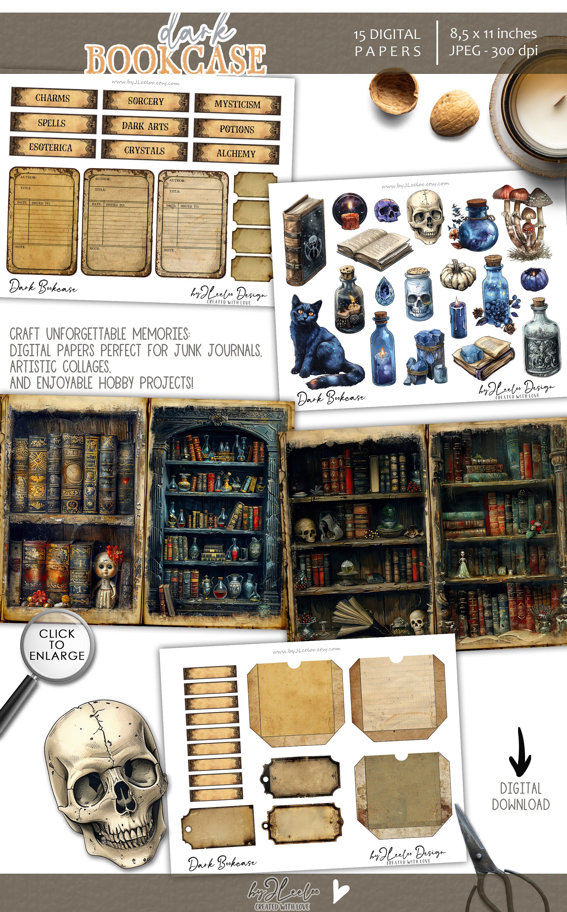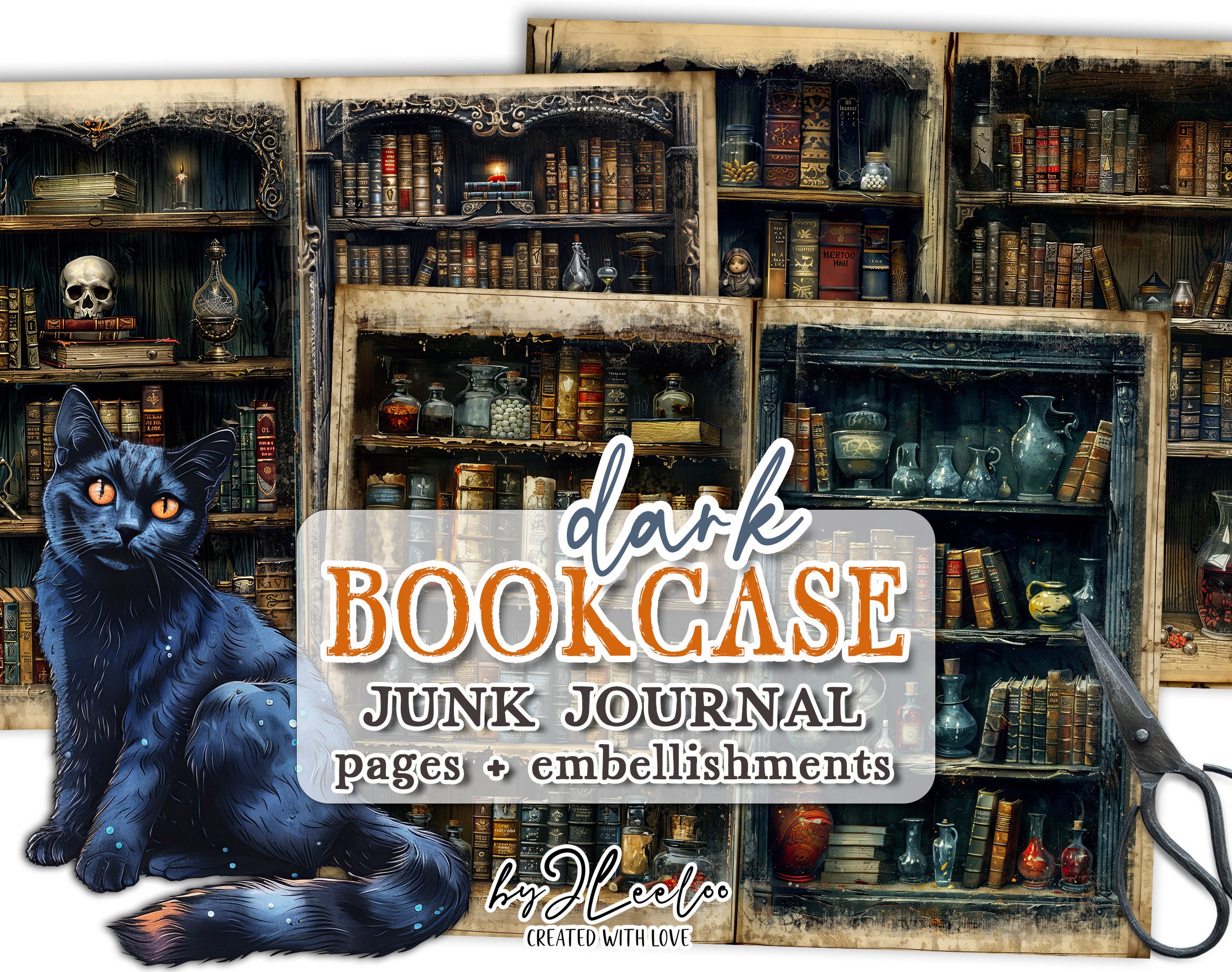 DARK BOOKCASE junk journal printable | blank half pages tags Mixed Media supplies Distressed vintage paper card making collage diary | pp770