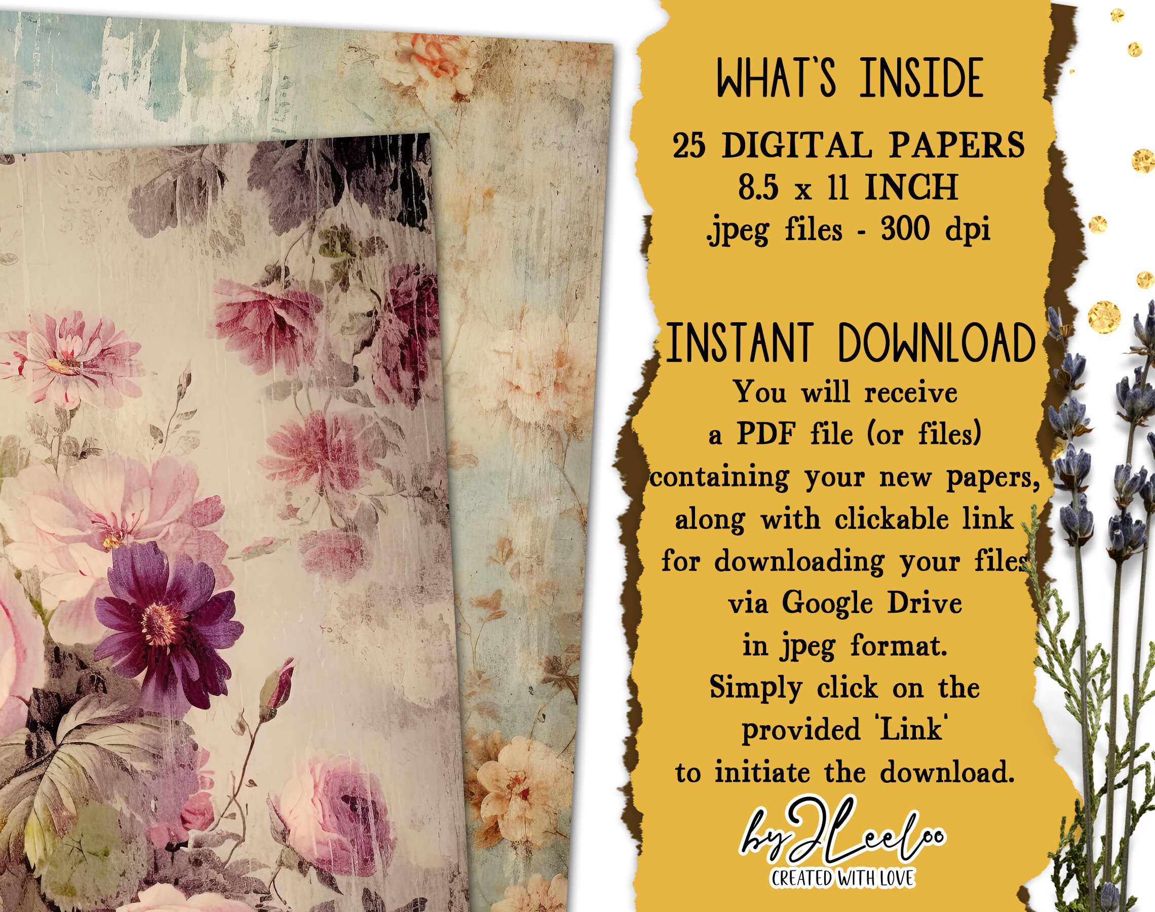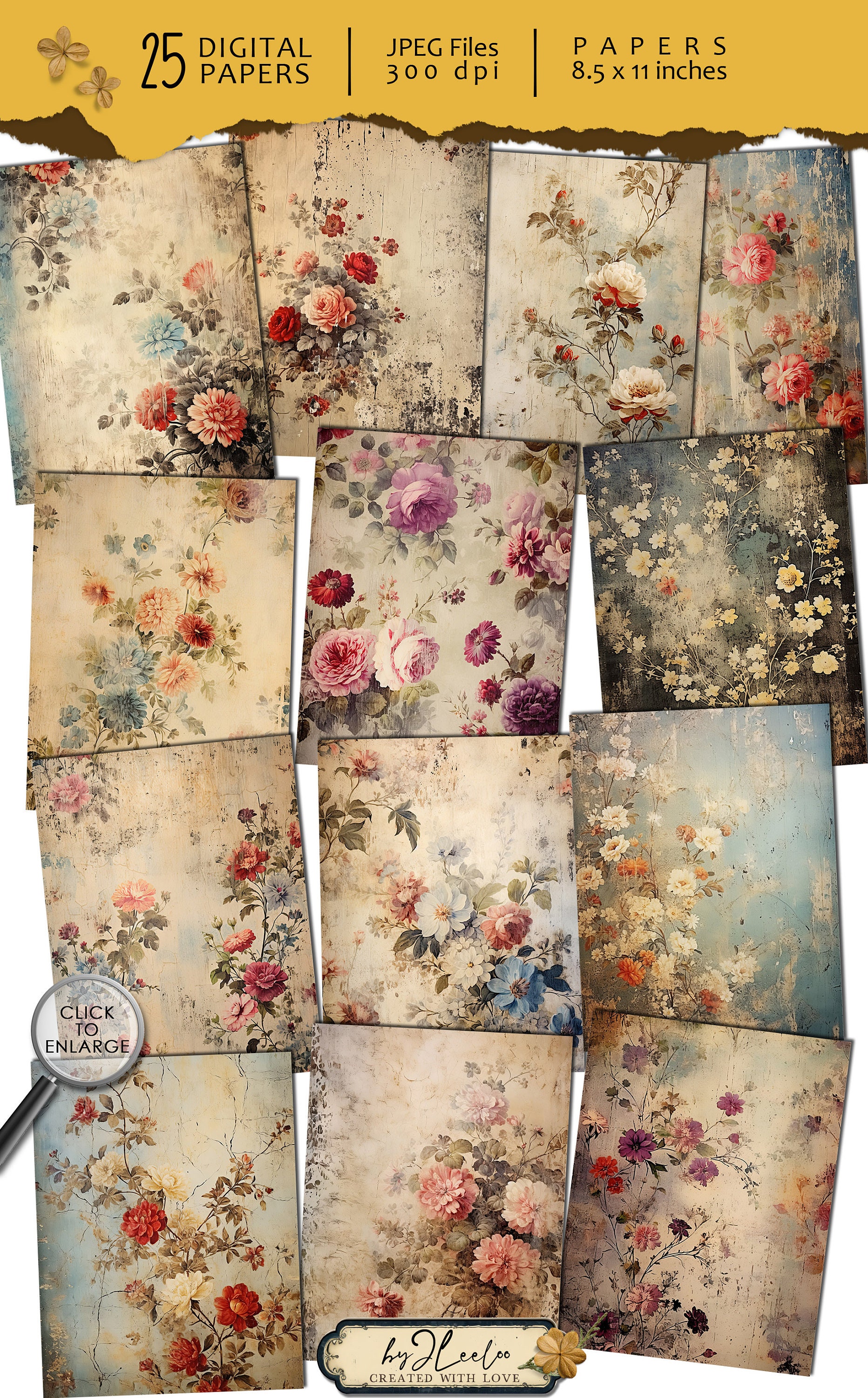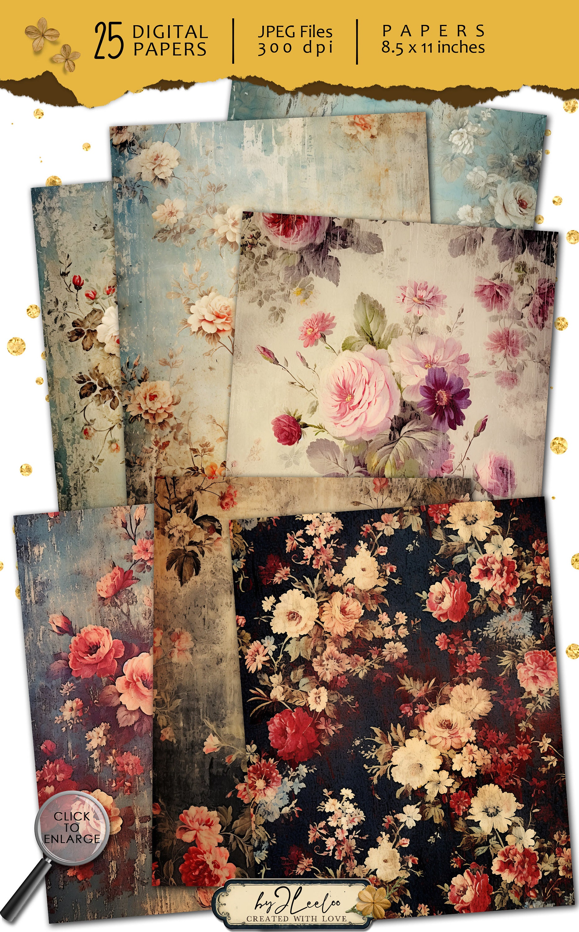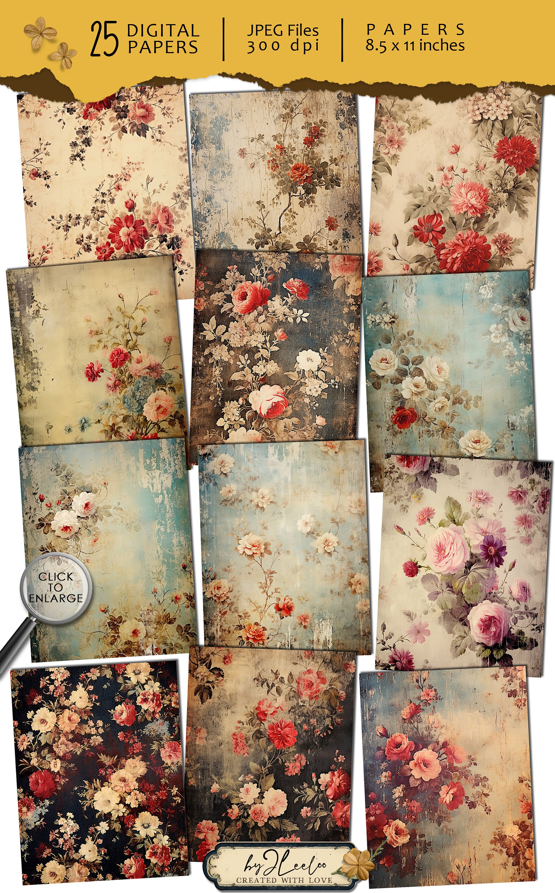 ๐ Immerse yourself in a captivating digital collection, featuring lightly distressed vintage floral patterns. Versatile for digital sheets, scrapbooking, journaling, backgrounds, or sublimation... let your creativity soar! ๐