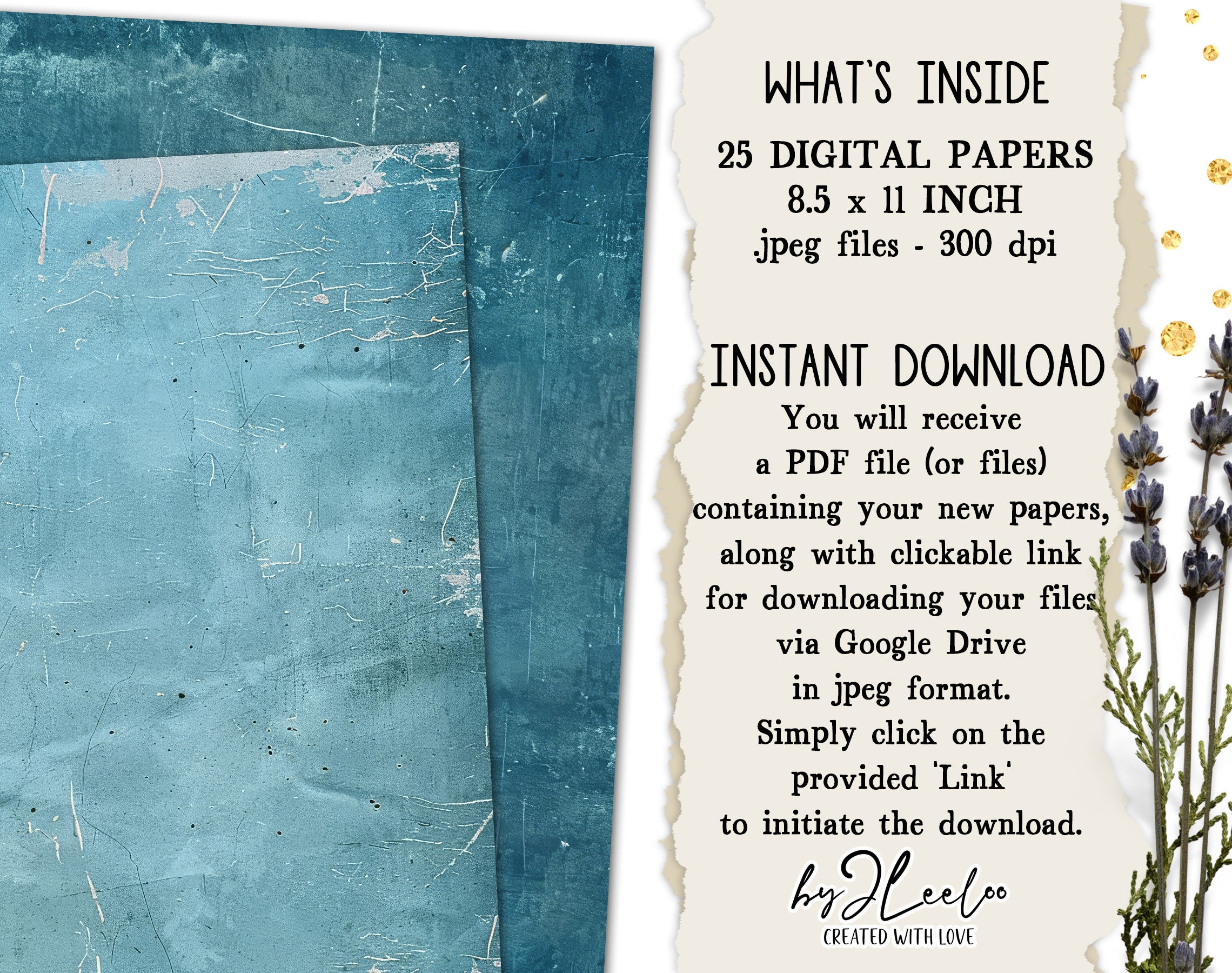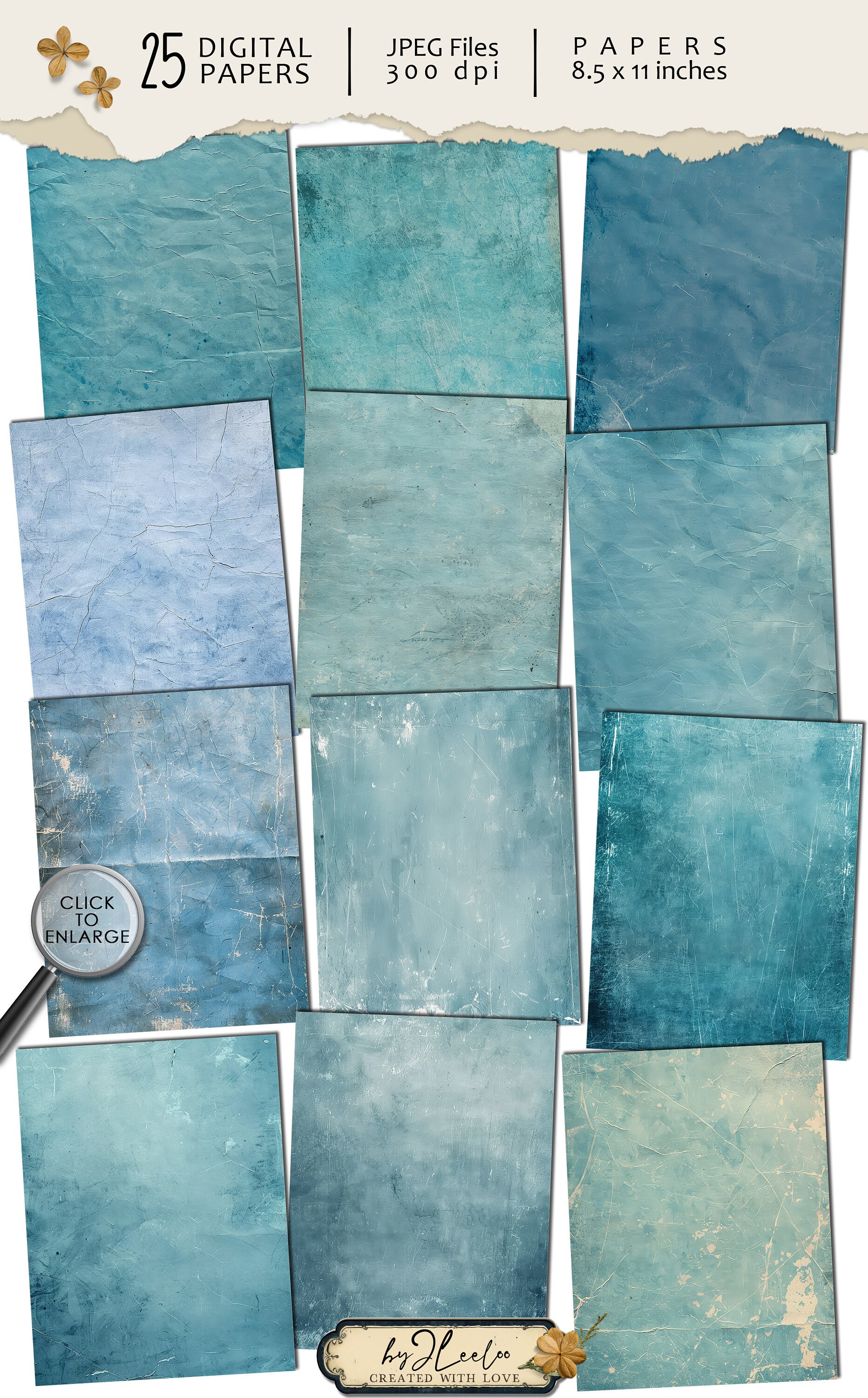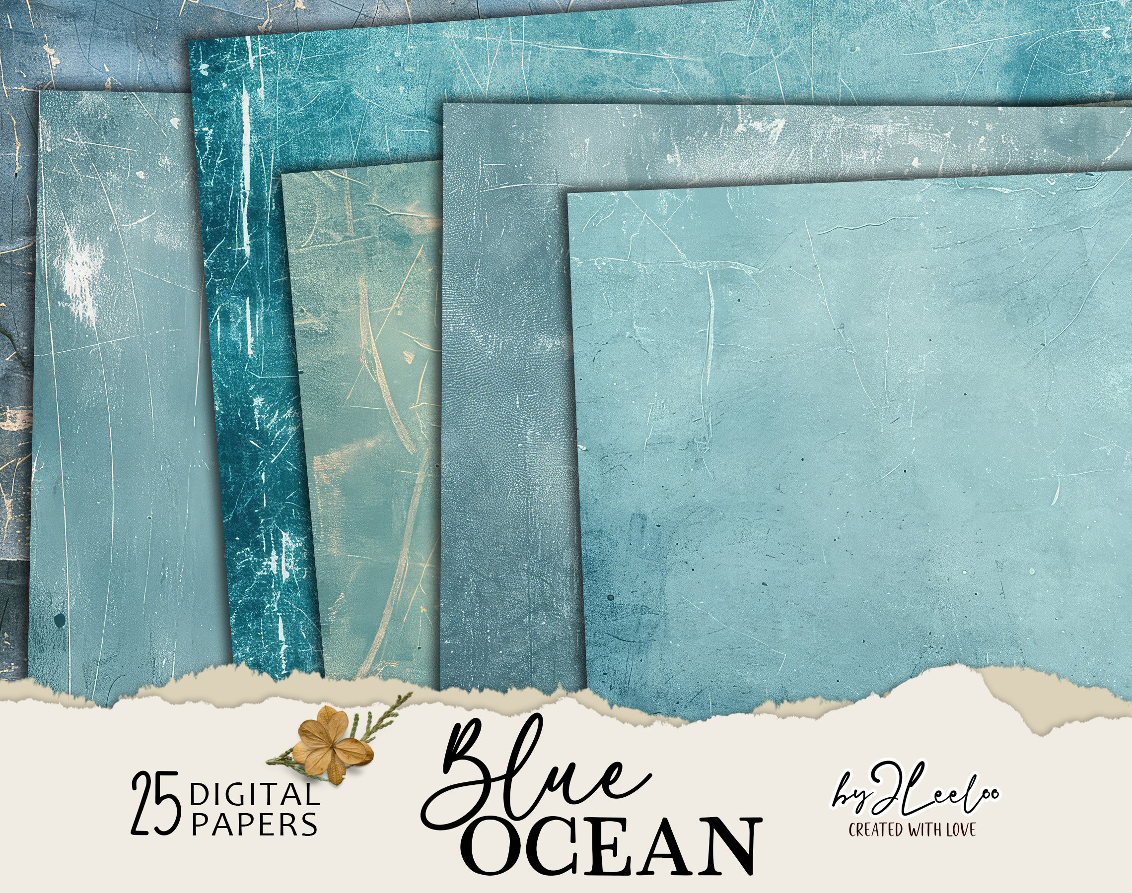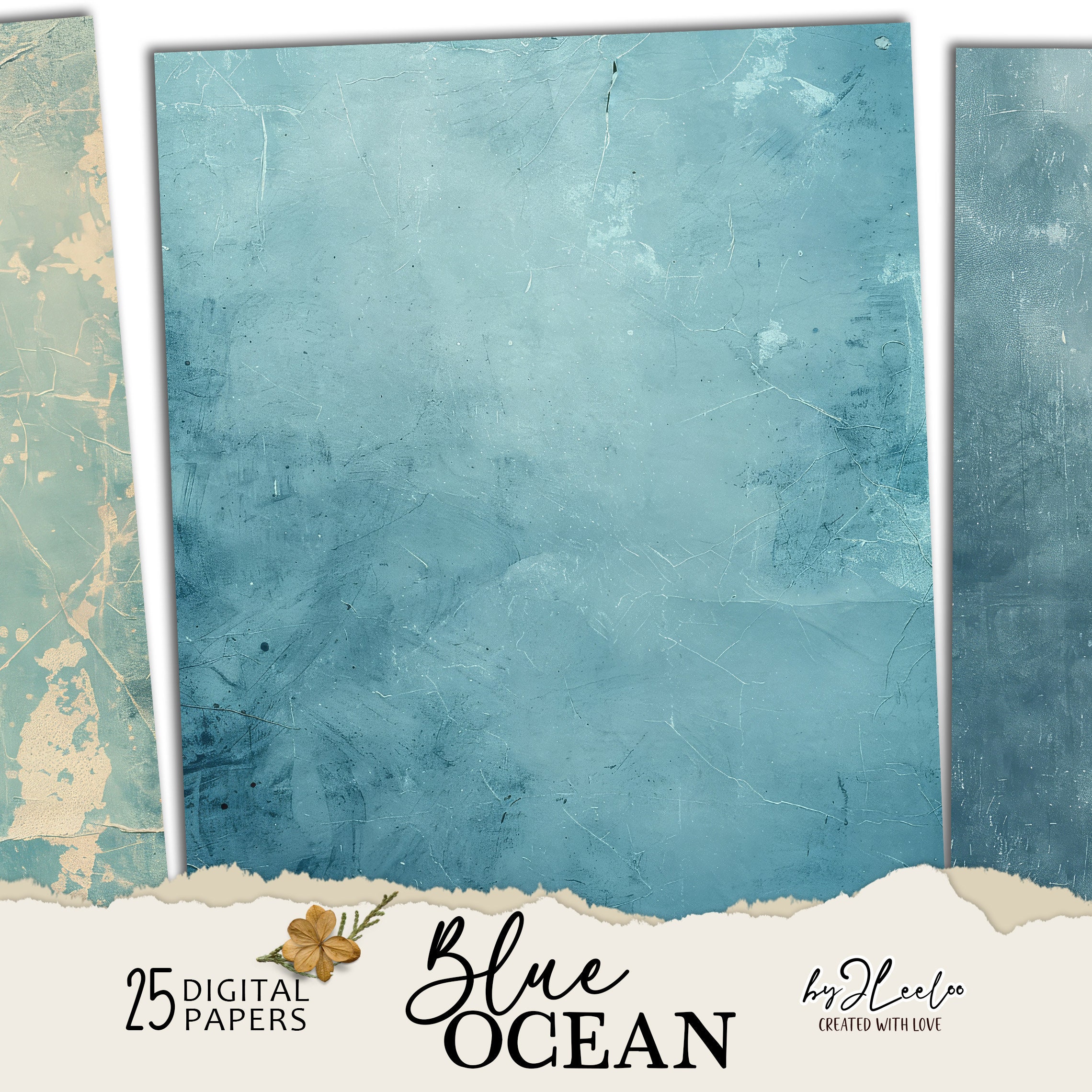 ๐โจ Immerse yourself in the tranquility of our 'BLUE OCEAN' collection, offering 25 digital papers in a spectrum of light blues, leaning towards serene greens and soft blues. Each paper captures the soothing essence of the ocean, with varying shades reminiscent of its gentle waves and clear skies. Some papers feature scratches, weathering, creases, and an aged appearance, adding a touch of authenticity and charm. Versatile and evocative, these papers are perfect for a wide range of projects, from vintage-inspired designs to contemporary creations. Let your imagination set sail on the calming waters of creativity! ๐