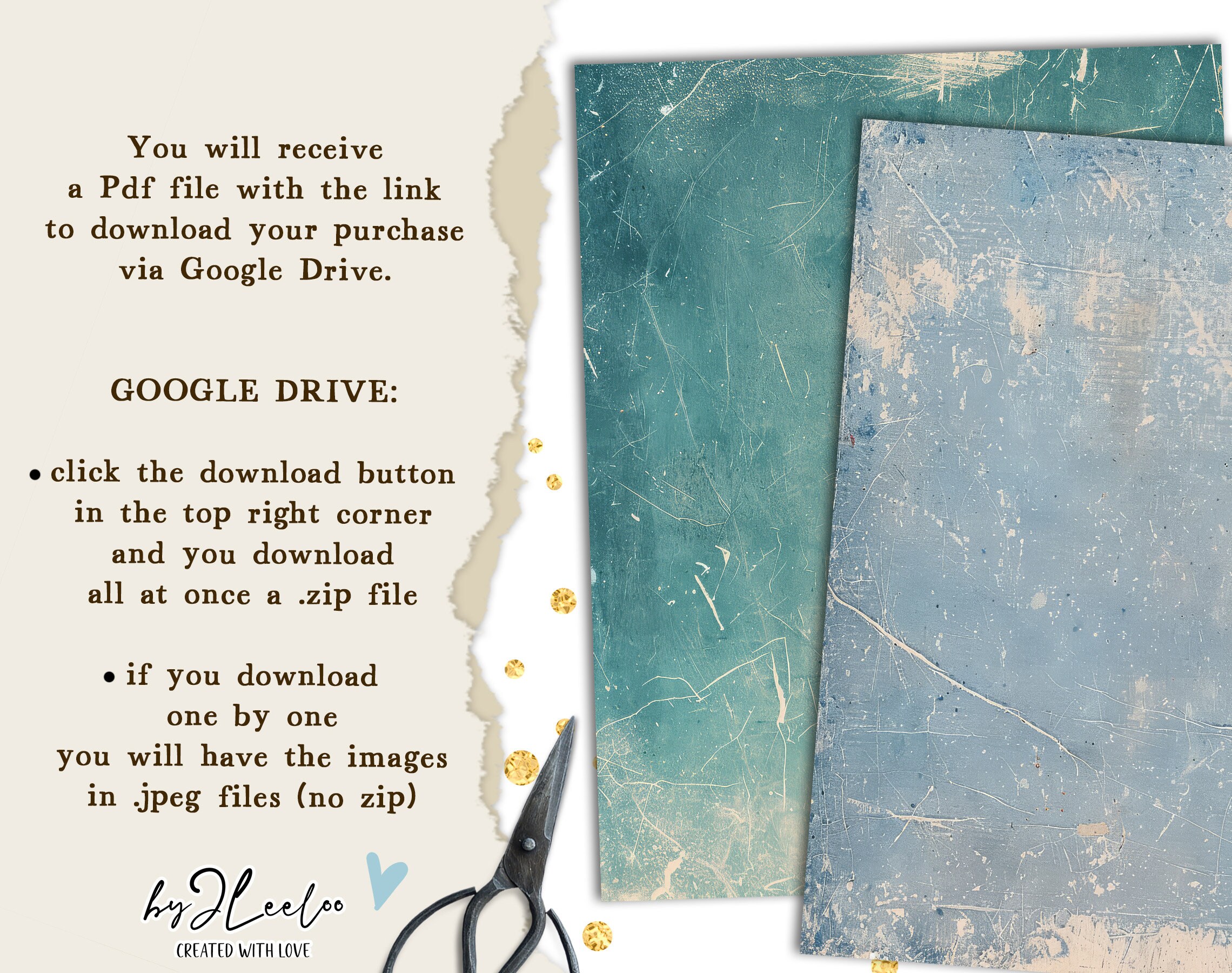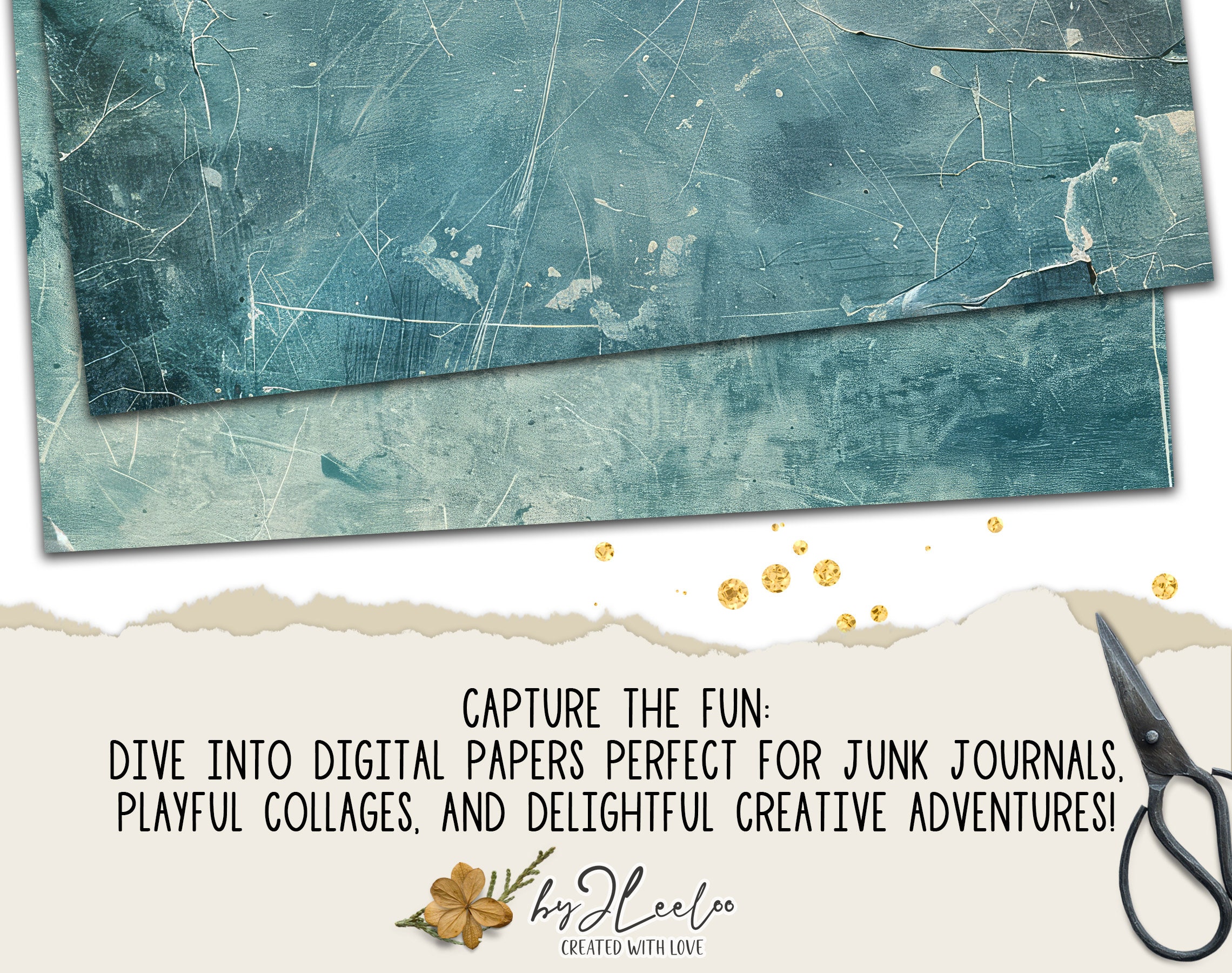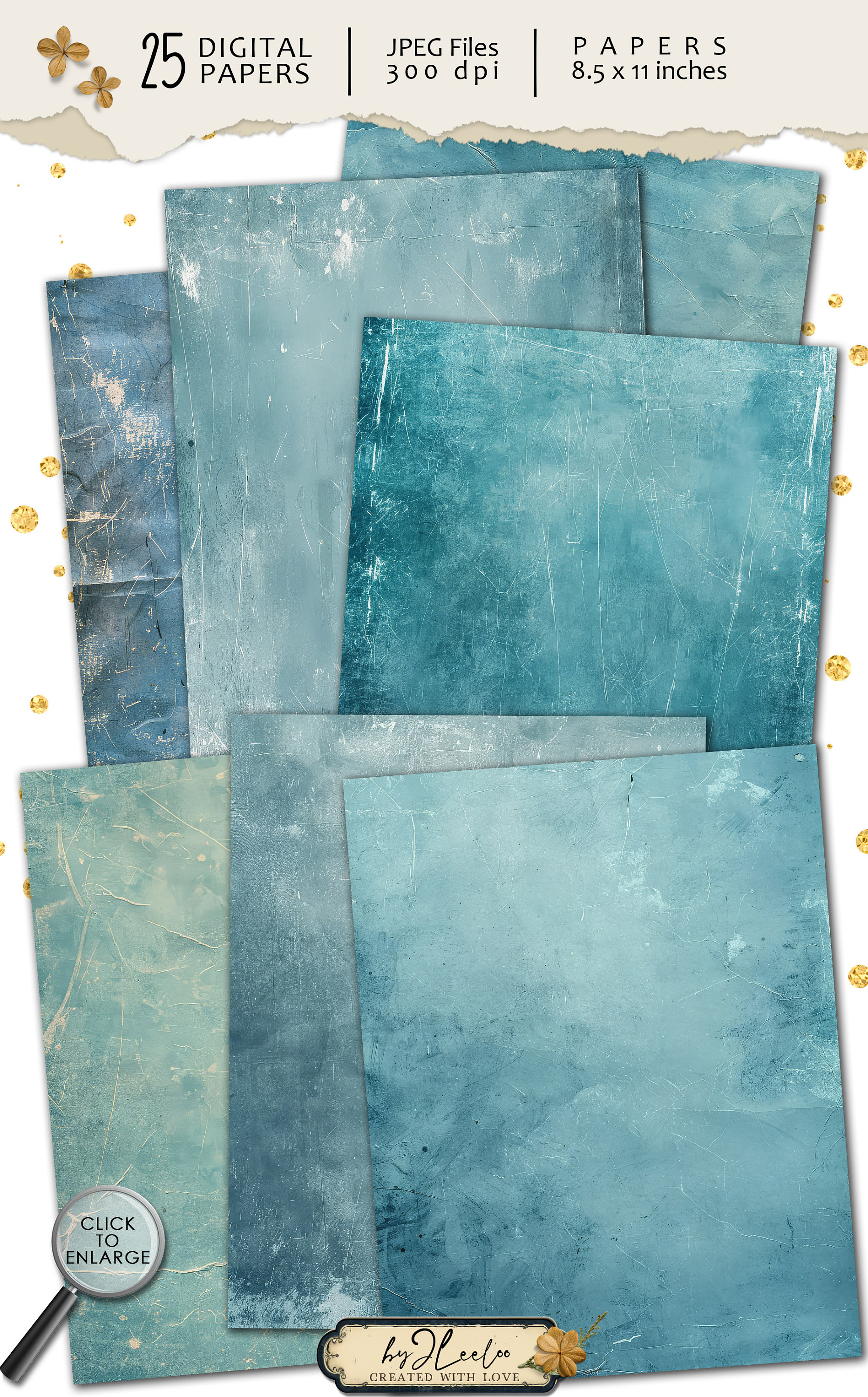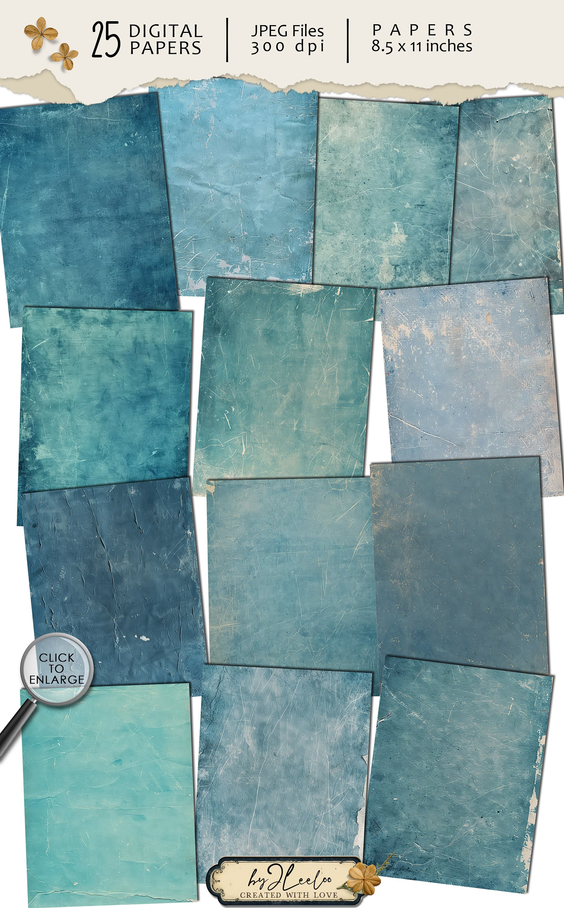 ๐โจ Immerse yourself in the tranquility of our 'BLUE OCEAN' collection, offering 25 digital papers in a spectrum of light blues, leaning towards serene greens and soft blues. Each paper captures the soothing essence of the ocean, with varying shades reminiscent of its gentle waves and clear skies. Some papers feature scratches, weathering, creases, and an aged appearance, adding a touch of authenticity and charm. Versatile and evocative, these papers are perfect for a wide range of projects, from vintage-inspired designs to contemporary creations. Let your imagination set sail on the calming waters of creativity! ๐