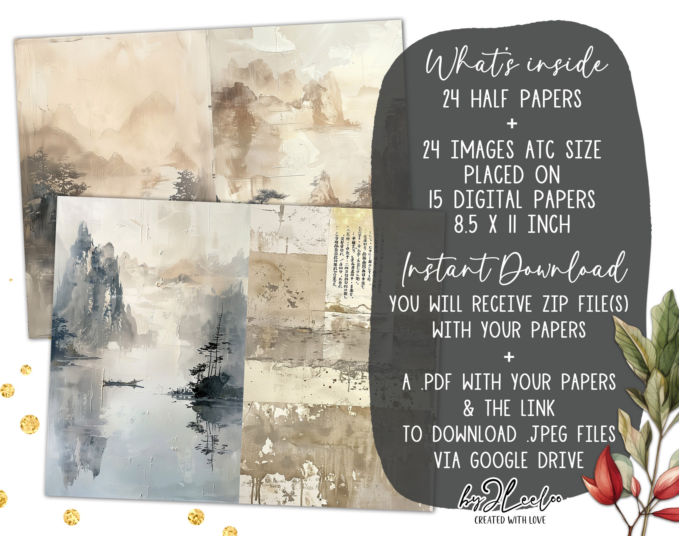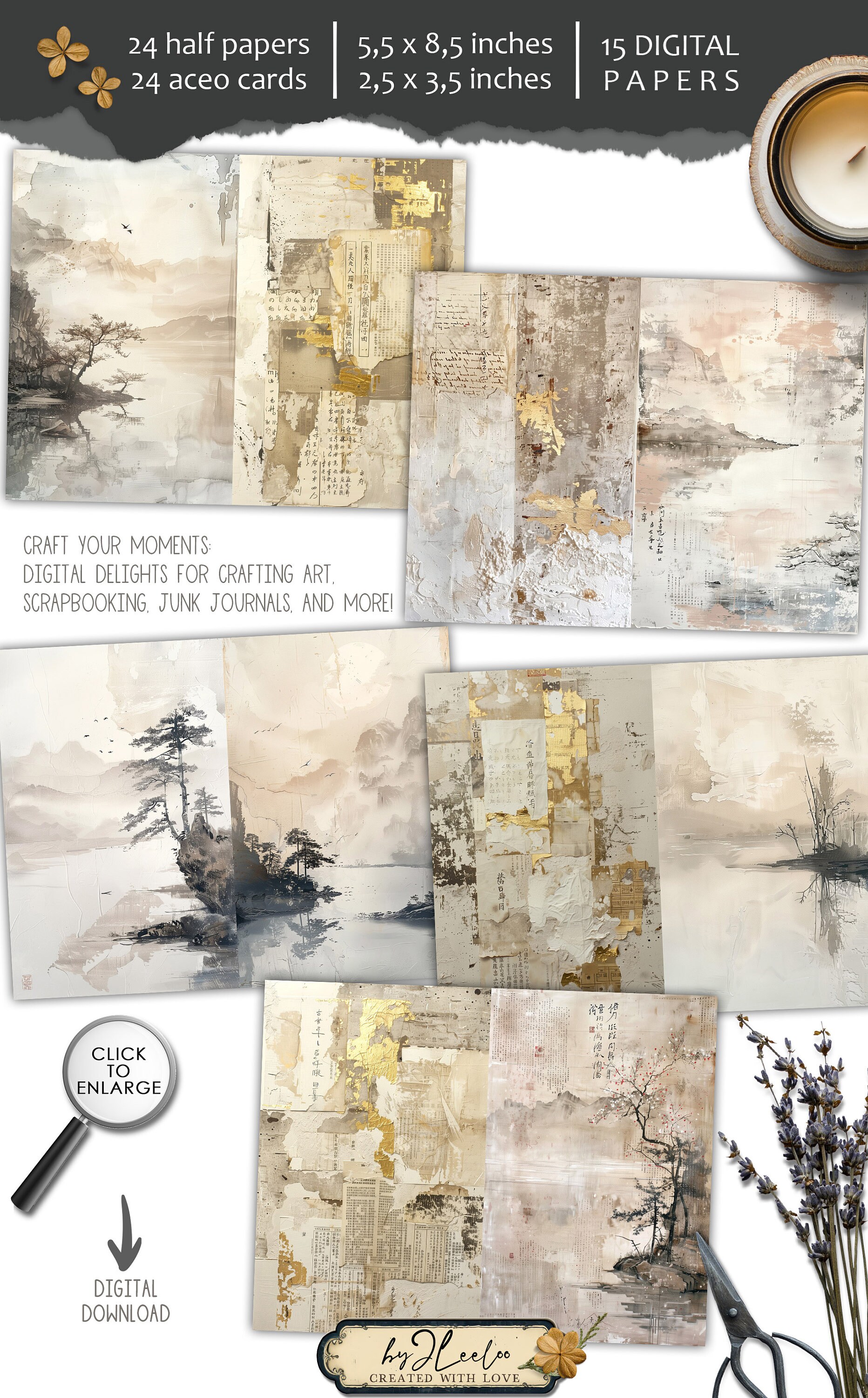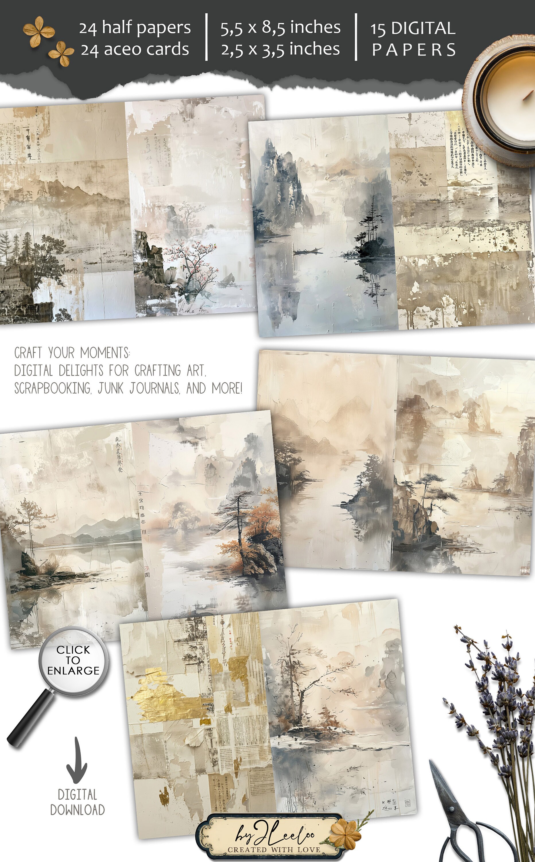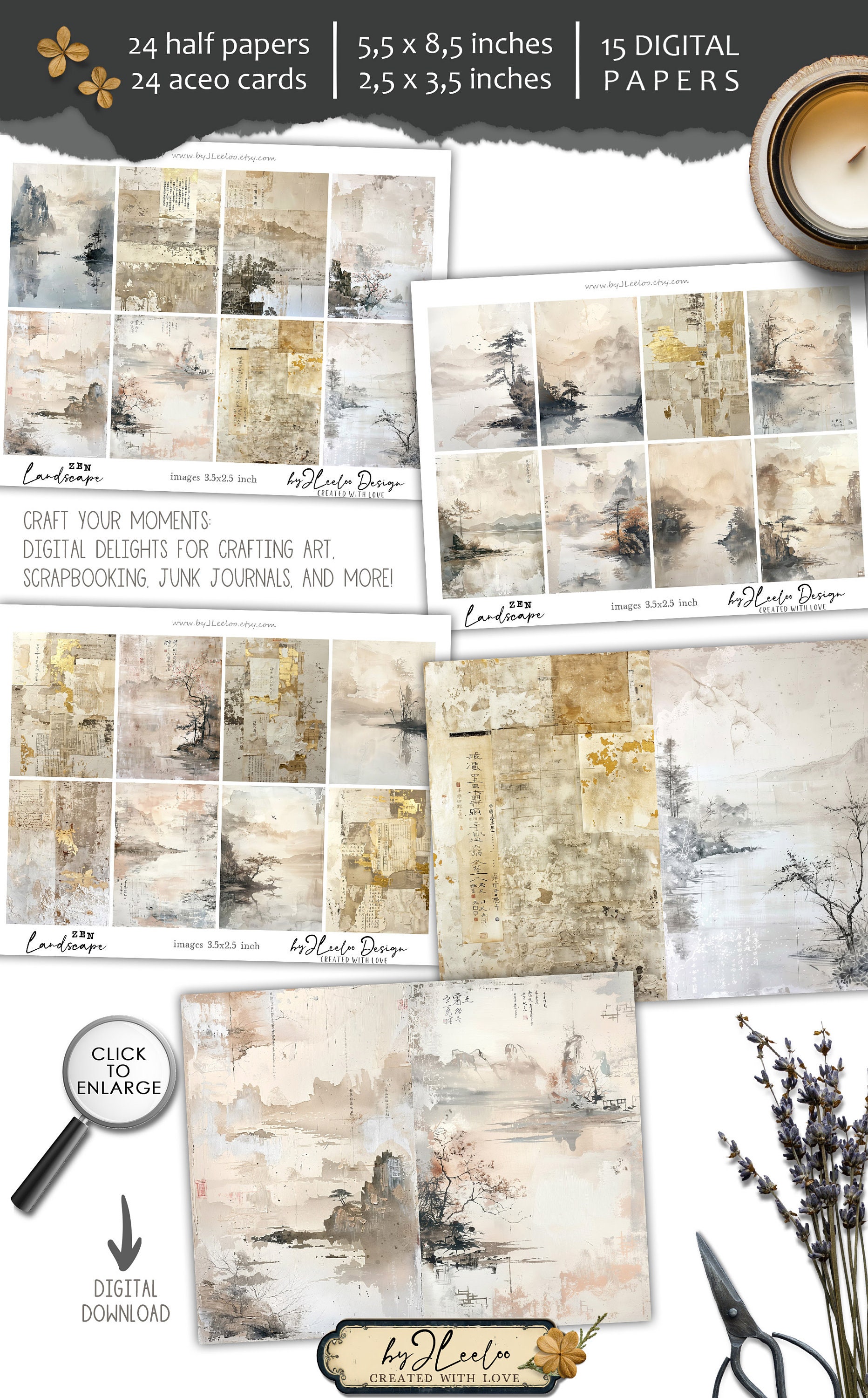 ZEN LANDSCAPE half pages printable | Oriental art junk journal Mixed Media supplies | Grunge dirty paper card making collage diary | pp782
