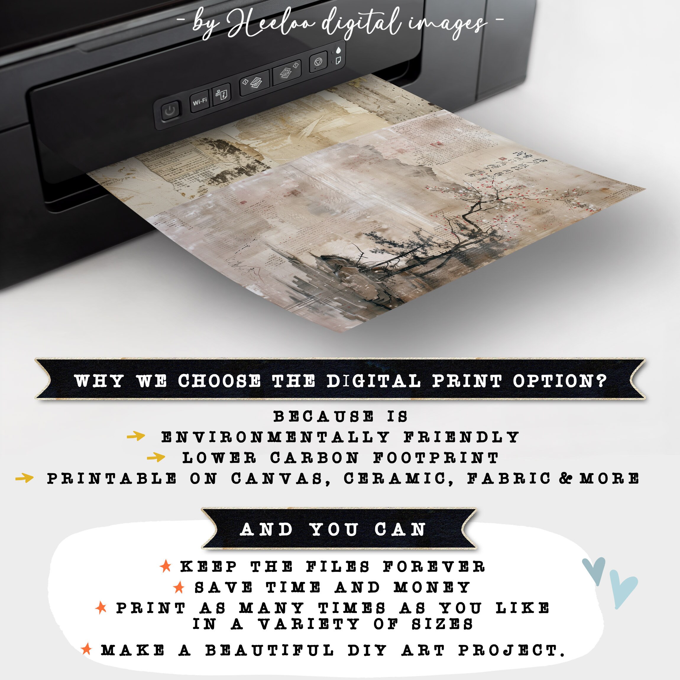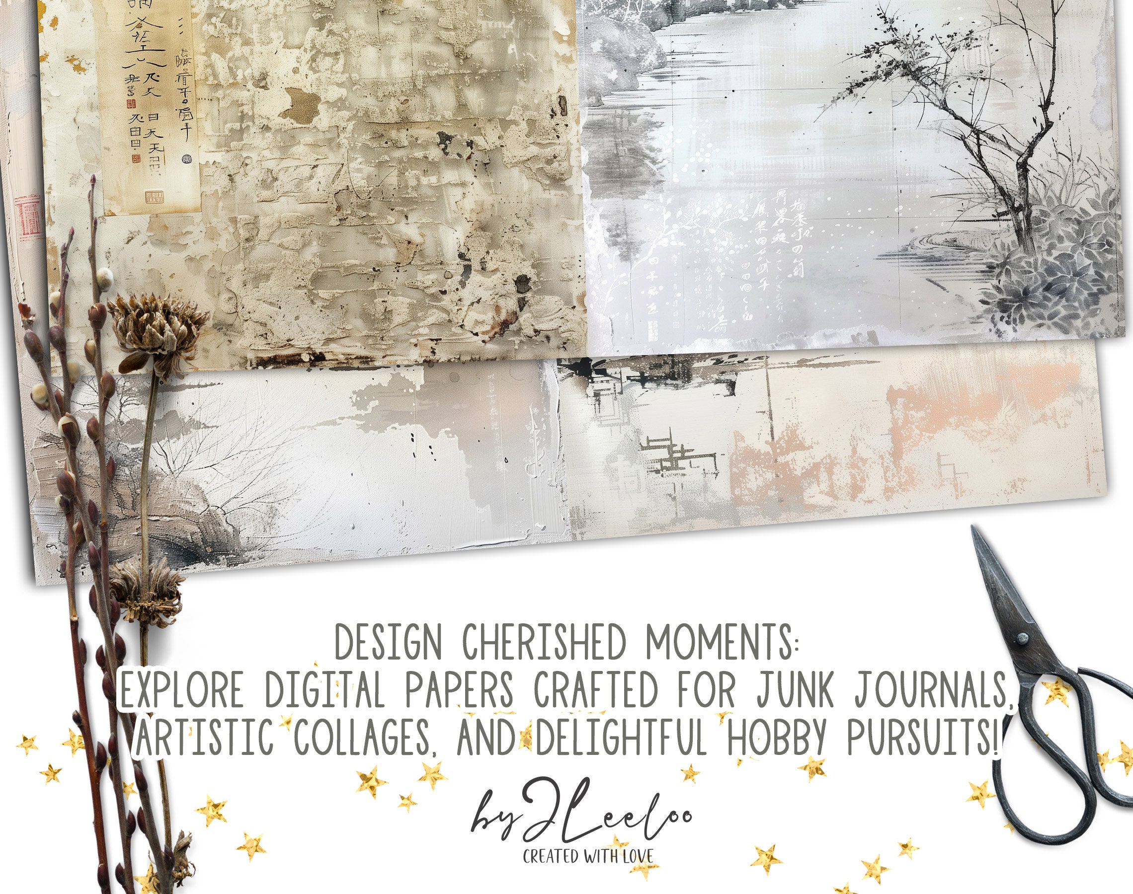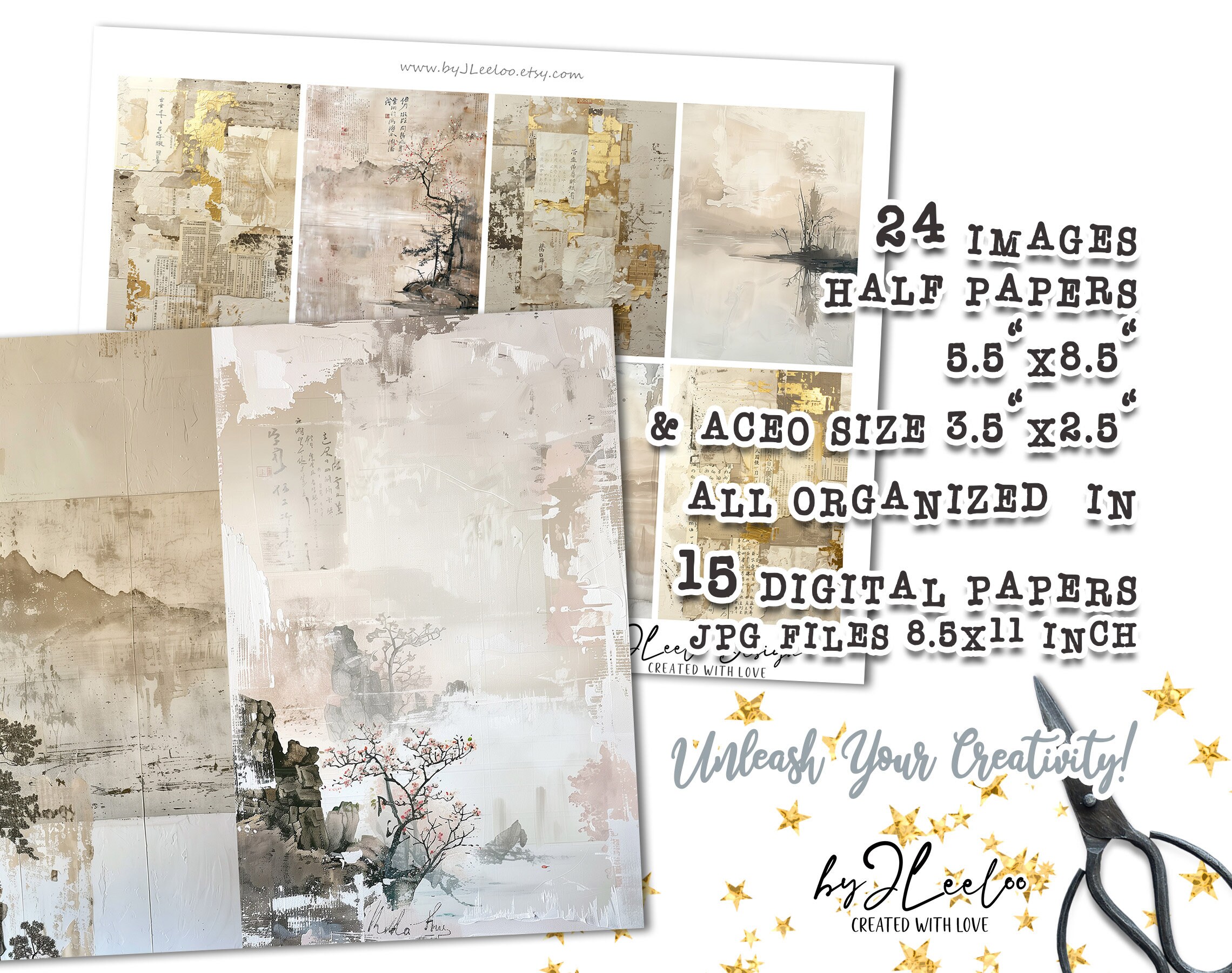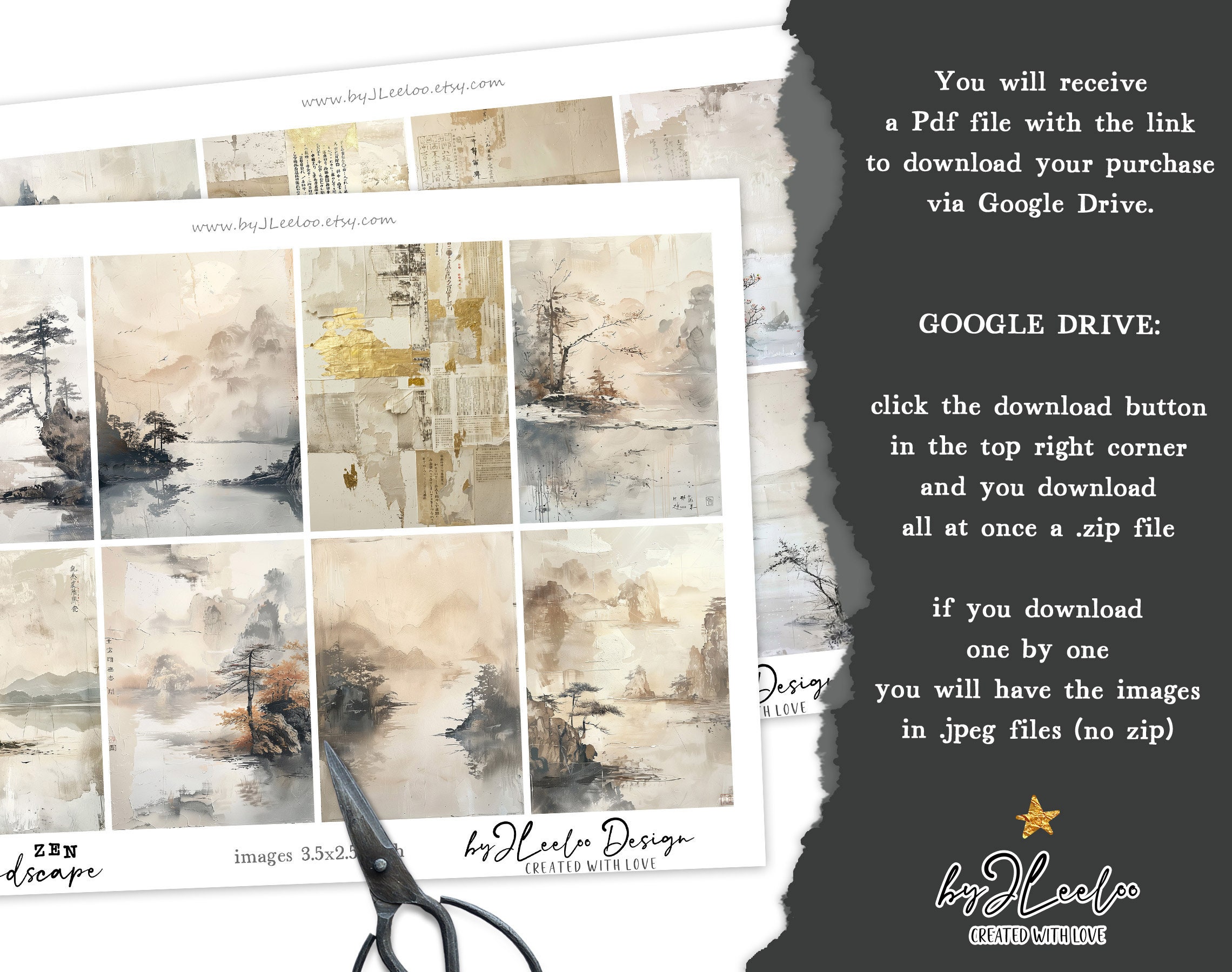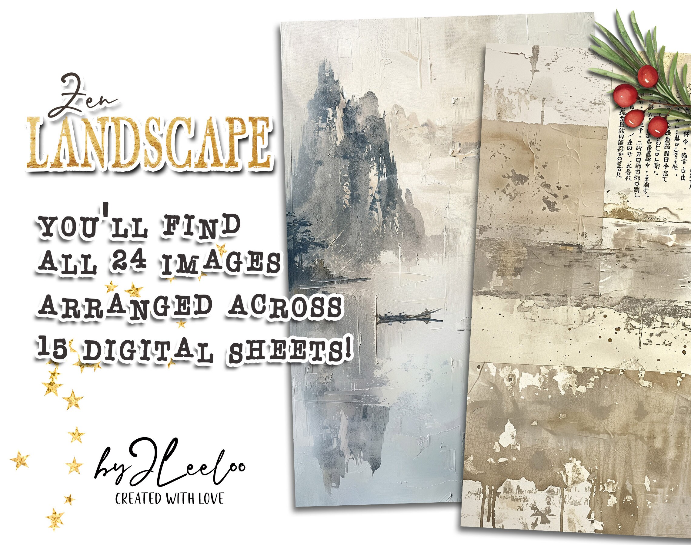 ZEN LANDSCAPE half pages printable | Oriental art junk journal Mixed Media supplies | Grunge dirty paper card making collage diary | pp782