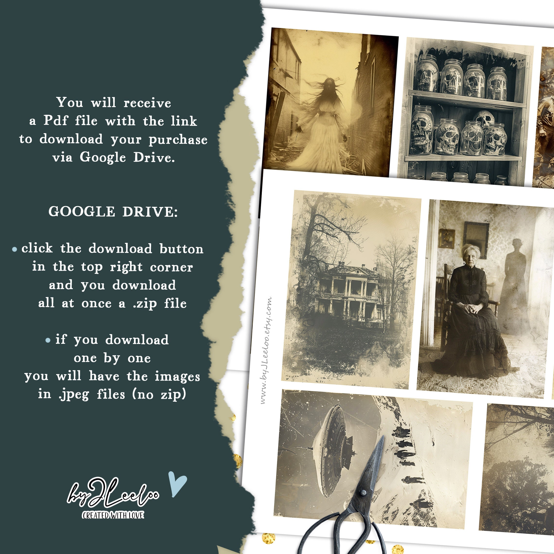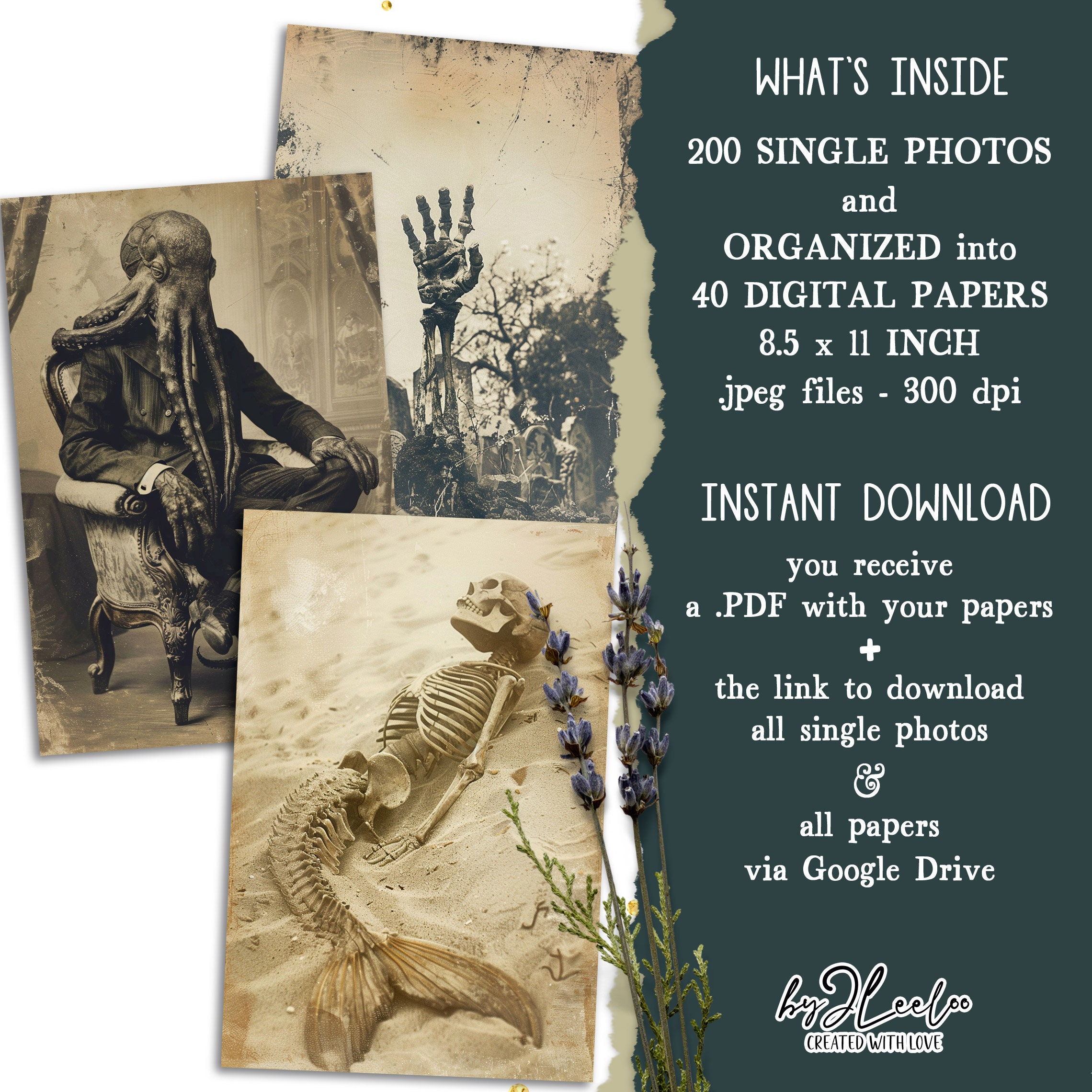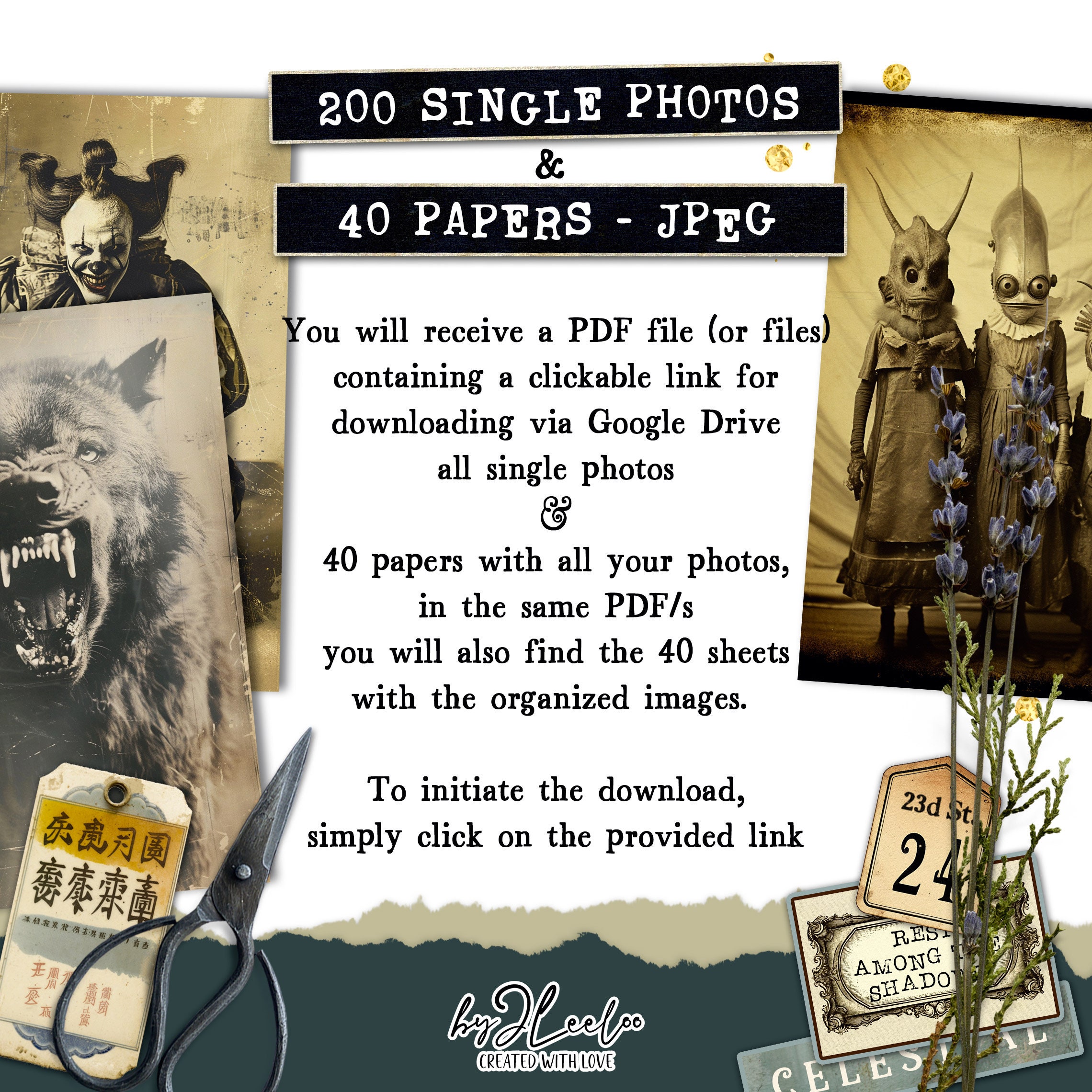 1 Pdf with the link to download the single photos and the digital papers from Google Drive in .jpg format (no .zip files)