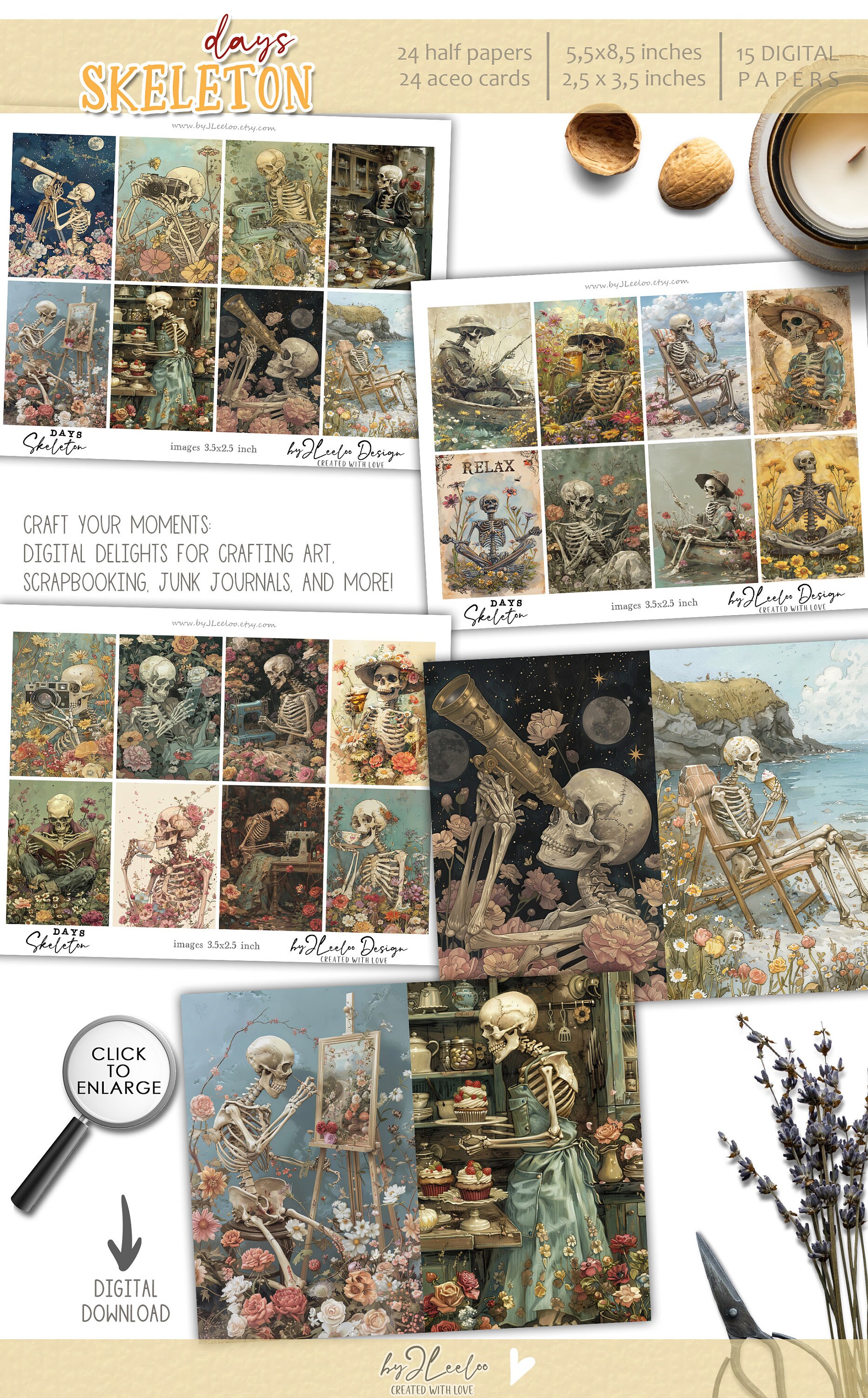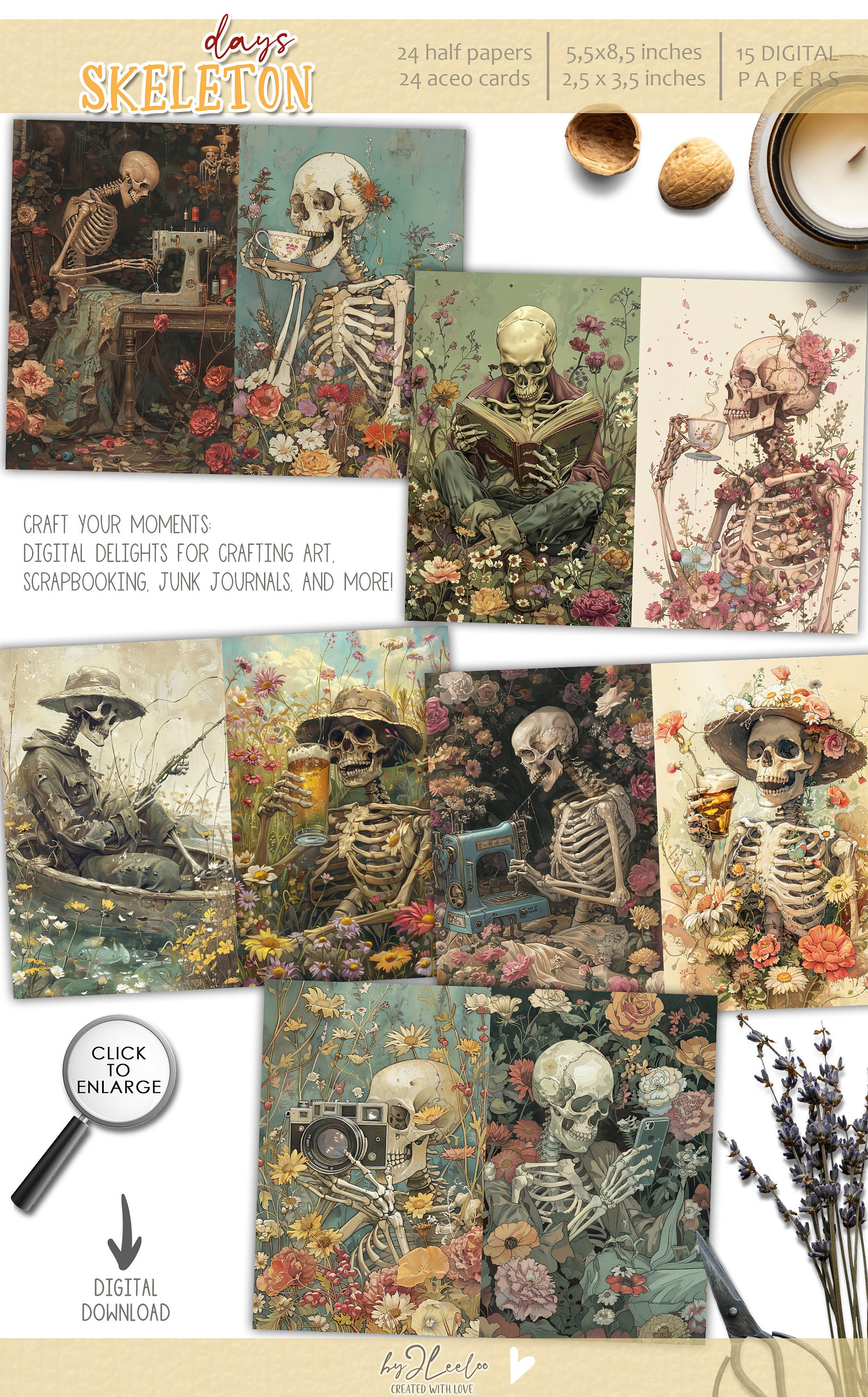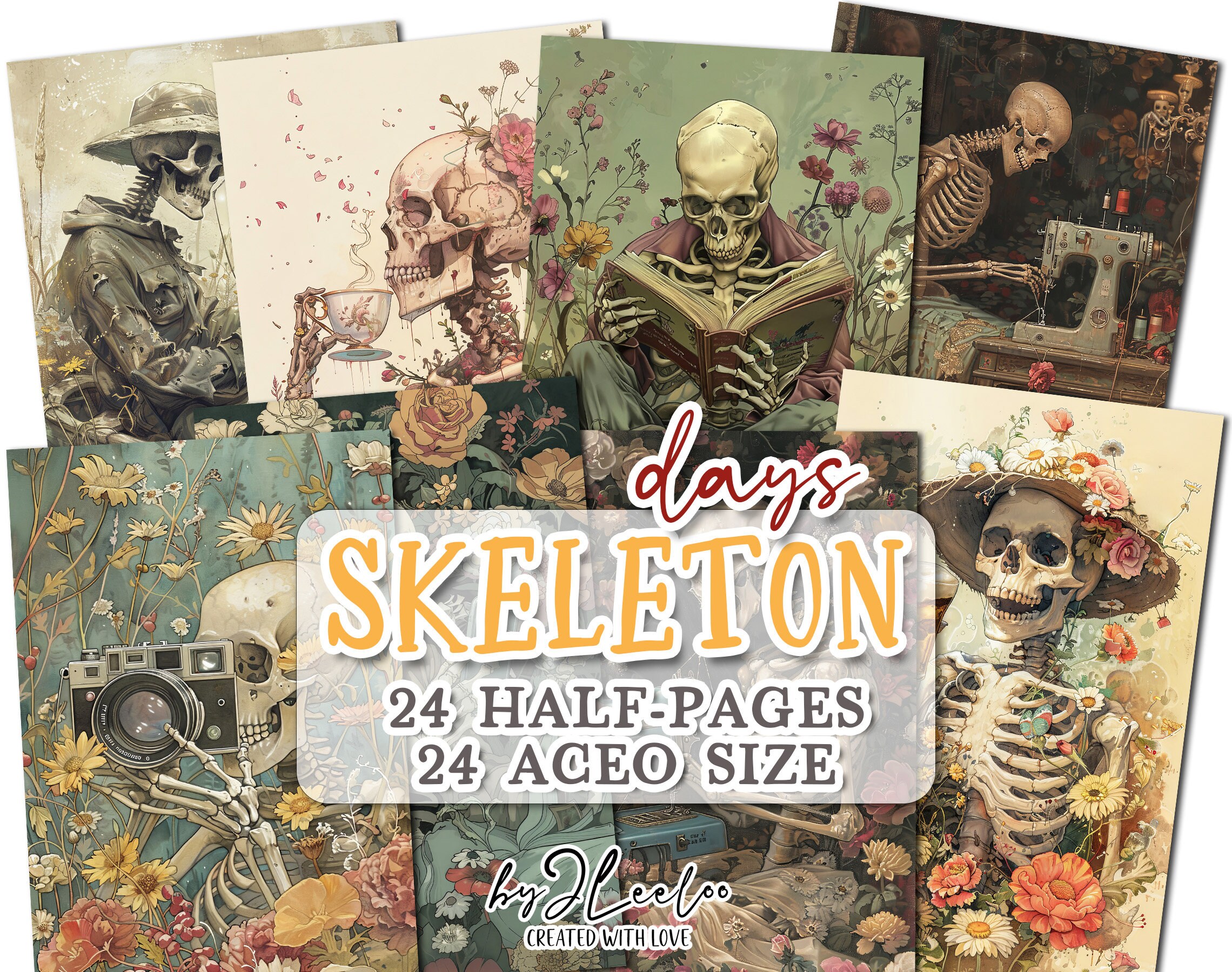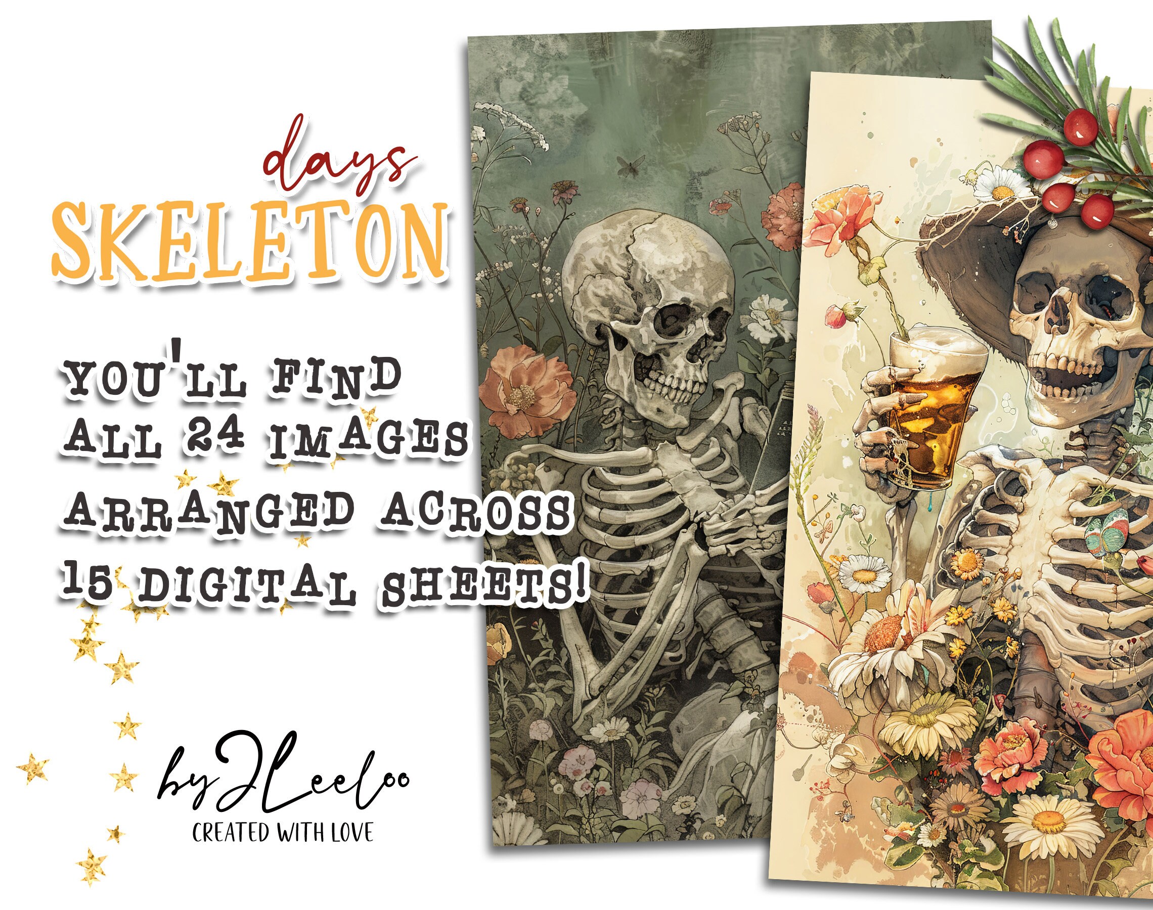 SKELETON DAYS half pages printable hilarious | junk journal Aceo | Funny card paper hand-drawn Halloween or Day of the Dead | pp772