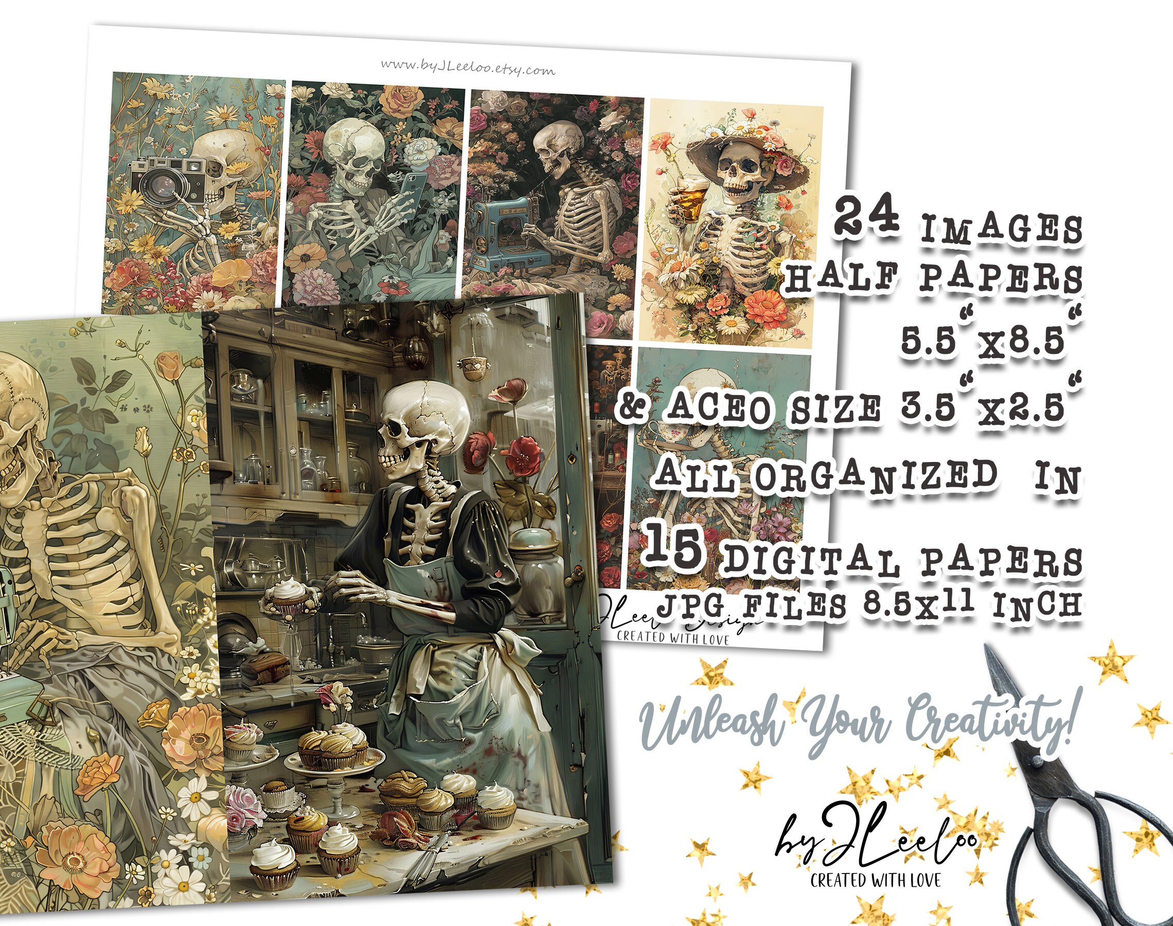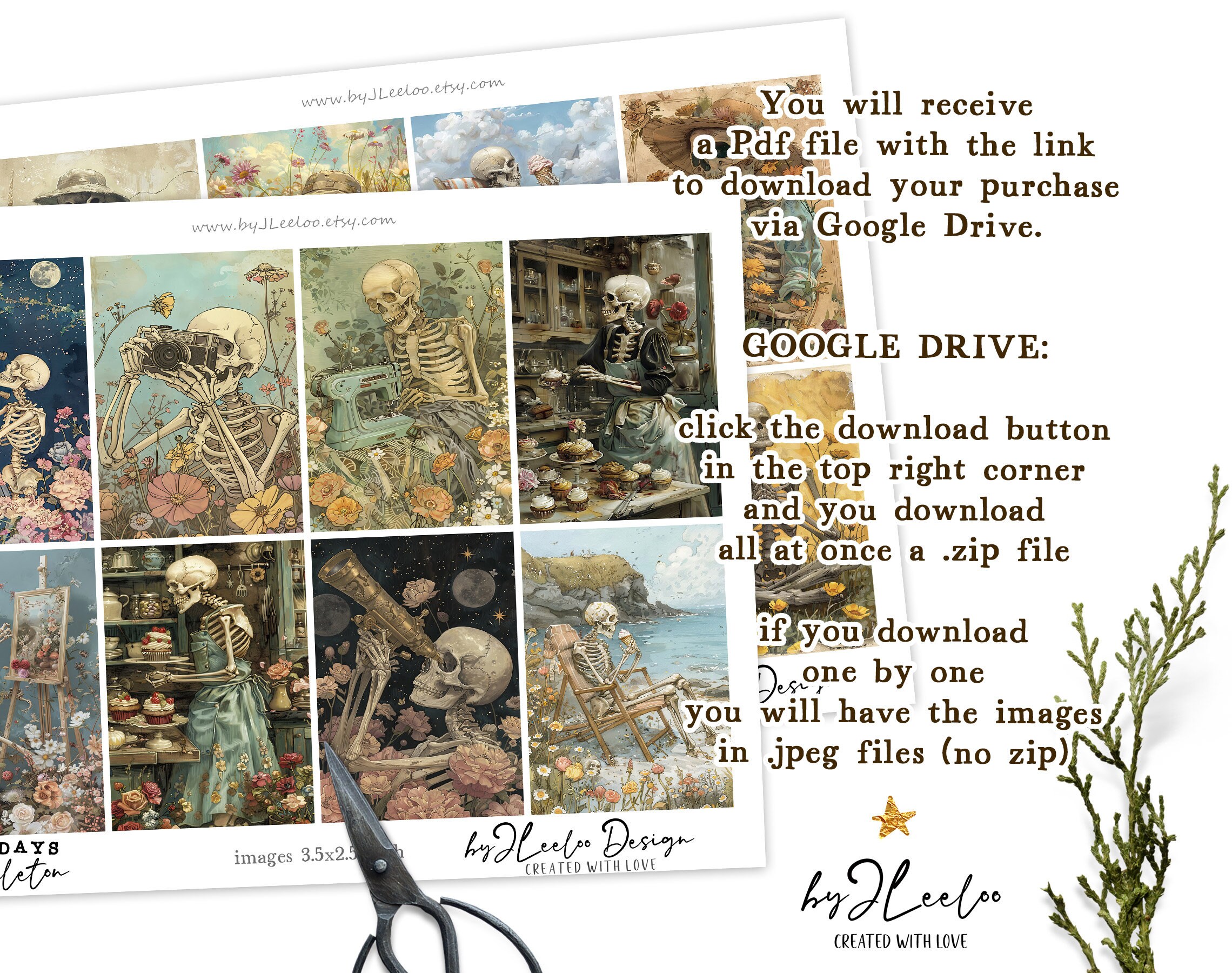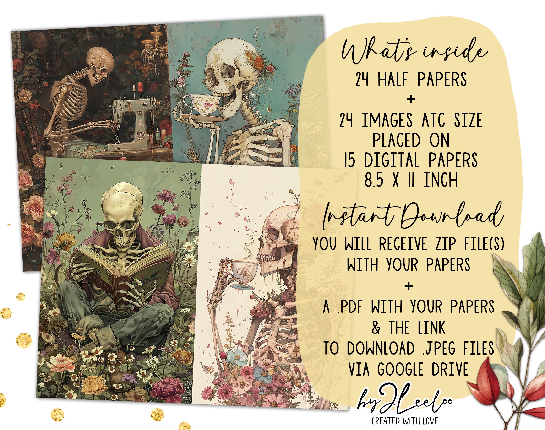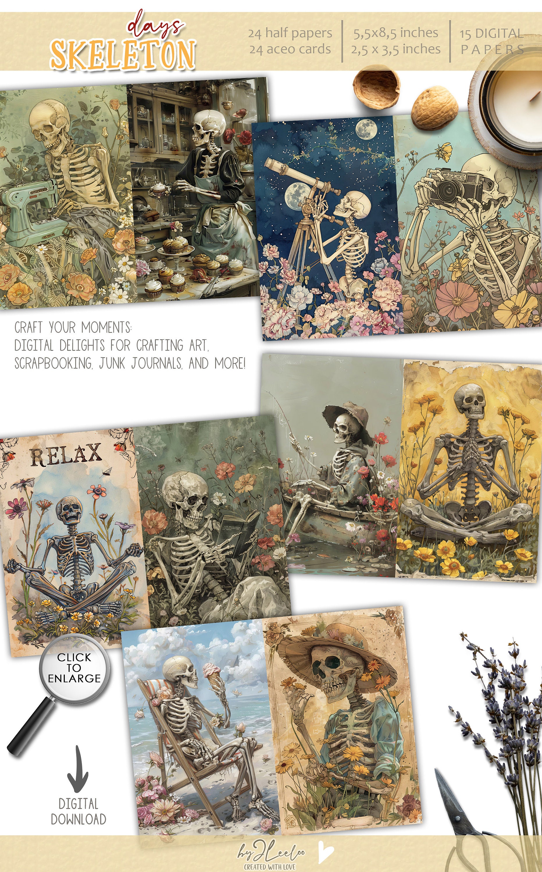SKELETON DAYS half pages printable hilarious | junk journal Aceo | Funny card paper hand-drawn Halloween or Day of the Dead | pp772