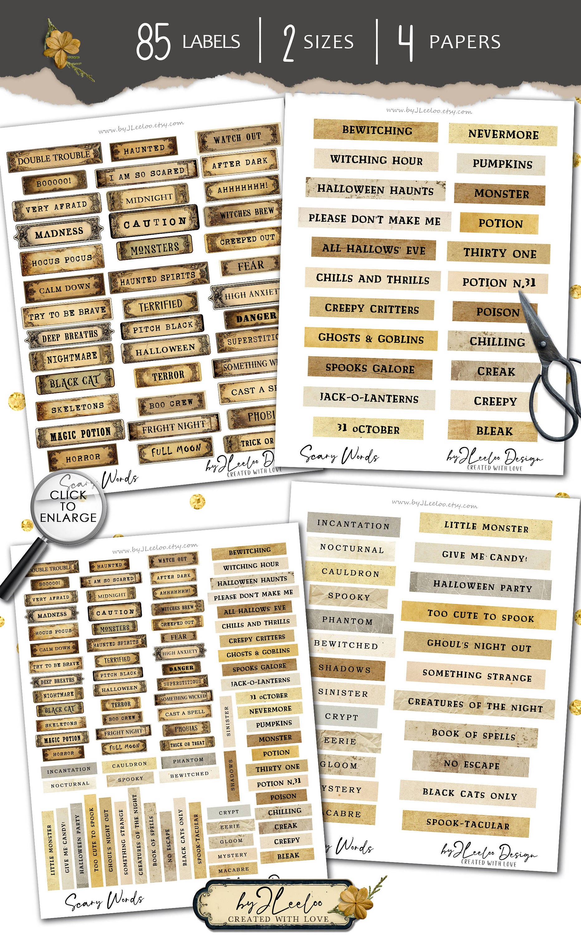 85 small labels with scary words, The same 85 labels in a smaller format for a total of 170 labels.