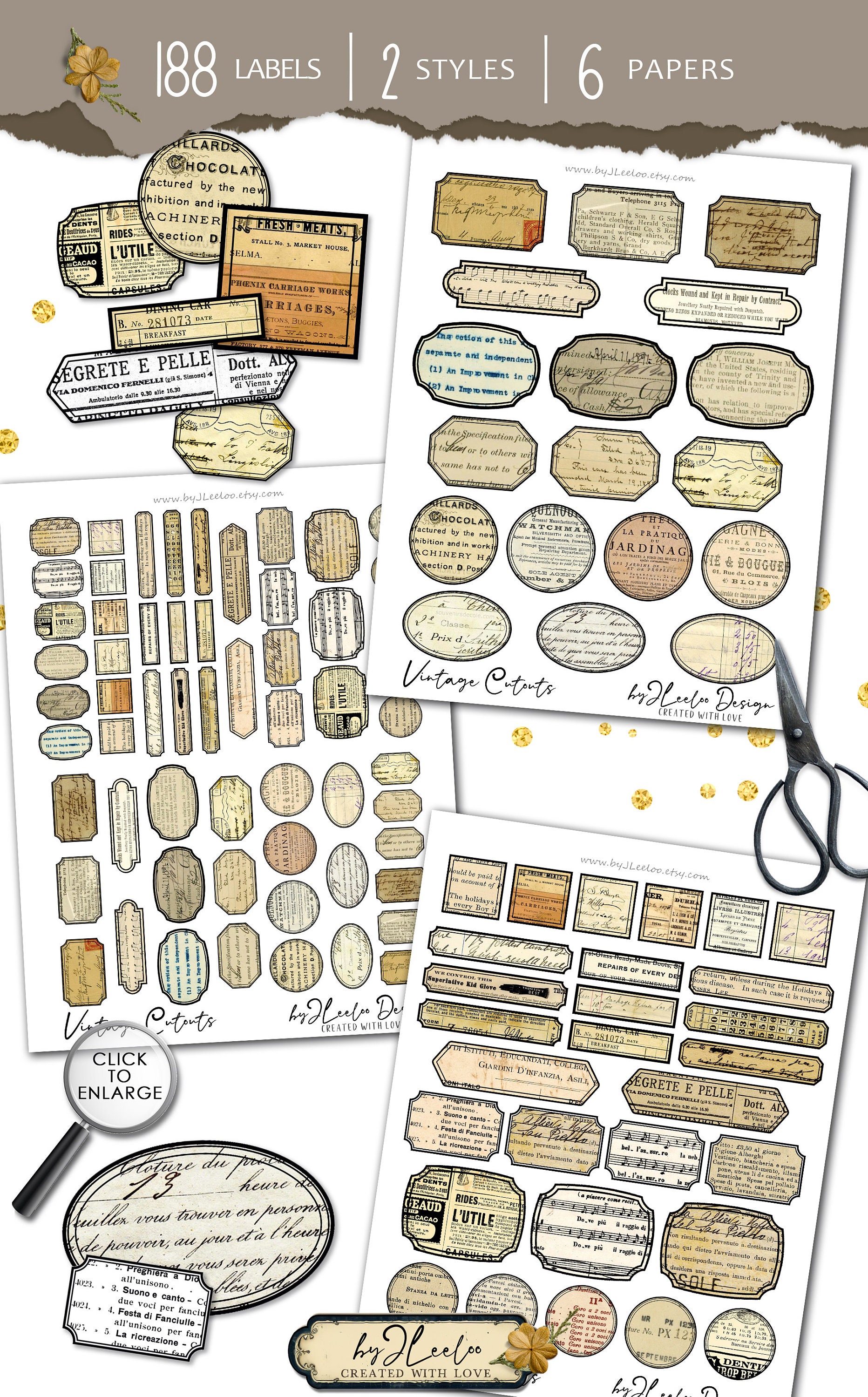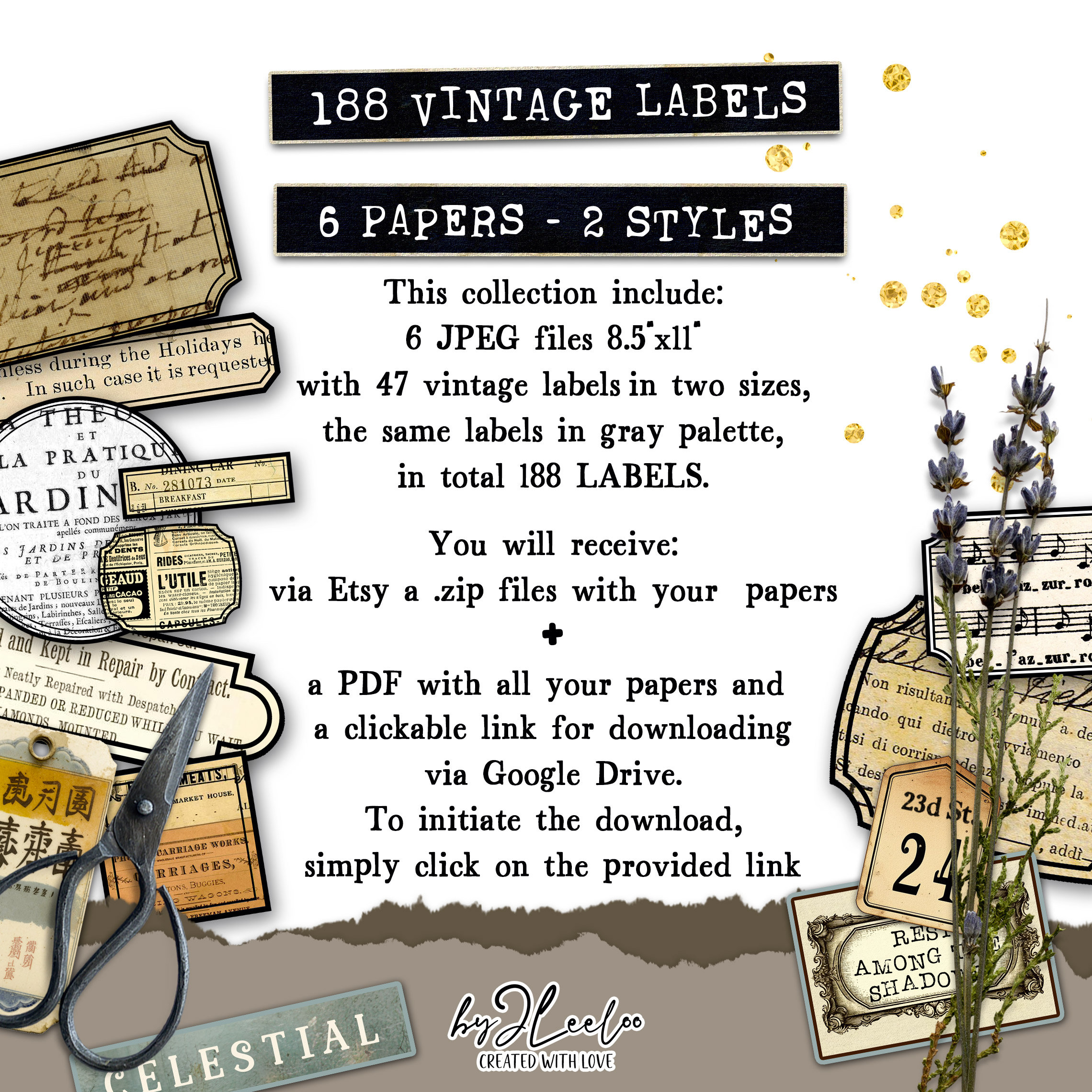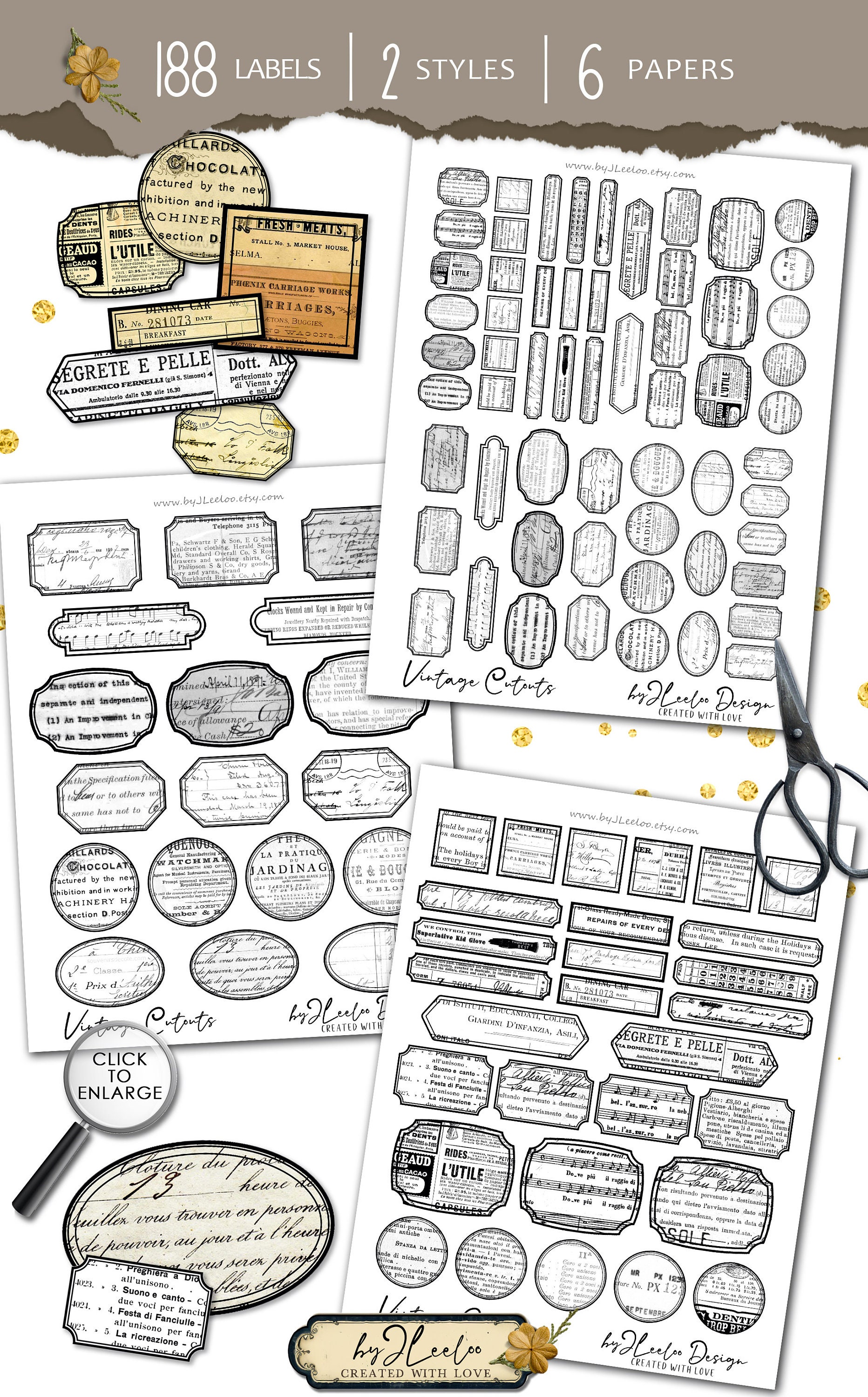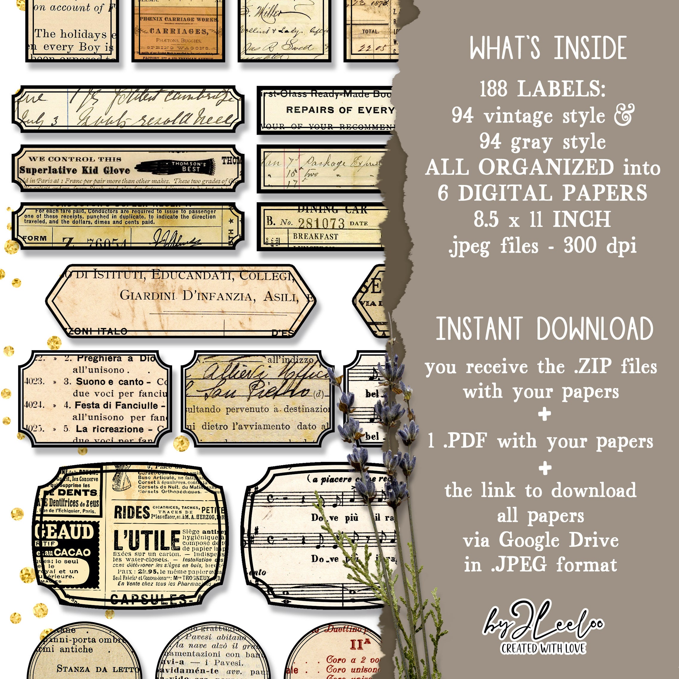 These labels, in vintage tones and in a gray palette, make for a fantastic neutral base. You can use the ones already in vintage tones, or print the ones in gray tones on colored paper of your choice. Alternatively, print them as they are and color them yourself as your imagination inspires you. The important thing is to have fun!