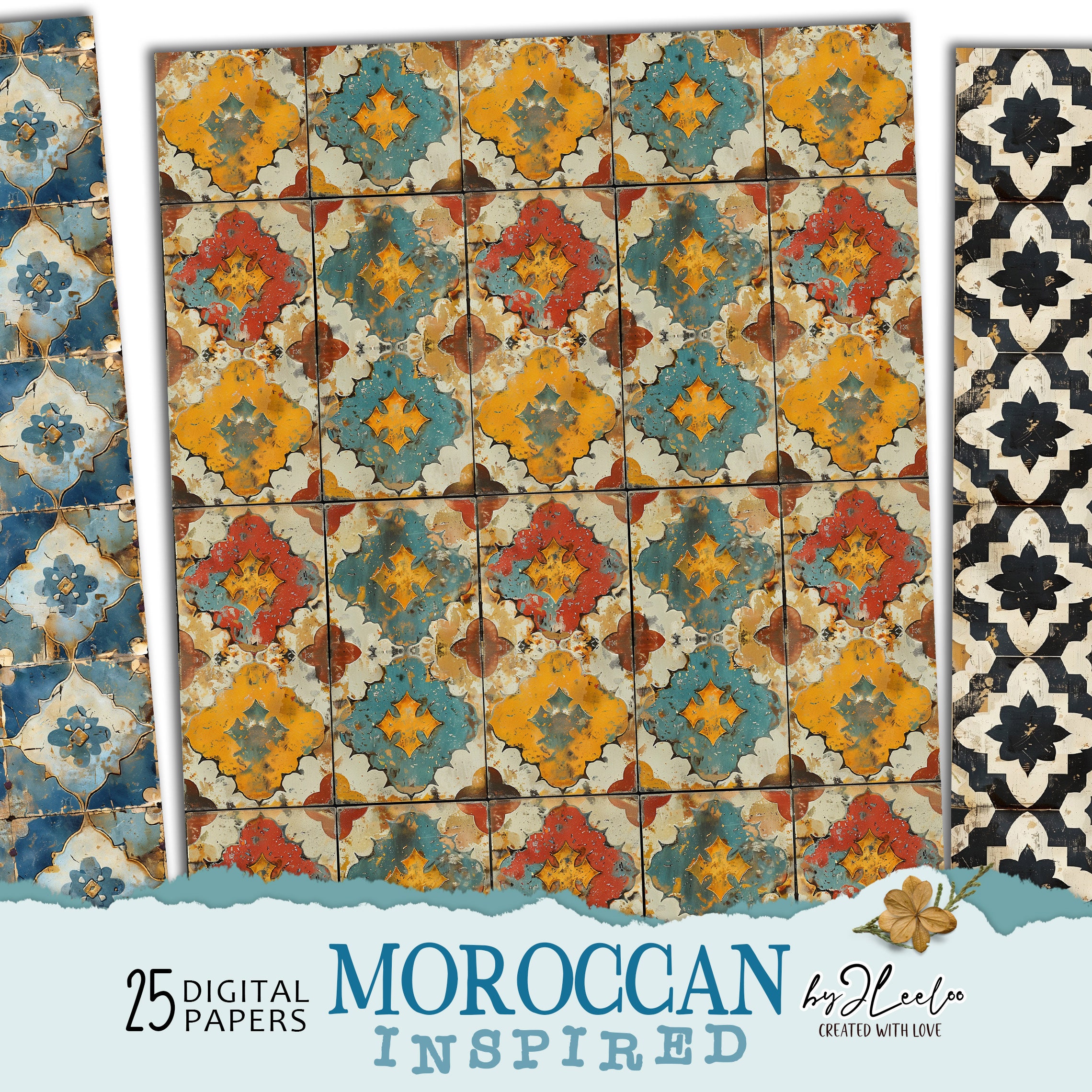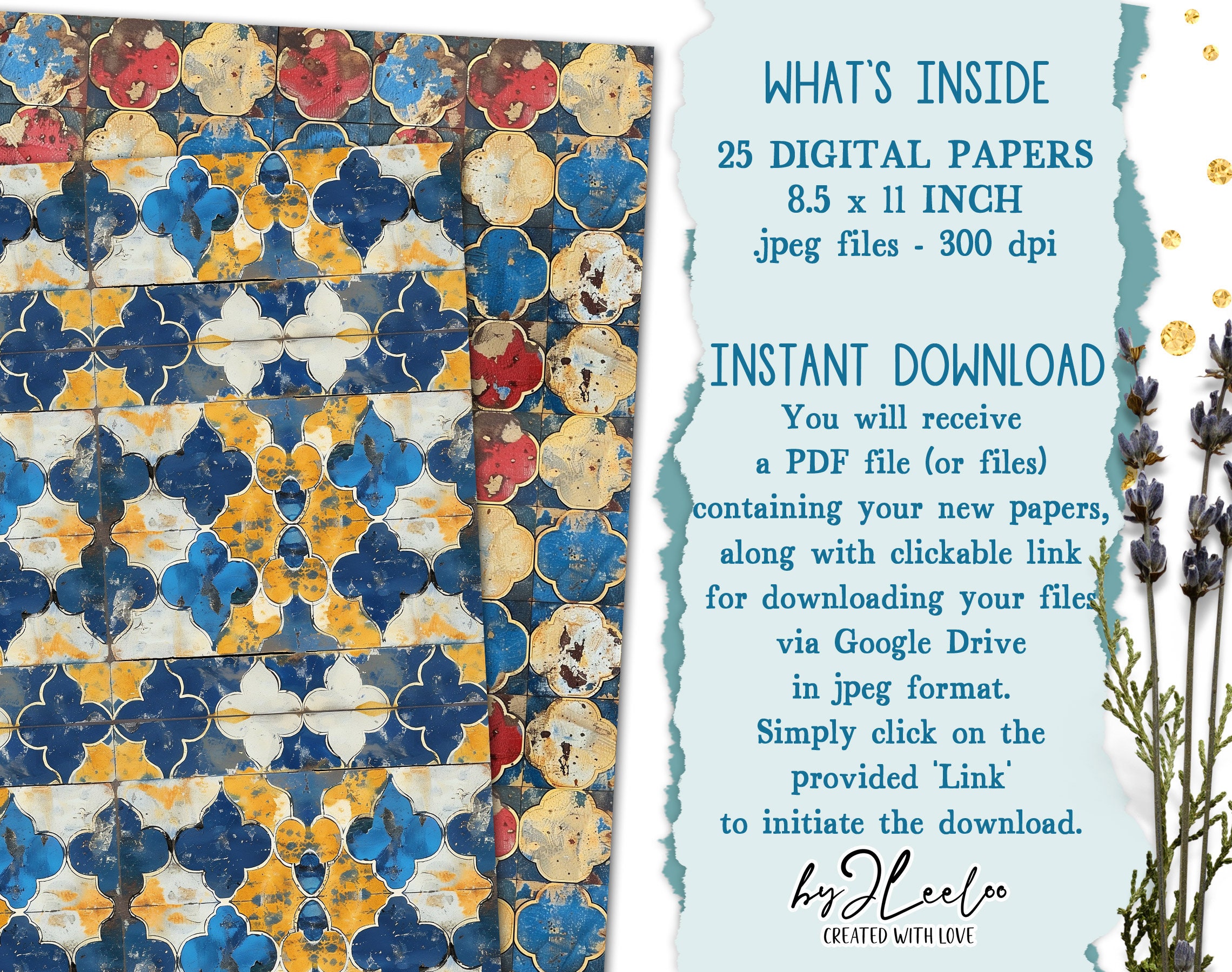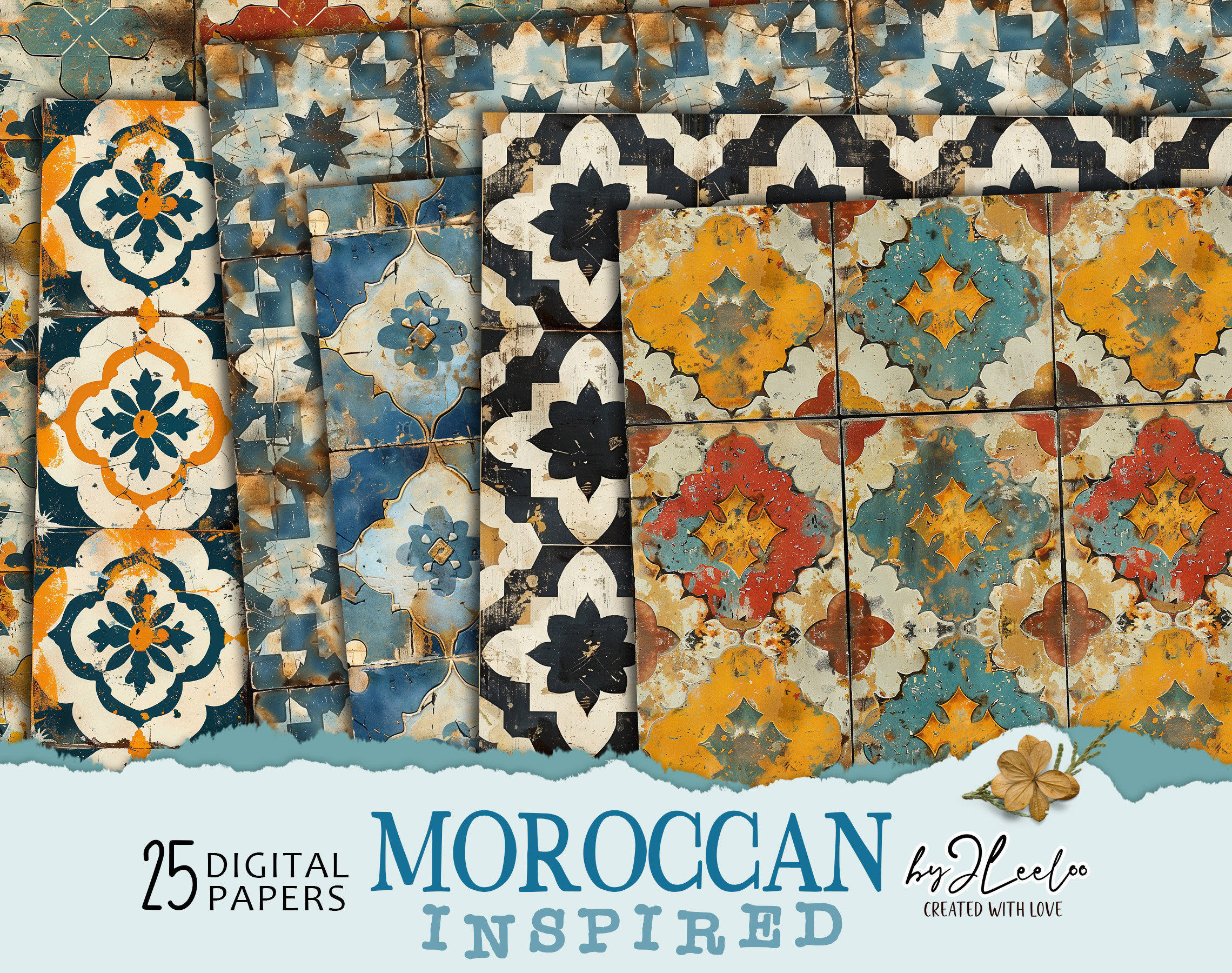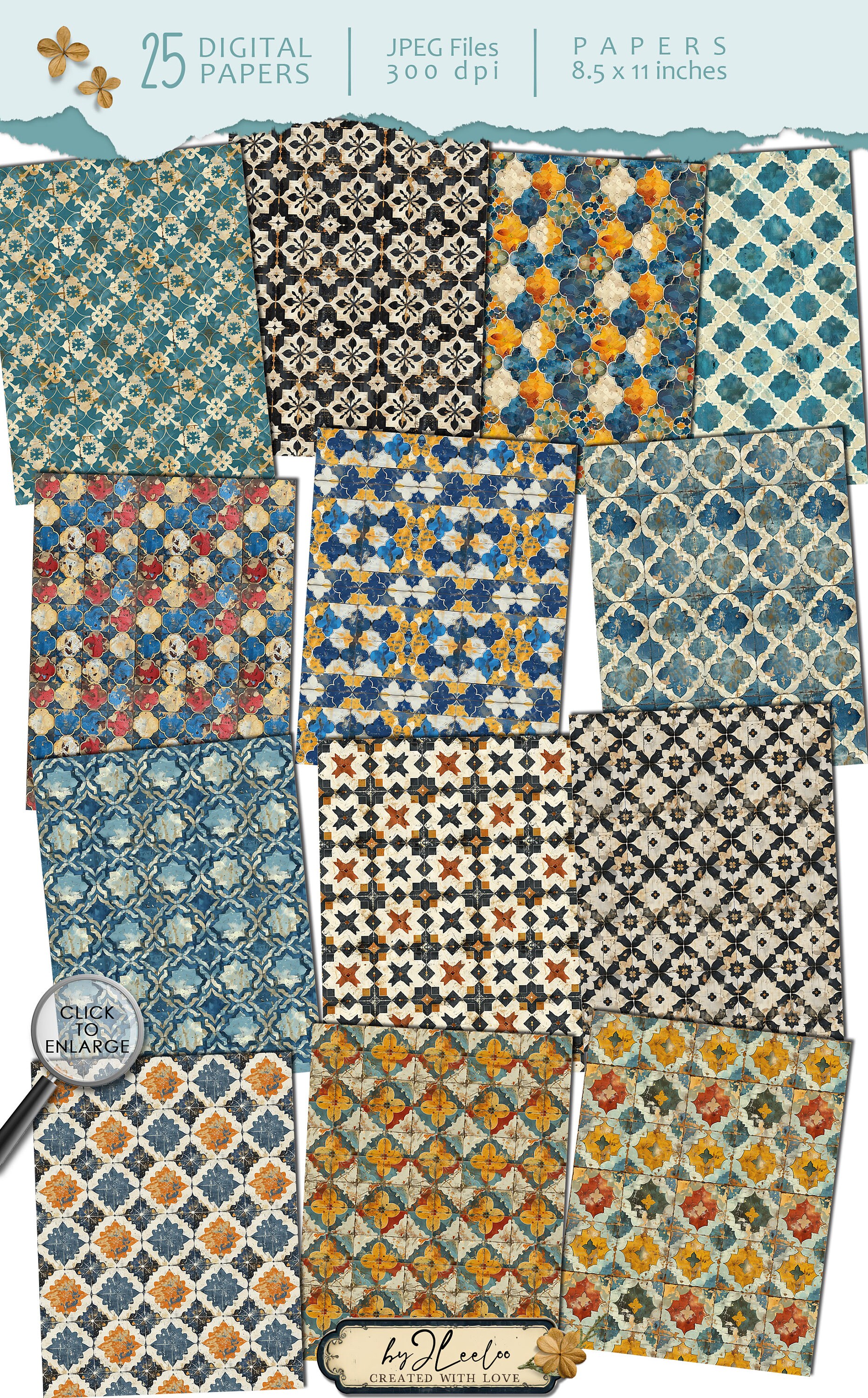 โจ Step into a world of timeless charm with our 'Moroccan Inspired' papers pack, featuring a mesmerizing array of digital papers in vintage-inspired patterns and hues! Dive into 25 captivating designs, each exuding the allure of aged textures and vibrant colors. Let yourself be transported by the intricate patterns and soft, muted tones, evoking the essence of Moroccan heritage and culture. Perfect for adding a touch of elegance to your T-shirts, Mugs, Bags, Cushions, Wall Art, Websites, Social Media, Invitations, Journalling, Business and Greeting Cards, Sublimation, Heat Transfer, Phone Cases, or any other creative endeavor that speaks to your heart! ๐ซ