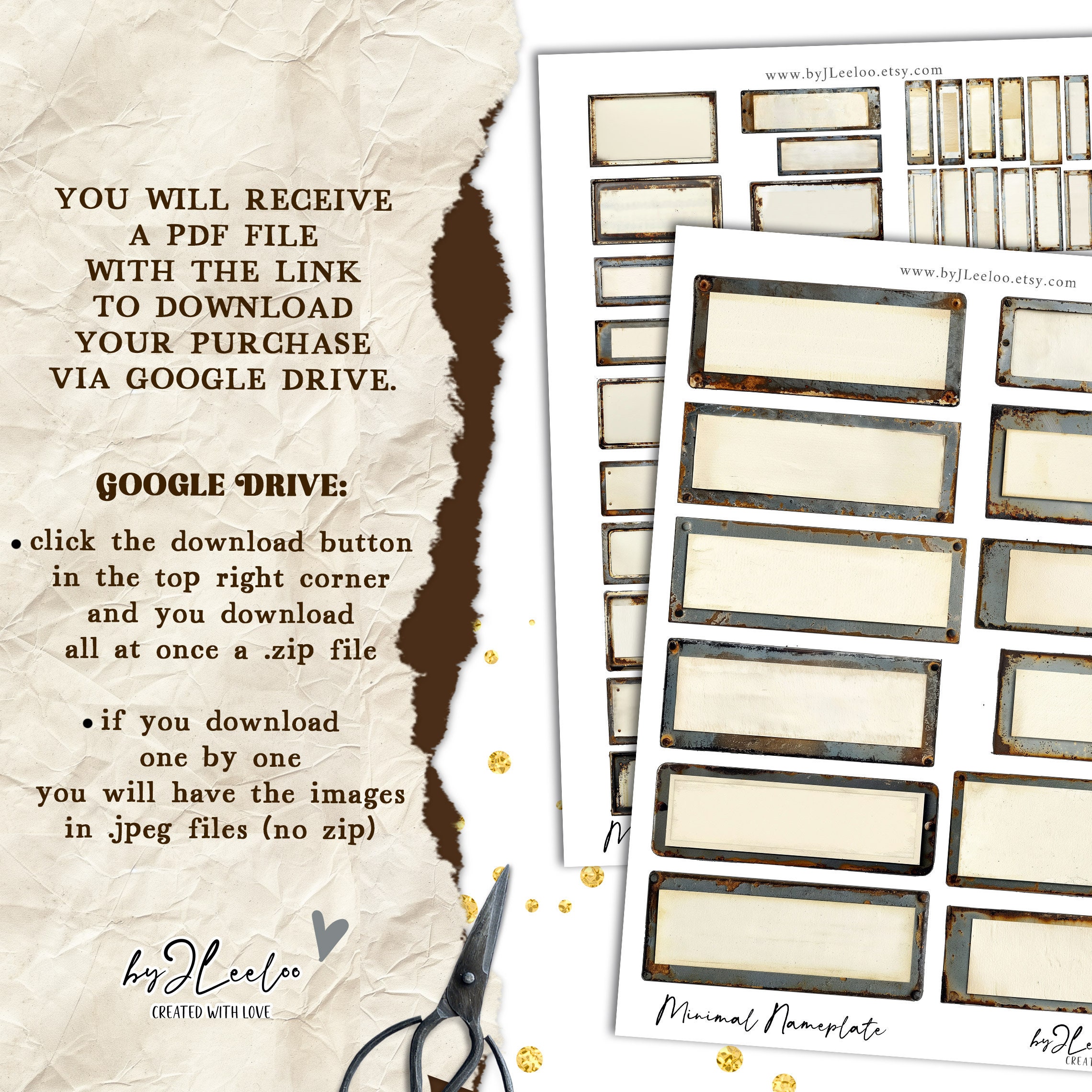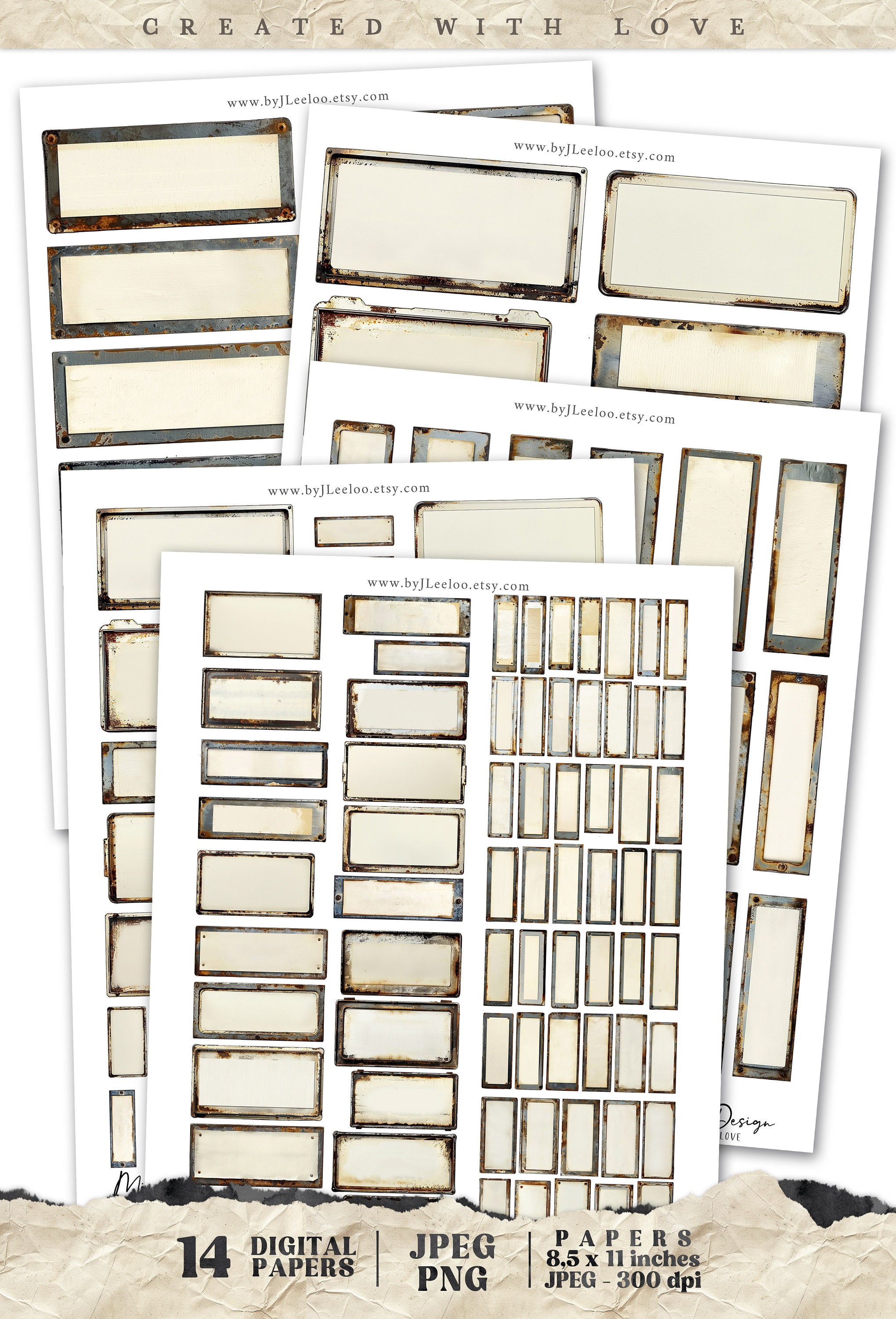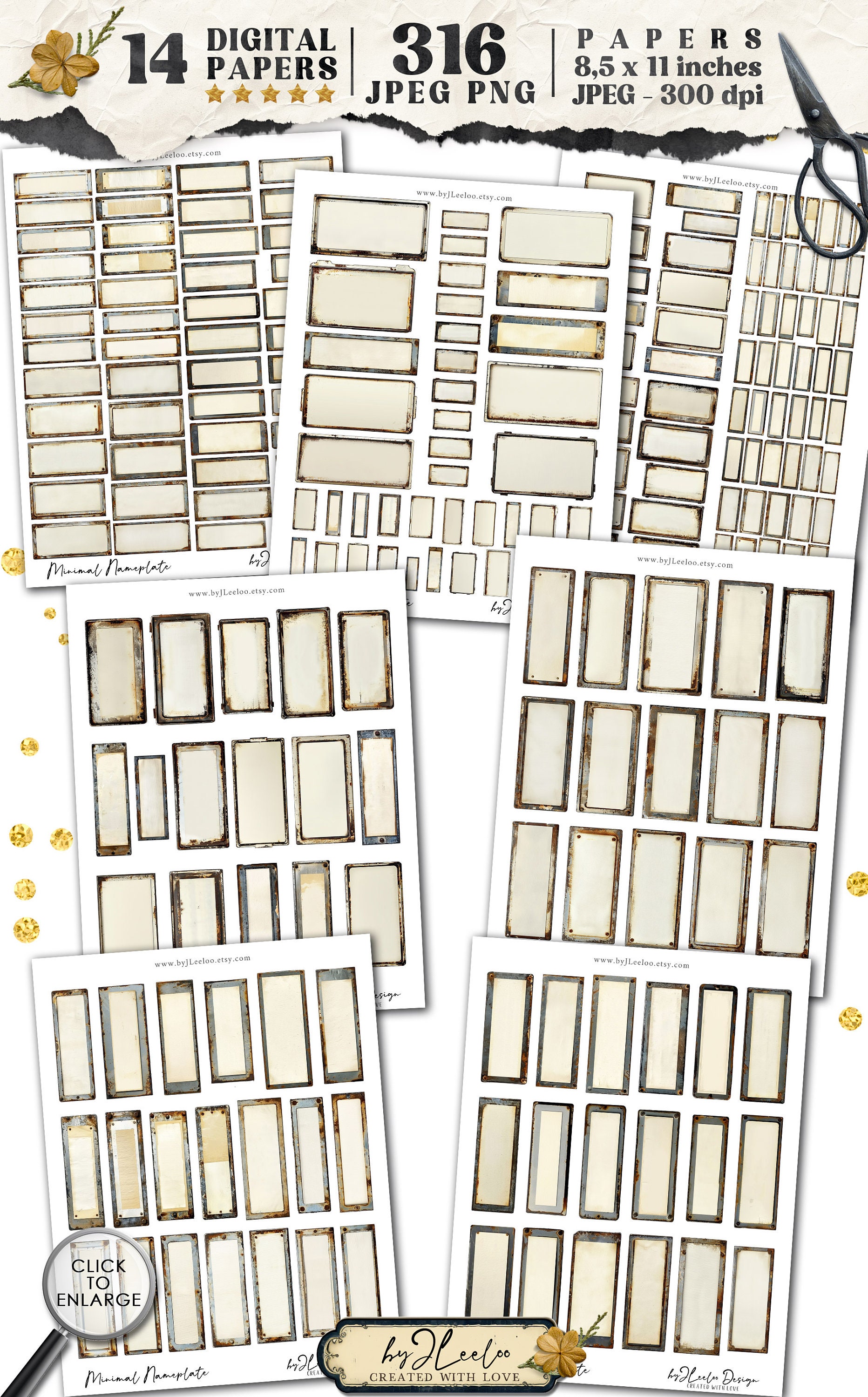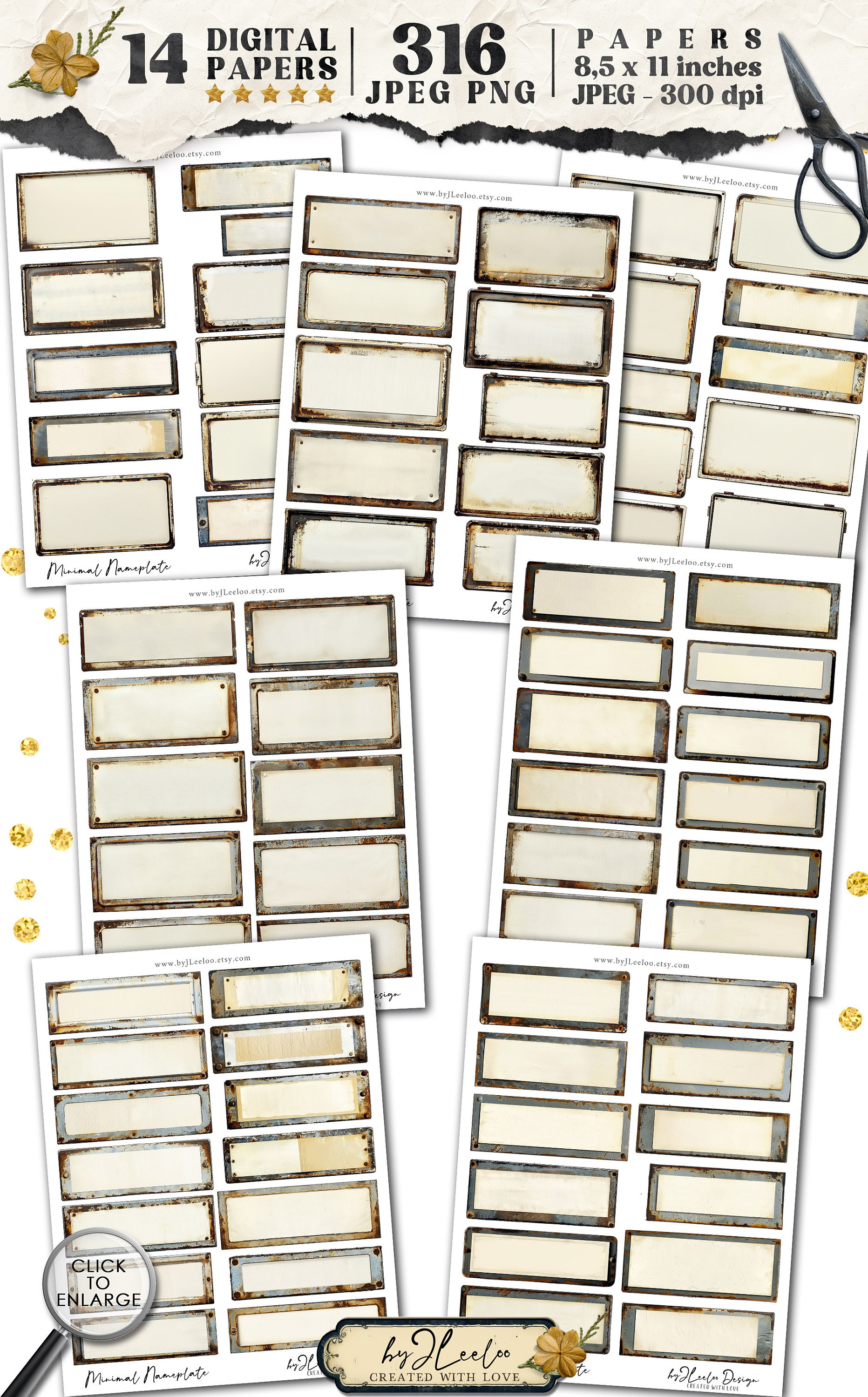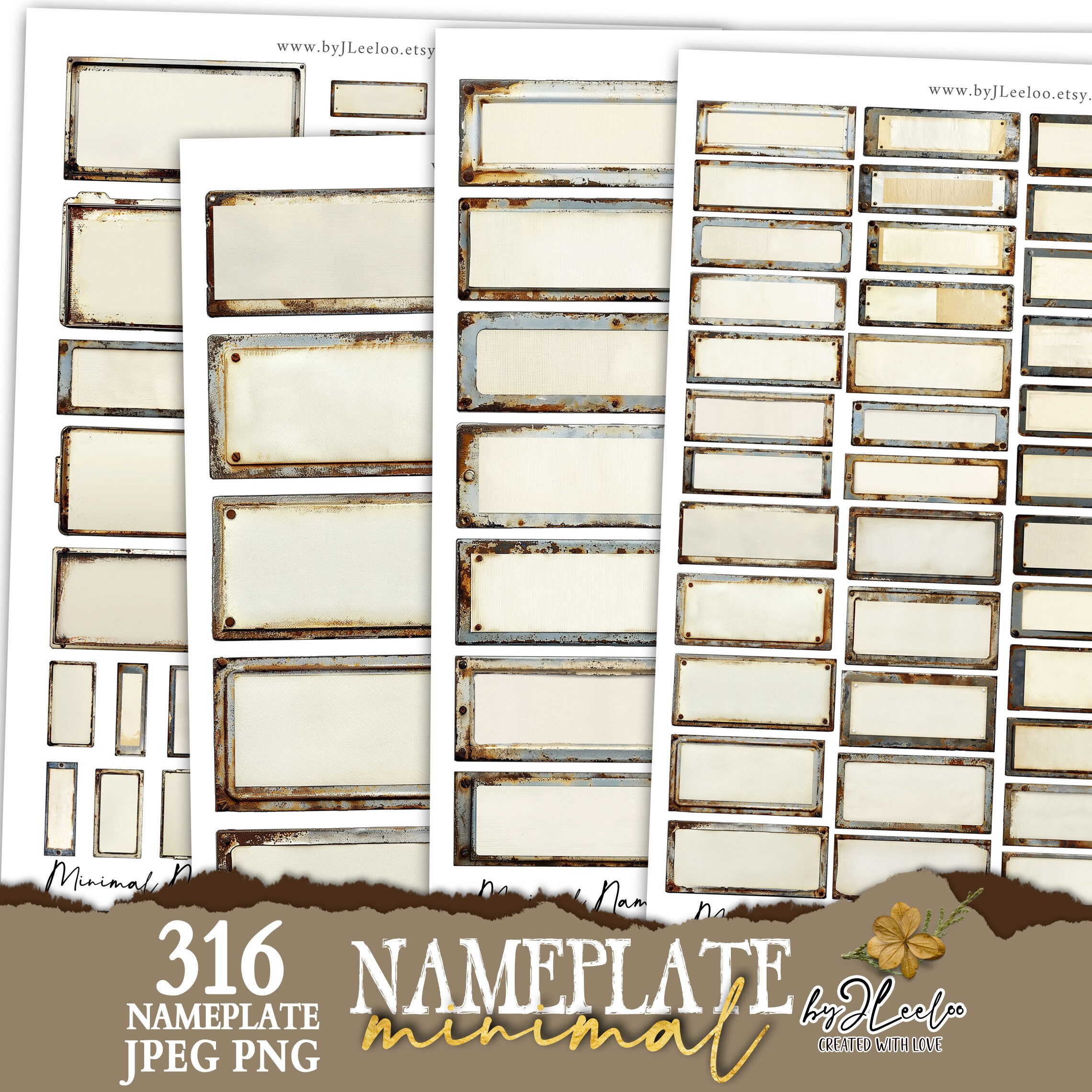 ๐ Great and beautiful packages with plenty of nameplates! All wonderfully weathered, rusty, and aged. There are 79 images offered in 4 different sizes to be usable in numerous projects, down to miniatures in the smallest size, for a total of 316 images!