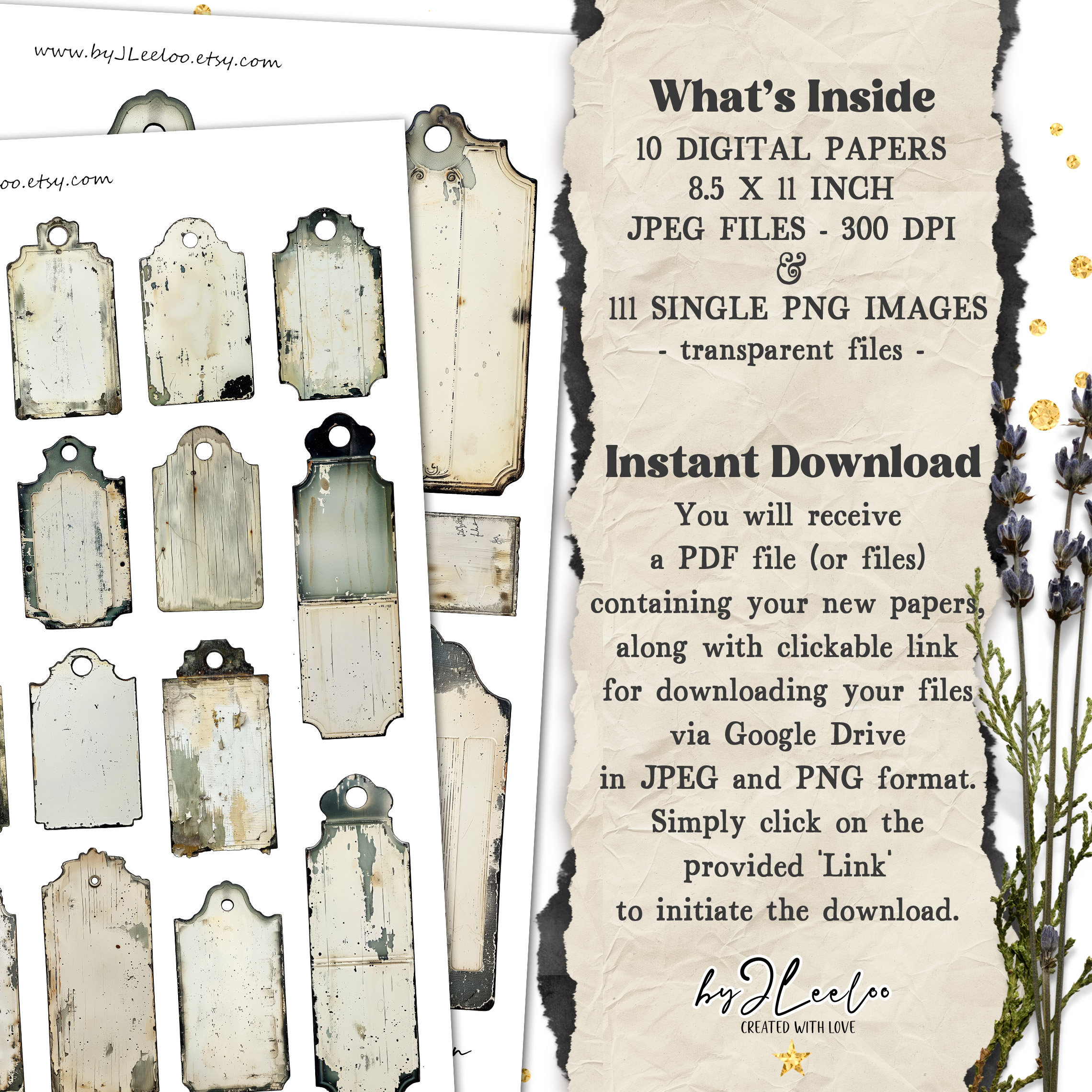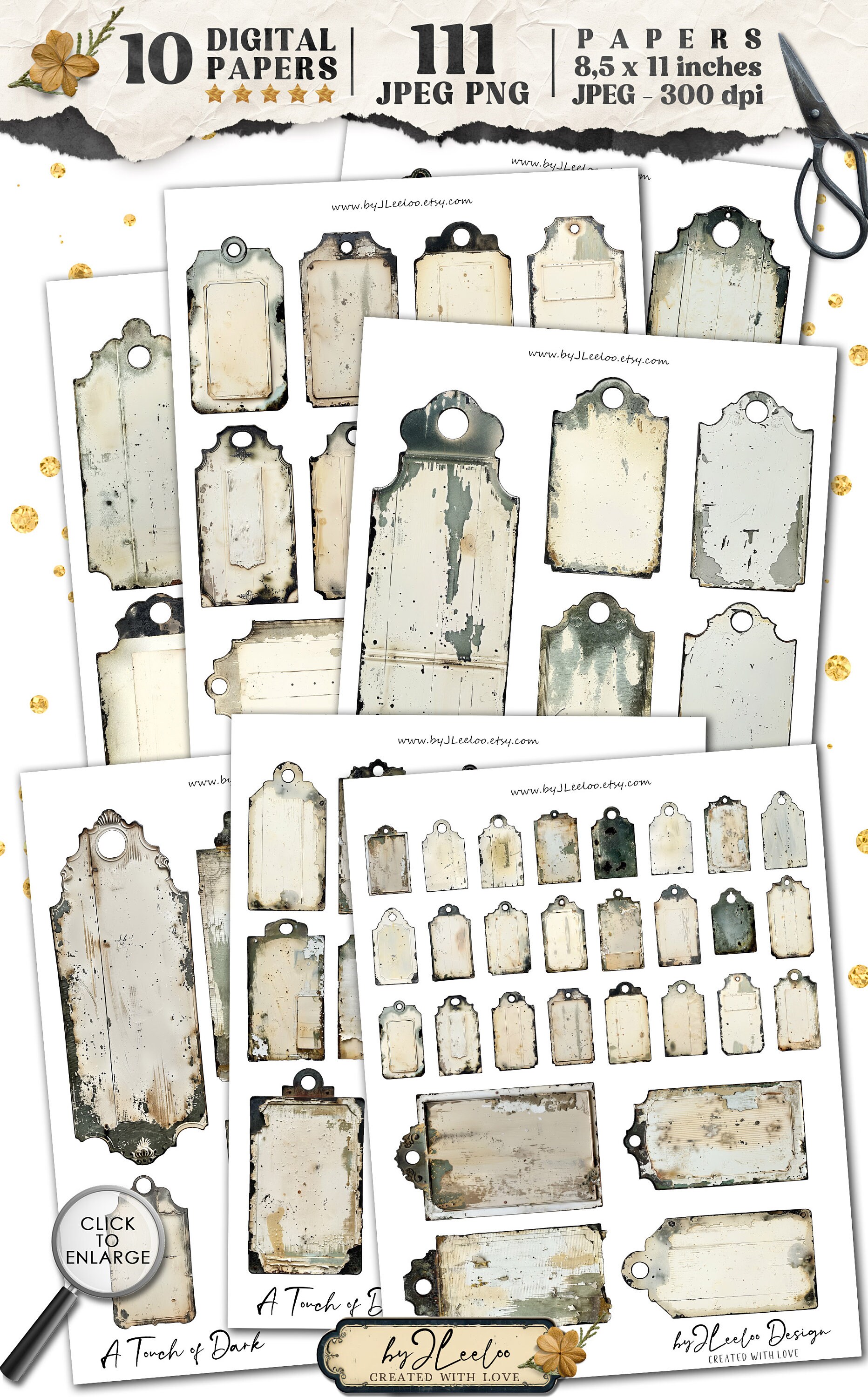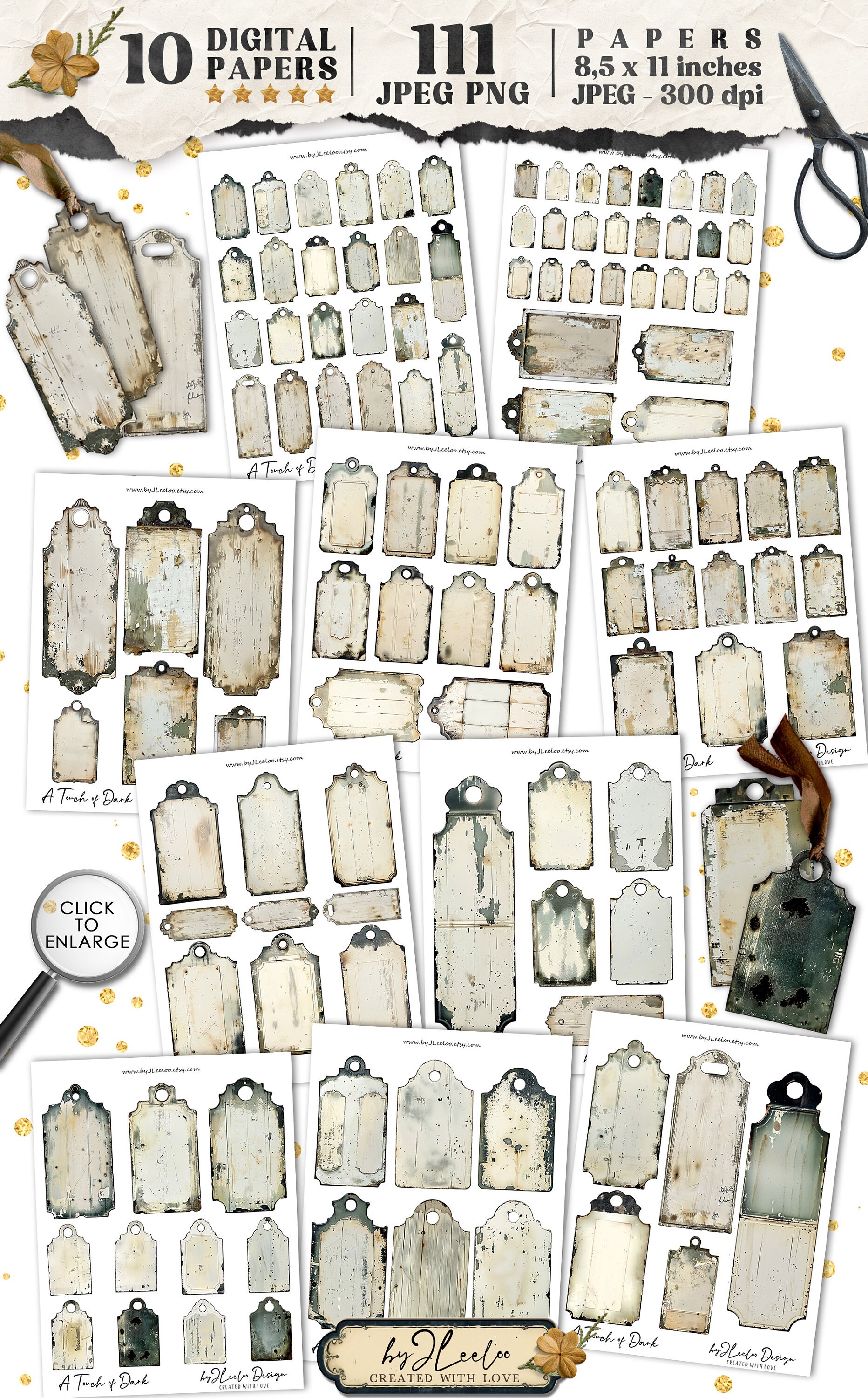 ๐ Great and beautiful packages with plenty of aged tags! All wonderfully weathered and aged. There are 110 images, wow! offered in various different sizes to be usable in numerous projects, 10 digital sheets for a total of 110 tags! Plus you'll also have all of them in single PNG format with a transparent background: great!