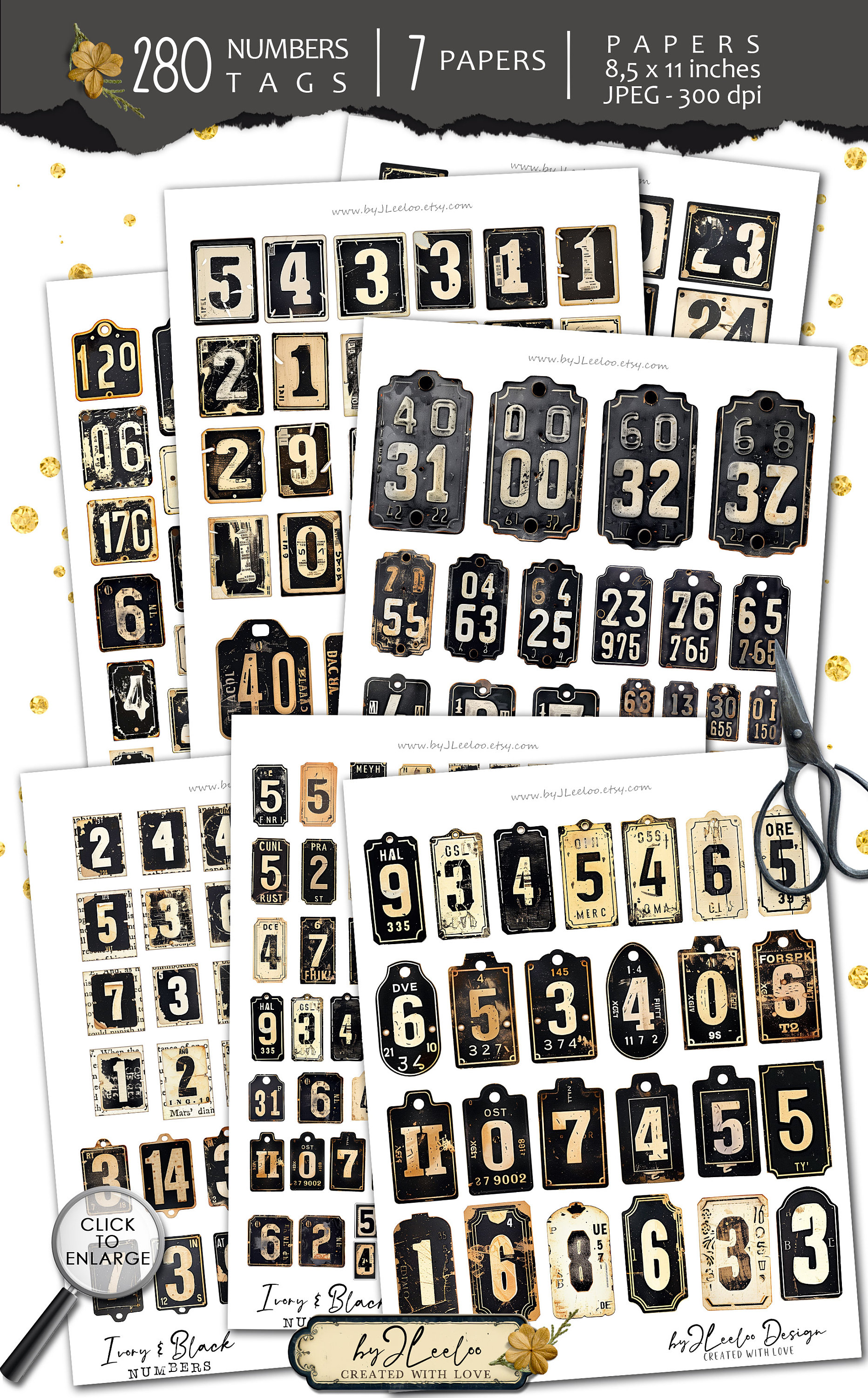 I love these small numbers of different sizes and shapes, worn and weathered, perfect for your journals, stickers, and to decorate all your paper projects!