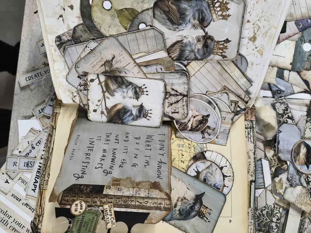 in this kit you will find bookmarks, pockets, labels, envelopes, papers and tags and much more with illustrations of romantic crowned birds. Ruined and worn damask bases give that vintage feel to your projects and journal.