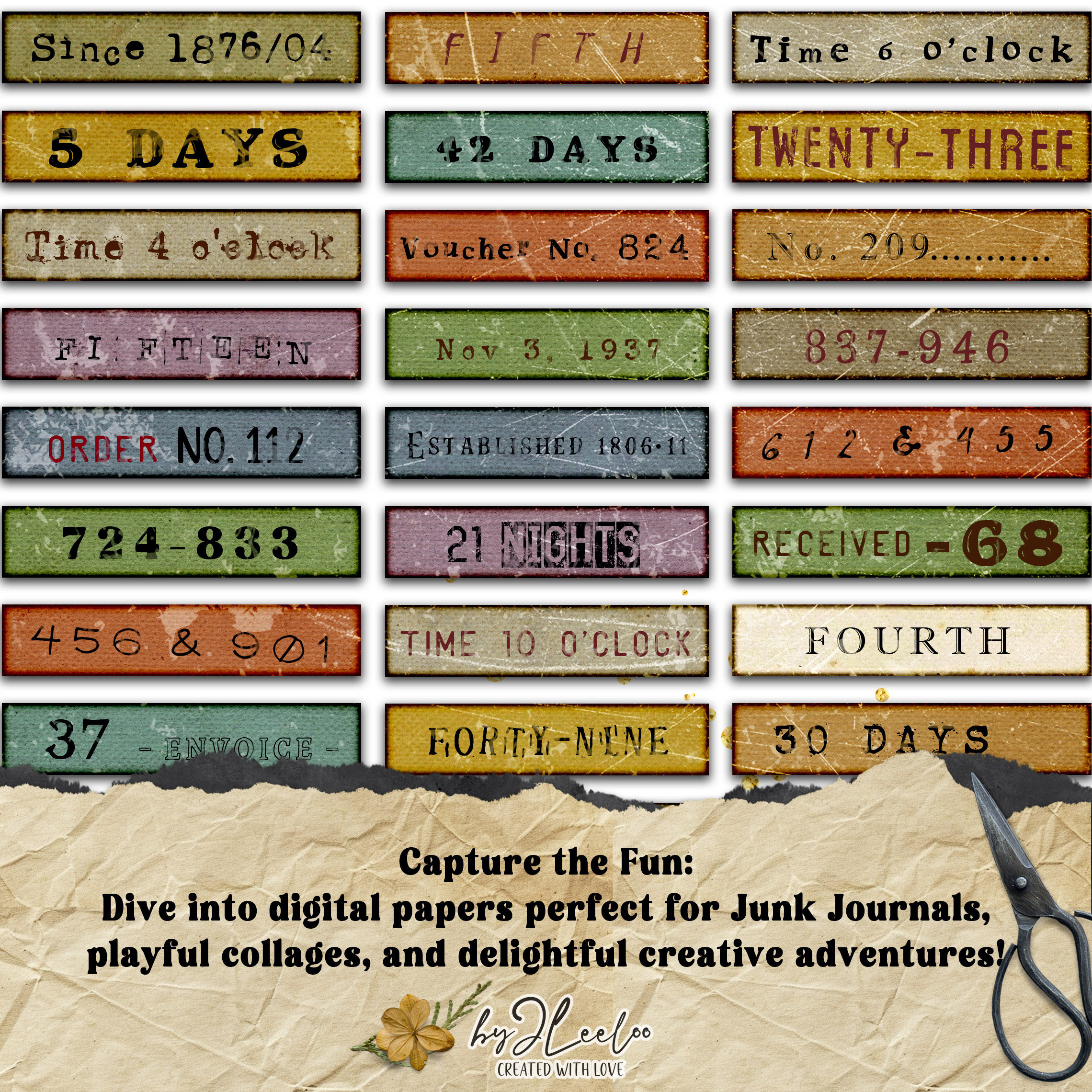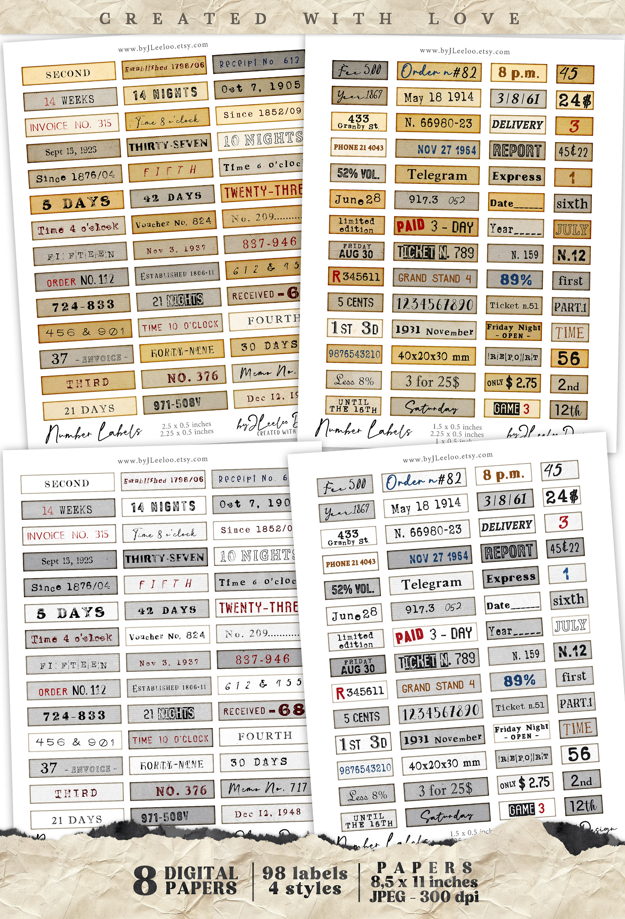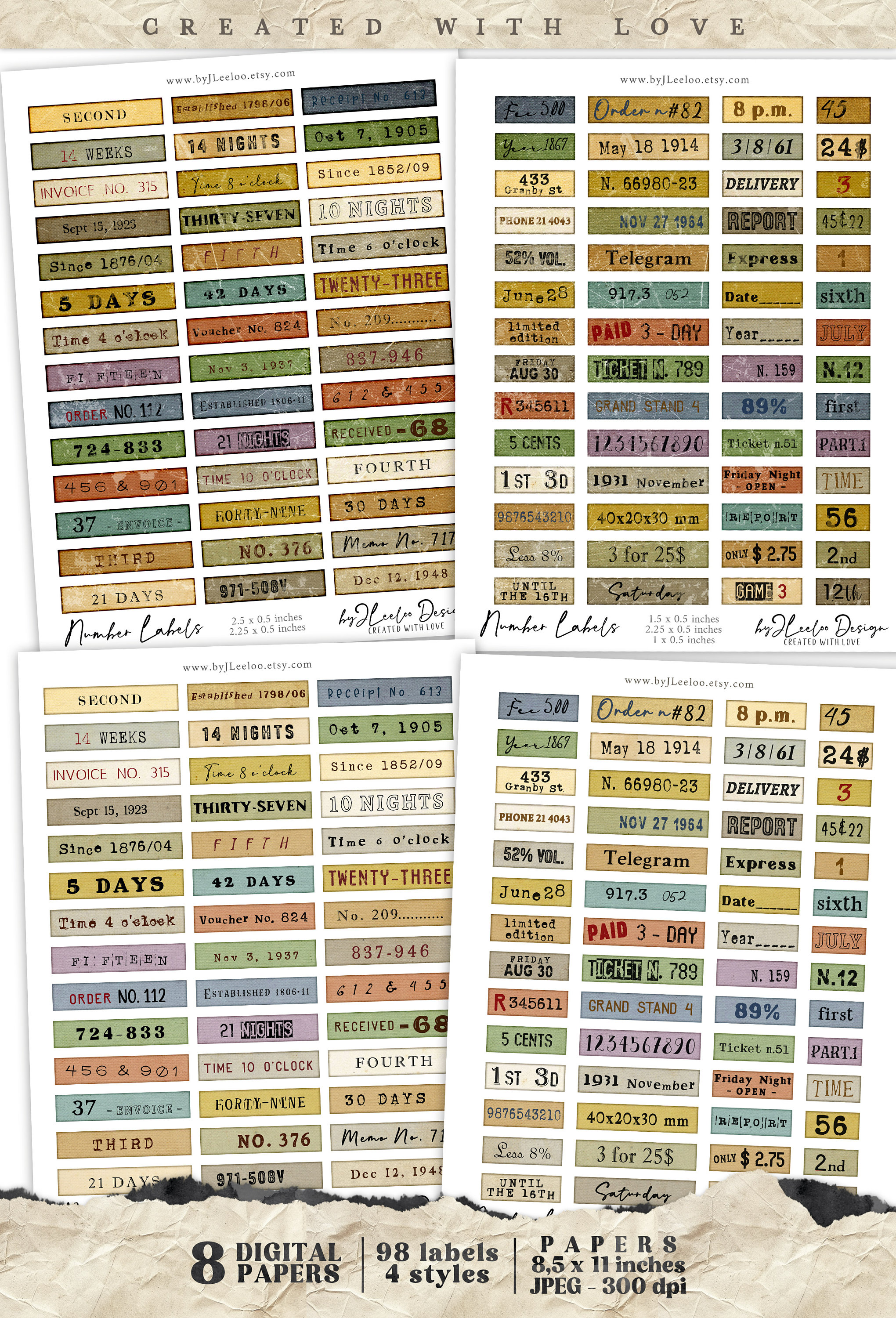 NUMBER LABELS text label printable word | grungy masculine vintage ephemera junk journal | scrapbook diary instant download | tl292