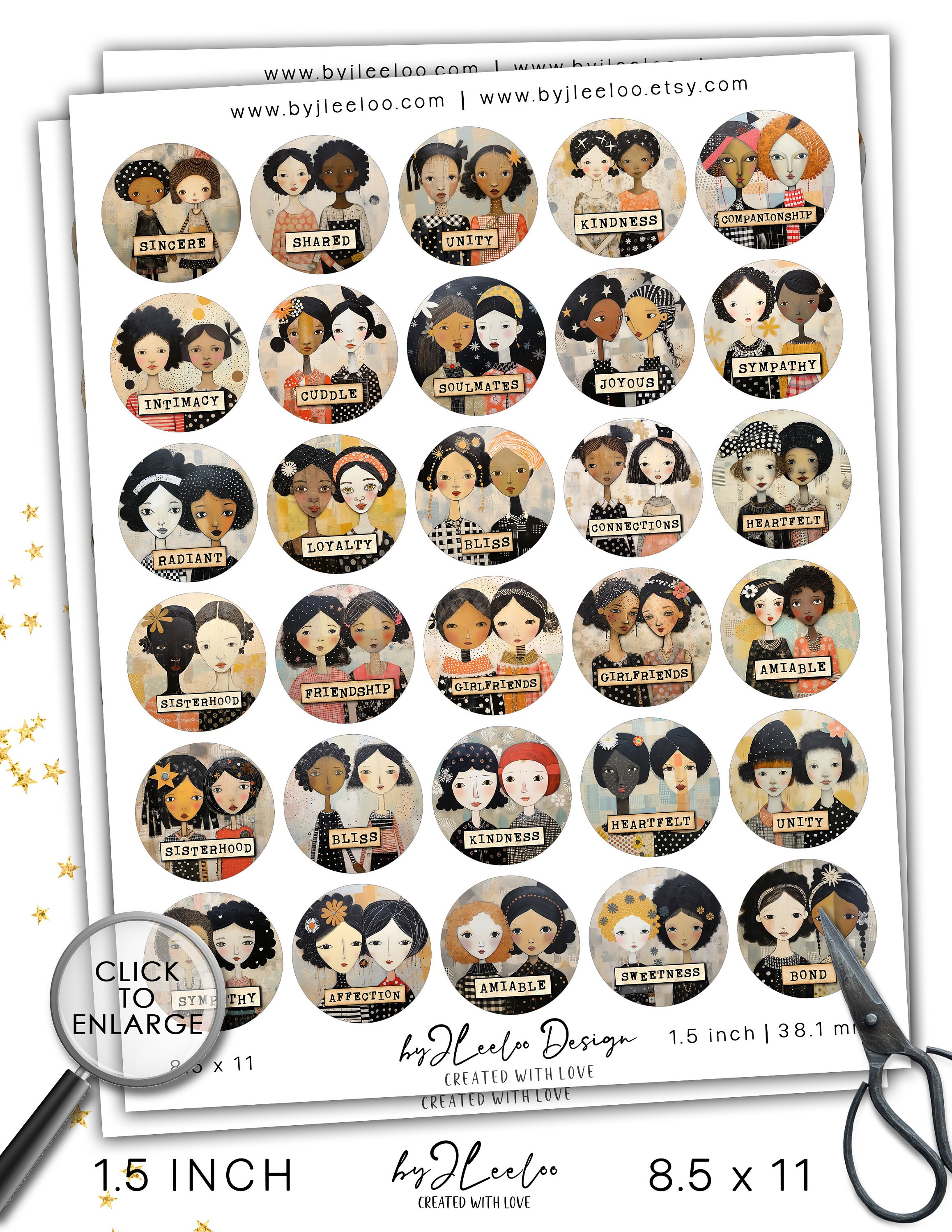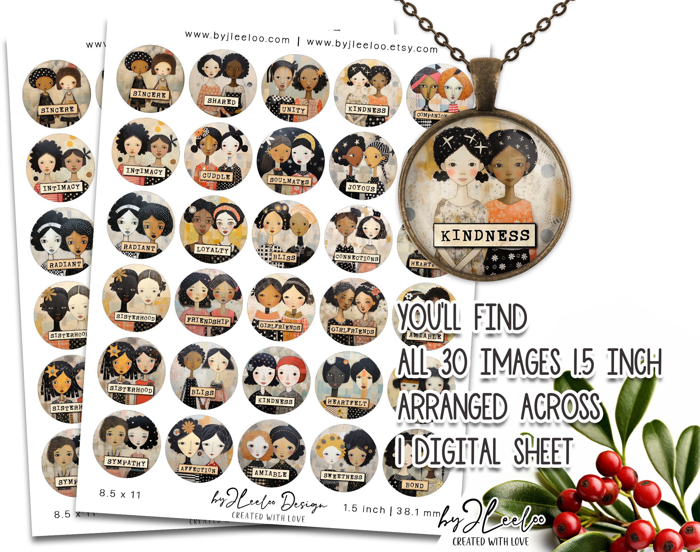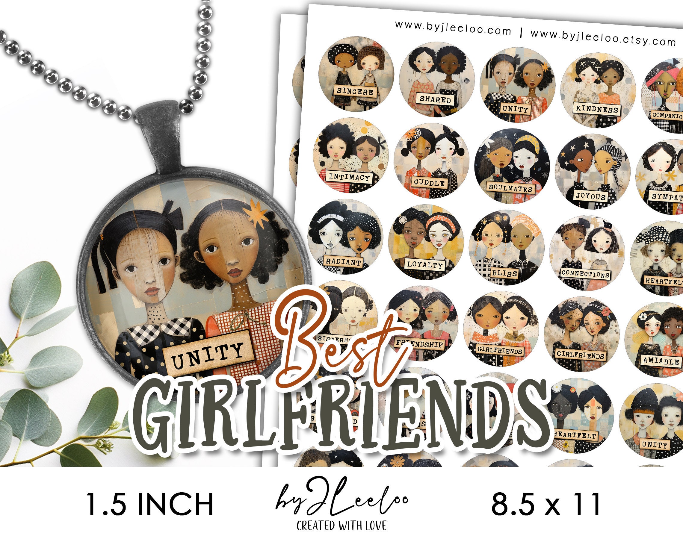 BEST GIRLFRIENDS 1.5 inch printable illustration | Gift for friend supplies round pendants sticker charm mirror magnet altered art | tn803