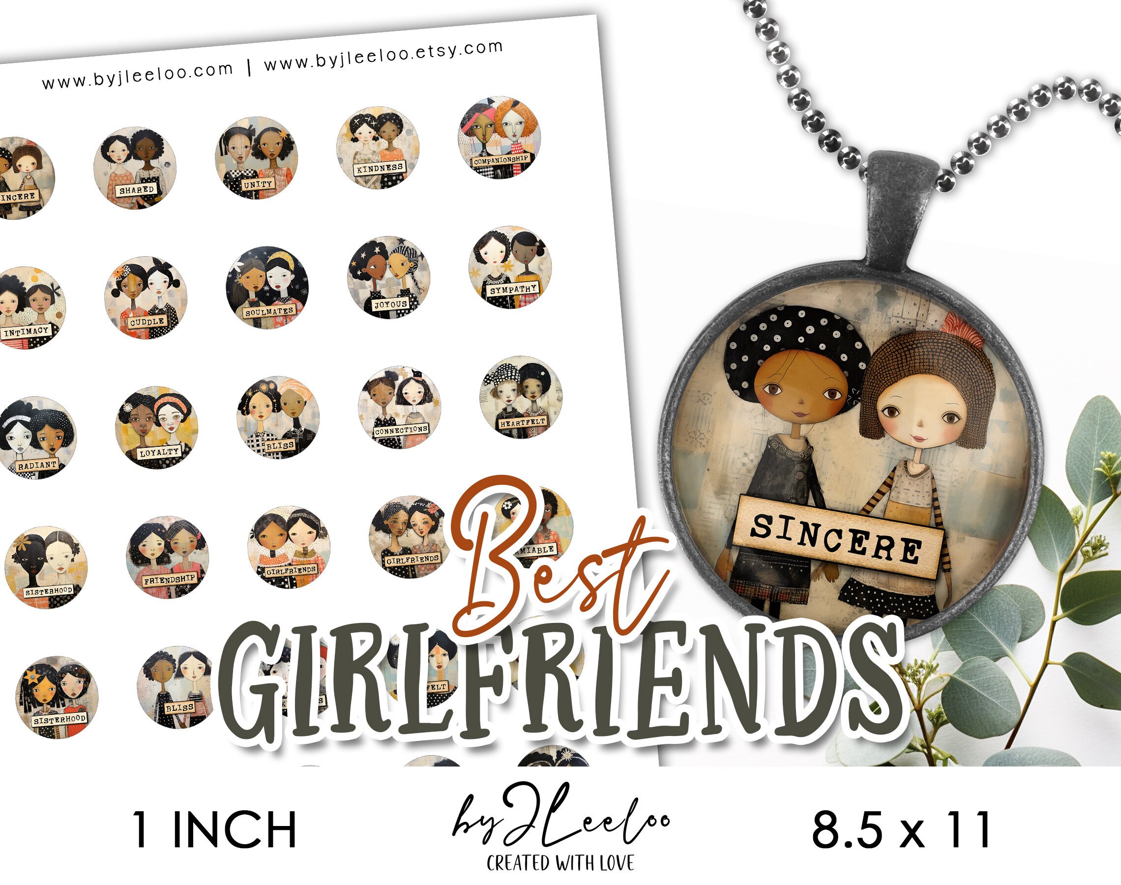 BEST GIRLFRIENDS 1 inch printable | whimsy supplies round pendants sticker pin cabochon jewelry | fussy cut friedship whimsical art | tn802