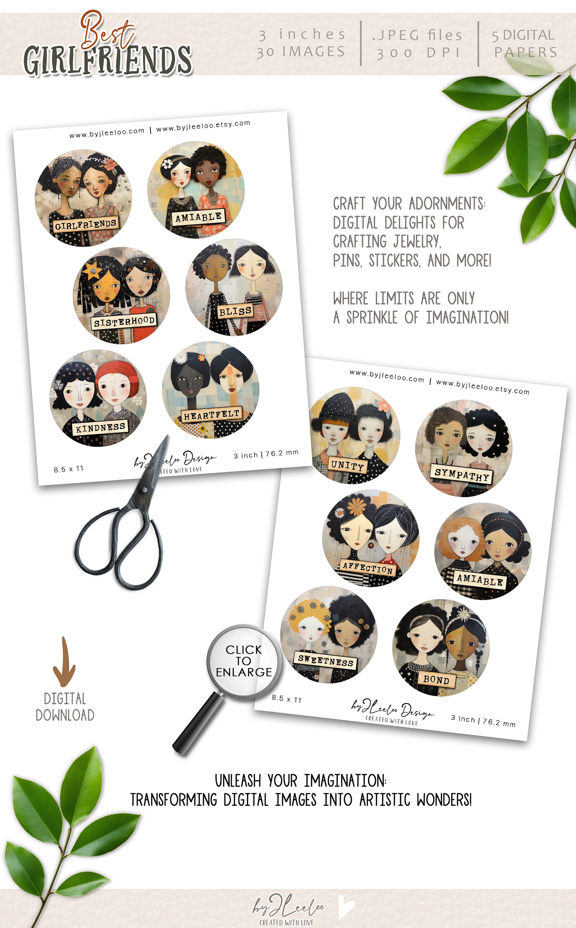 BEST GIRLFRIENDS 3 inch printable | Gift for girl supplies round pins mirror glass cabochon mountings necklace DiY embellishment | tn806
