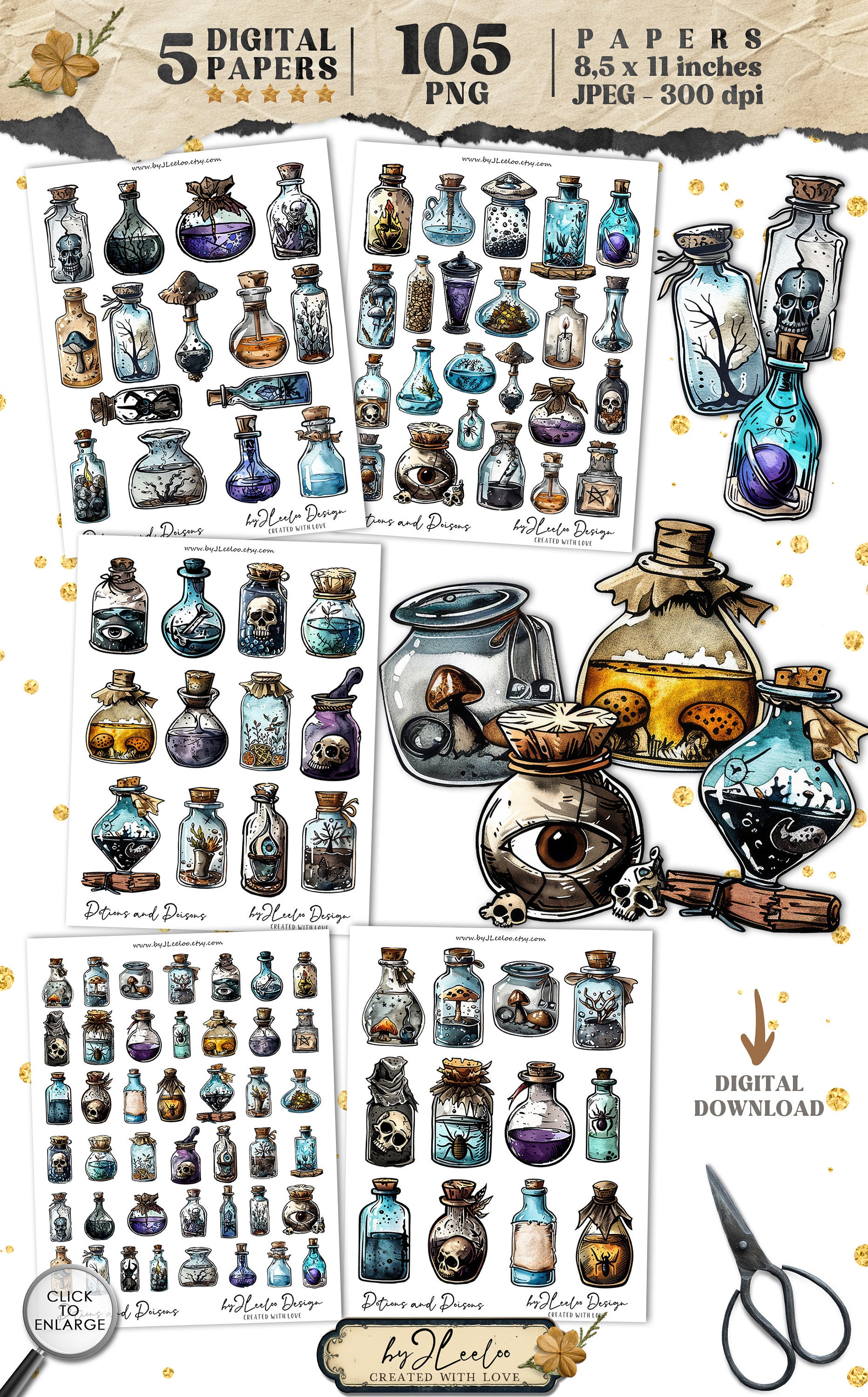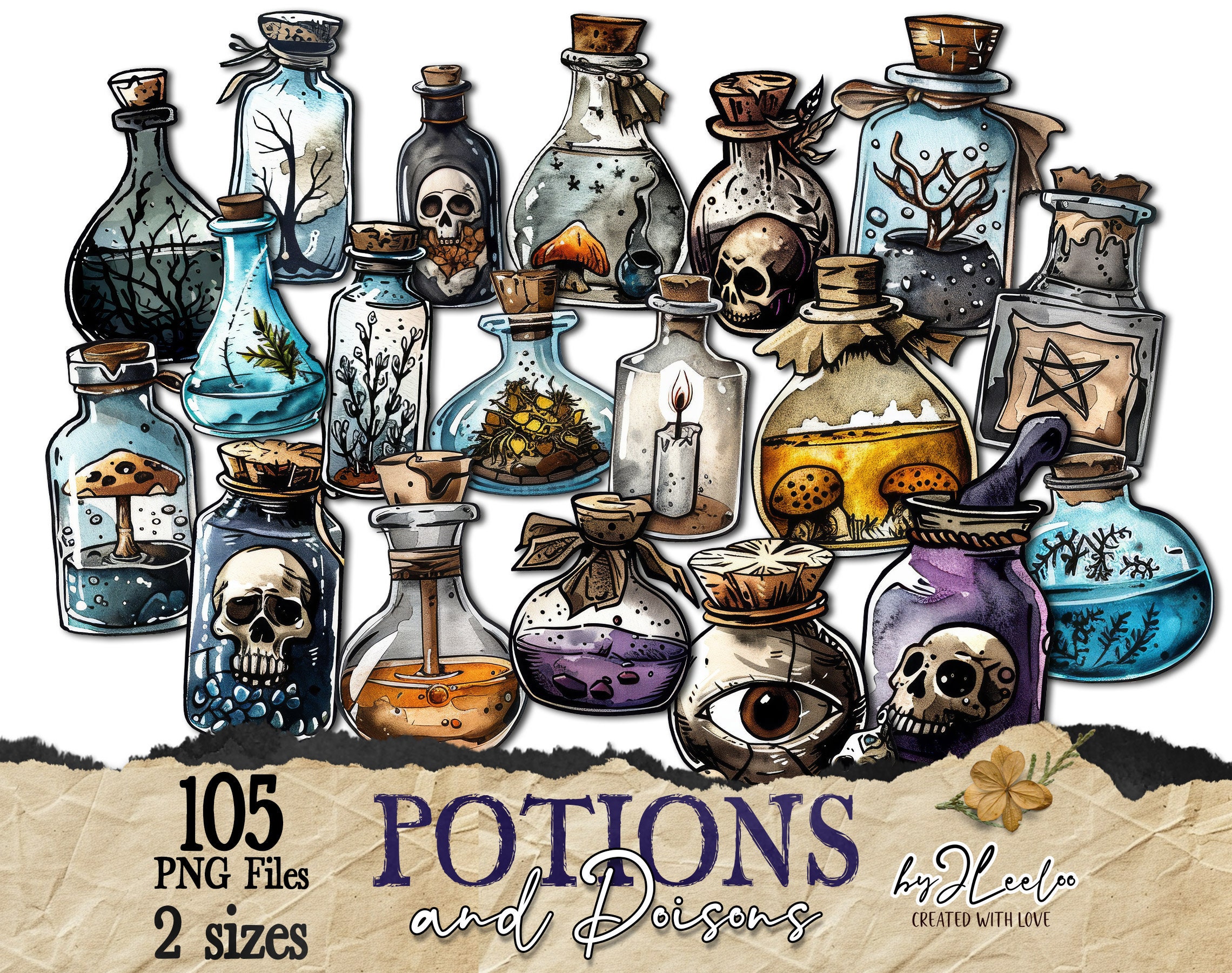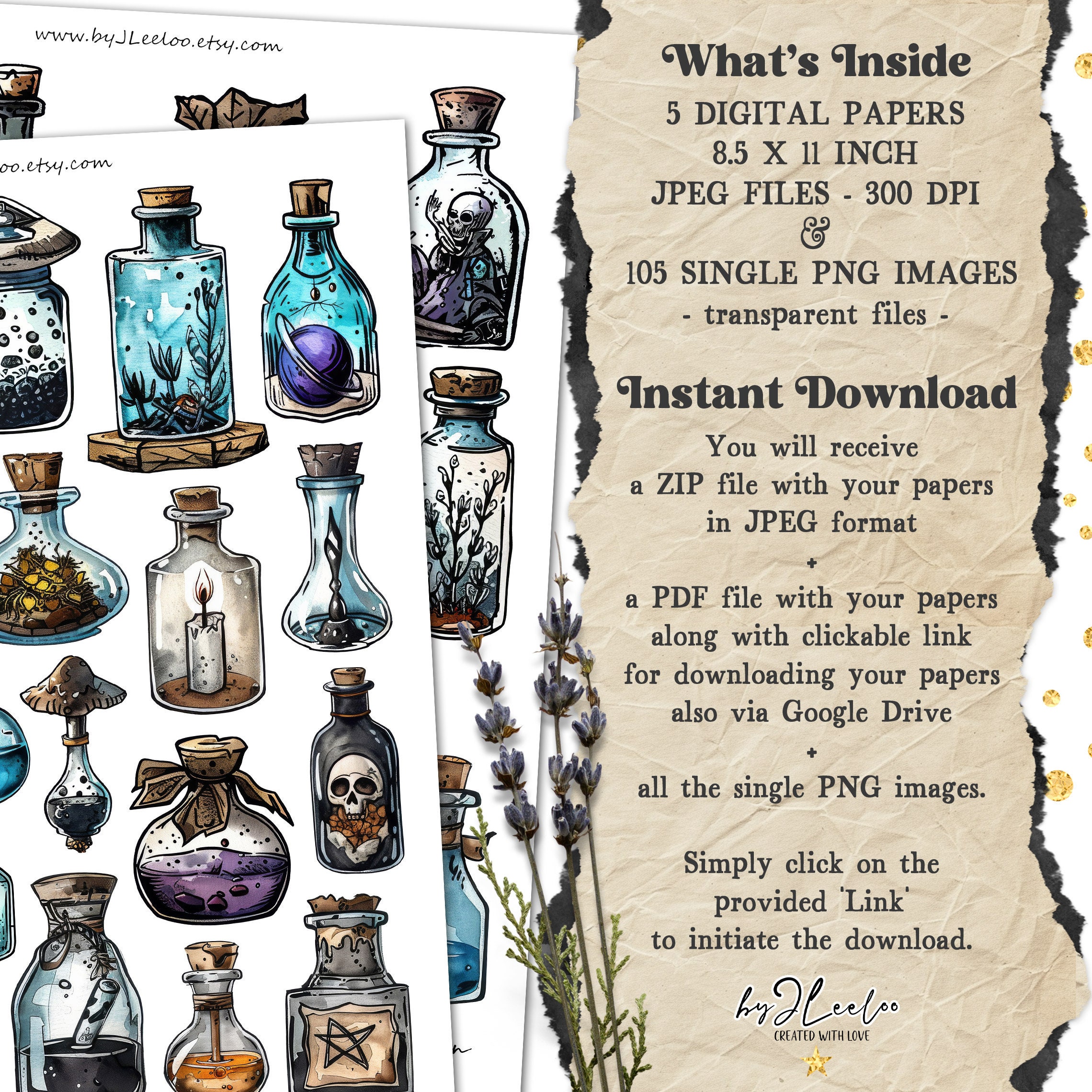 POTIONS and POISONS sticker clipart vintage supplies | PNG fussy cuts grungy printable junk journal | Halloween digital decoration | cl172