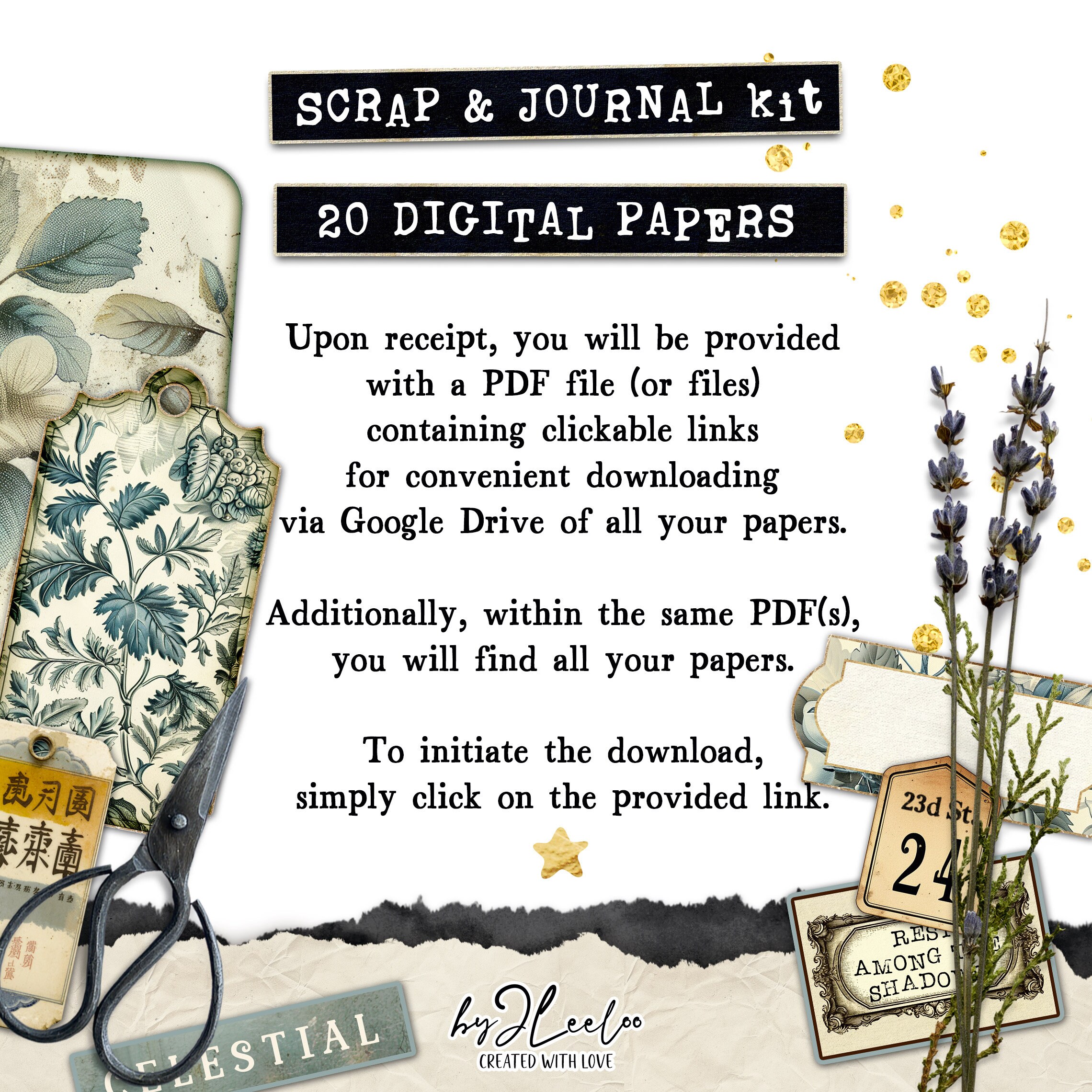 in this kit you will find bookmarks, pockets, labels, envelopes, papers and tags and much more with illustrations to romantic botanical junk journal with a vintage feel!