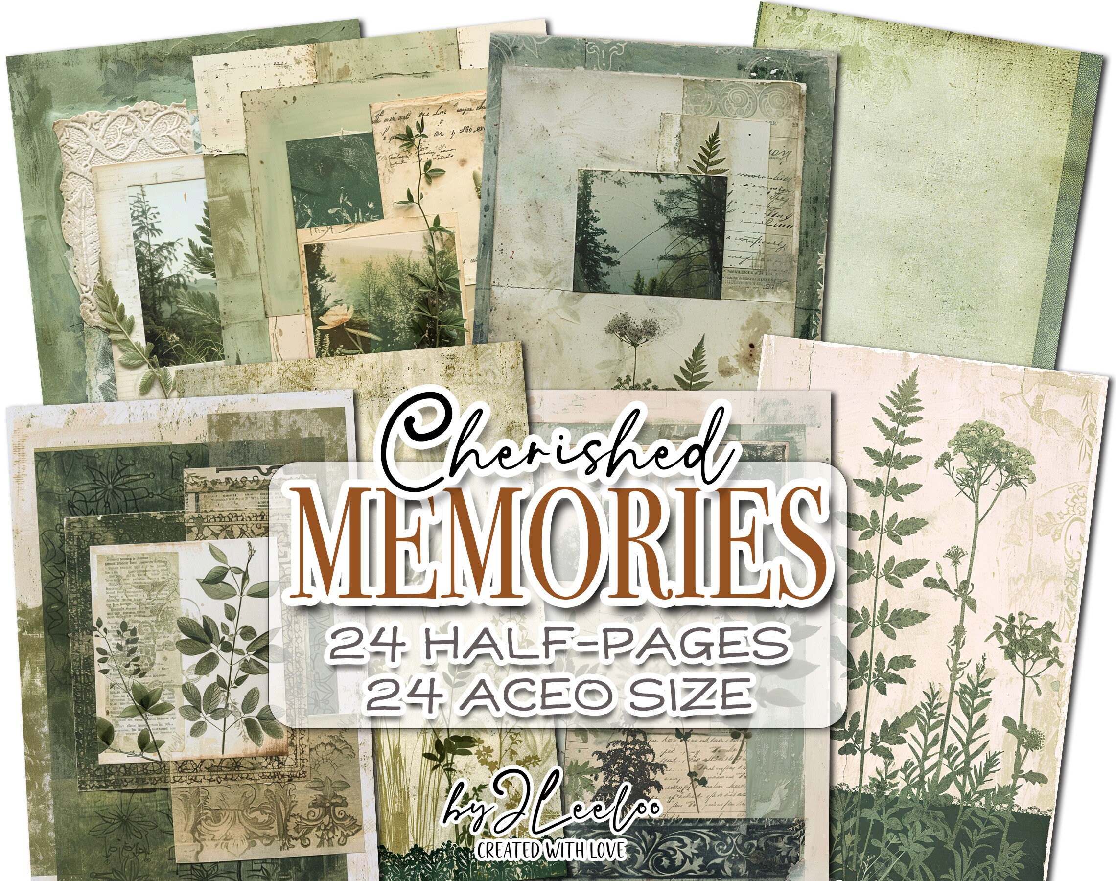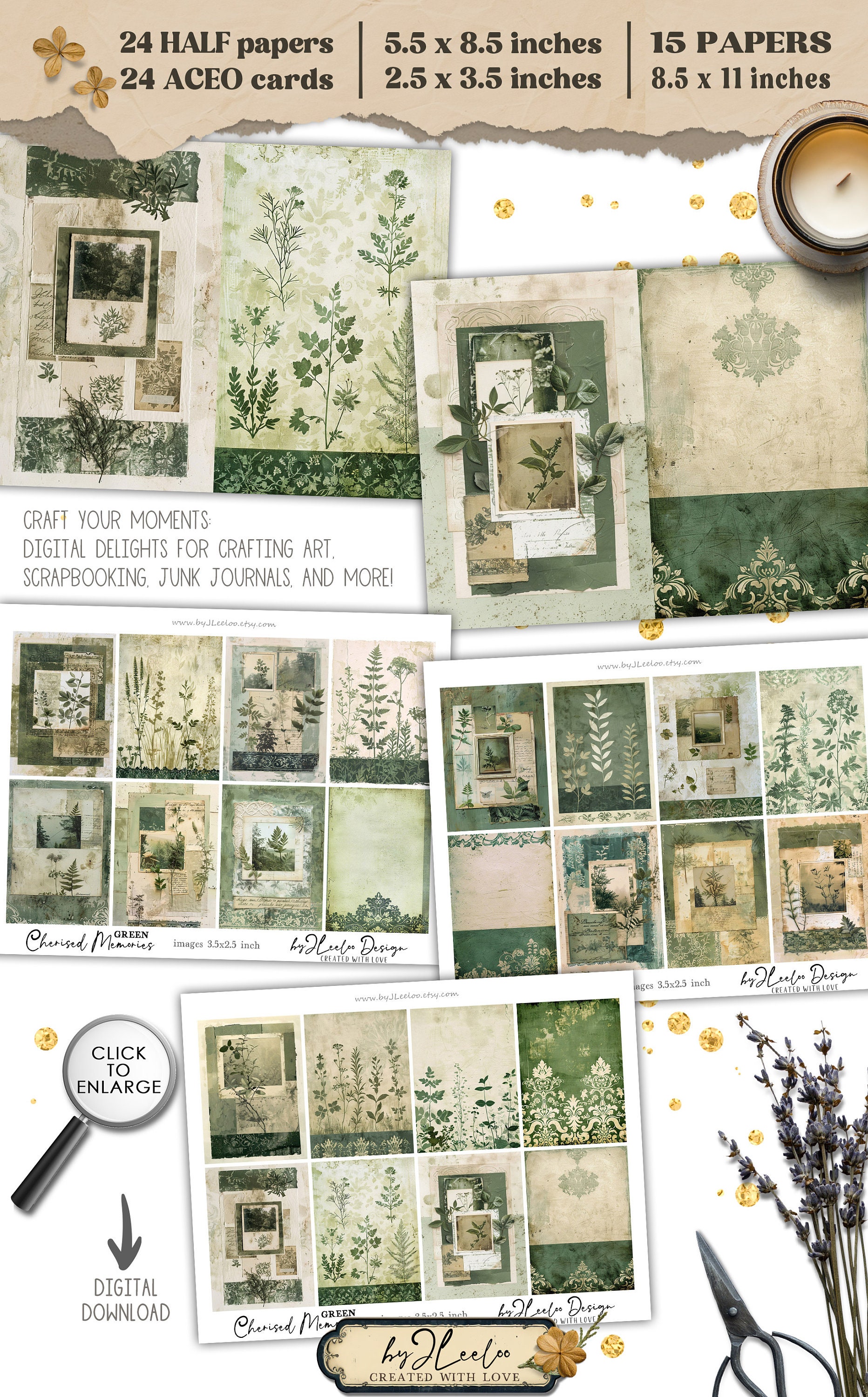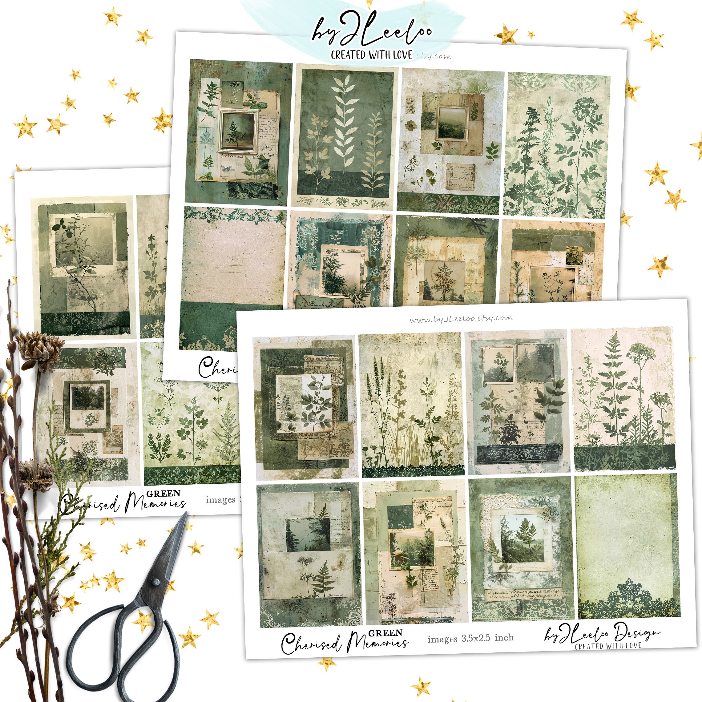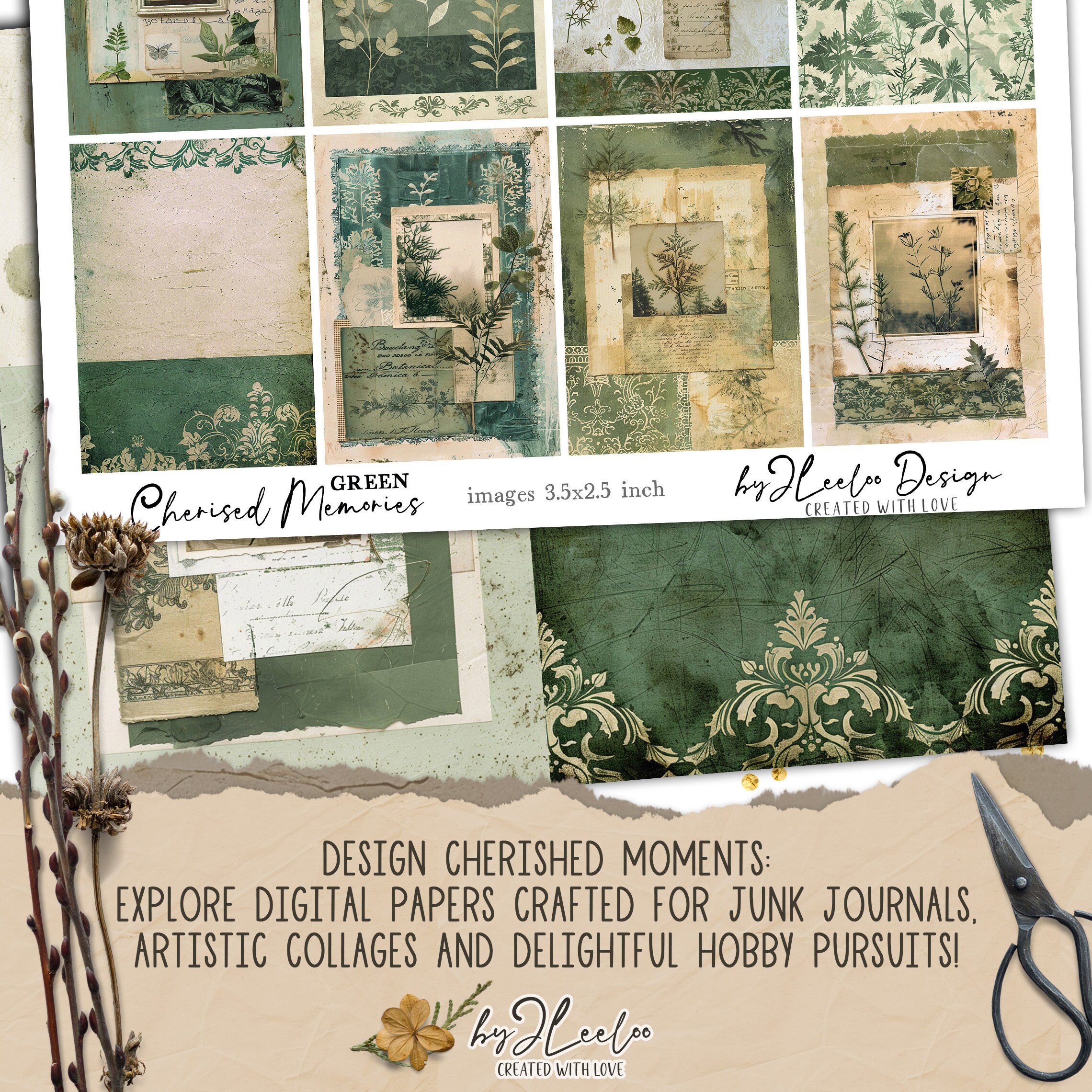 CHERISHED MEMORIES GREEN half pages botanical printable | Atc Garden junk journal vintage background | Collage style paper diary | pp806