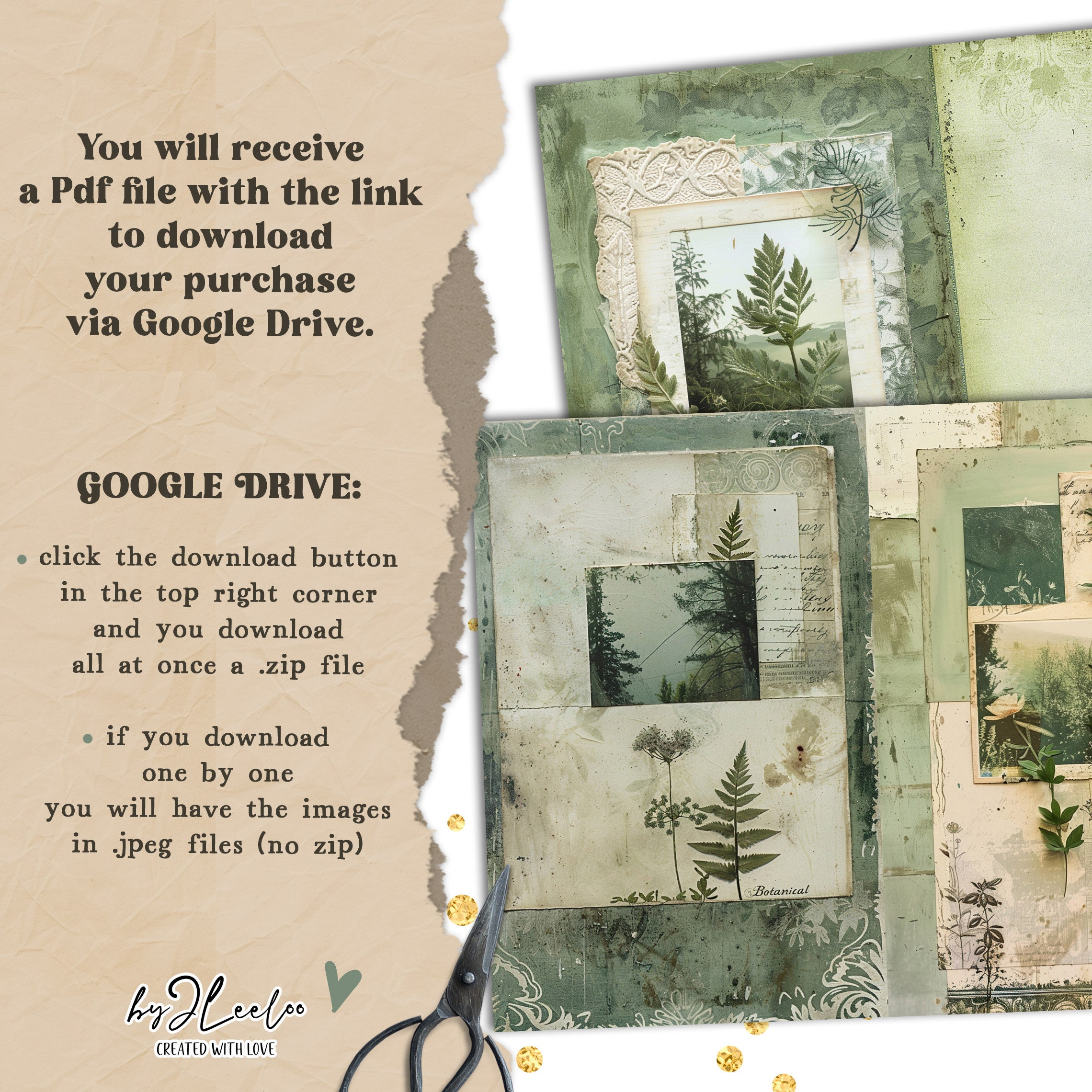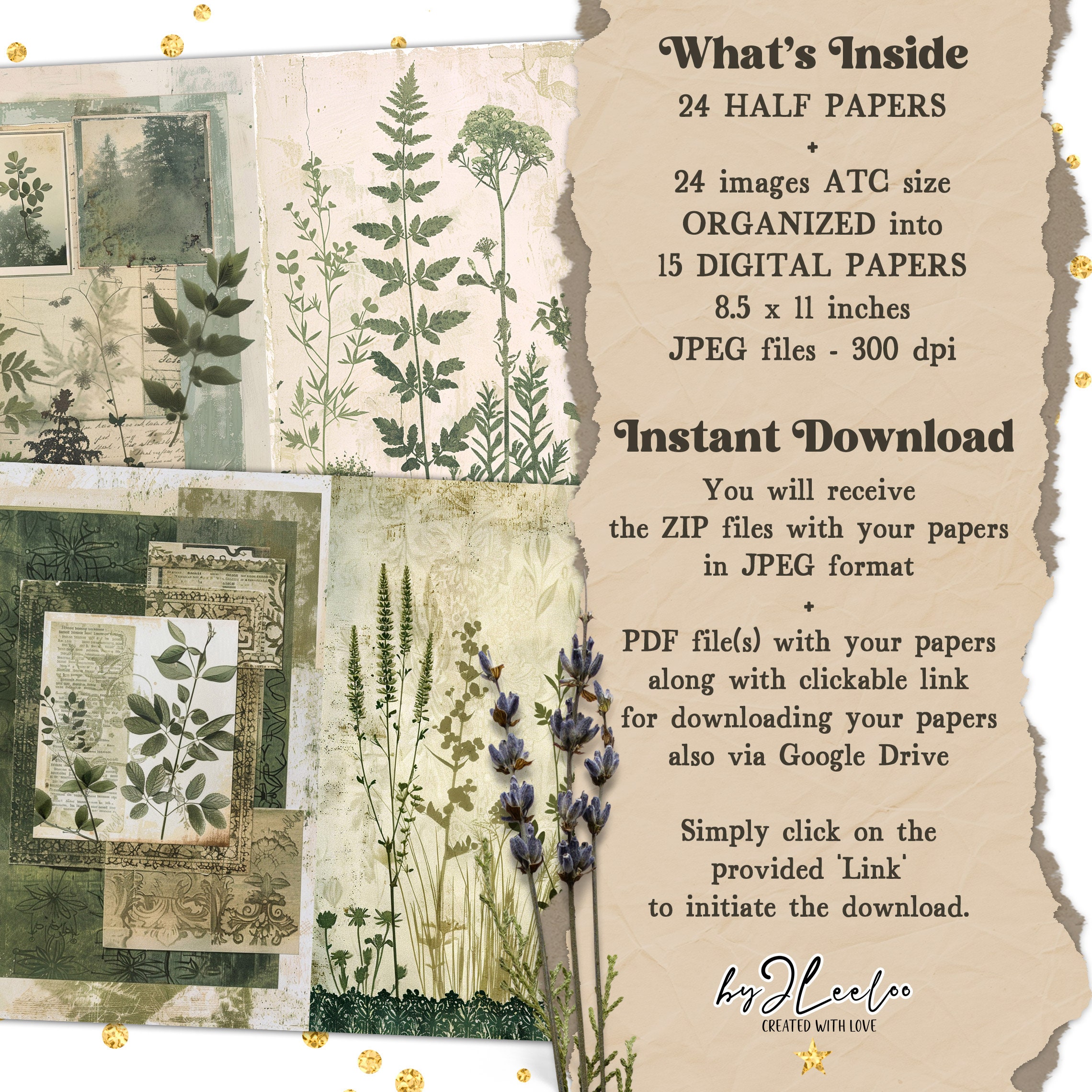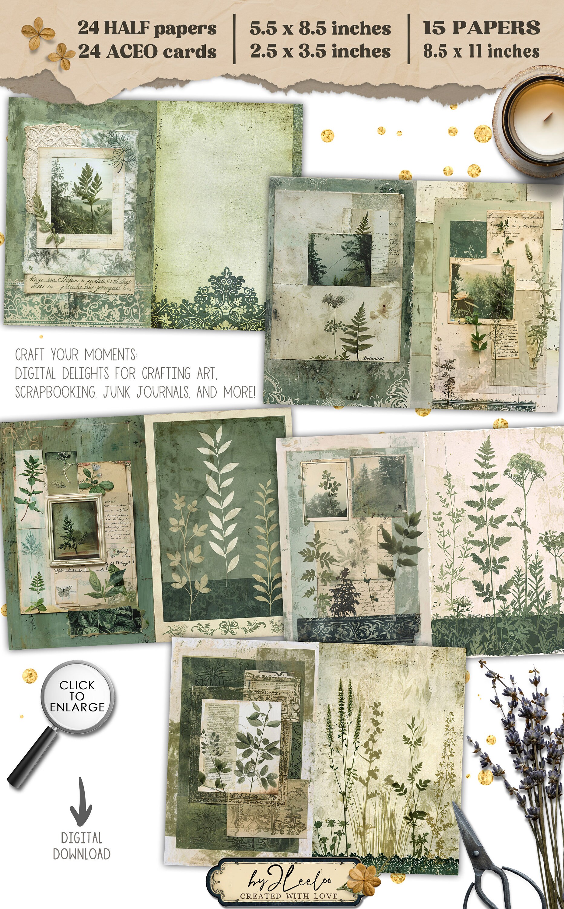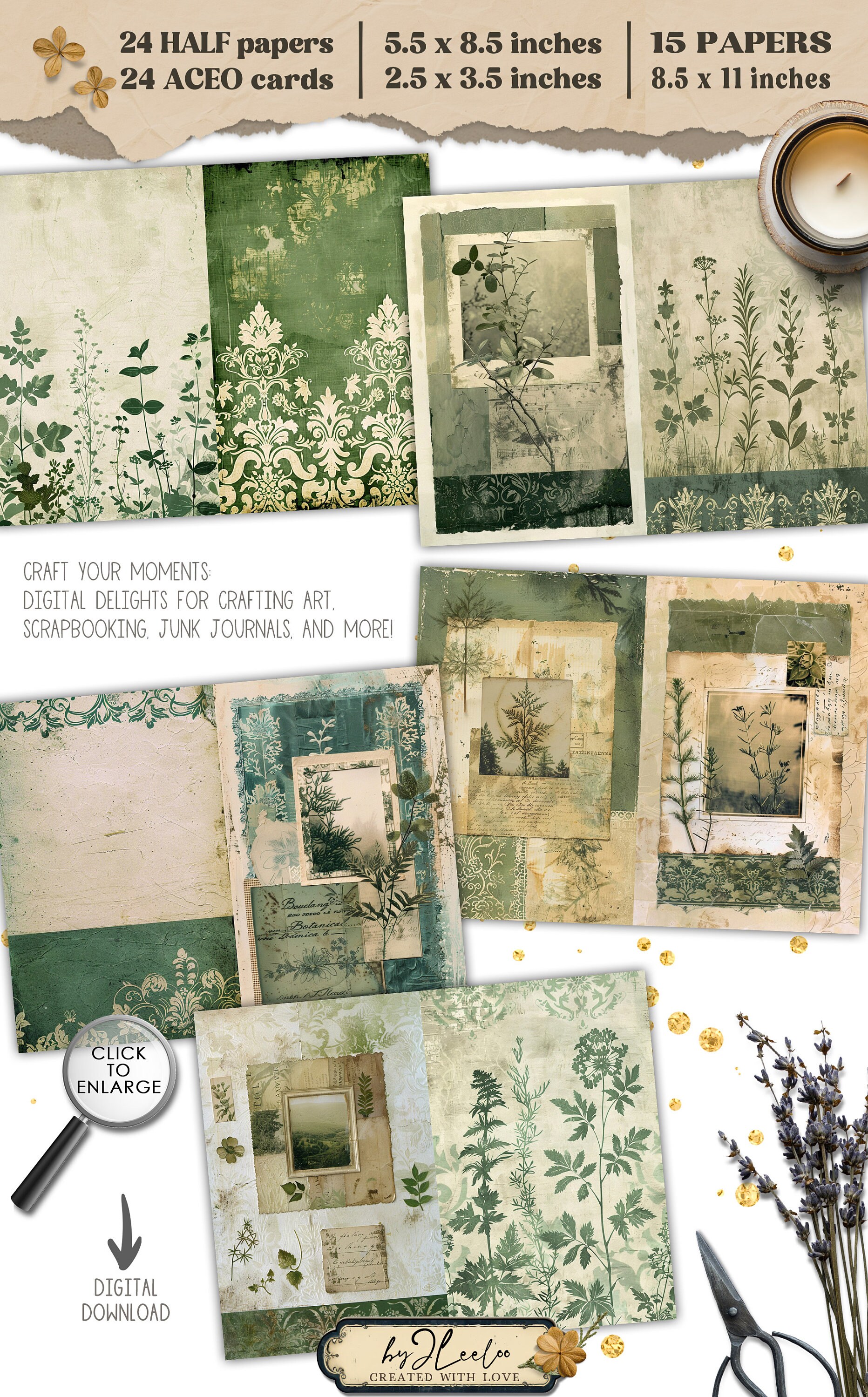 CHERISHED MEMORIES GREEN half pages botanical printable | Atc Garden junk journal vintage background | Collage style paper diary | pp806