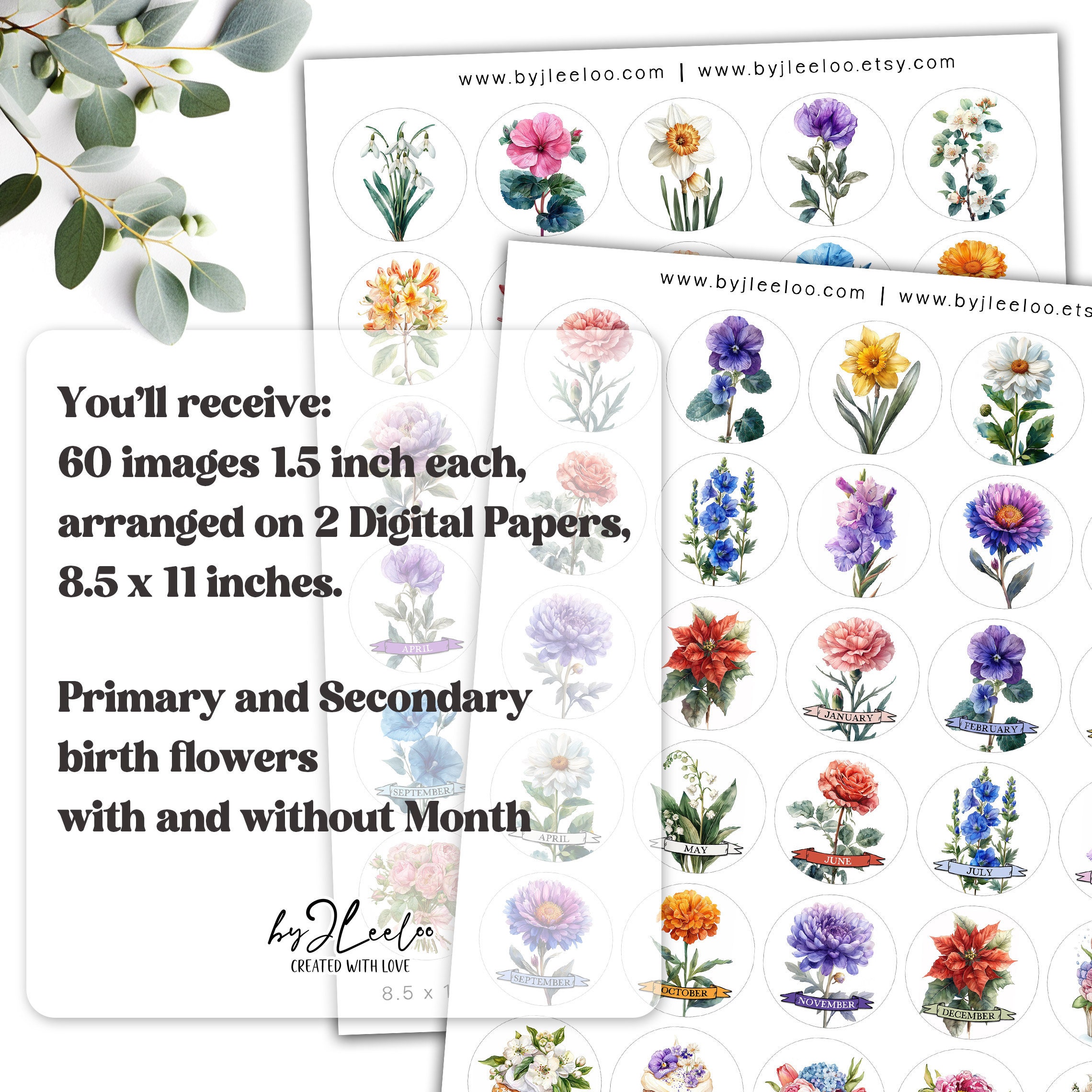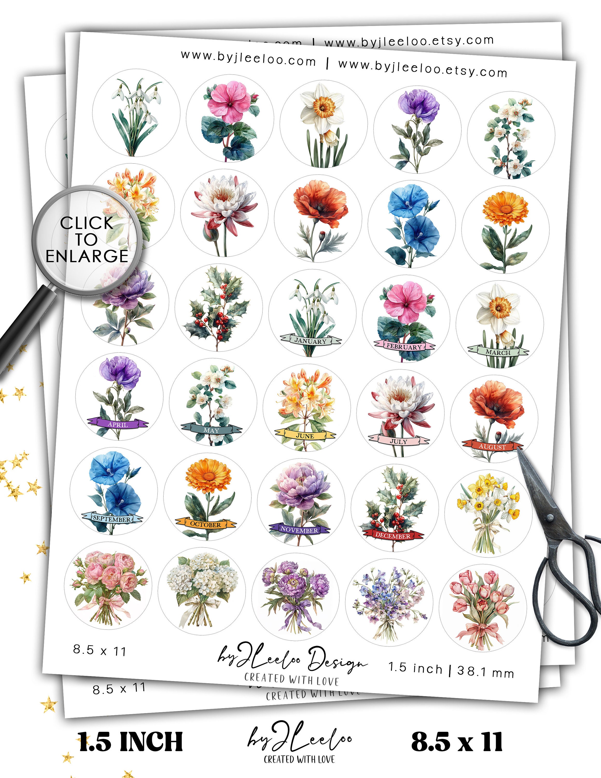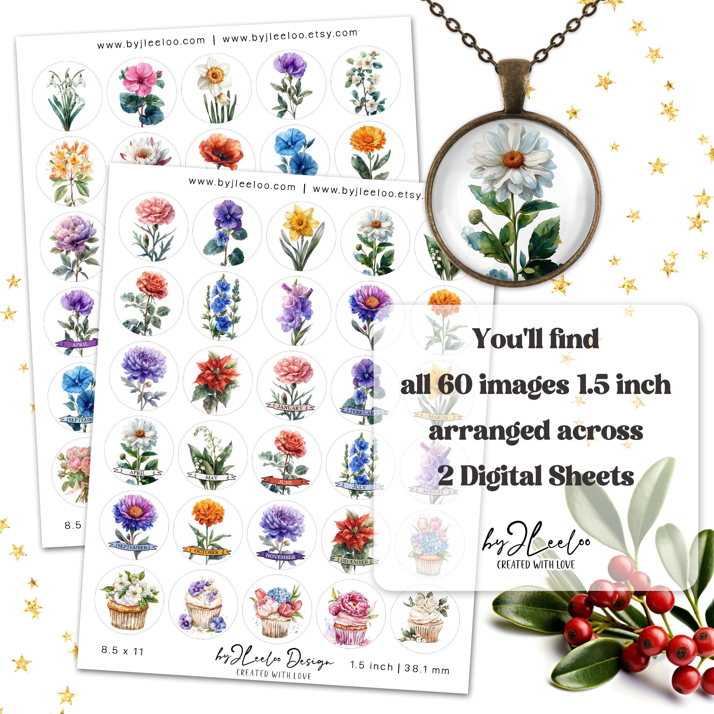 BIRTH FLOWERS 1.5 inch printable pendant | Birth Month Flower circle cabochon necklace sticker pin | digital download Fussy cut | tn816