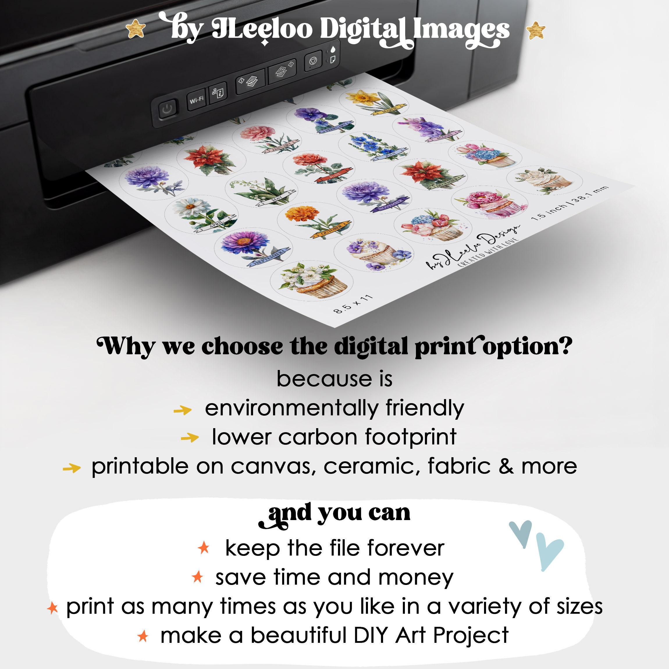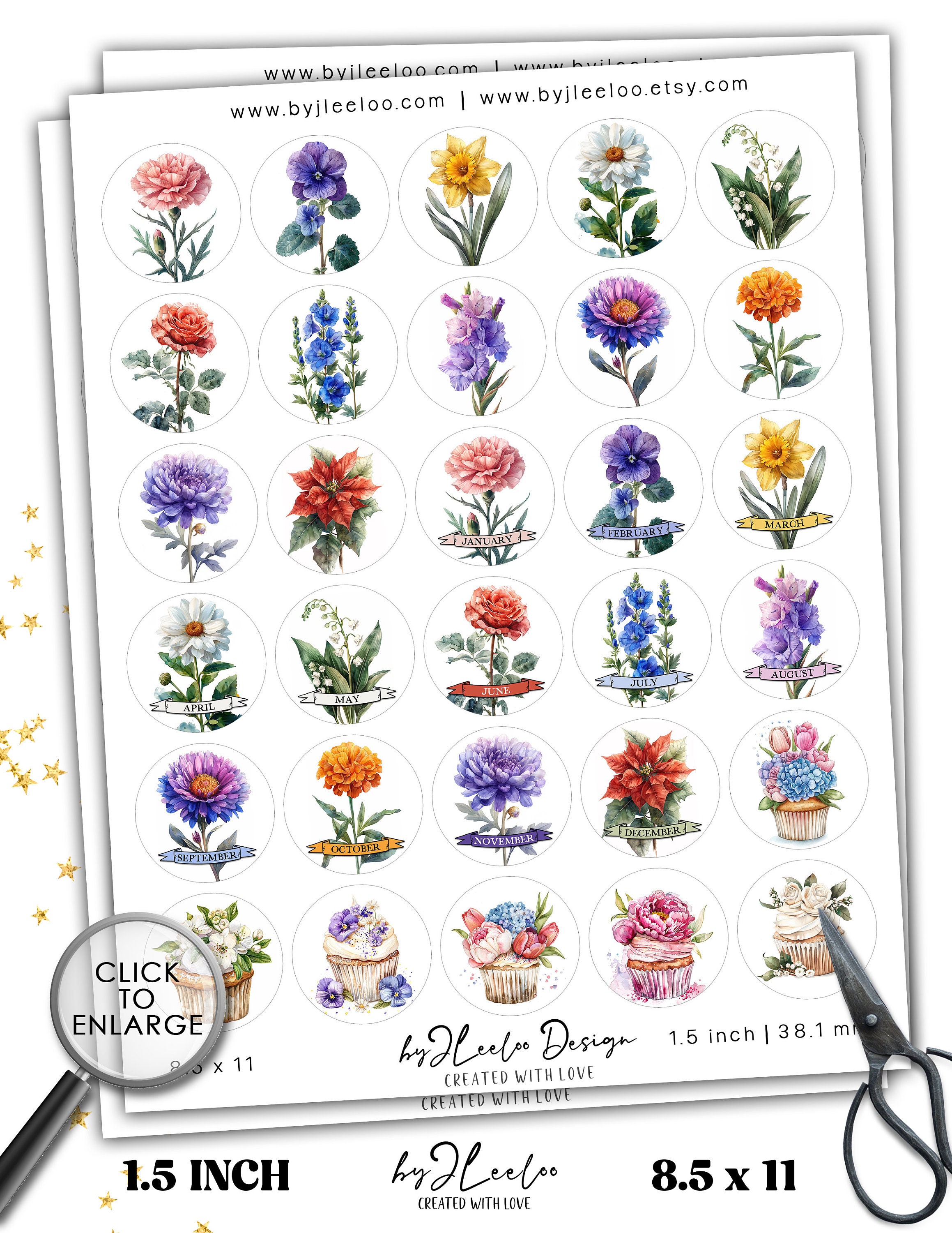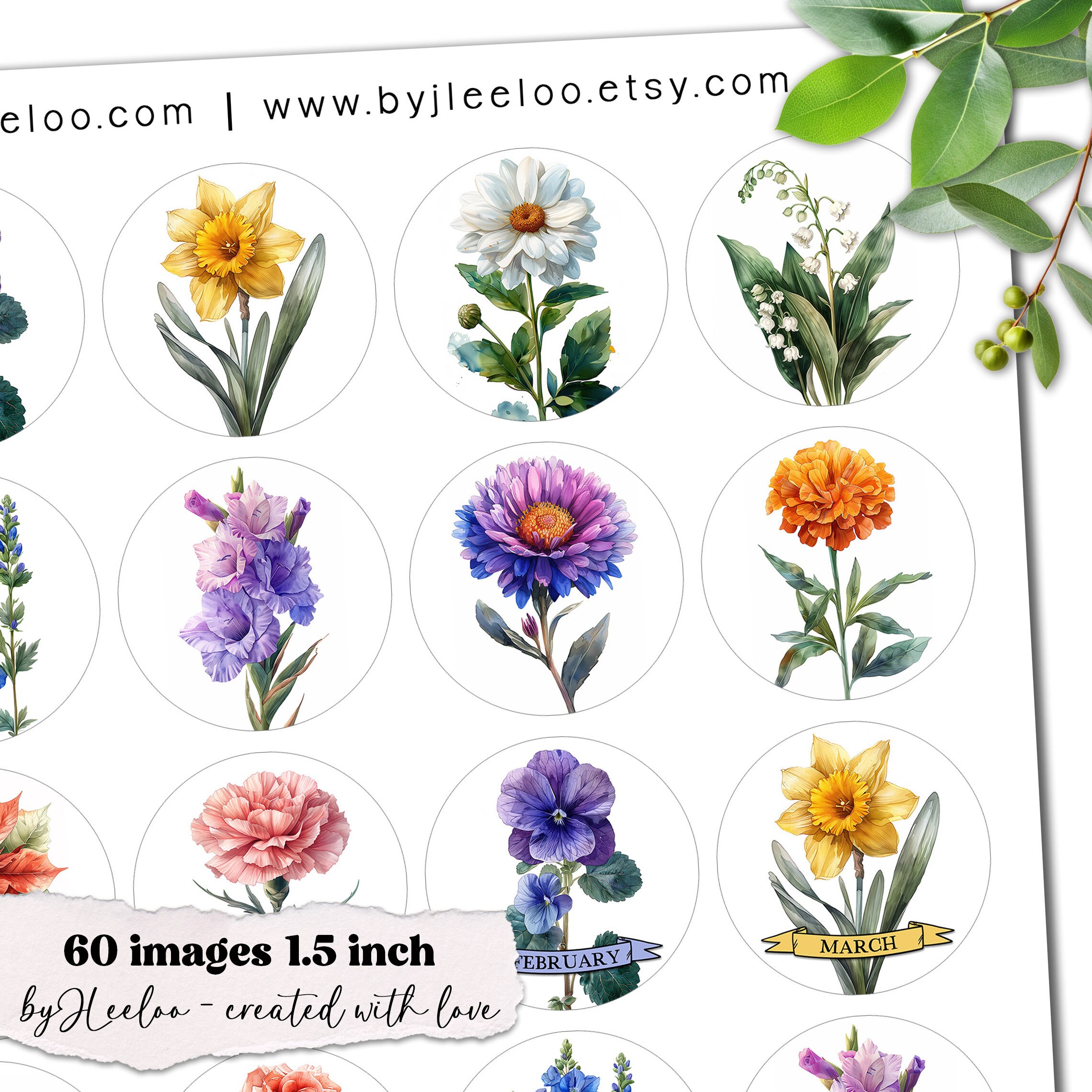 BIRTH FLOWERS 1.5 inch printable pendant | Birth Month Flower circle cabochon necklace sticker pin | digital download Fussy cut | tn816