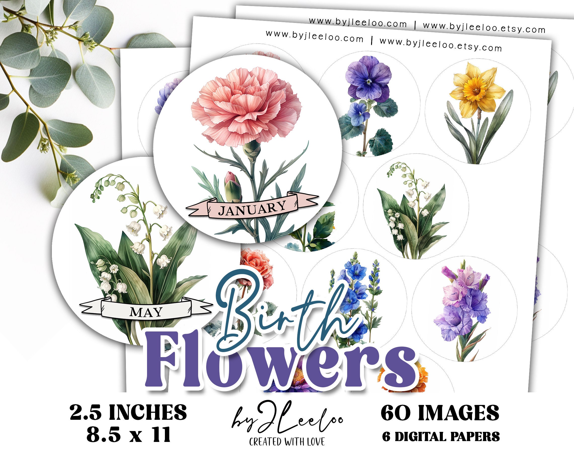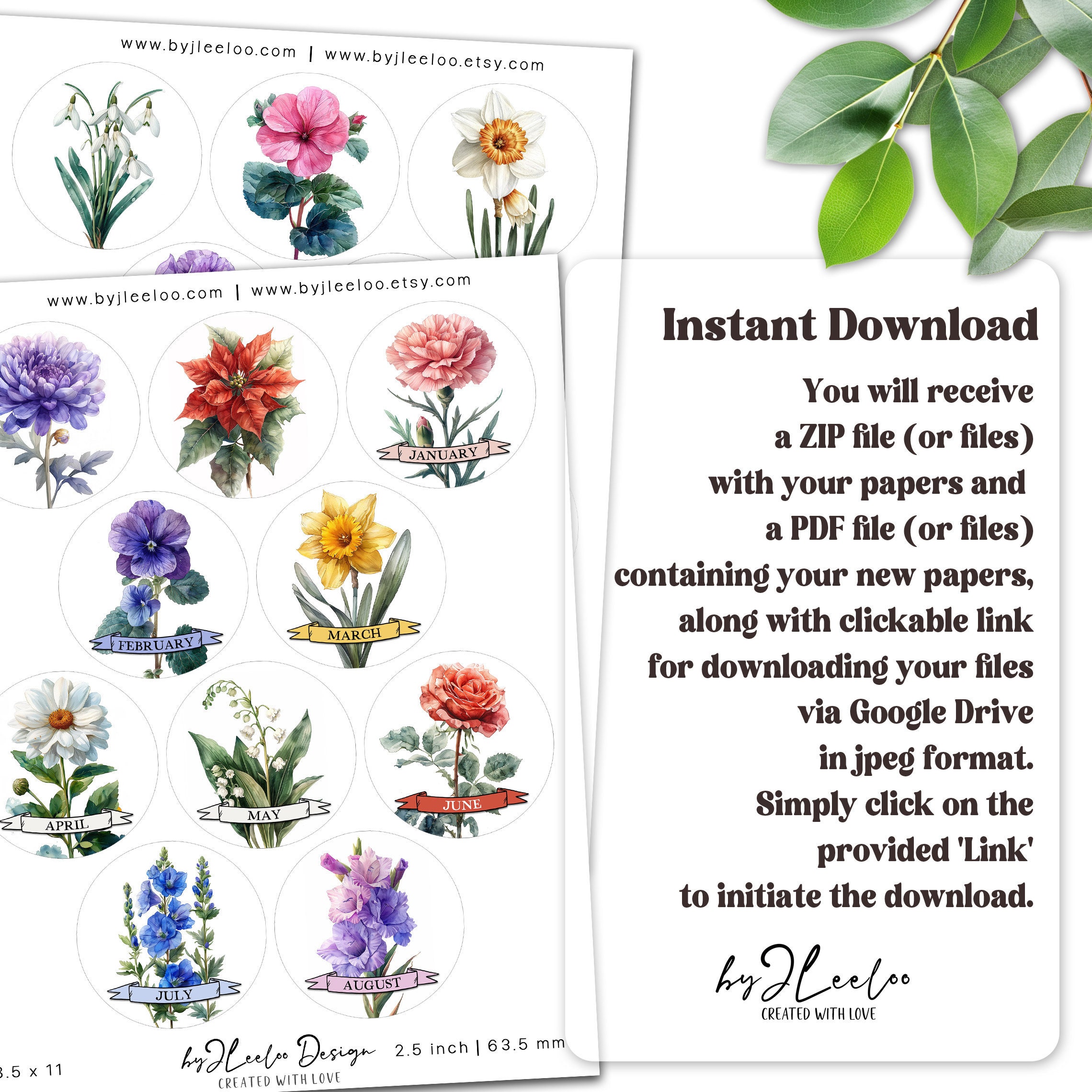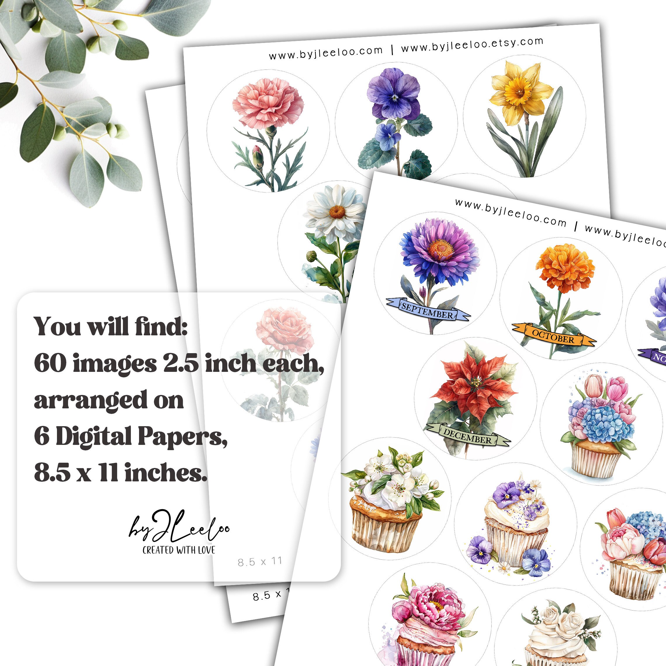 BIRTH FLOWERS 2.5 inch printable circle | Birth Month Flower round pendants cabochon necklace sticker | Fussy cut digital download | tn818