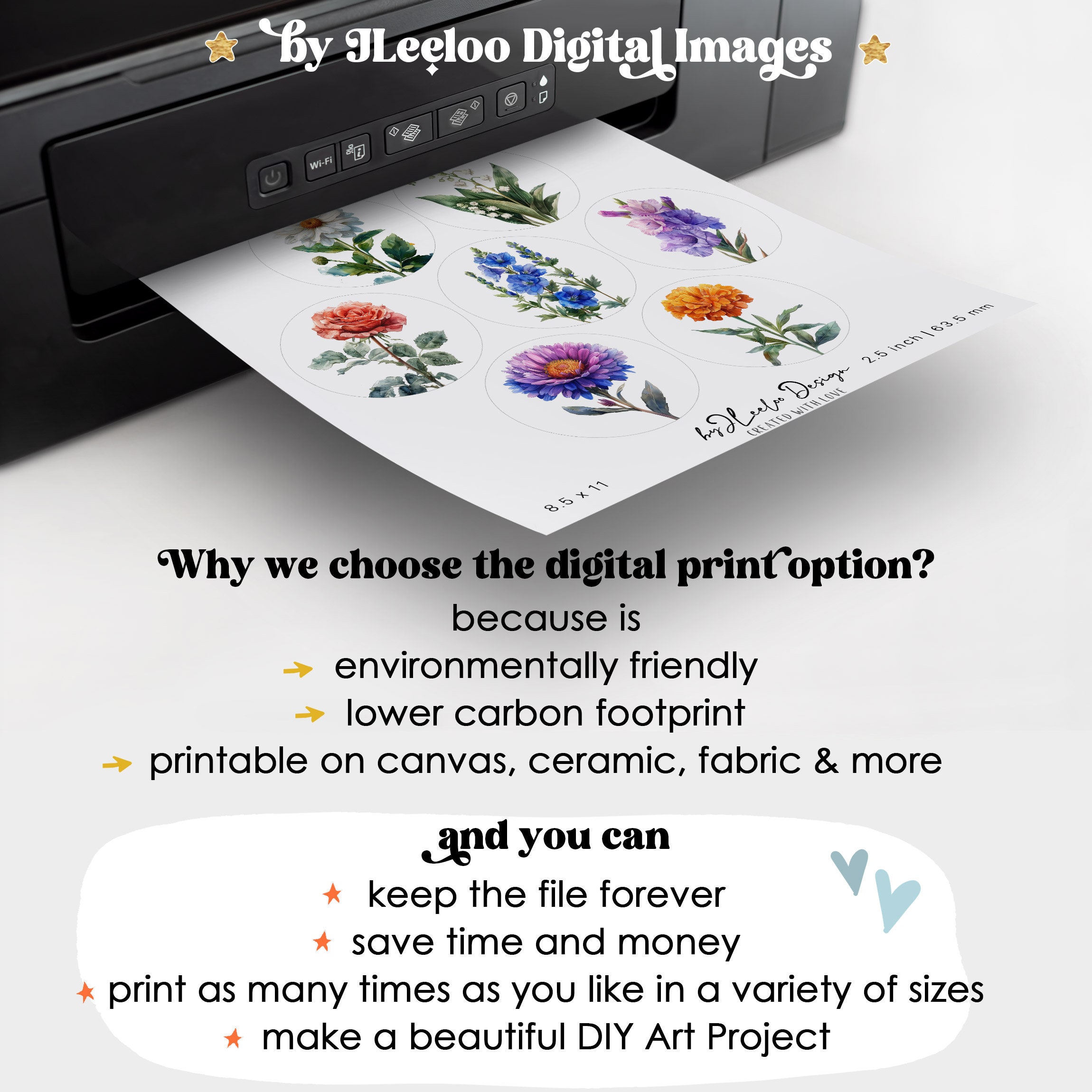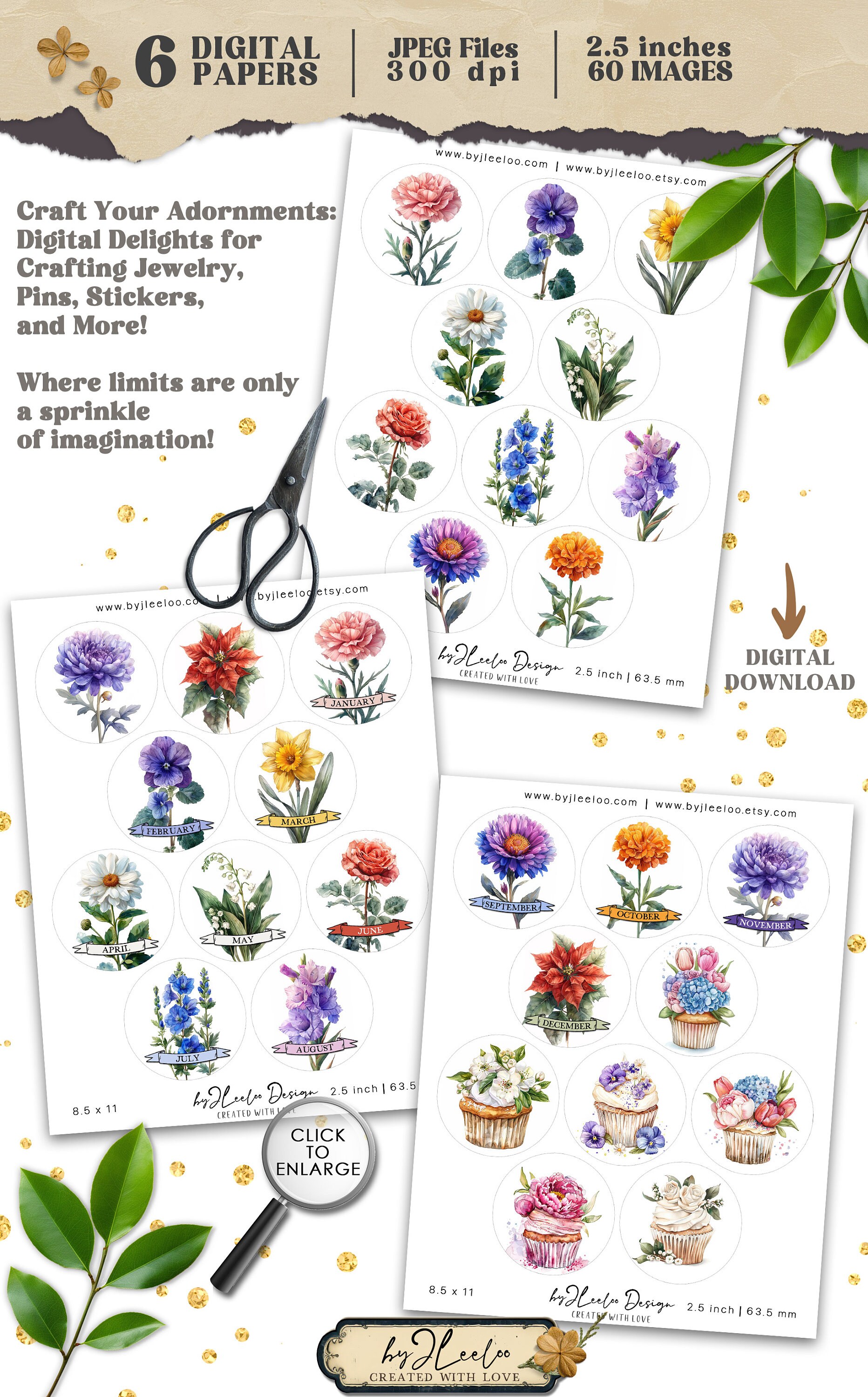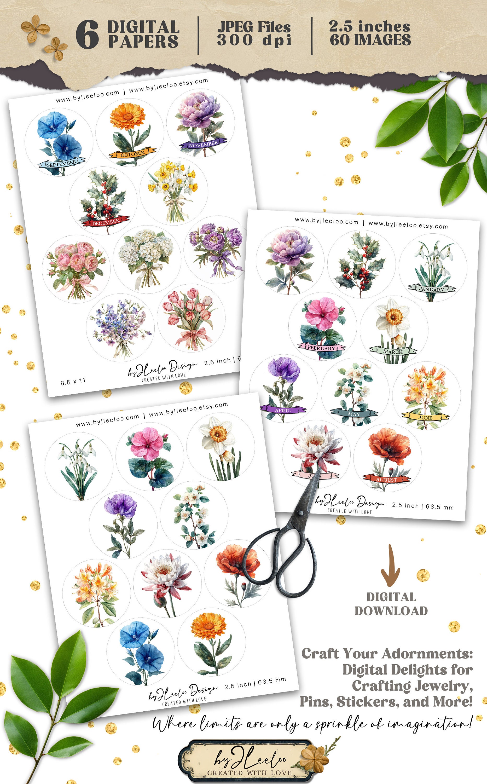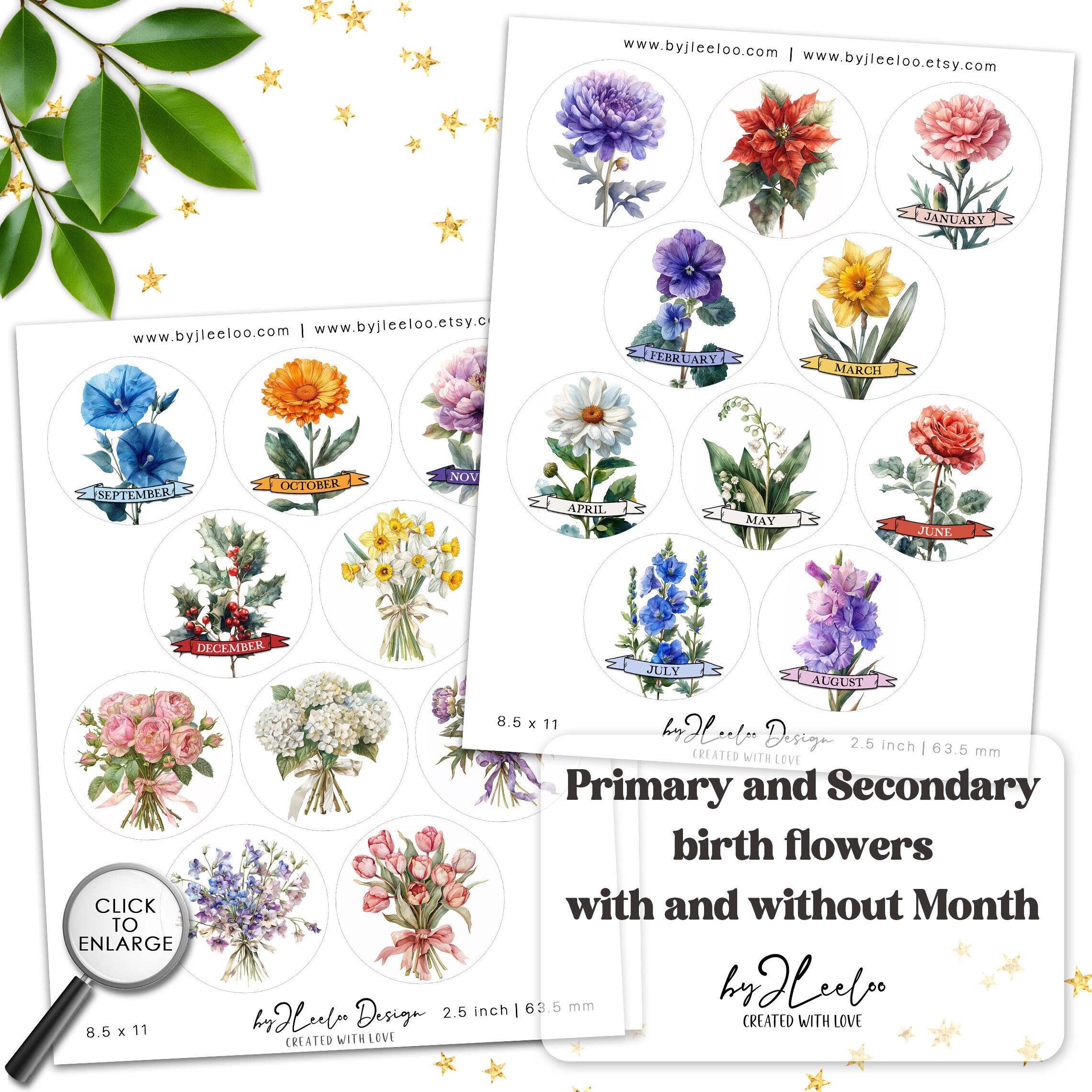 BIRTH FLOWERS 2.5 inch printable circle | Birth Month Flower round pendants cabochon necklace sticker | Fussy cut digital download | tn818
