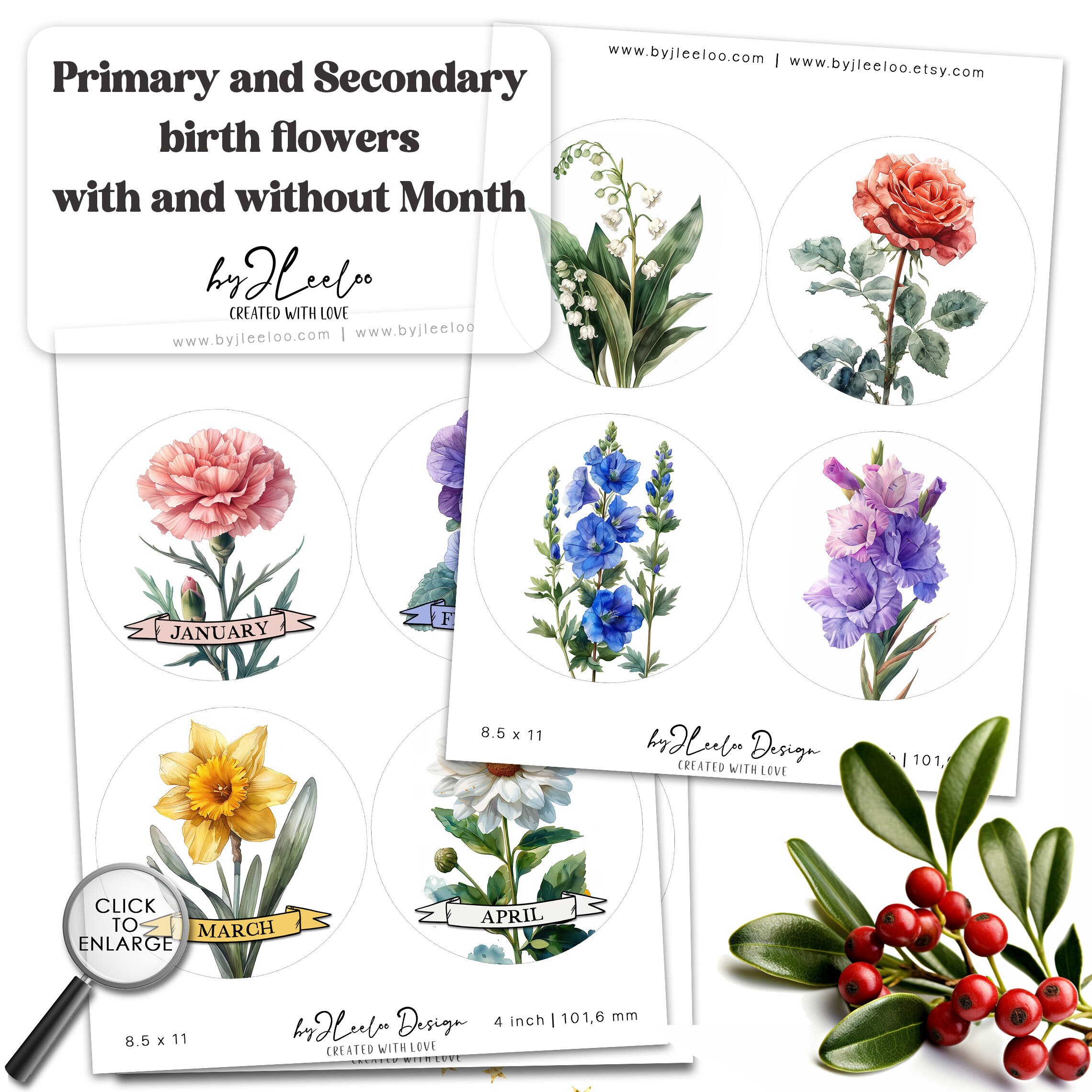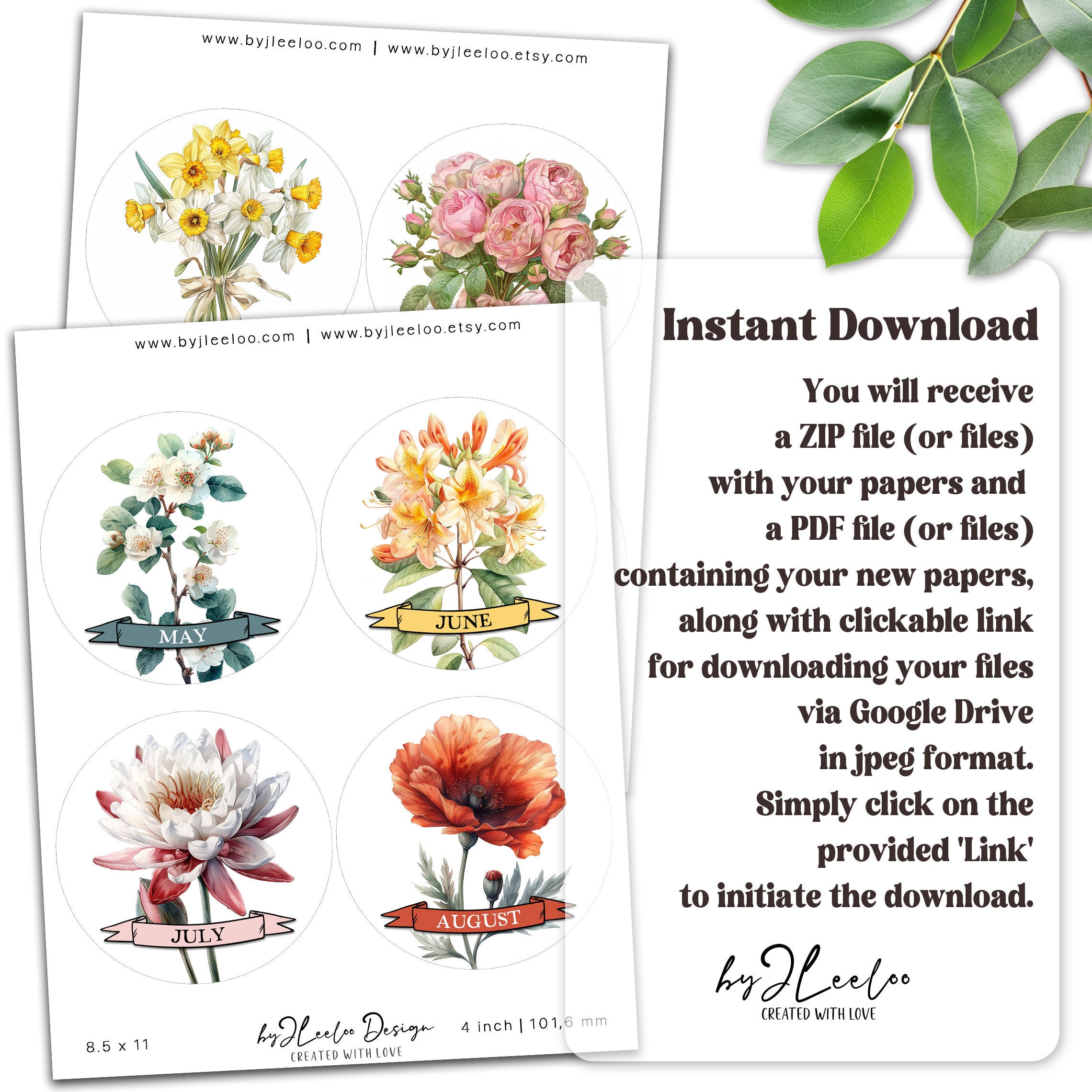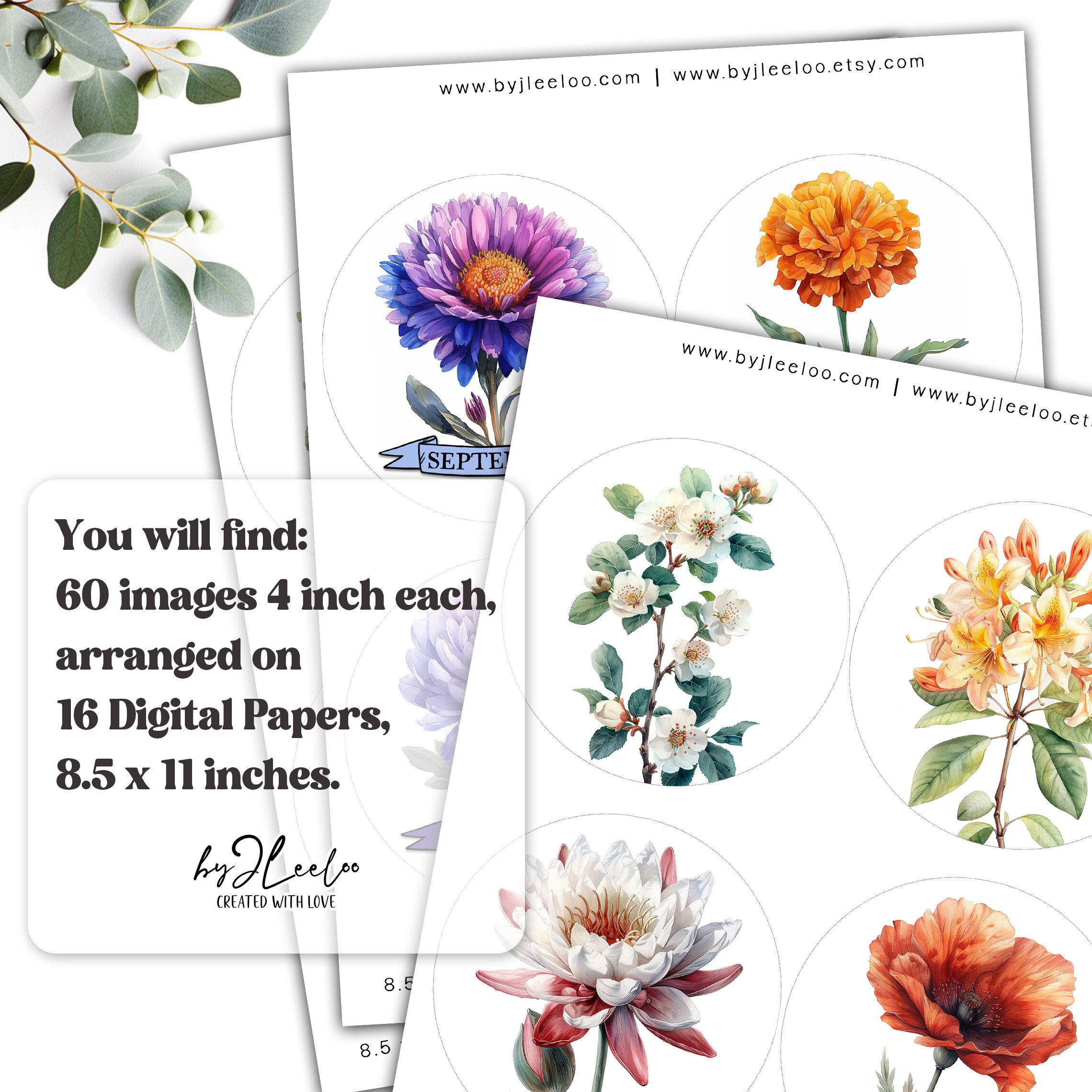 BIRTH FLOWERS 4 inches printable circle | Birth Month Flower circle birthday gift sticker card making | Fussy cut digital download | tn820