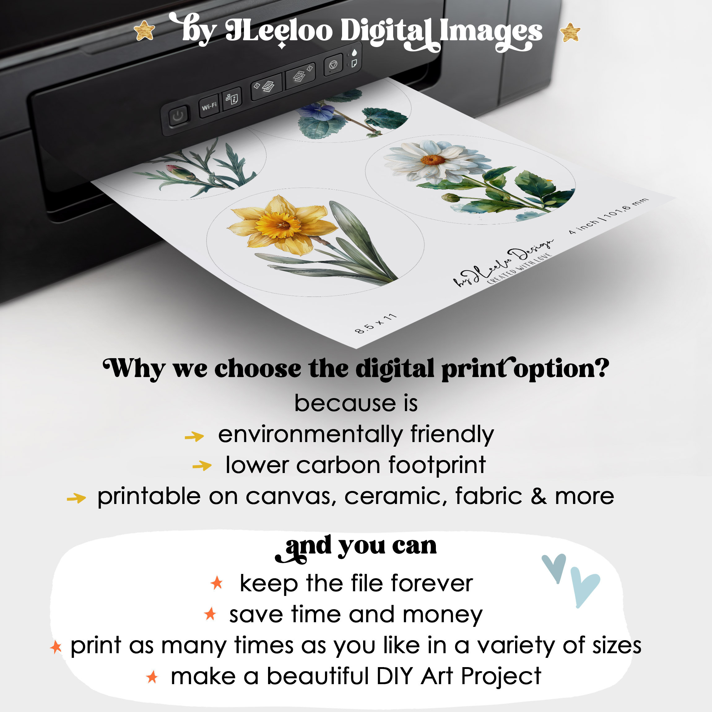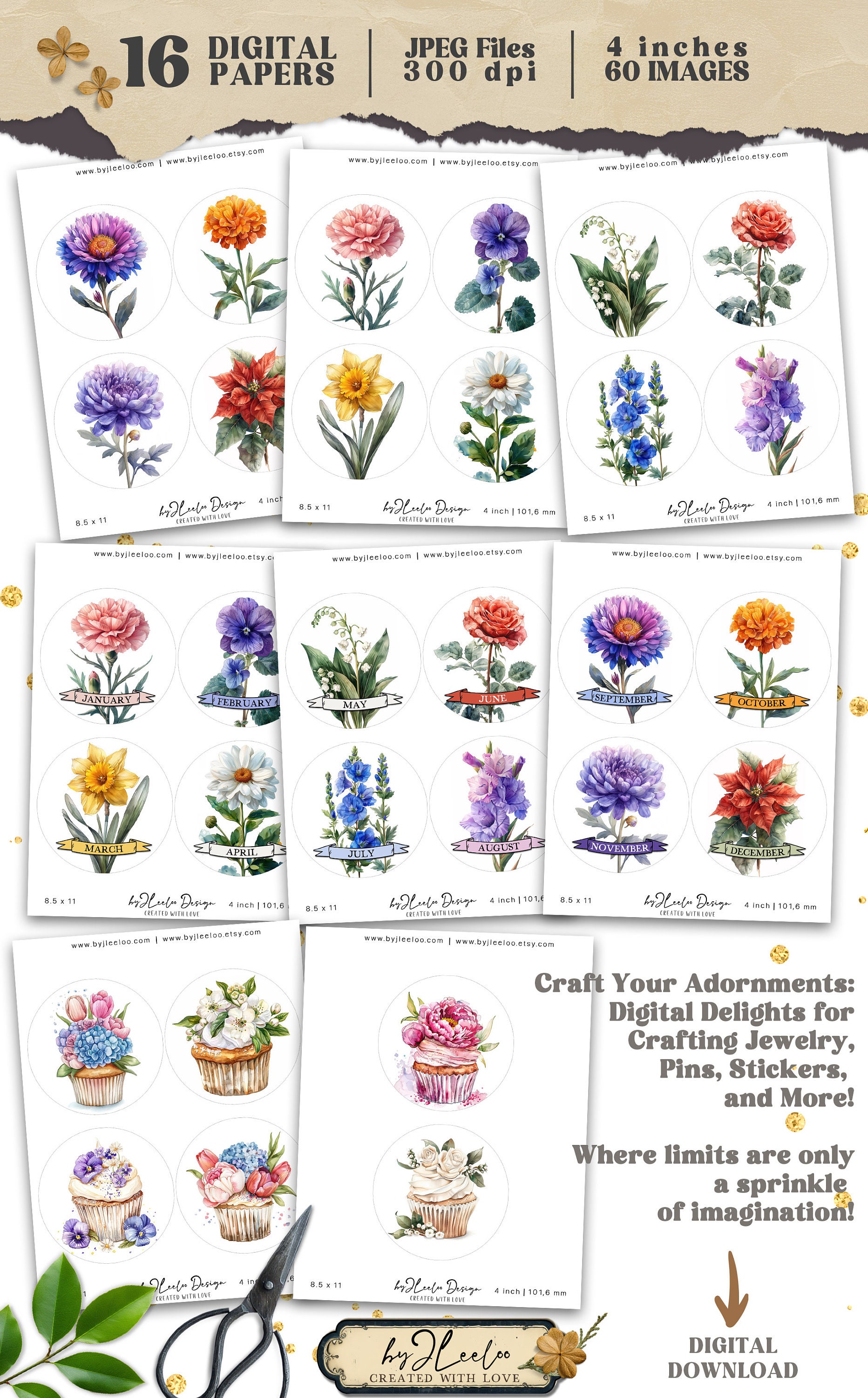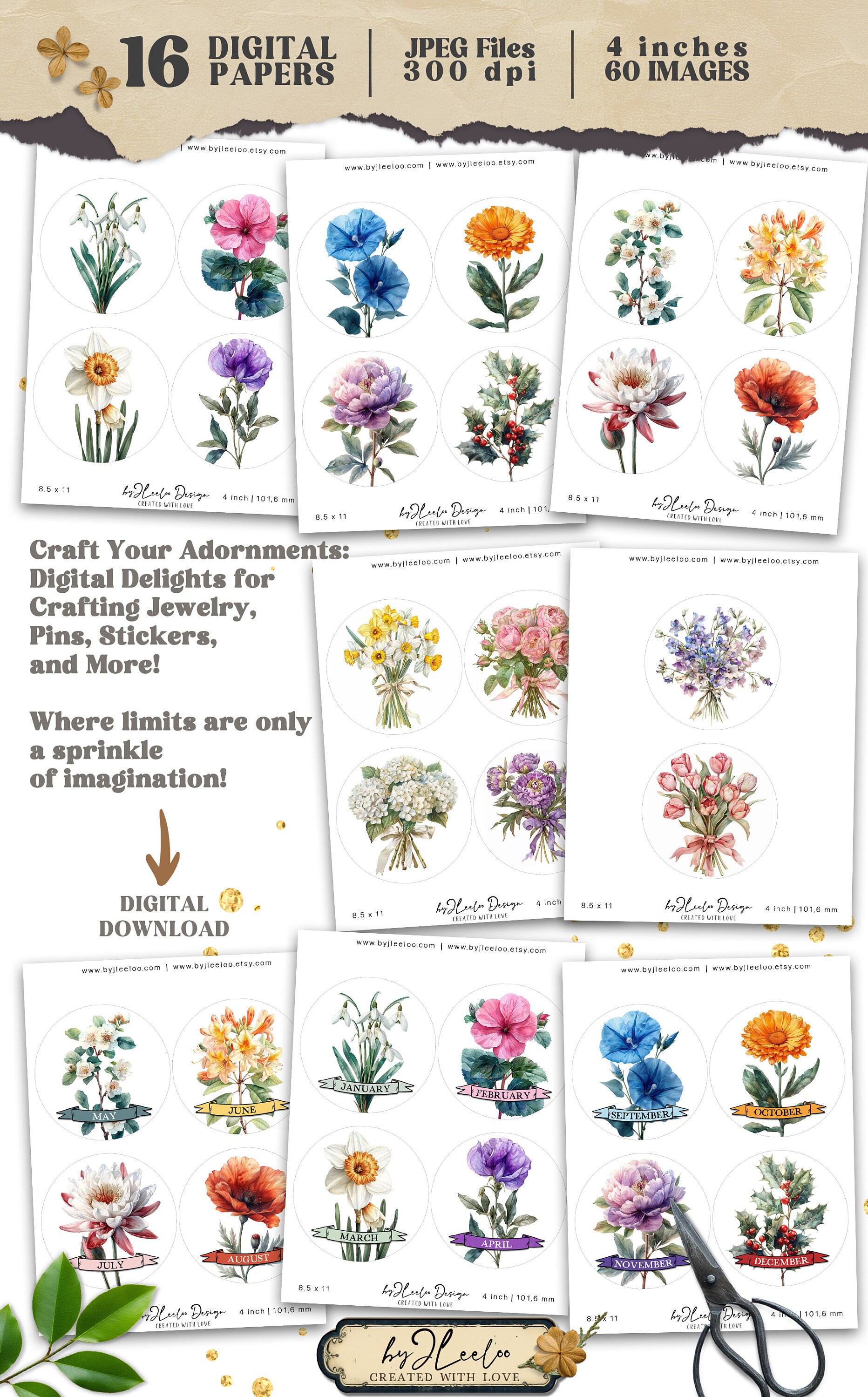 BIRTH FLOWERS 4 inches printable circle | Birth Month Flower circle birthday gift sticker card making | Fussy cut digital download | tn820